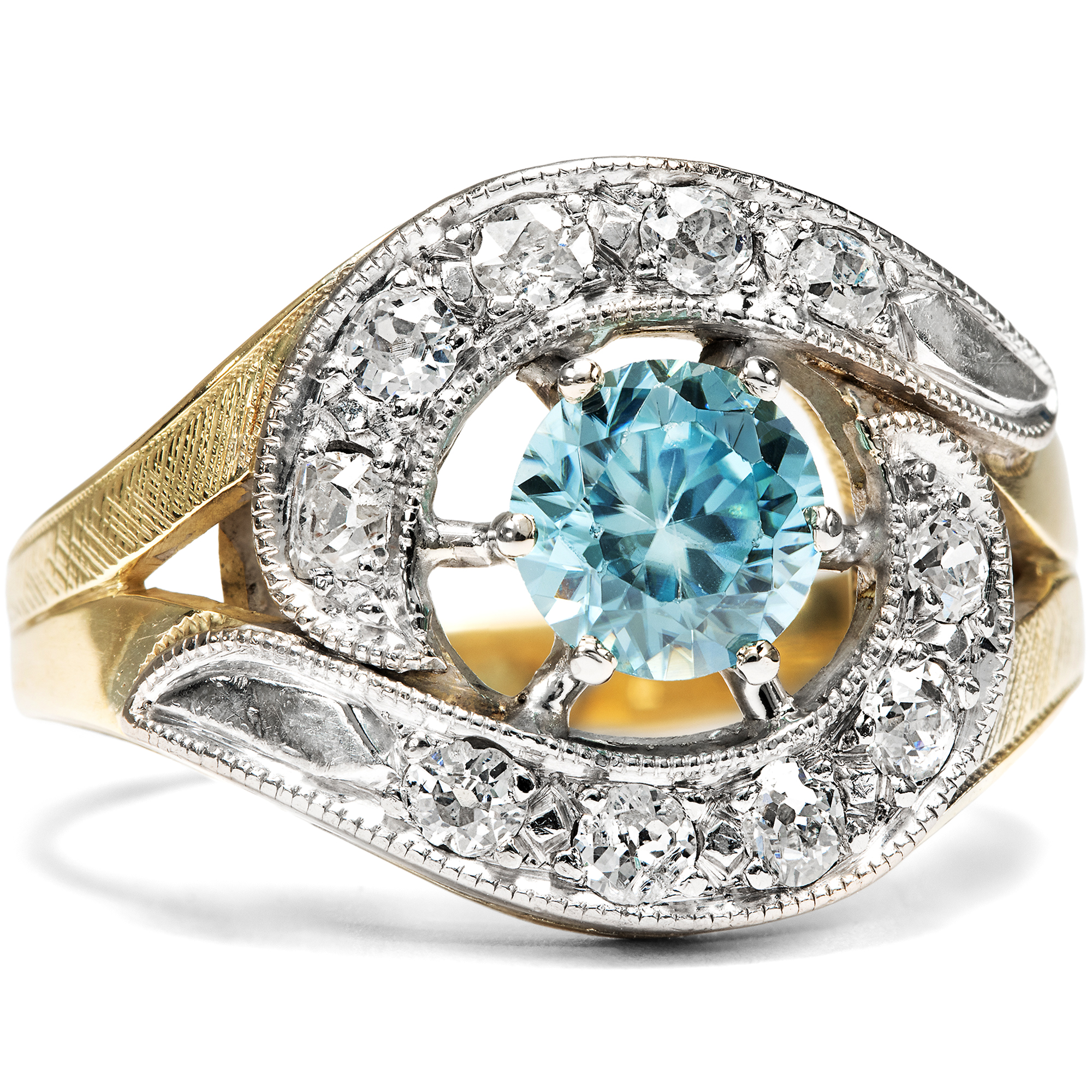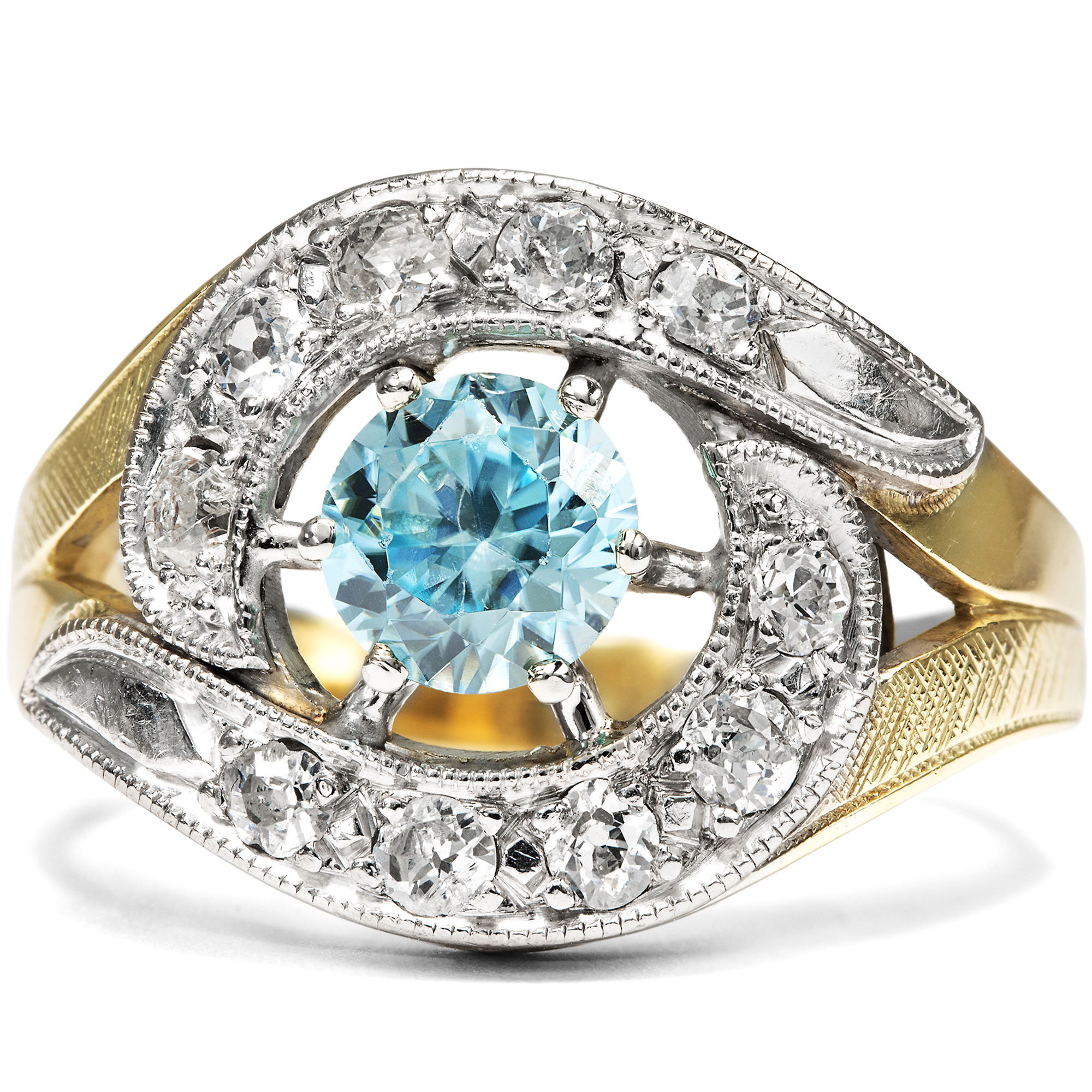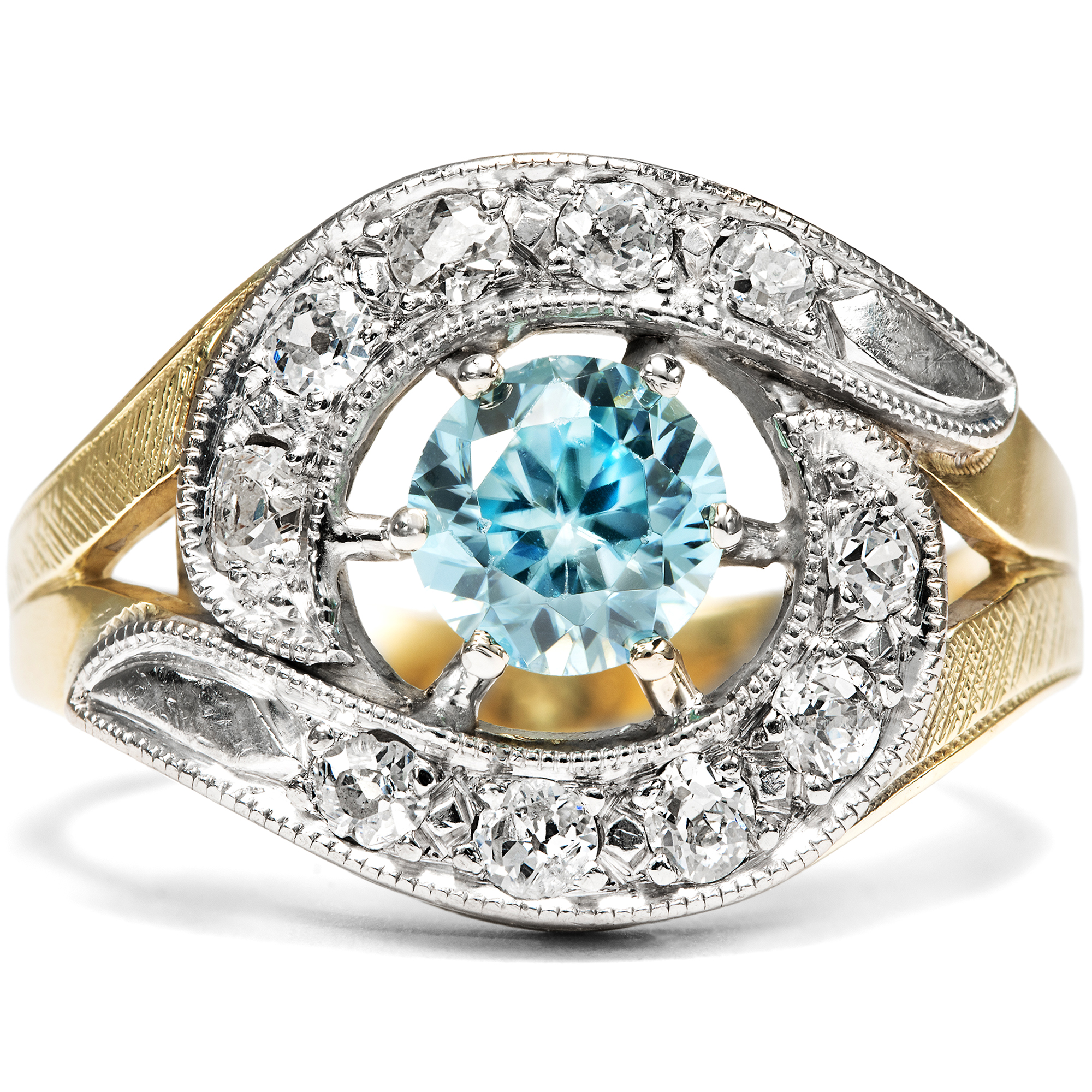 Der Zirkon ist ein in Deutschland kaum bekannter natürlicher Edelstein. Nichts hat er mit dem preiswerten Diamantersatz „Zirkonia“ gemein, der im Labor hergestellt wird und im Grunde wertlos ist. Echte Zirkone sind kostbare natürliche Edelsteine, die in vielen schönen Farben vorkommen können, wobei besonders die blauen Exemplare geschätzt und hoch bezahlt werden. Diese mittelblauen Edelzirkone nennt man „Starlit“ bzw. auf Englisch auch „Starlite“, und sie entstehen, indem man dunkelbraune Zirkone, die im Rohzustand beinahe aussehen wie simple Steinkohle, bei Temperaturen um die 1000 Grad Celsius brennt. Mit etwas Glück entsteht hierbei das unverwechselbare Blau, das zu den begehrtesten Farben im Spektrum der Zirkone zählt. Der hier vorliegende Ring aus den 1950er Jahren ist mit einem wundervollen blauen Zirkon besetzt. Zwei gegenläufige Schwünge mit Diamanten in historischen Schliffen umfassen den Mittelstein. Während der Ringkopf mit hellem Platin belegt ist, wurde die stabile Schiene aus Gelbgold gefertigt. Die kraftvolle Formensprache und der üppige Materialeinsatz sind typisch für die 1950er Jahre. Die Diamanten allerdings sind älter und stammen aus Schmuckstücken des 19. Jahrhunderts. Sie wurden hier in Zweitverwendung eingesetzt. Den Punzen zufolge entstand der Ring vermutlich in Deutschland.