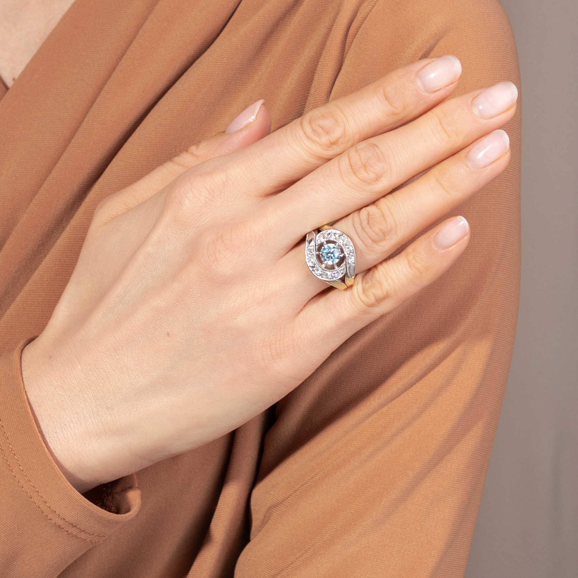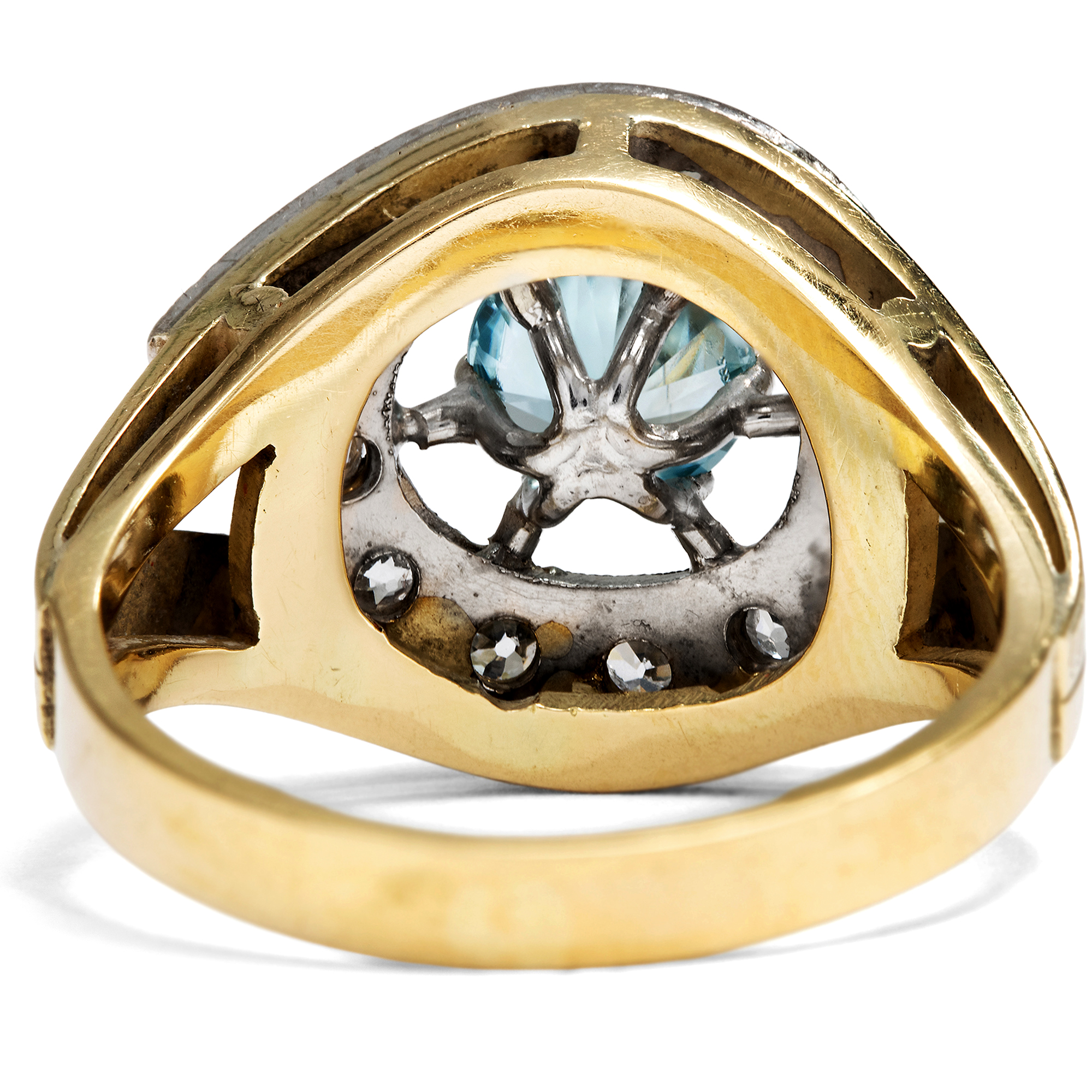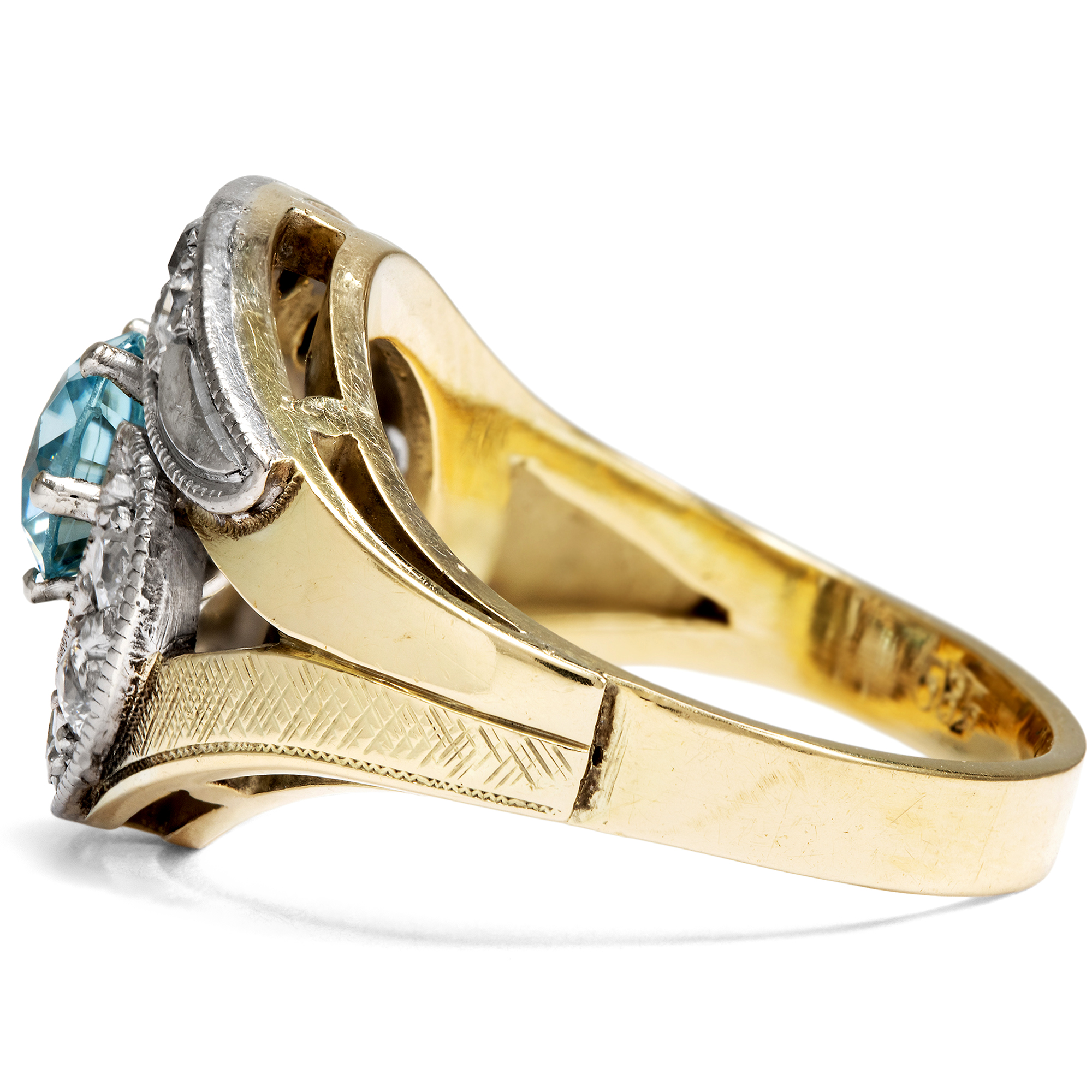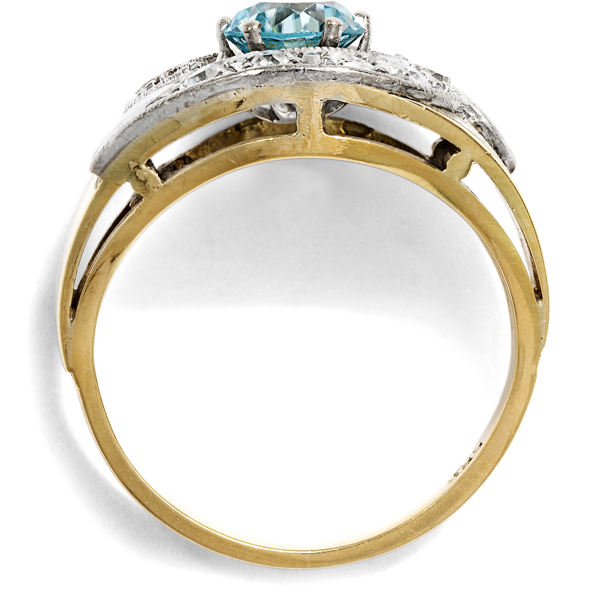 Der Zirkon ist ein in Deutschland kaum bekannter natürlicher Edelstein. Nichts hat er mit dem preiswerten Diamantersatz „Zirkonia“ gemein, der im Labor hergestellt wird und im Grunde wertlos ist. Echte Zirkone sind kostbare natürliche Edelsteine, die in vielen schönen Farben vorkommen können, wobei besonders die blauen Exemplare geschätzt und hoch bezahlt werden. Diese mittelblauen Edelzirkone nennt man „Starlit“ bzw. auf Englisch auch „Starlite“, und sie entstehen, indem man dunkelbraune Zirkone, die im Rohzustand beinahe aussehen wie simple Steinkohle, bei Temperaturen um die 1000 Grad Celsius brennt. Mit etwas Glück entsteht hierbei das unverwechselbare Blau, das zu den begehrtesten Farben im Spektrum der Zirkone zählt. Der hier vorliegende Ring aus den 1950er Jahren ist mit einem wundervollen blauen Zirkon besetzt. Zwei gegenläufige Schwünge mit Diamanten in historischen Schliffen umfassen den Mittelstein. Während der Ringkopf mit hellem Platin belegt ist, wurde die stabile Schiene aus Gelbgold gefertigt. Die kraftvolle Formensprache und der üppige Materialeinsatz sind typisch für die 1950er Jahre. Die Diamanten allerdings sind älter und stammen aus Schmuckstücken des 19. Jahrhunderts. Sie wurden hier in Zweitverwendung eingesetzt. Den Punzen zufolge entstand der Ring vermutlich in Deutschland.