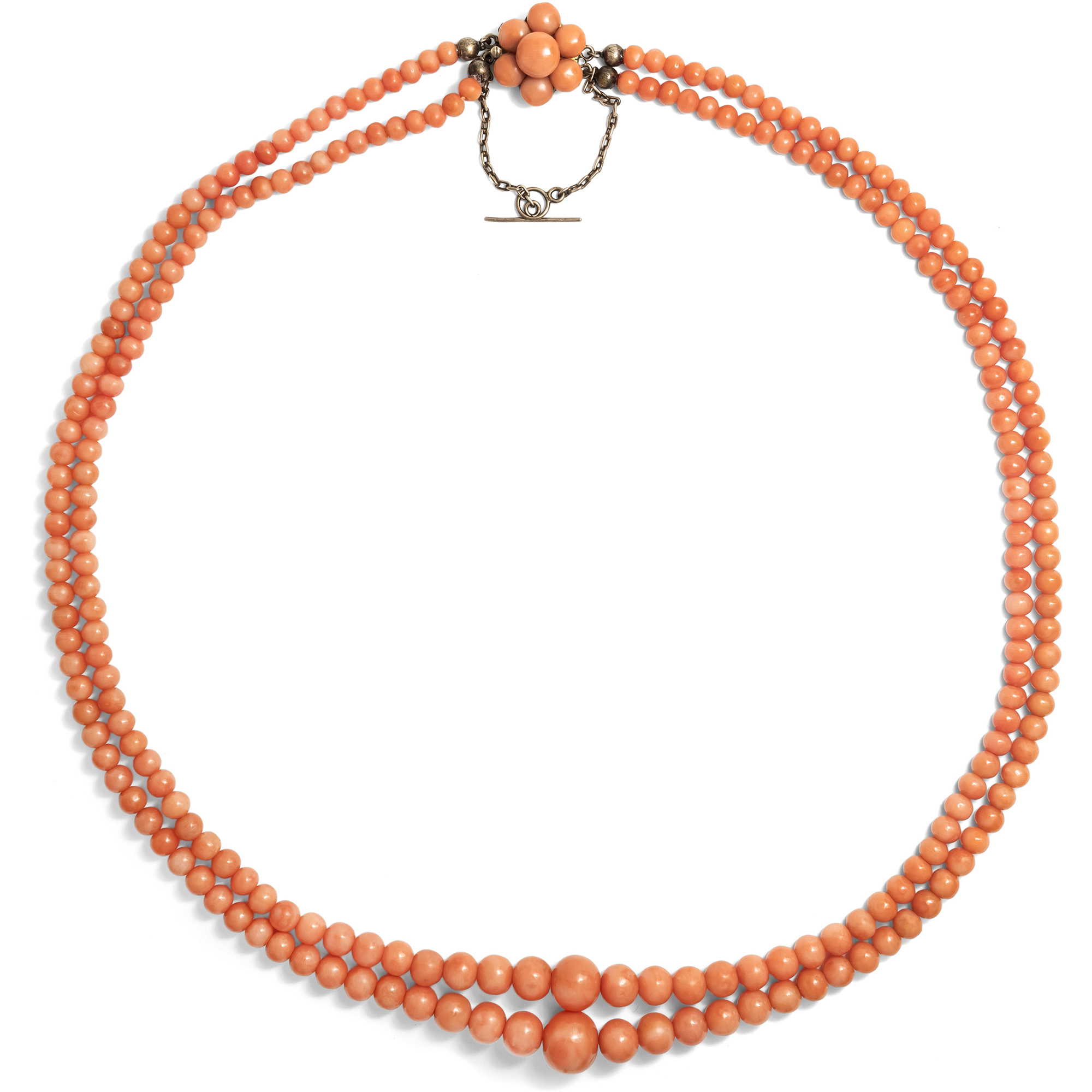 Der Meeresboden vor Sizilien ist eine geologisch sehr aktive Region. Unterseeische Vulkane häufen sich hier und immer wieder erschüttern Erdbeben die Region. Spektakulär war der Juli des Jahres 1831, als sich vor dem kleinen Ort Sciacca eine Vulkaninsel aus dem Meer erhob. Die Fischer sahen Rauch und Feuer, und eine neue Insel entstand. Je nachdem, welches Land sie für sich beanspruchte. Doch der Streit war vergeblich, denn das Meer holte sich das Land bald zurück. Schon ein Jahr später war die Insel wieder versunken, nur als Untiefe blieb sie bestehen. Die Geschichte der geheimnisvollen Insel war jedoch nur eine Episode. Jahrtausendelang schon hatten zuvor immer wiederkehrende Beben und Ausbrüche die Korallenriffe an dieser Stelle zerstört. Die abgestorbenen Korallen lagerten sich auf dem Meeresboden ab und nahmen dabei einen unverwechselbaren Lachston an. Diese sogenannten „Sciacca“-Korallen wurden erst 1875 entdeckt, als ein Fischer bei der versunkenen Insel nach seiner verlorenen Halskette tauchte und statt eines Schmuckstücks ein ganzes Feld lachsfarbener Korallen fand. Die zweireihige Kette, die wir hier vorstellen, trägt diese besondere Farbe in ihrer schönsten Form. Jede einzelne Koralle besitzt den warmen, zarten Ton, der die Korallen von Sciacca unverwechselbar macht. Die Stränge steigen sanft im Verlauf an, bis zu sehr großen Perlen mit etwa 1,2 cm Durchmesser. Dabei legen sich die zwei Stränge weich um den Hals. Vollendet wird das relativ lange Collier durch eine Schließe, die aus kleinen Korallenbuttons zu einer Blüte arrangiert ist. Das Collier stammt aus den Jahren um 1900 und wurde von uns neu aufgezogen. Ein Schmuckstück, entstanden aus der Energie des Meeres.
