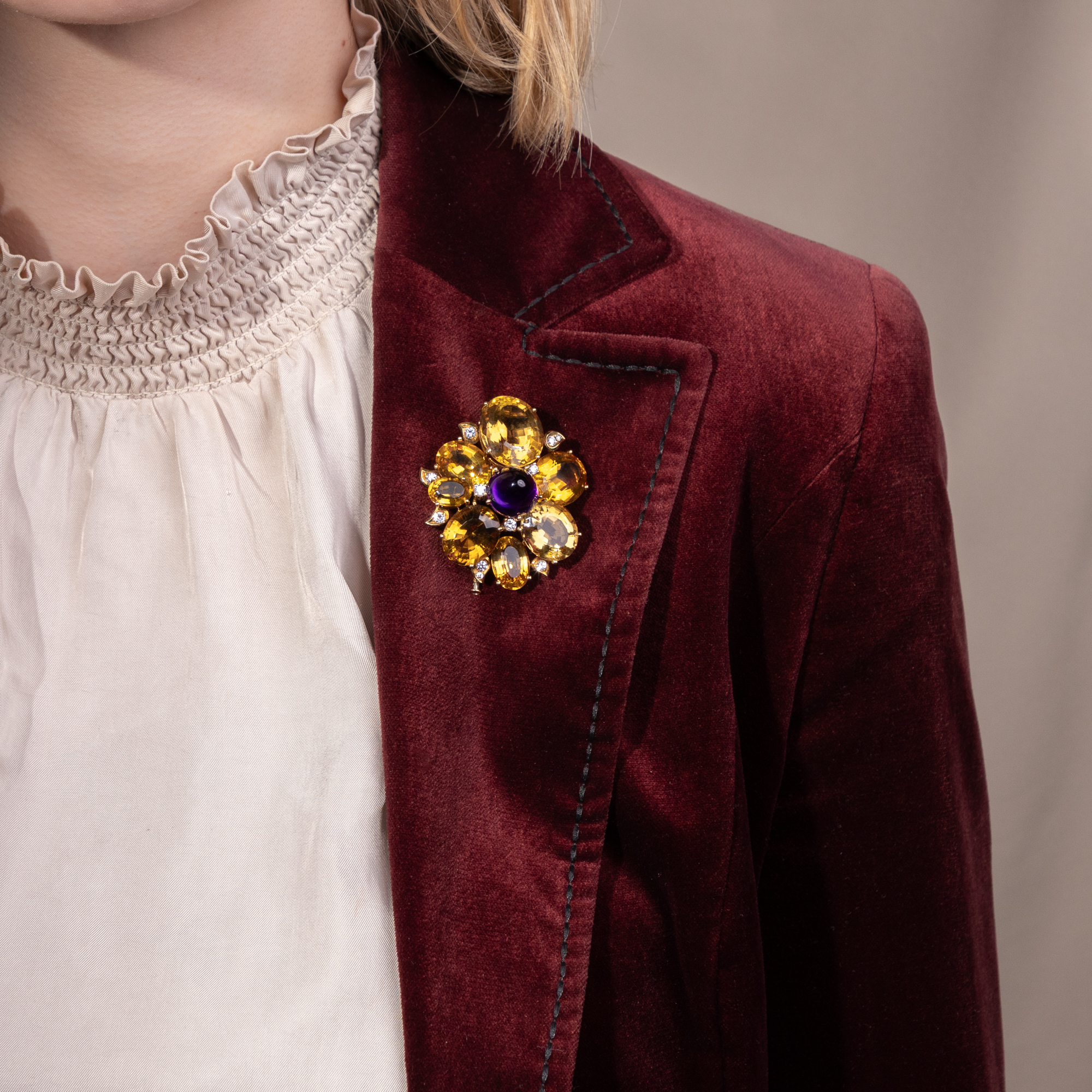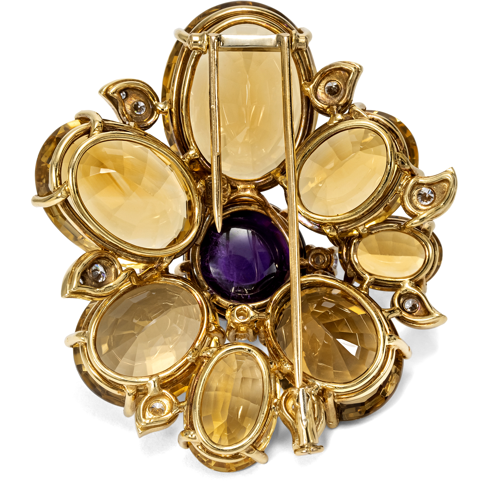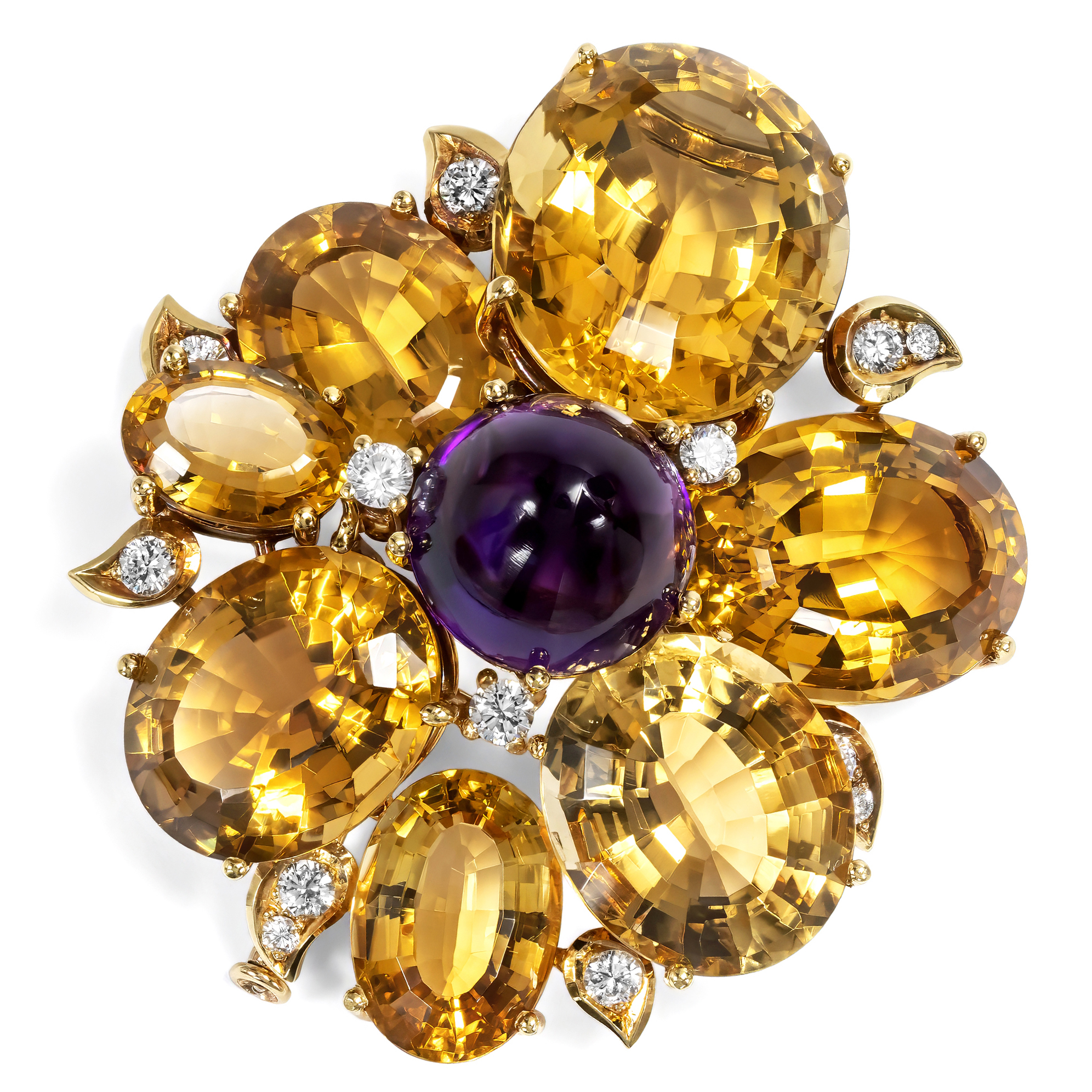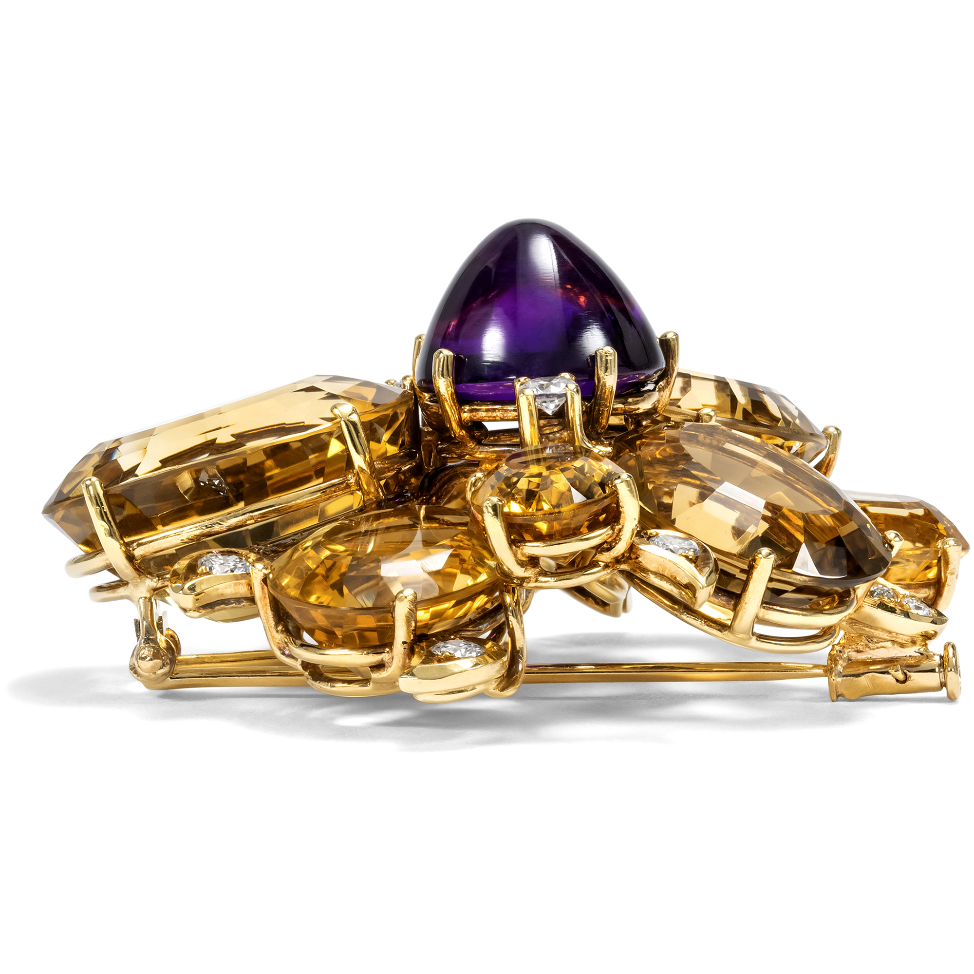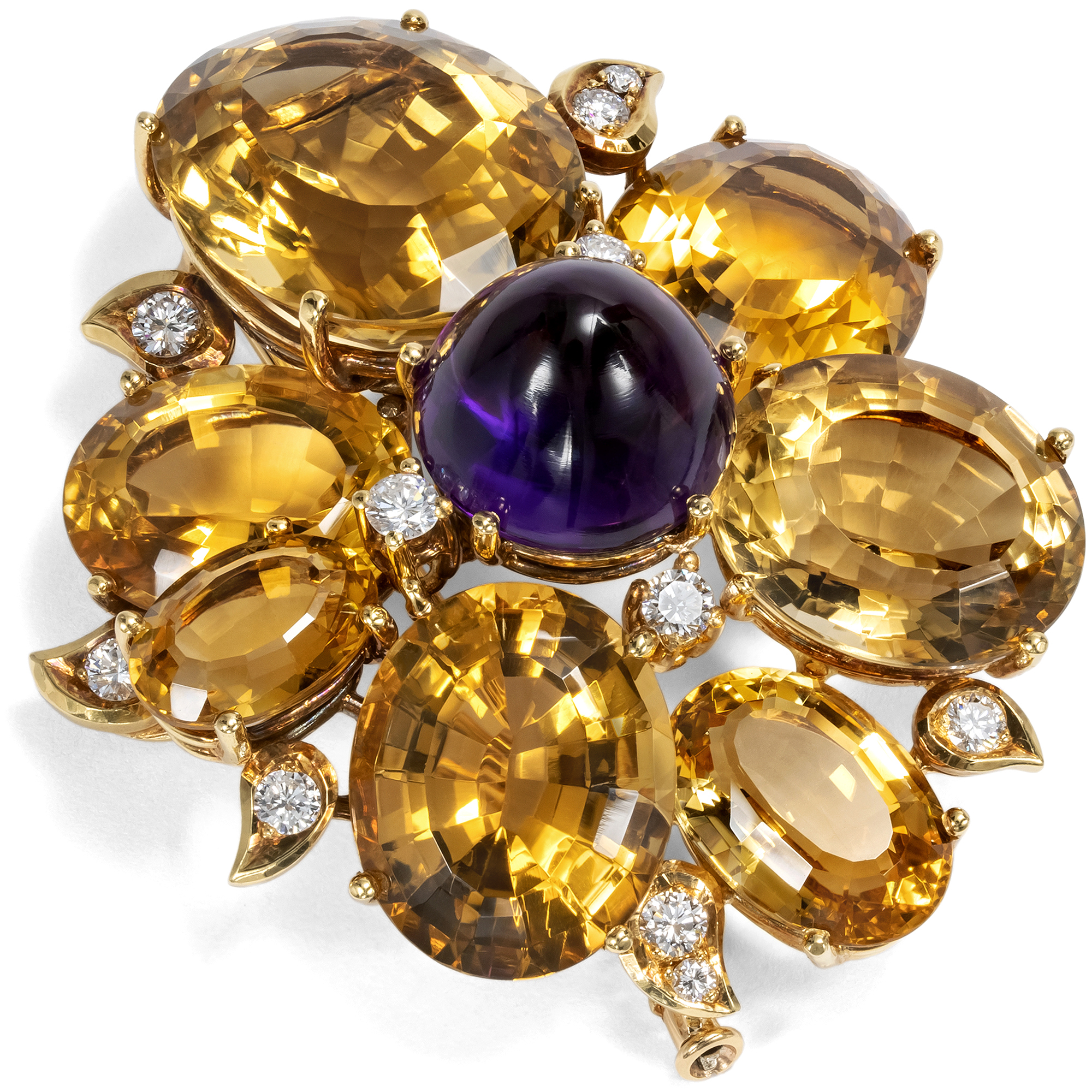 Figürliche Broschen mit großen, fein geschliffenen Farbsteinen gehörten in den 1950er und 1960er Jahren in jedes gut sortierte Schmuckkästchen. Die vorliegende Brosche ist ein besonders schönes Beispiel dieser Mode. Gefertigt aus hochkarätigem Gold, vereint sie unterschiedliche Edelsteine zu einem lebendigen, ausdrucksstarken Entwurf. Im Zentrum steht ein farbintensiver Amethyst im hohen Cabochonschliff, der in die Mitte einer expressiv gestalteten Blüte gesetzt ist. Diese entfaltet sich aus sieben leuchtenden, natürlichen Citrinen in goldenem Farbton mit einem Gesamtgewicht von etwa achtundsiebzig Karat, deren gestaffelte und leicht versetzte Anordnung dem Schmuckstück eine schöne Plastizität gibt. So entstehen bei jedem Lichteinfall wechselnde Lichtreflexe, die durch kleine weiße Diamanten im Brillantschliff, die auf verschiedenen Ebenen eingestreut sind verstärkt werden. Bei der Brosche handelt es sich um einen sogenannten Fur Clip mit doppelter Nadel, die das Gewicht des massiven Schmuckstücks elegant ausbalanciert. Ursprünglich für Pelzmäntel und Stolen entworfen, erfreuten sich solche Stücke besonders zur Mitte des 20. Jahrhunderts großer Beliebtheit. Doch auch heute lässt sich die Brosche vielseitig tragen, etwa auf Mänteln, Blazern oder kräftigen Stoffen. Die Brosche trägt die Signatur René Kerns, der ab 1950 wunderbare Juwelen im Zeitgeschmack des Midcentury fertigte. Kern zählte hochrangige internationale Prominenz zu seinen Kunden, darunter auch den Schah von Persien. Neben dem Stammhaus an der Düsseldorfer Königsallee betrieb er noch weitere Geschäfte. Unsere Brosche stammt aus jener Glanzzeit des Hauses, als René Kern noch selbst tätig war. Die Brosche ist hervorragend erhalten und erfreut durch ihre opulente Farbigkeit und die erstklassige Ausführung. Ein luxuriöses Schmuckstück mit zeitloser Ausstrahlung, das aus Berlin-Dahlem zu uns kam.