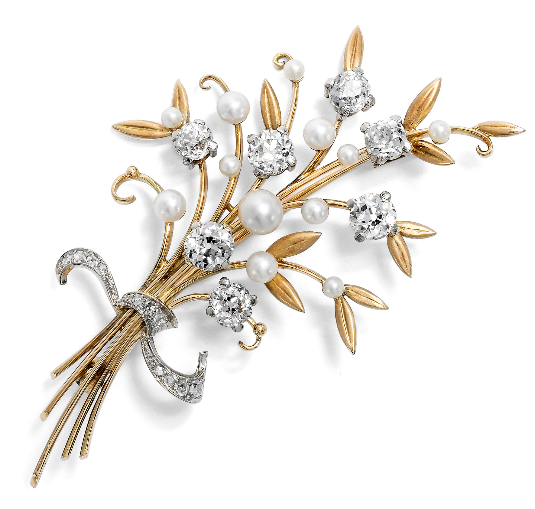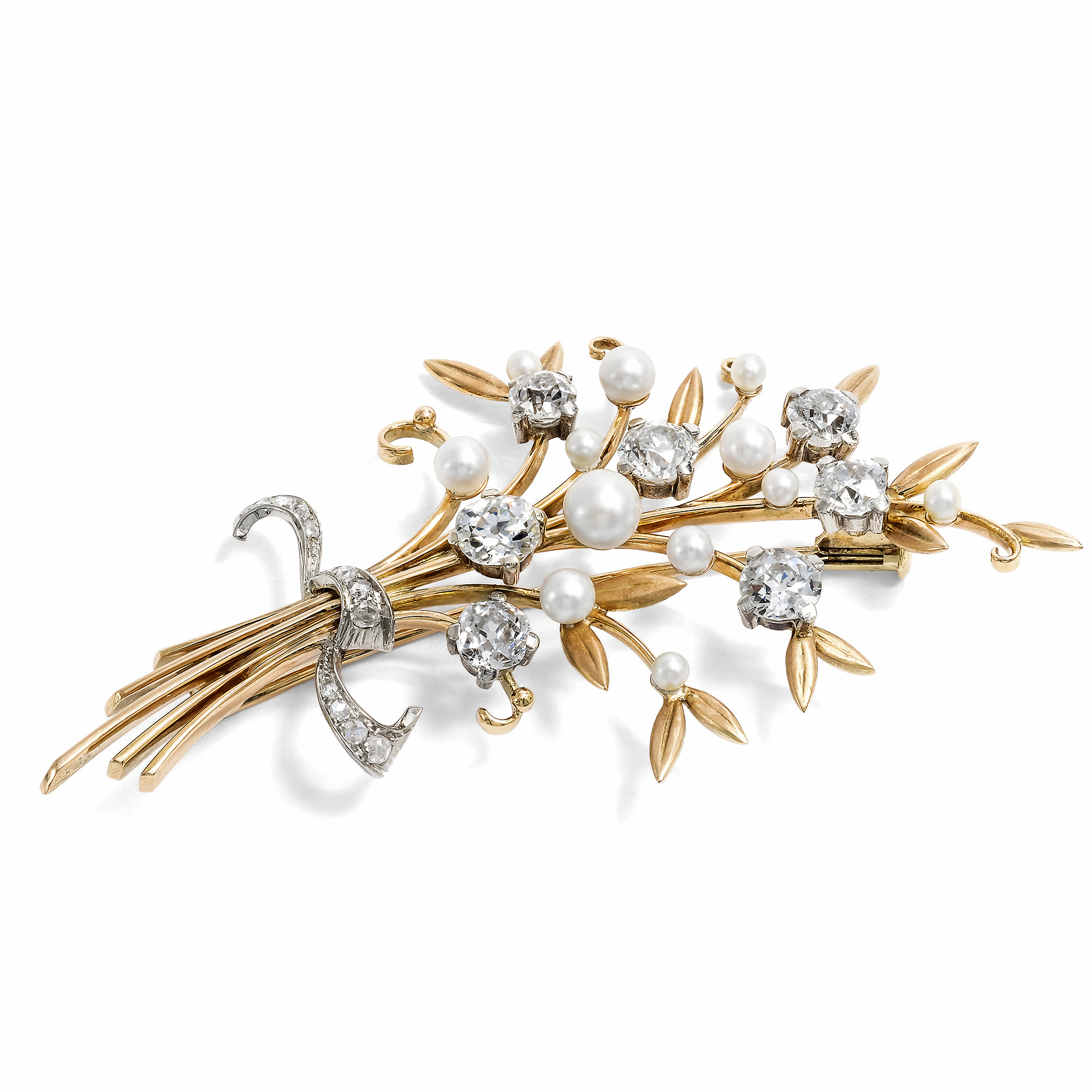 Schon lange sind Blumenmotive als Brosche bekannt. Bereits im 18. Jahrhundert schmückten sich die Hofdamen des Rokoko mit Korsagenornamenten in Blütenformen, besetzt mit Edelsteinen oder funkelndem Glas. Auch das viktorianische Zeitalter, die Belle Époque und das Art Déco passten florale Arrangements jeweils der vorherrschenden Ästhetik an. So überrascht es nicht, das alte Thema hier nun auch im Stil der Jahre um 1950 wiederzufinden. Typisch für diesen sogenannten „Retro Style“ des Midcentury sind körperhafte Entwürfe aus Gold mit Diamant-Akzenten, wie wir sie auch bei dieser Brosche sehen. Schimmernde Perlen und sieben große Diamanten im historischen Altschliff bilden die Blüten. Blätter, Stiele und das umschließende Band sind aus warm glänzendem Gold gefertigt. Allein die Diamanten sind in Weißgold gefasst. Trotz der Größe der Brosche wirkt diese nicht überbordend schwer, denn die Blätter sind schmal und die Stängel aus goldenen Drähten luftig entworfen. Und noch eines ist ganz typisch für die Entstehungszeit der Brosche: Die asymmetrisch angelegte Form ist ein charakteristischer Zug der Nachkriegszeit, denn erst dann setzte sich jene Art durch, Broschen zu tragen, wie wir sie heute am besten kennen: Seitlich unter der Schulter, auf einer Jacke oder einem Kleid. Zuvor waren Broschen oft symmetrisch angelegt, denn sie waren dazu bestimmt, mittig auf der Korsage oder am Kragen einer Bluse getragen zu werden. Laut Stempelung ist das Schmuckstück in Wien gefertigt worden. Ein unabhängiges Gutachten hat die Qualität der verwendeten Materialien bestätigt.