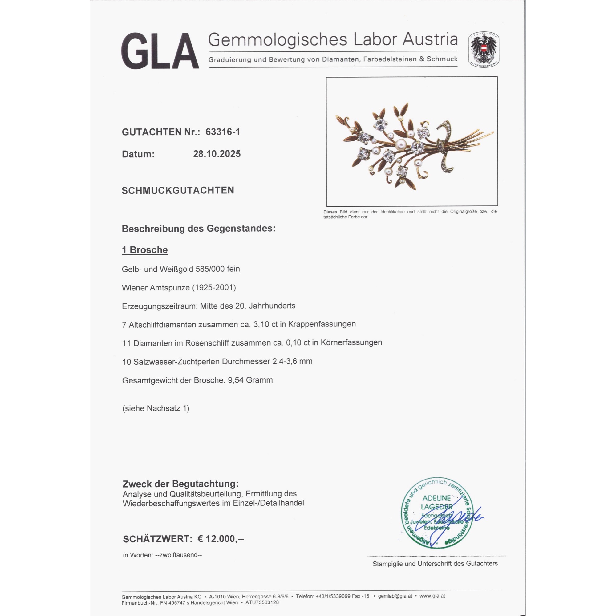 Luxuriöse „Retro Style“ Brosche mit Perlen & Diamanten in Gold, Wien um 1950