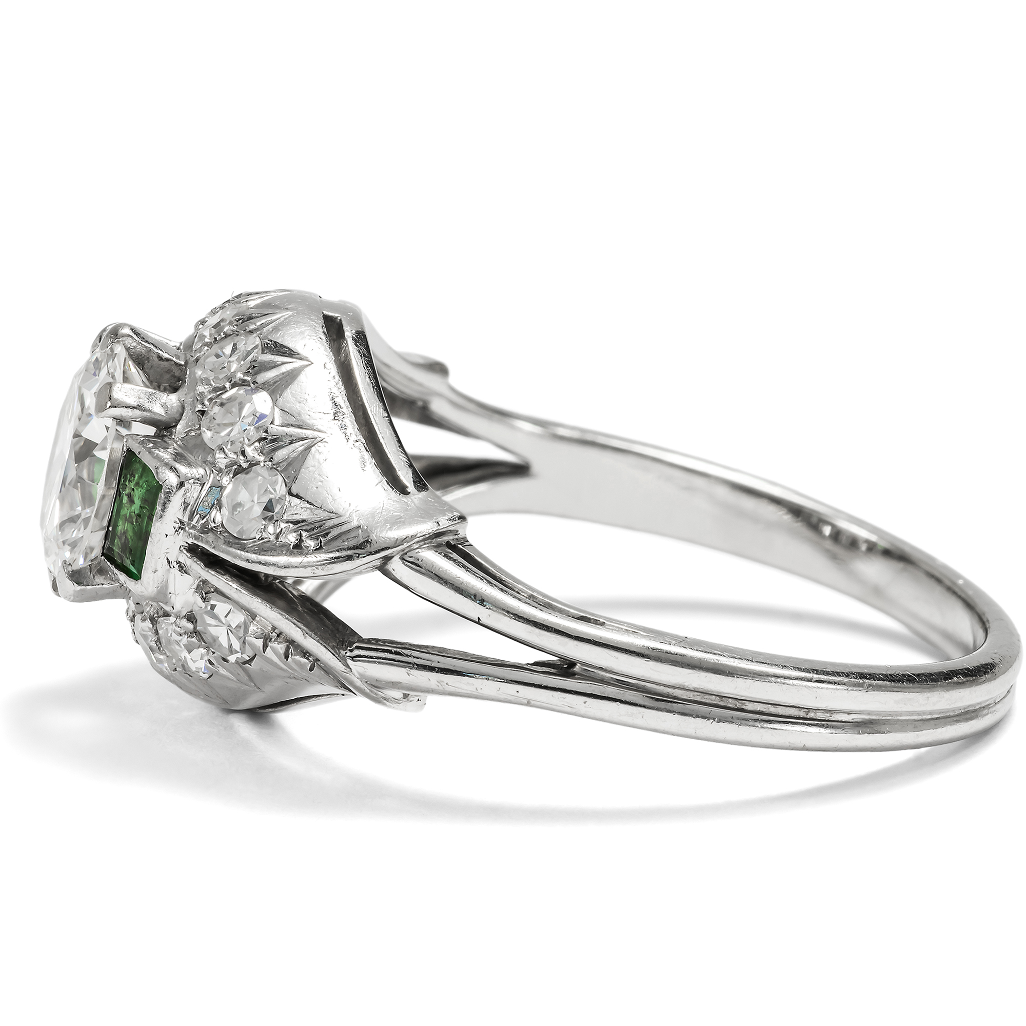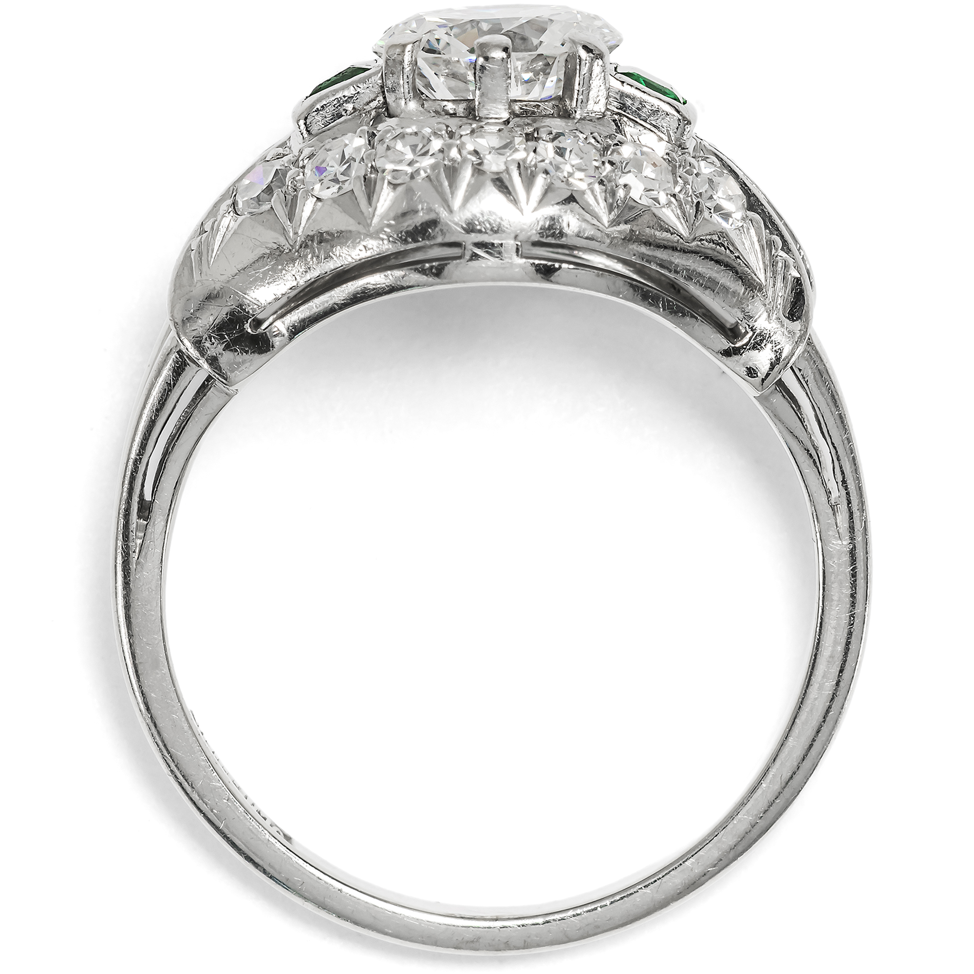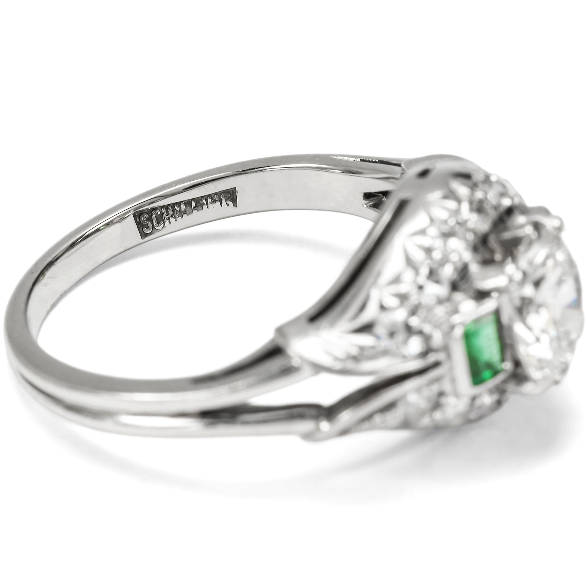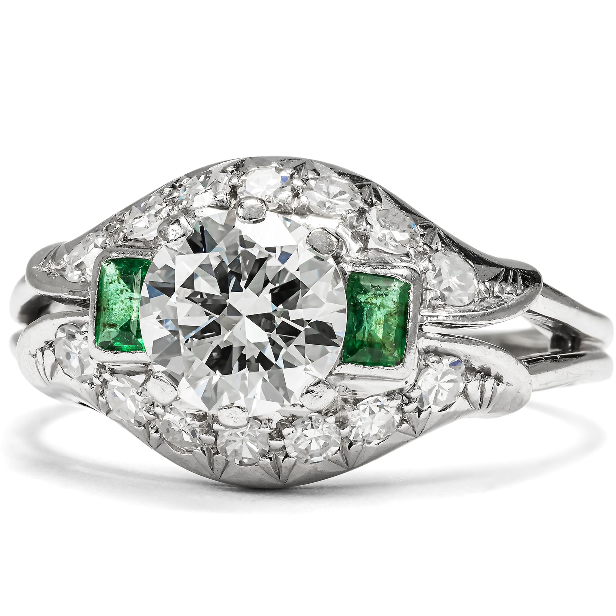 Der vorliegende Ring ist ein luxuriöses Schmuckstück aus der Zeit des deutschen Wirtschaftswunders. Das große Nachholbedürfnis nach Lebensfreude und Luxus nach den Entbehrungen des Krieges befeuerte auch den Bereich des Schmucks. Unser Ring setzt hier bezüglich seiner Ausstattung und qualitätvollen Verarbeitung Maßstäbe. In der Mitte des noch ganz der Formensprache des späten Art Déco verpflichteten Ringes glitzert ein wundervoller Brillant von beeindruckenden etwa 1,30 Karat Gewicht. Der Edelstein hat eine exzellente Farbe (Feines Weiß+ Top Wesselton, F) und zeigt nur wenige, kleine Einschlüsse (si). Flankiert wird der Mittelstein auf beiden Seiten des quergelagerten, kuppelförmig ansteigenden Ringkopfes von jeweils einem rechteckig facettierten Smaragd. Bänder aus Achtkantdiamanten schließen den Ringkopf oben und unten ab. Während der Ringschiene aus Weißgold gearbeitet ist, bestehen die Steinfassungen aus hochkarätigem Palladium, einem Edelmetall, das ab der Mitte der 1930er Jahre verstärkt Eingang in die Schmuckproduktion gefunden hat. Laut Stempelung ist der exquisite Ringe eine Arbeit des Juweliers Schilling aus Stuttgart. Zu uns fand der wohlerhaltene Ring aus Wien. Er wird mit einem externen Gutachten geliefert, das die Qualität der verwendeten Materialien bestätigt.