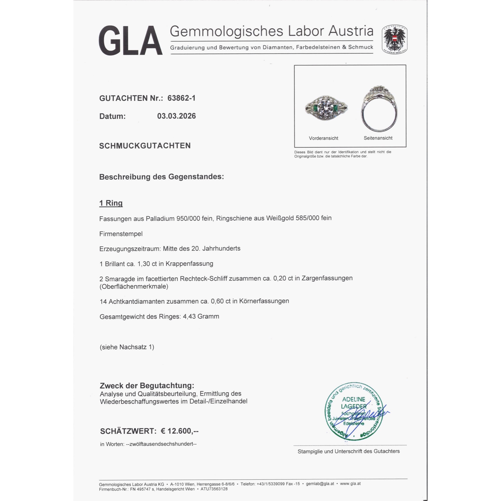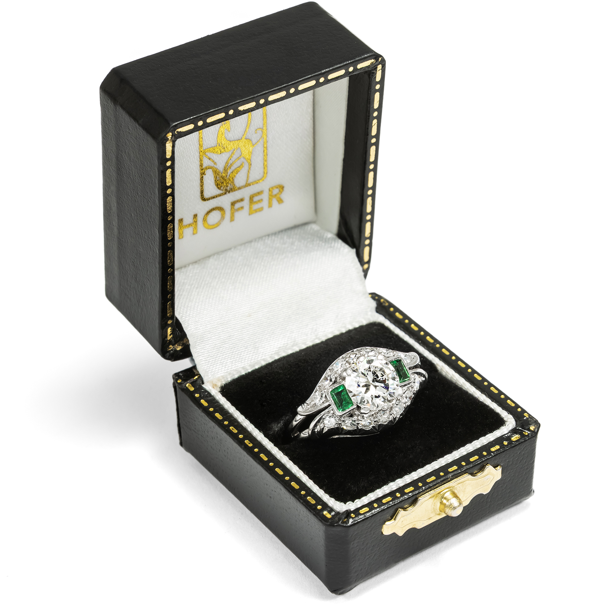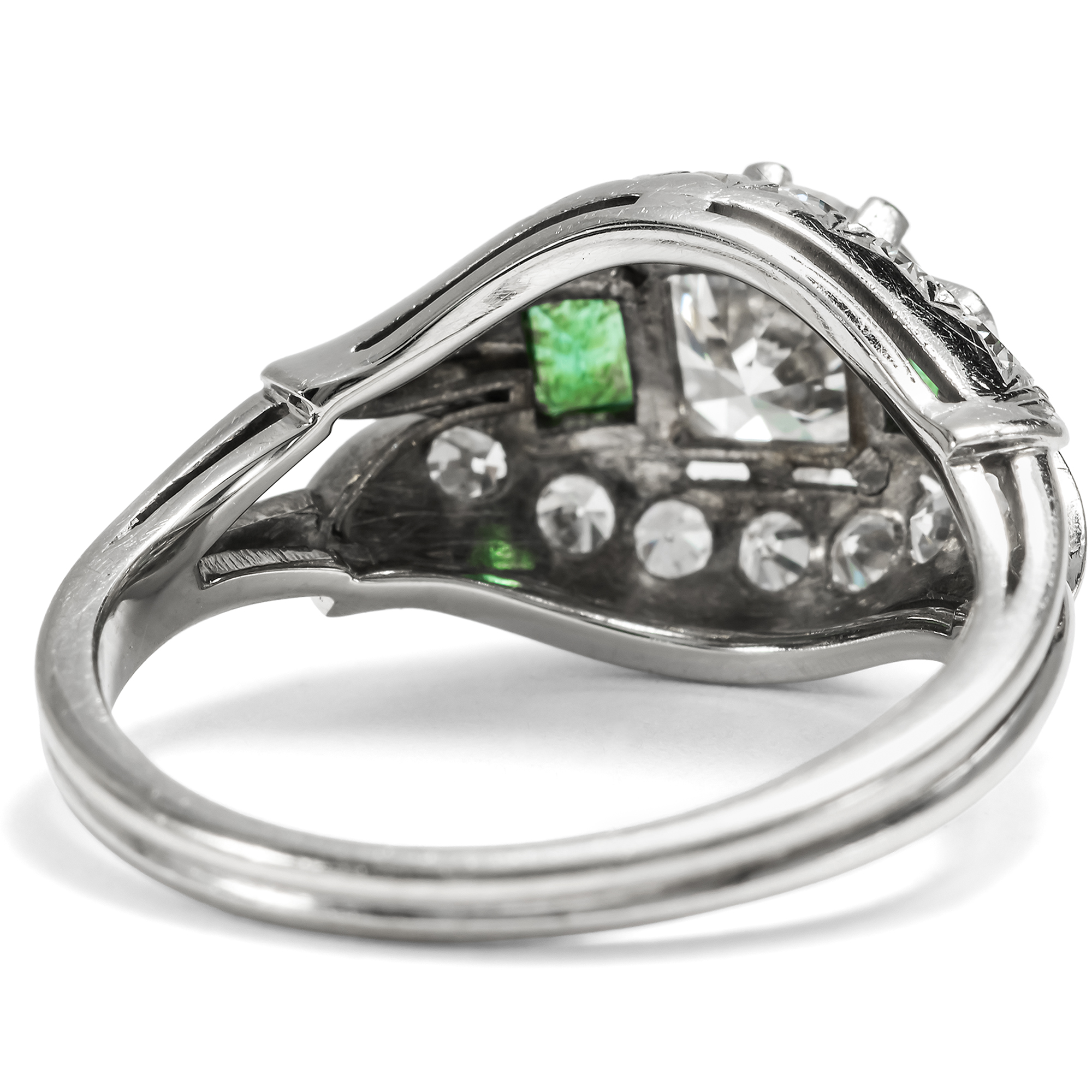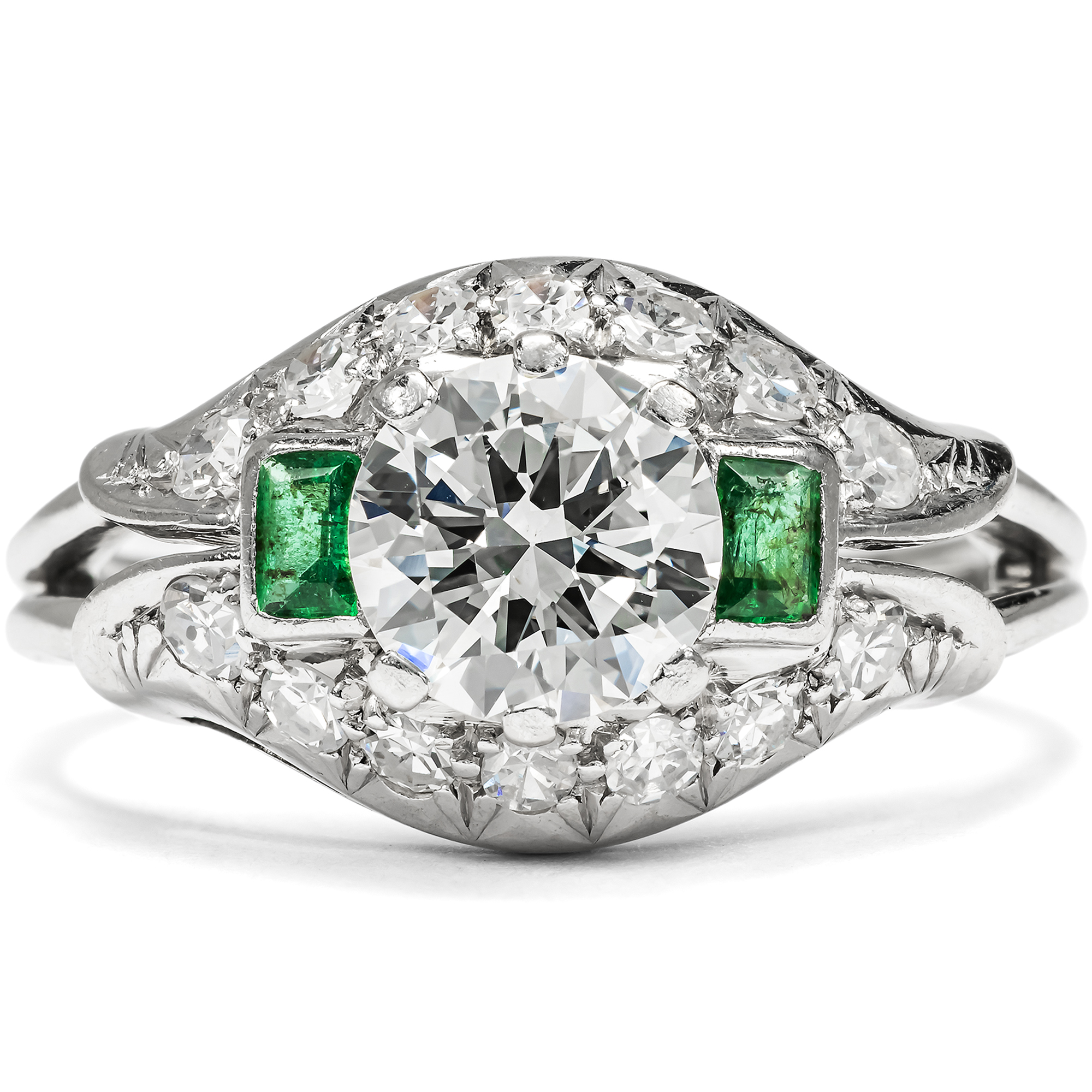 Der vorliegende Ring ist ein luxuriöses Schmuckstück aus der Zeit des deutschen Wirtschaftswunders. Das große Nachholbedürfnis nach Lebensfreude und Luxus nach den Entbehrungen des Krieges befeuerte auch den Bereich des Schmucks. Unser Ring setzt hier bezüglich seiner Ausstattung und qualitätvollen Verarbeitung Maßstäbe. In der Mitte des noch ganz der Formensprache des späten Art Déco verpflichteten Ringes glitzert ein wundervoller Brillant von beeindruckenden etwa 1,30 Karat Gewicht. Der Edelstein hat eine exzellente Farbe (Feines Weiß+ Top Wesselton, F) und zeigt nur wenige, kleine Einschlüsse (si). Flankiert wird der Mittelstein auf beiden Seiten des quergelagerten, kuppelförmig ansteigenden Ringkopfes von jeweils einem rechteckig facettierten Smaragd. Bänder aus Achtkantdiamanten schließen den Ringkopf oben und unten ab. Während der Ringschiene aus Weißgold gearbeitet ist, bestehen die Steinfassungen aus hochkarätigem Palladium, einem Edelmetall, das ab der Mitte der 1930er Jahre verstärkt Eingang in die Schmuckproduktion gefunden hat. Laut Stempelung ist der exquisite Ringe eine Arbeit des Juweliers Schilling aus Stuttgart. Zu uns fand der wohlerhaltene Ring aus Wien. Er wird mit einem externen Gutachten geliefert, das die Qualität der verwendeten Materialien bestätigt.