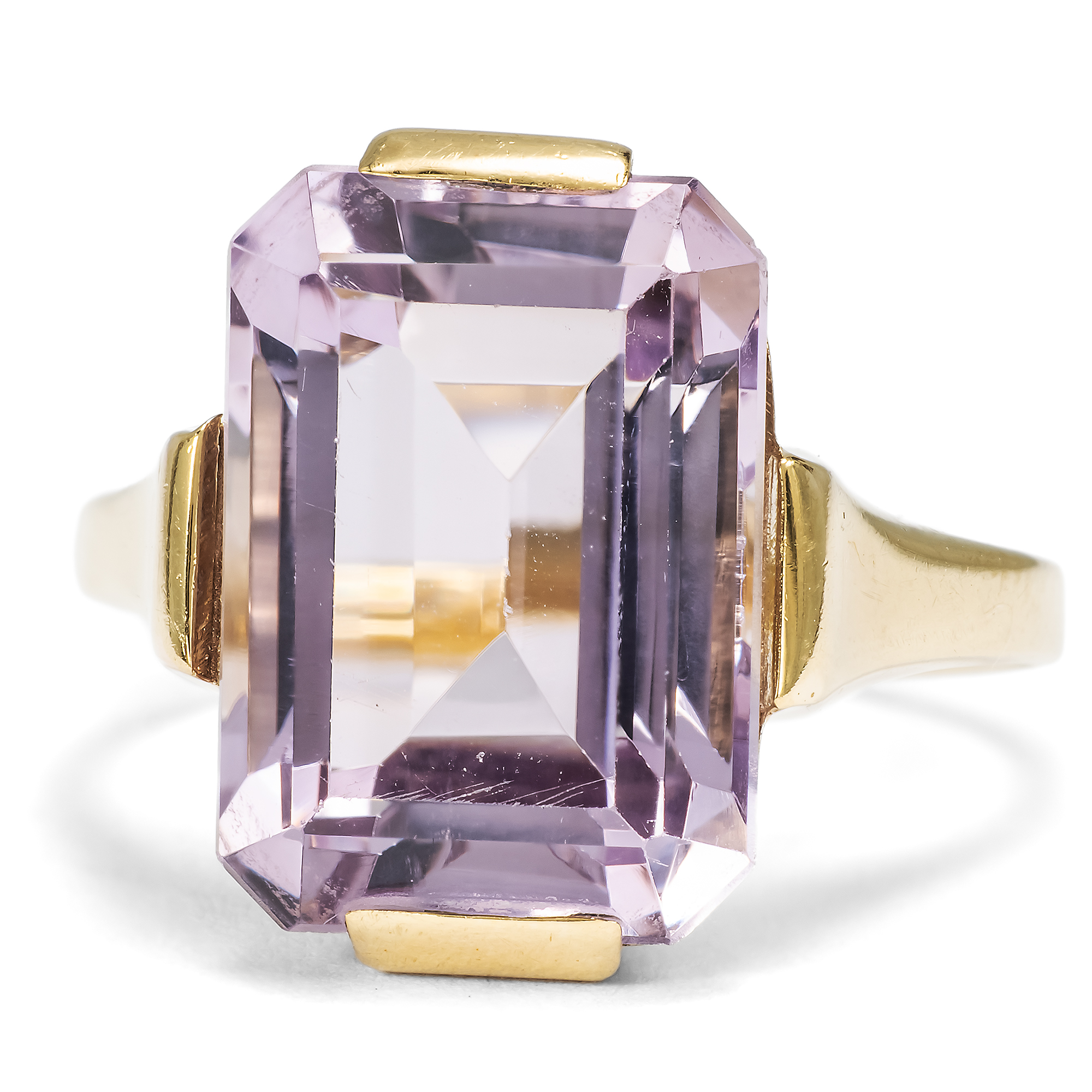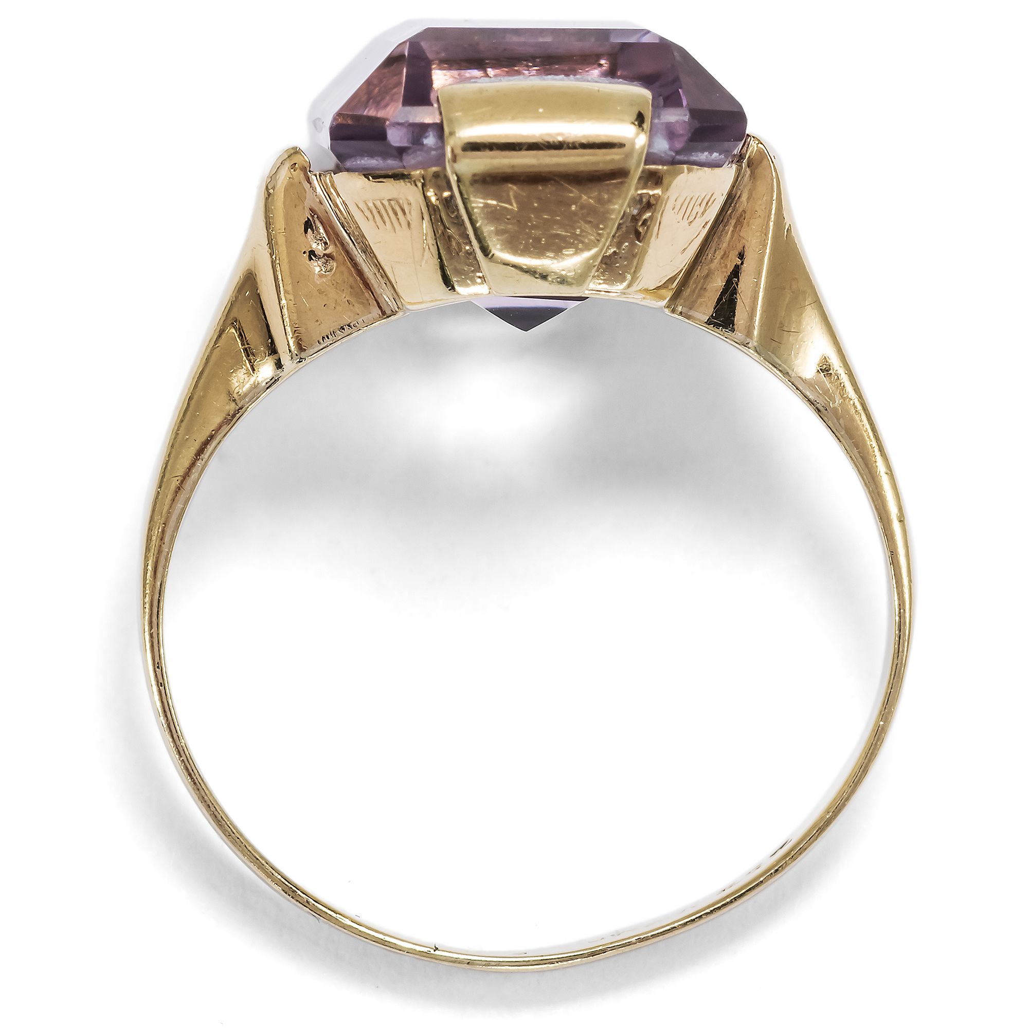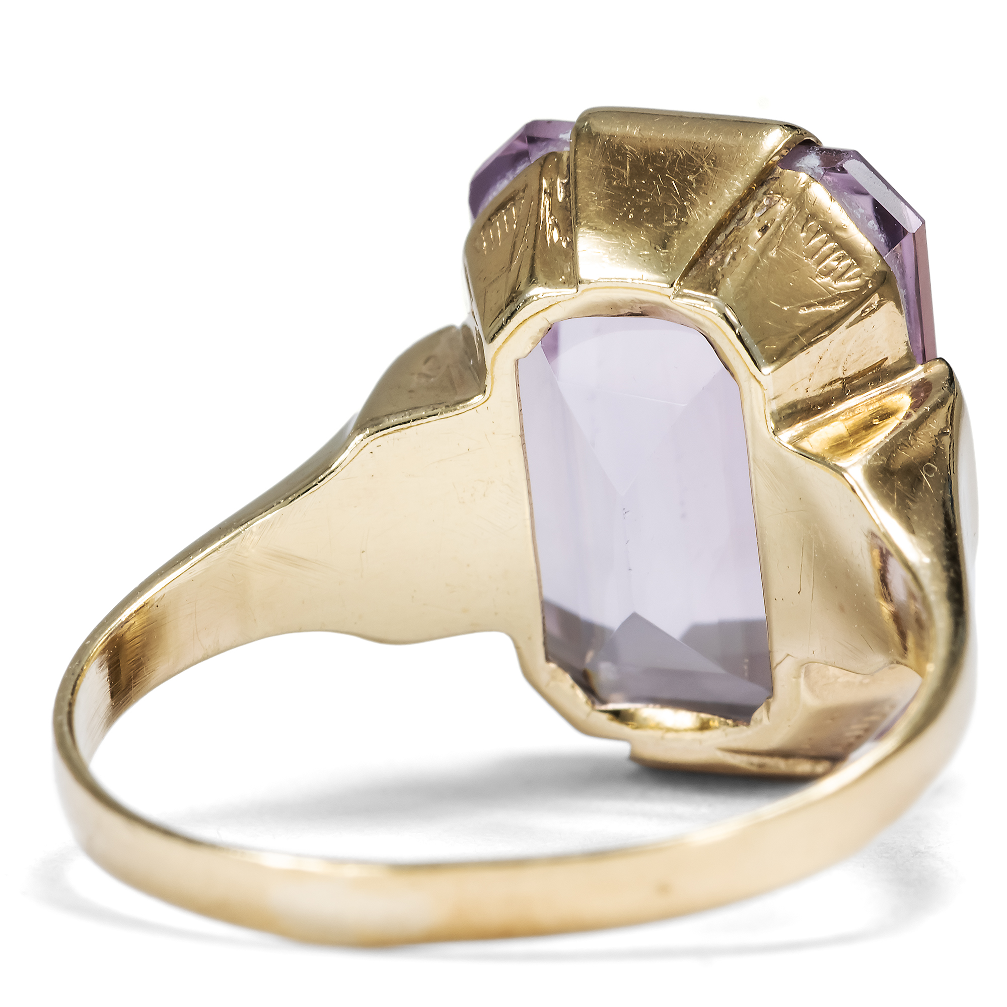 Der Amethyst, der Achat, der Jaspis, Citrin und Onyx – für den Chemiker sind alle diese Edelsteine ganz einheitlich Quarze. Doch wie unterschiedlich sind die Formen und Farben, welche uns die Natur darbietet! Der Amethyst ist der violette Sohn dieser Familie. Sein Name, aus dem griechischen „amethystos“ – „dem Rausche entgegenwirkend“, drückt den alten Glauben aus, dass seine Trägerin gegen die berauschende Wirkung von Wein gefeit sei. Seine Farbe beginnt bei zarten Fliedertönen, die auch „Rose de France“ genannt werden, und reicht bis hin zu einem tiefen Violett, wobei man von „sibirischen“ Amethysten spricht. Ganz im Geschmack der Mitte des 20. Jahrhunderts präsentiert der vorliegende Ring einen facettierten, fliederfarbenen Amethysten. Der im klassischen Smaragdschliff geformte Edelstein bringt bei jeder Bewegung neue Lichtreflexe hervor. Eine schlichte Fassung aus 8-karätigem Gold macht den Stein als Ring tragbar. Der Ring fand aus einer Berliner Sammlung zu uns, seiner Punzierung nach entstand er in einer deutschen Manufaktur.