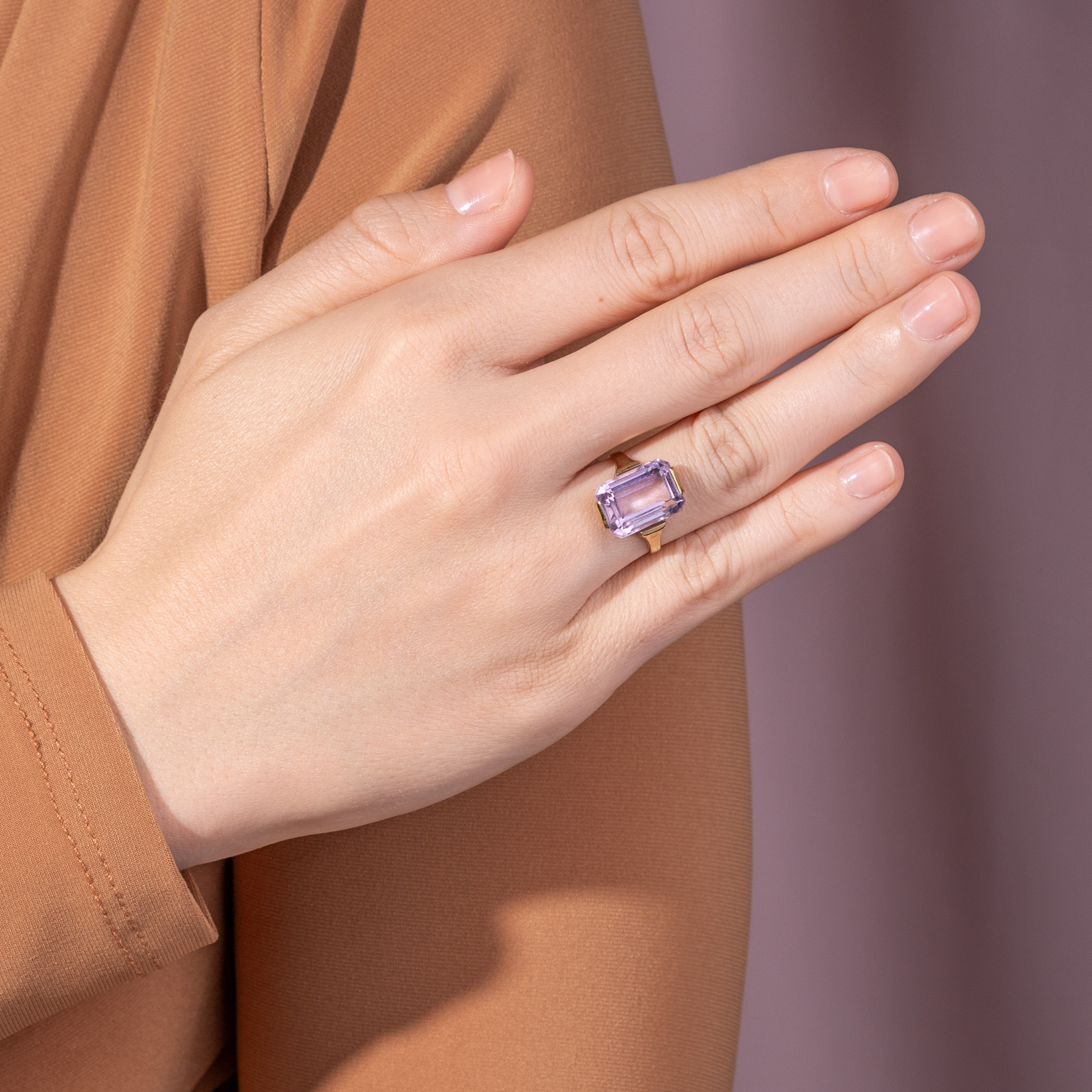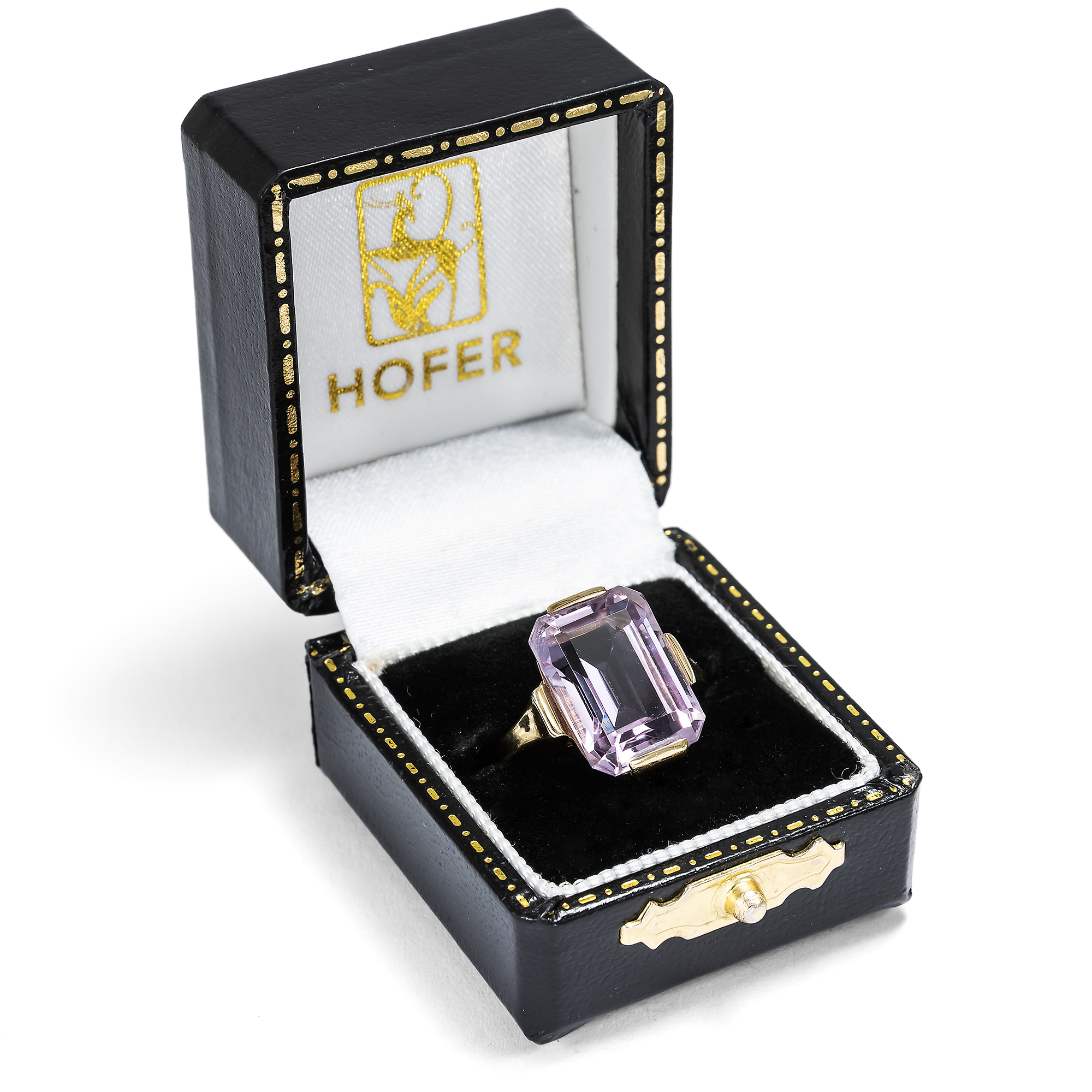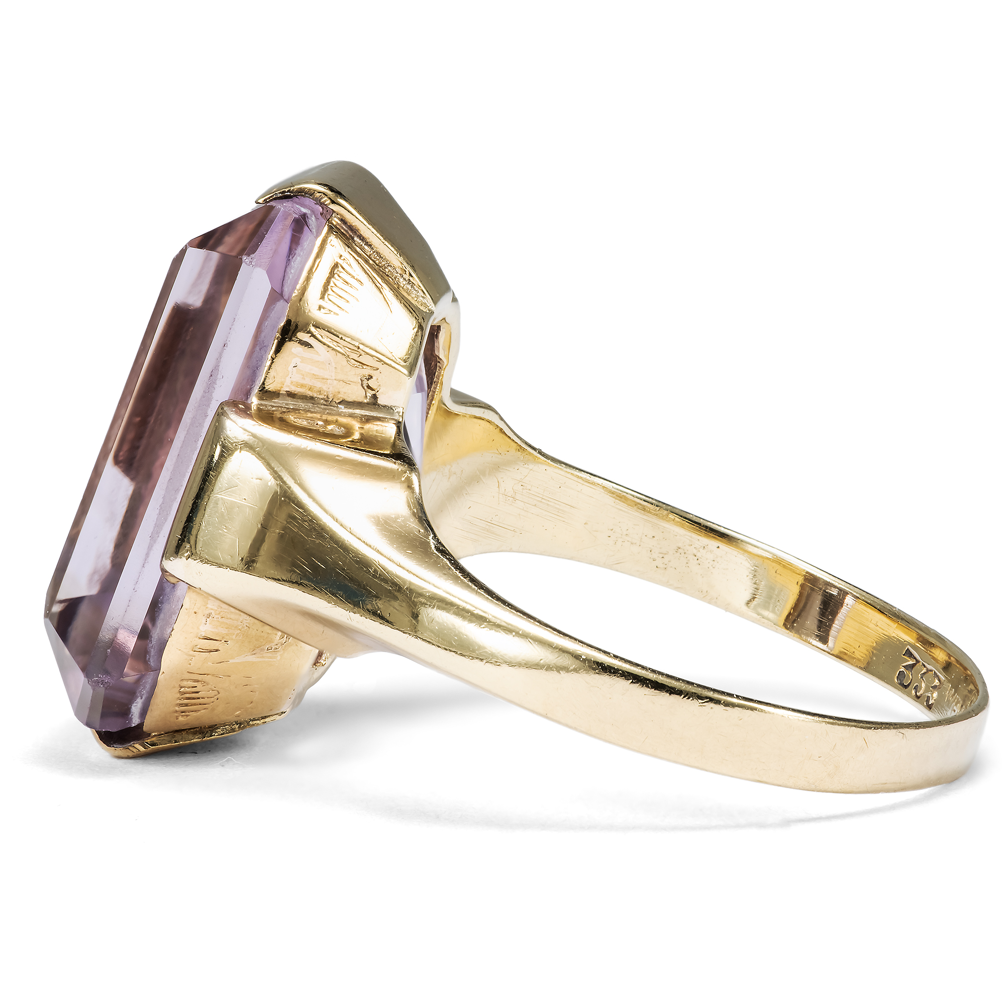 Der Amethyst, der Achat, der Jaspis, Citrin und Onyx – für den Chemiker sind alle diese Edelsteine ganz einheitlich Quarze. Doch wie unterschiedlich sind die Formen und Farben, welche uns die Natur darbietet! Der Amethyst ist der violette Sohn dieser Familie. Sein Name, aus dem griechischen „amethystos“ – „dem Rausche entgegenwirkend“, drückt den alten Glauben aus, dass seine Trägerin gegen die berauschende Wirkung von Wein gefeit sei. Seine Farbe beginnt bei zarten Fliedertönen, die auch „Rose de France“ genannt werden, und reicht bis hin zu einem tiefen Violett, wobei man von „sibirischen“ Amethysten spricht. Ganz im Geschmack der Mitte des 20. Jahrhunderts präsentiert der vorliegende Ring einen facettierten, fliederfarbenen Amethysten. Der im klassischen Smaragdschliff geformte Edelstein bringt bei jeder Bewegung neue Lichtreflexe hervor. Eine schlichte Fassung aus 8-karätigem Gold macht den Stein als Ring tragbar. Der Ring fand aus einer Berliner Sammlung zu uns, seiner Punzierung nach entstand er in einer deutschen Manufaktur.