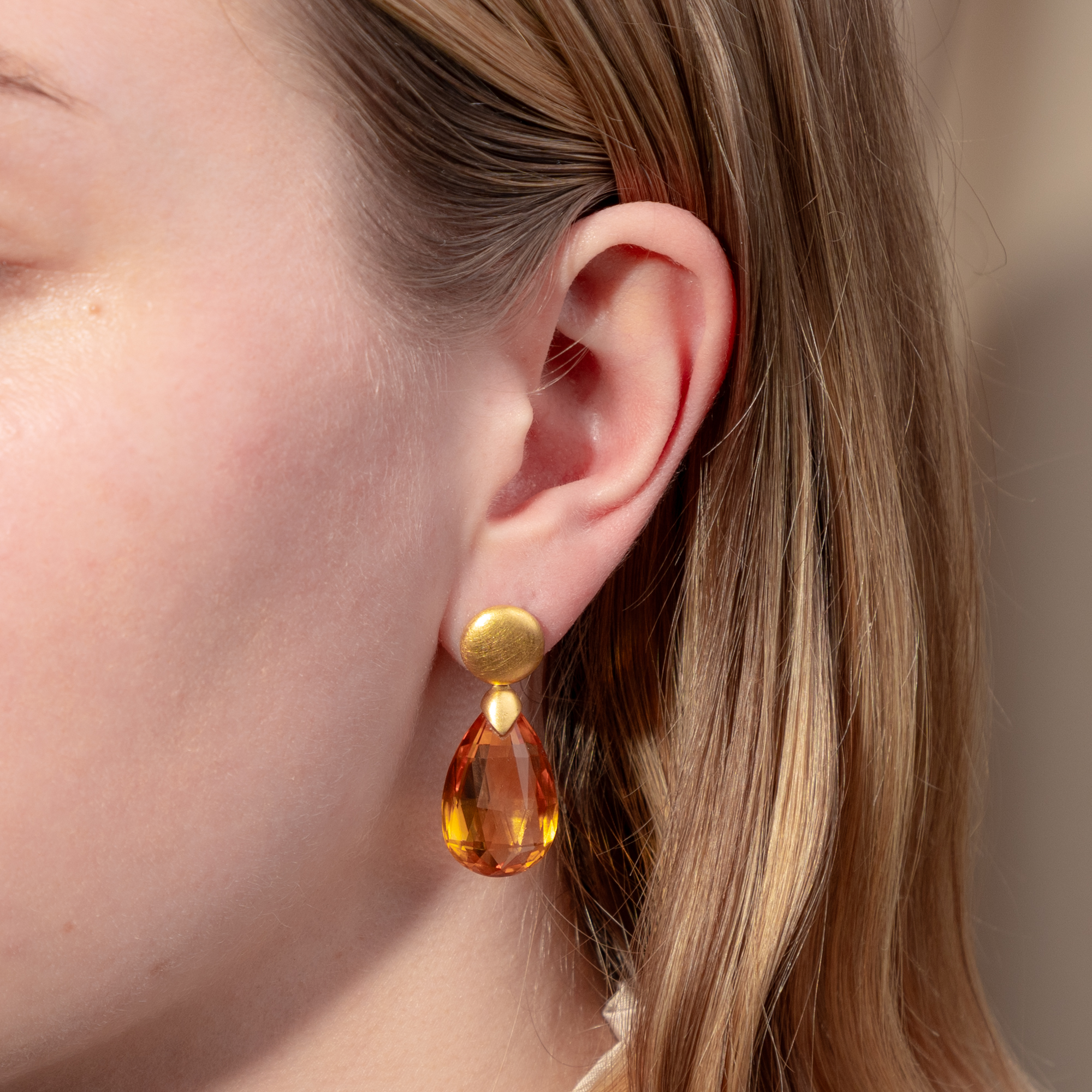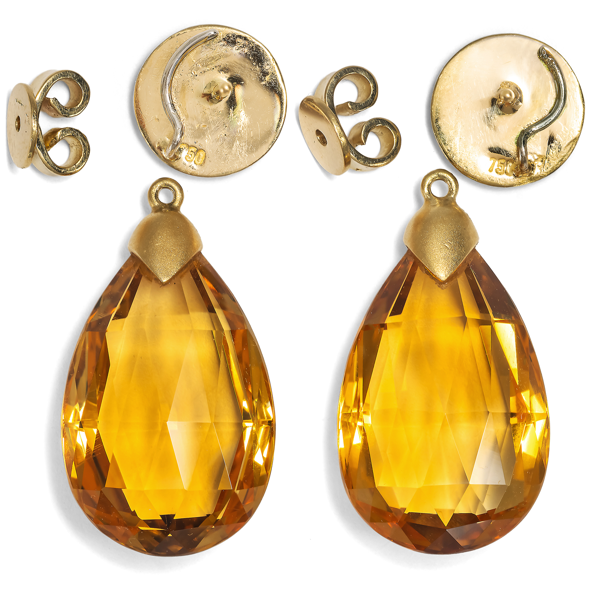 Diese hochwertigen Ohrringe bringen selbst an grauen Tagen ein Stück Sommer zurück: Große, leuchtend gelbe Citrine mit einem Gesamtgewicht von etwa 26 Karat fangen das Licht ein und lassen es warm und lebendig wieder erstrahlen. In ihrem sonnigen Farbspiel erinnern sie an spätnachmittägliche Sonnenstrahlen, golden und voller Leichtigkeit. Harmonisch ergänzt wird dieses Licht von hochkarätigem, mattiertem Gelbgold, dessen zurückhaltender Schimmer den Edelsteinen eine ruhige, elegante Bühne gibt. Die Ohrringe sind als durchdachte, wandelbare Ohrstecker entstanden. Ein knopfförmiges Goldelement verbirgt auf der Rückseite unter dem Ohrstecker einen fein gearbeiteten Haken, an dem die Citrin-Anhänger eingehängt werden können. Gleichzeitig eröffnet diese Konstruktion die Möglichkeit, die Ohrstecker auch allein, oder mit anderen Einhängern oder Perlen zu kombinieren – ein kleines, vielseitiges Schmucksystem, das Raum für Individualität lässt. Das Paar stammt aus dem Sortiment der Münchener Goldschmiede Fochtmann auf der Maximilianstraße. Die Citrine mit ihren Fassungen wurden im Sommer 2003 dort angefertigt. Die Oberteile waren offenbar bereits zuvor bei anderer Gelegenheit erworben worden. Es handelt sich um ein handgeschmiedetes Unikatpaar, gefertigt mit spürbarer Sorgfalt und handwerklichem Anspruch.