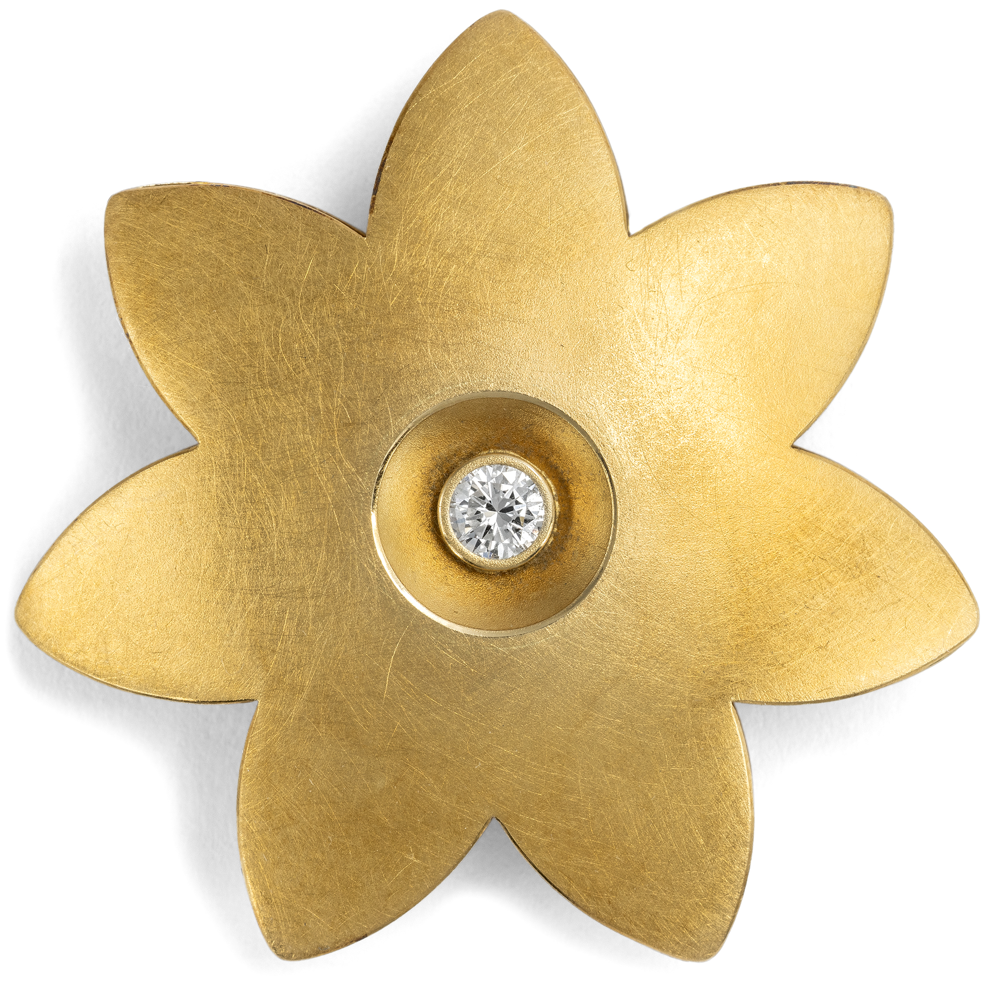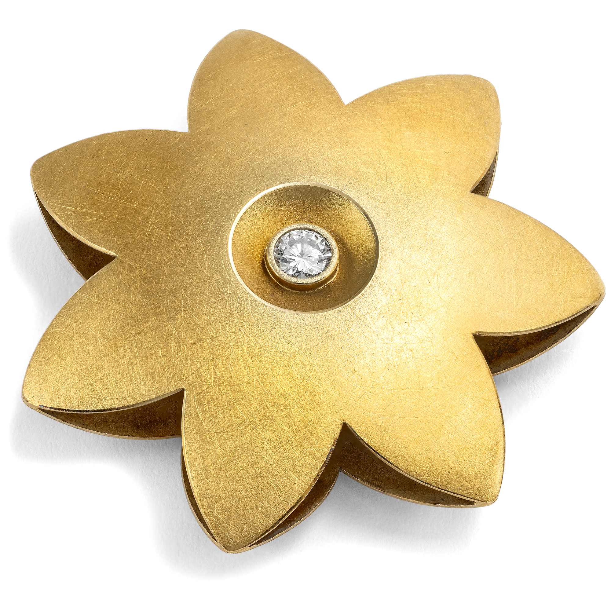 Die Manufaktur Niessing aus Vreden bei Düsseldorf ist eines der bekanntesten deutschen Schmuckhäuser. Der Stil der Entwürfe ist an der reduzierten Ästhetik des Bauhauses orientiert: Klare Linien verbinden sich mit handwerklich bester Verarbeitung. Alle Schmuckstücke werden bis heute von Hand am Niederrhein gefertigt. Hier liegt ein ikonischer Entwurf des Hauses vor, eine Blüte aus mattiertem Gold mit einem Brillanten in der Mitte. Der Grundgedanke des Entwurfes könnte einfacher nicht sein: Eine stilisierte Blüte ist aus zwei Blechen in leichter Wölbung zusammengesetzt, und mittig sitzt der Diamant in einer schlichten Zarge. Unser Exemplar ist aus 18-karätigem Gelbgold gefertigt und von Hand mattiert. Seine Farbe ist tief, doch durch die Mattierung ohne harten Glanz. Gedacht ist das Schmuckstück zum Tragen an einem Halsreif oder einem Lederband. Wir haben das Schmuckstück hier in Berlin entdeckt, als Teil einer Sammlung hochwertigen modernen Künstlerschmucks.