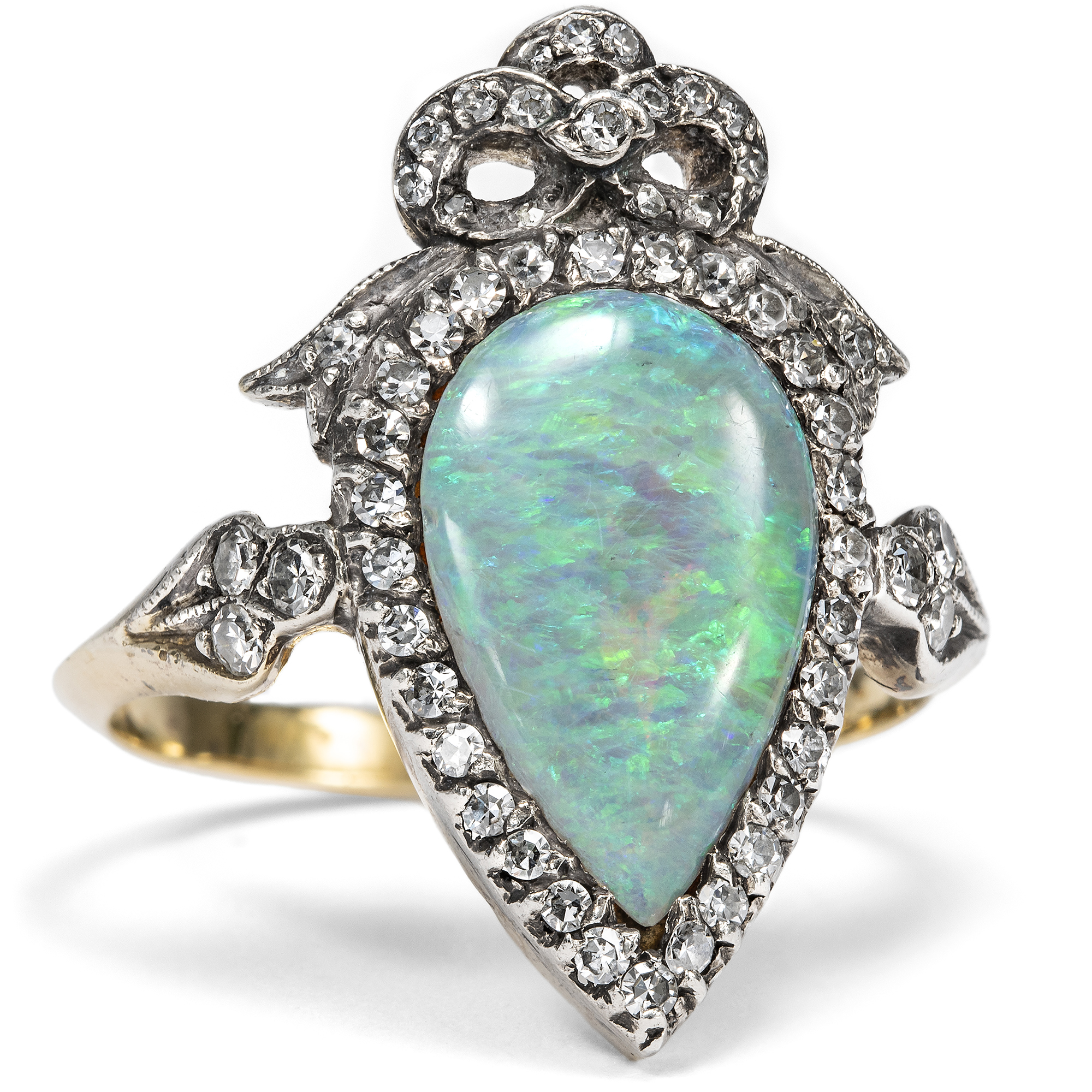 Moden kommen und gehen, doch manch ein Schmuckmotiv ist seit seiner Erfindung einfach geblieben. Ein schönes Beispiel hierfür sind Ringe mit edelsteingeschmückten Herzen, die erstmals in Barock und Rokoko zur großen Mode wurden. Im viktorianischen Zeitalter dann fand diese Mode zu größter Beliebtheit, und insbesondere erfreute man sich in diesem Zeitalter der Symbole und versteckten Botschaften an Herzmotiven, die mit einer Schleife – für Verbundenheit – oder einer Krone – für Loyalität – kombiniert waren. Der hier vorliegende, erst vor wenigen jahren entstandene Ring huldigt diesen viktorianischen Ringen in seiner Form, aber auch durch die Wahl des Besatzes und die feine, anachronistische Ausführung in Silber auf hochkarätigem Gold. Im Zentrum leuchtet als Herz ein schillernder, intensiv bläulich-grüner Opal mit launenhaften roten Reflexen, die je nach Lichteinfall aufblitzen. Ein schmaler Rahmen aus Diamanten in dunklem Silber schmiegt sich um den zentralen Edelstein und schließt ihn nach oben mit einer eleganten Schleife ab. Der Ring ist ein ungewöhnliches souvenir d’amour, das die Blicke auf sich zieht. Wir haben ihn in München entdeckt.