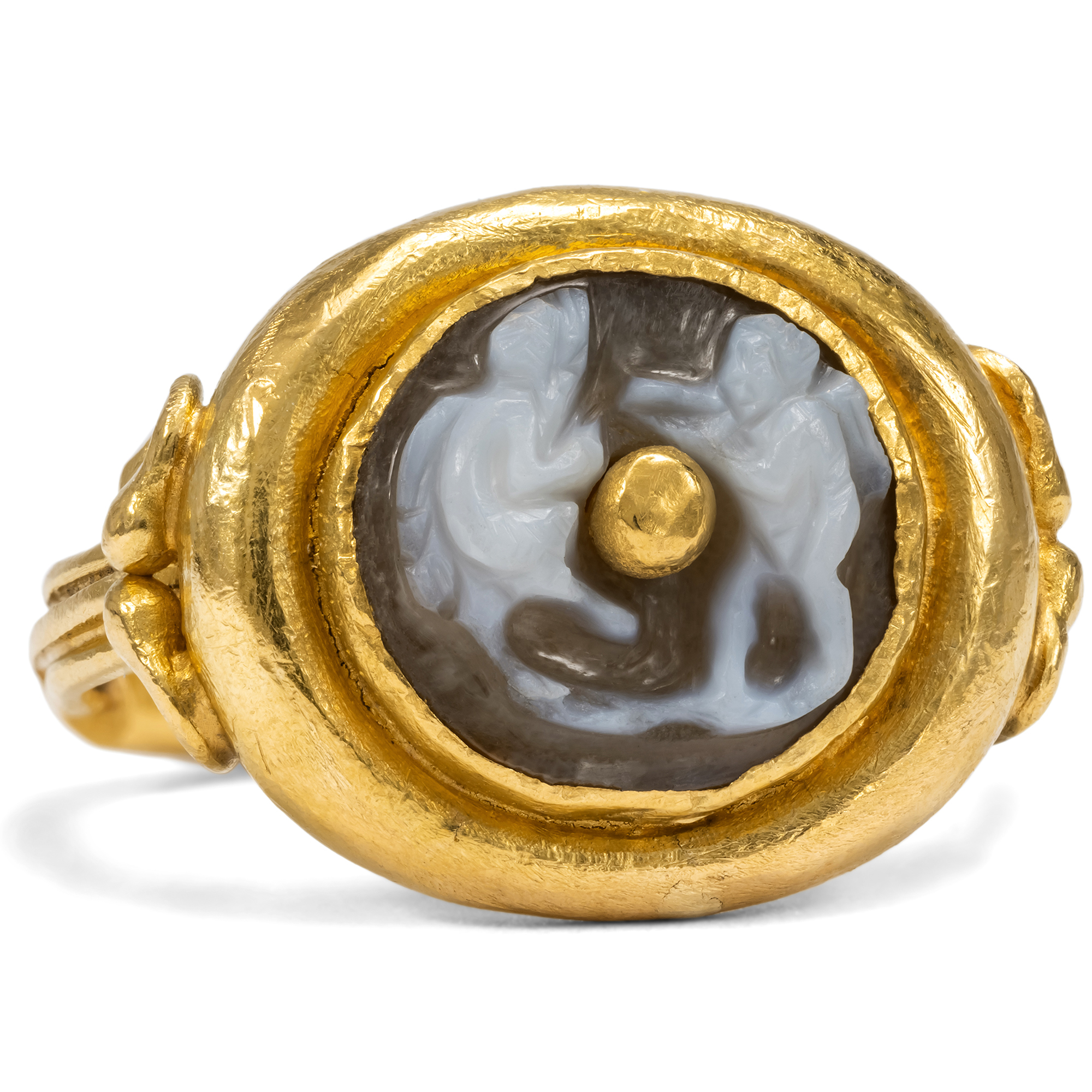 Eines der schönsten und spannendsten Felder im Bereich des Schmucks ist das Sammeln antiker Intaglien und Kameen. Diese in Stein geschnittenen, vertieften und manchmal auch erhabenen Bildnisse bieten eine so große Fülle von Motiven, dass sich für jedes Interesse eine ganze Welt der Gegenstände offenbart. Es gibt antike Gemmen mit Portraits berühmter Personen und Heroen, Darstellungen von Gottheiten und mythischen Ereignissen aber auch Erinnerungen an persönliche Erlebnisse und erzählende Szenen aus dem Alltagsleben. Der hier vorliegende Ring präsentiert einen antik-römischen Steinschnitt aus zweifarbigem Achat. Wir sehen einen Satyr und einen Putto. Der kraftvolle und zugleich etwas abstrahierende Schnitt des Intaglios lässt uns seine Entstehung in der späten Kaiserzeit des 1. oder 2. Jahrhunderts nach Christus annehmen. Gefasst ist die antike Darstellung in einen kraftvollen Ring aus 22-karätigem Gold. Durch die handwerkliche Bearbeitung erhält das Gold eine warme, weiche und lebendige Oberfläche, die den Glanz und die Tiefe des Materials betont und gleichzeitig die Stabilität eines Schmuckstücks gewährleistet. Der Ring ist nicht signiert. Nach Auskunft der Vorbesitzerin stammt er aus der Goldschmiede von Matthias Görig in Hamburg, der auf die Verwendung von antiken Gemmen und Artefakten spezialisiert ist. Sein Entwurf und die Details entsprechen der charakteristischen Handschrift Görigs. Nach annähernd 2000 Jahren ist der Stein nun wieder zu einem ansprechenden Schmuckstück geworden. einem Ring, der mit Freude getragen werden kann.