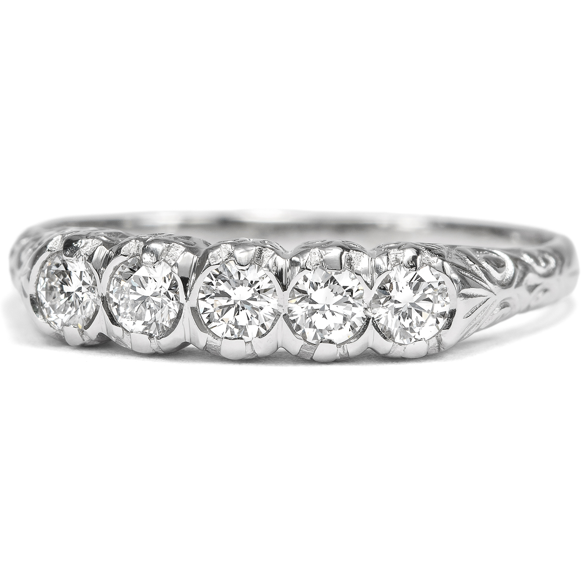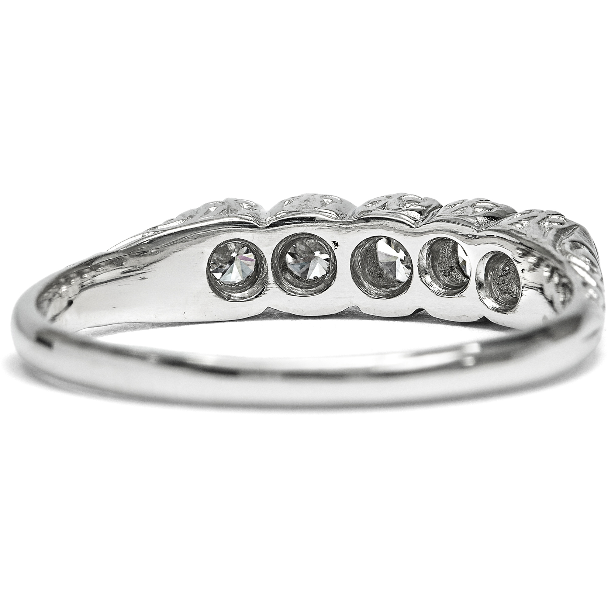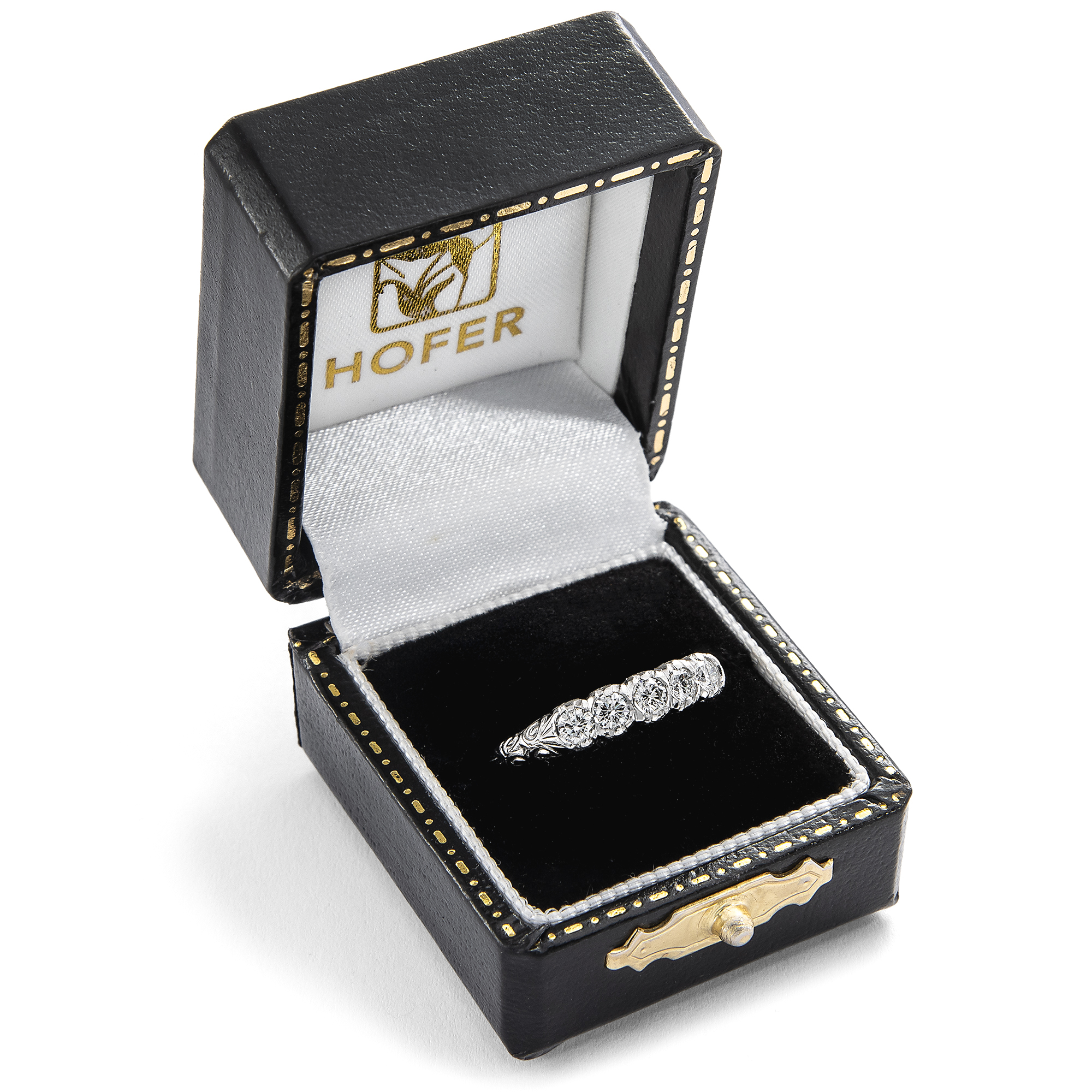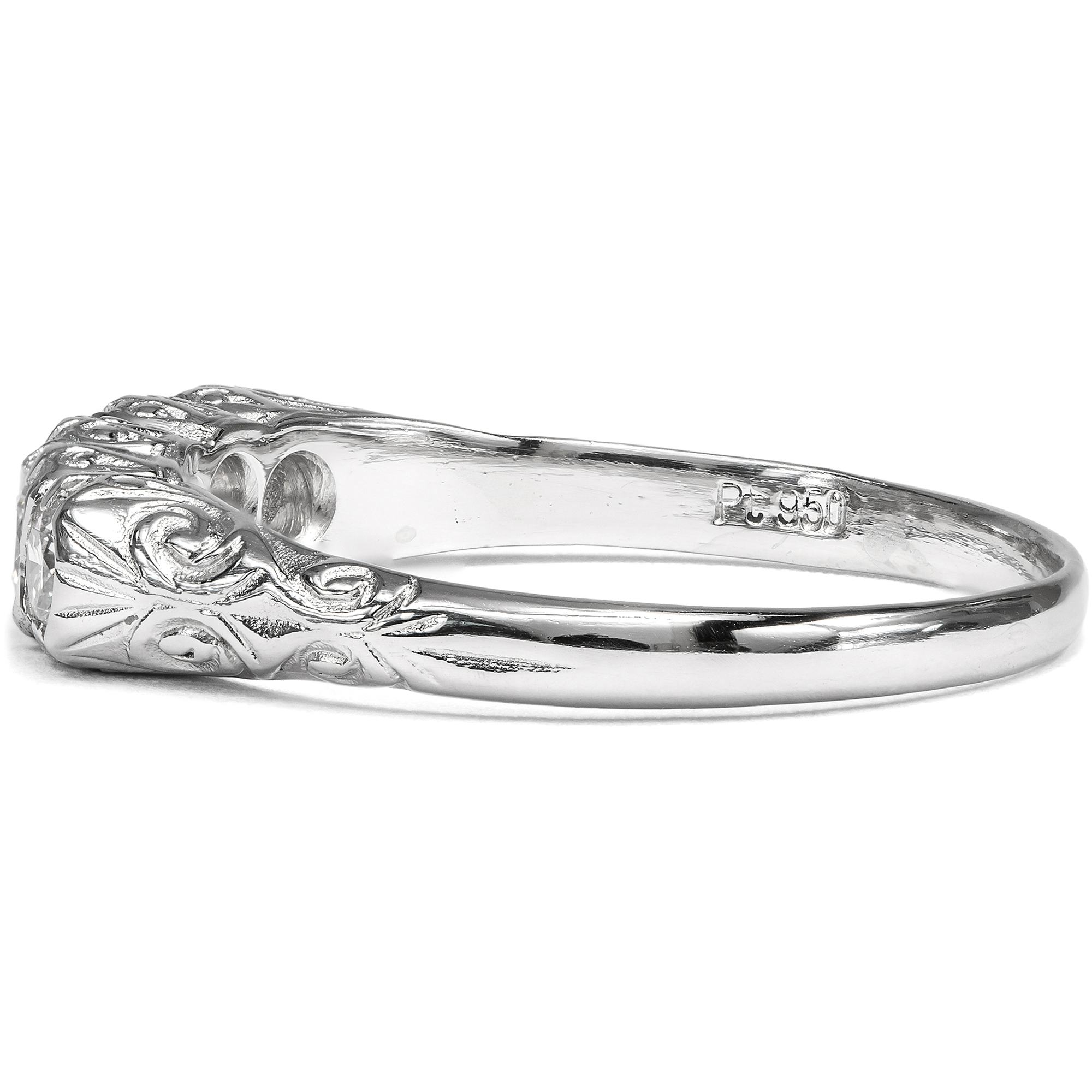 Liebesgötter rechnen nicht... oder rechnen sie doch? Die Zahl Fünf jedenfalls war und ist in vielen Kulturen die Zahl der Liebe. Für die Pythagoreer galt sie als die unteilbare Summe der männlichen Zahl drei und der weiblichen Zahl zwei. Unter anderem galt sie schon in der klassischen Antike deshalb als die Zahl der Liebesgöttin Venus. Fünf funkelnde Vintage-Diamanten im Brillantschliff besetzen auch den hier vorliegenden Ring aus Platin, der in unserer Werkstatt entstanden ist. Die Edelsteine haben ein Gewicht von zusammen etwa 0,39 Karat und sind in einer Reihe quer zum Finger angeordnet, wobei alle Brillanten die gleiche Größe haben. Die Seitenpartien des Ringes sind mit plastischen Gravuren versehen, und dennoch ist der Ring so gebaut, dass er auch zusammen mit einem Ehering getragen werden kann. Die ringsherum geschlossenen Fassungen ohne Krappen machen das Schmuckstück auch täglich uneingeschränkt tragbar, denn es zieht keine Fäden und ist kompakt gebaut. Aus Gründen der Nachhaltigkeit stellen wir diesen Ring aus recycelten Materialien her. Das Platin des Ringes wird hier in Zweitverwendung genutzt. Das Metall stammt aus alten Platin-Schmuckstücken, die eingeschmolzen wurden.