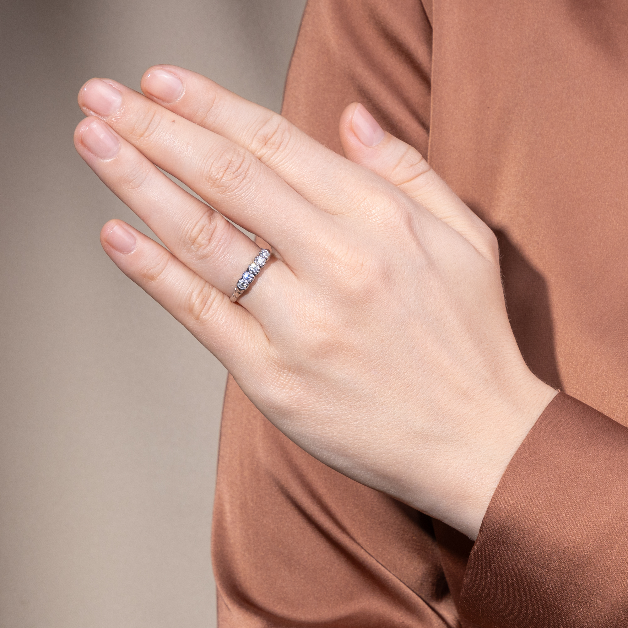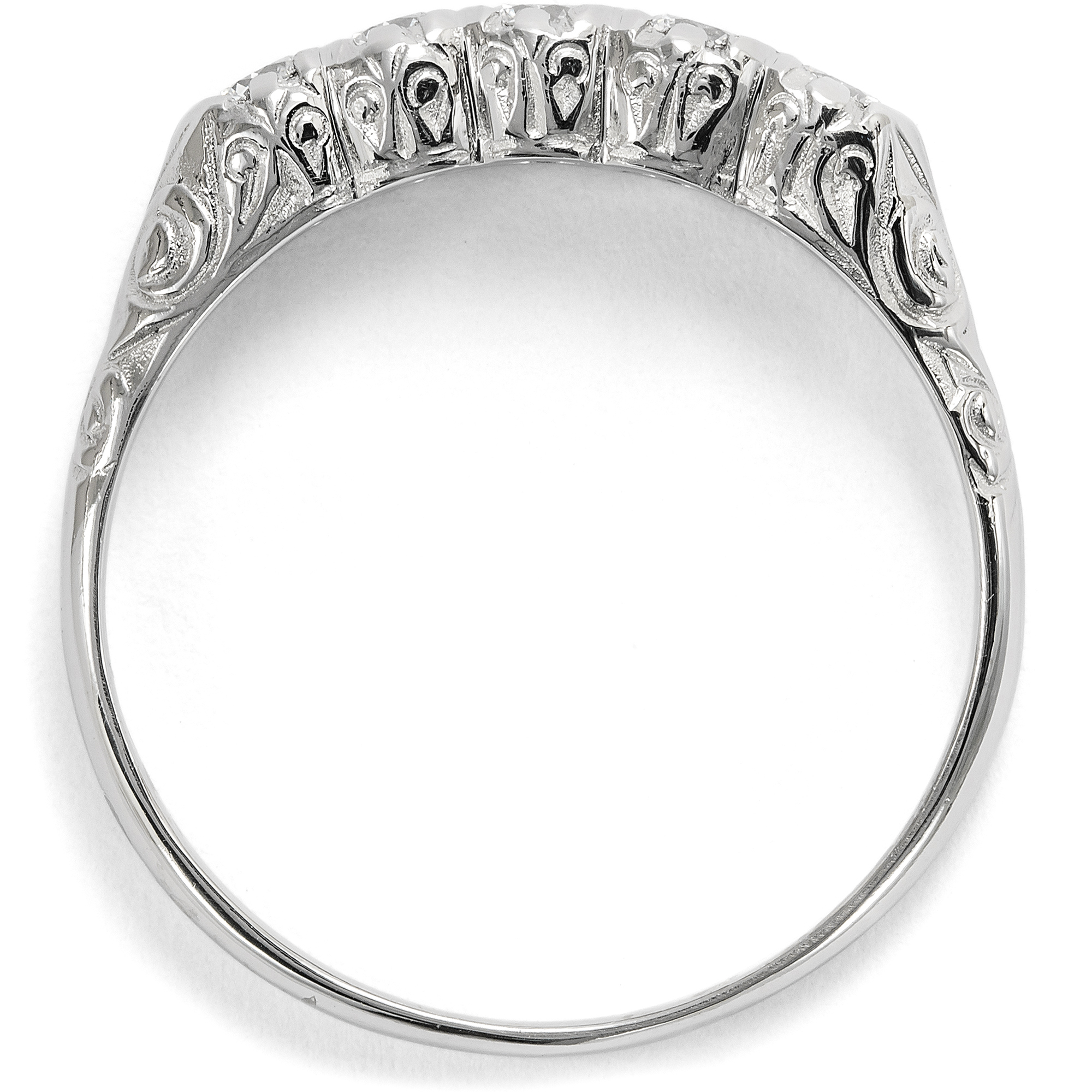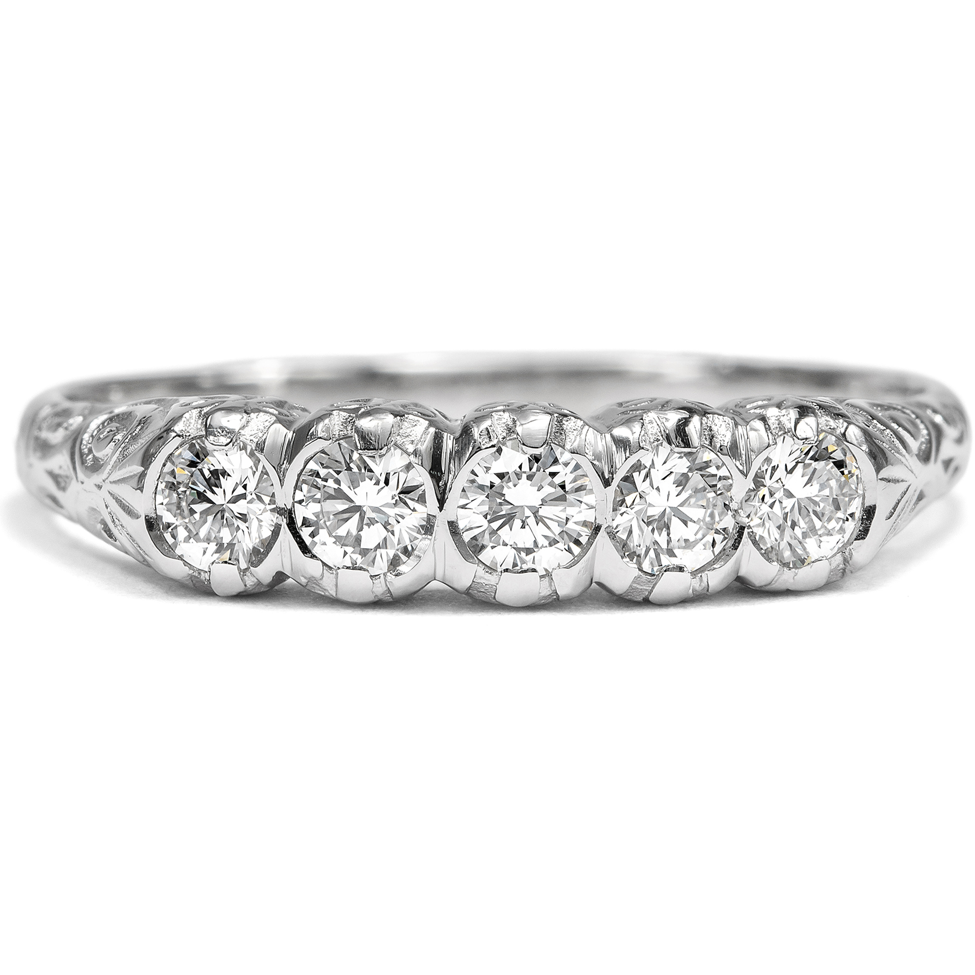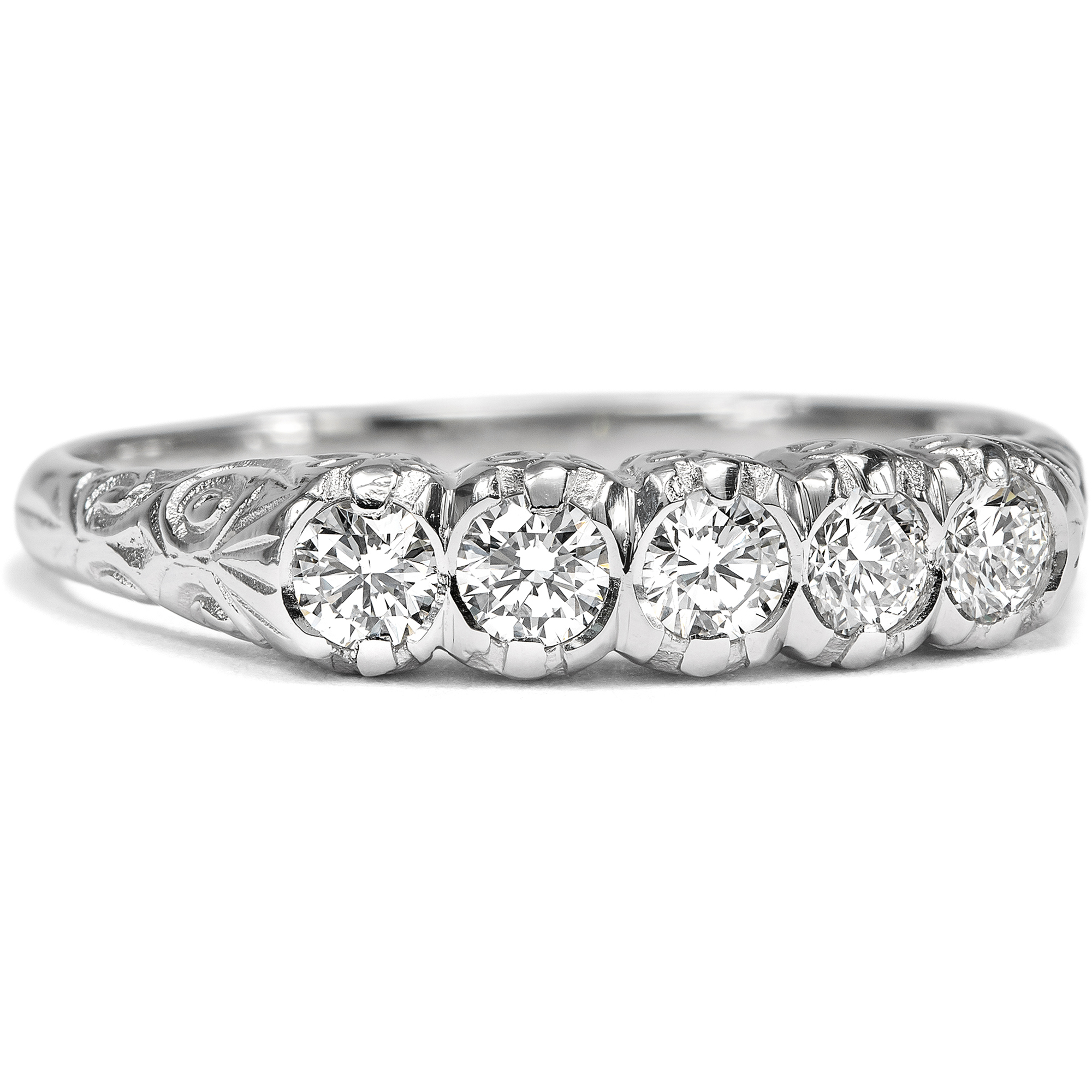 Liebesgötter rechnen nicht... oder rechnen sie doch? Die Zahl Fünf jedenfalls war und ist in vielen Kulturen die Zahl der Liebe. Für die Pythagoreer galt sie als die unteilbare Summe der männlichen Zahl drei und der weiblichen Zahl zwei. Unter anderem galt sie schon in der klassischen Antike deshalb als die Zahl der Liebesgöttin Venus. Fünf funkelnde Vintage-Diamanten im Brillantschliff besetzen auch den hier vorliegenden Ring aus Platin, der in unserer Werkstatt entstanden ist. Die Edelsteine haben ein Gewicht von zusammen etwa 0,39 Karat und sind in einer Reihe quer zum Finger angeordnet, wobei alle Brillanten die gleiche Größe haben. Die Seitenpartien des Ringes sind mit plastischen Gravuren versehen, und dennoch ist der Ring so gebaut, dass er auch zusammen mit einem Ehering getragen werden kann. Die ringsherum geschlossenen Fassungen ohne Krappen machen das Schmuckstück auch täglich uneingeschränkt tragbar, denn es zieht keine Fäden und ist kompakt gebaut. Aus Gründen der Nachhaltigkeit stellen wir diesen Ring aus recycelten Materialien her. Das Platin des Ringes wird hier in Zweitverwendung genutzt. Das Metall stammt aus alten Platin-Schmuckstücken, die eingeschmolzen wurden.