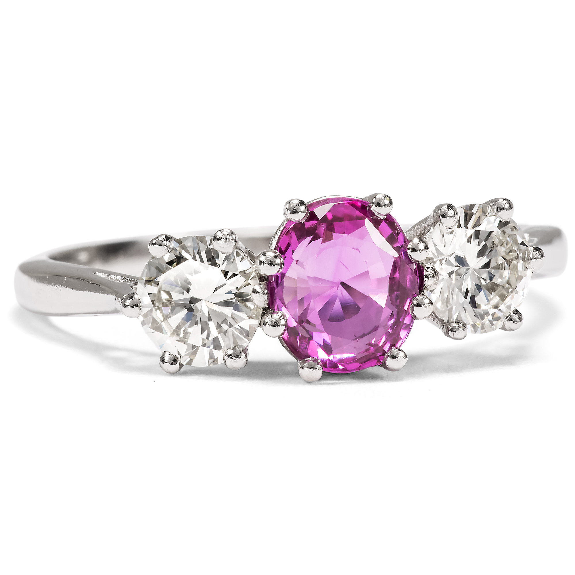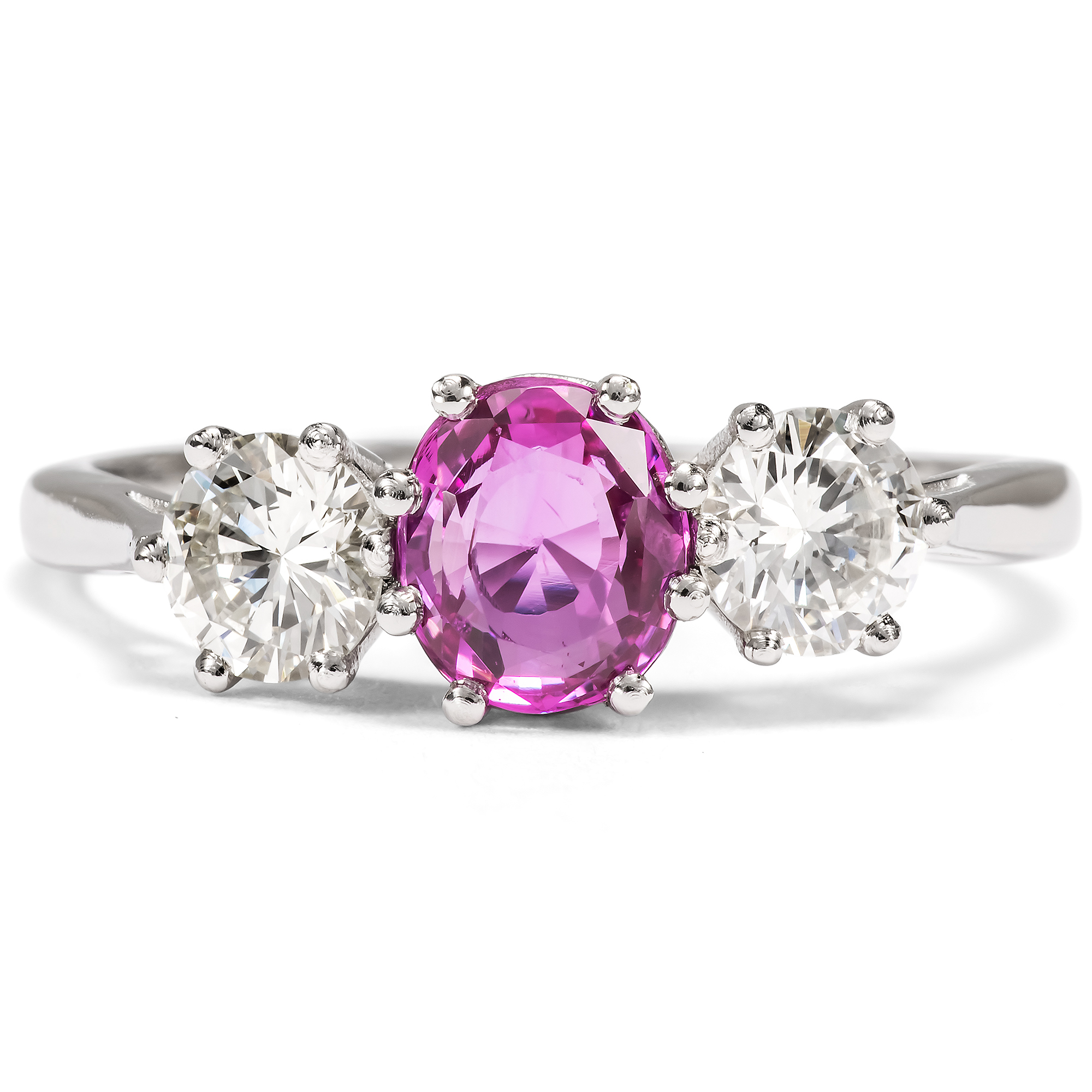 Trilogie-Ringe gehören zu den besonders romantischen Stücken der Schmuckgeschichte. Denn dass hier genau drei Edelsteine verwendet sind, ist symbolisch gemeint: Sie stehen für eine gemeinsame Vergangenheit, Gegenwart und Zukunft. Oft ist der mittlere Stein dabei betont und legt so den Fokus auf die Gegenwart der Liebe. Im hier vorliegenden Ring ist dies genau so gemacht. Ein oval facettierter pinkfarbener Saphir wird links und rechts von je einem Diamanten gerahmt. Der Saphir ist dabei ein ganz besonderer Stein: Er ist unbehandelt, nicht erhitzt und so wie er vor uns steht von der Natur geschaffen. Seine besondere Qualität wird durch ein Gutachten bestätigt, welches dem Ring beiliegt. Zarte Krappenfassungen halten die Edelsteine, deren Farbe so durch nichts getrübt wird. Der Ring ist aus Platin gearbeitet und überzeugt durch seine elegante Schlichtheit bei dem die Edelsteine im Vordergrund stehen. Wir haben den Ring aus recycelten Materialien nachhaltig hergestellt. Sein Platin stammt aus älteren Schmuckstücken, die nicht mehr tragbar waren und die wir daher einschmelzen mussten. Auch die Edelsteine, sowohl der Saphir als auch die Diamanten, sind hier in Zweitverwendung eingesetzt. Die Diamanten wurden schon vor mehr als fünfzig Jahren geschliffen. Es handelt sich um Diamanten sehr guter Reinheit und schöner weißer Farbe. Trilogie-Ringe waren insbesondere in den frühen Jahren des 20. Jahrhunderts beliebt. Der Ring aus unserer Werkstatt steht in dieser Tradition. Er ist ungetragen und unser Goldschmied passt ihn gern für Sie auf die benötigte Ringweite an.