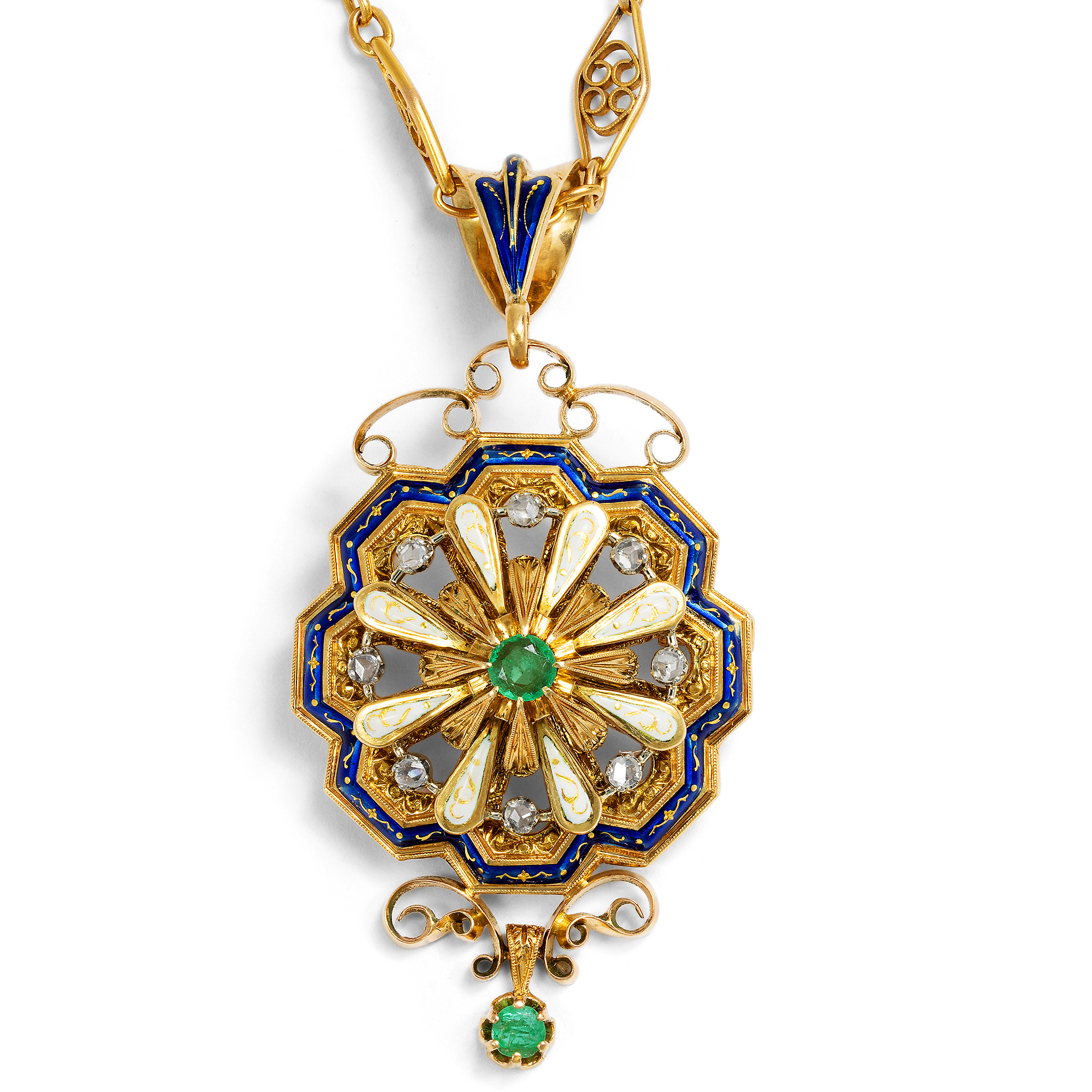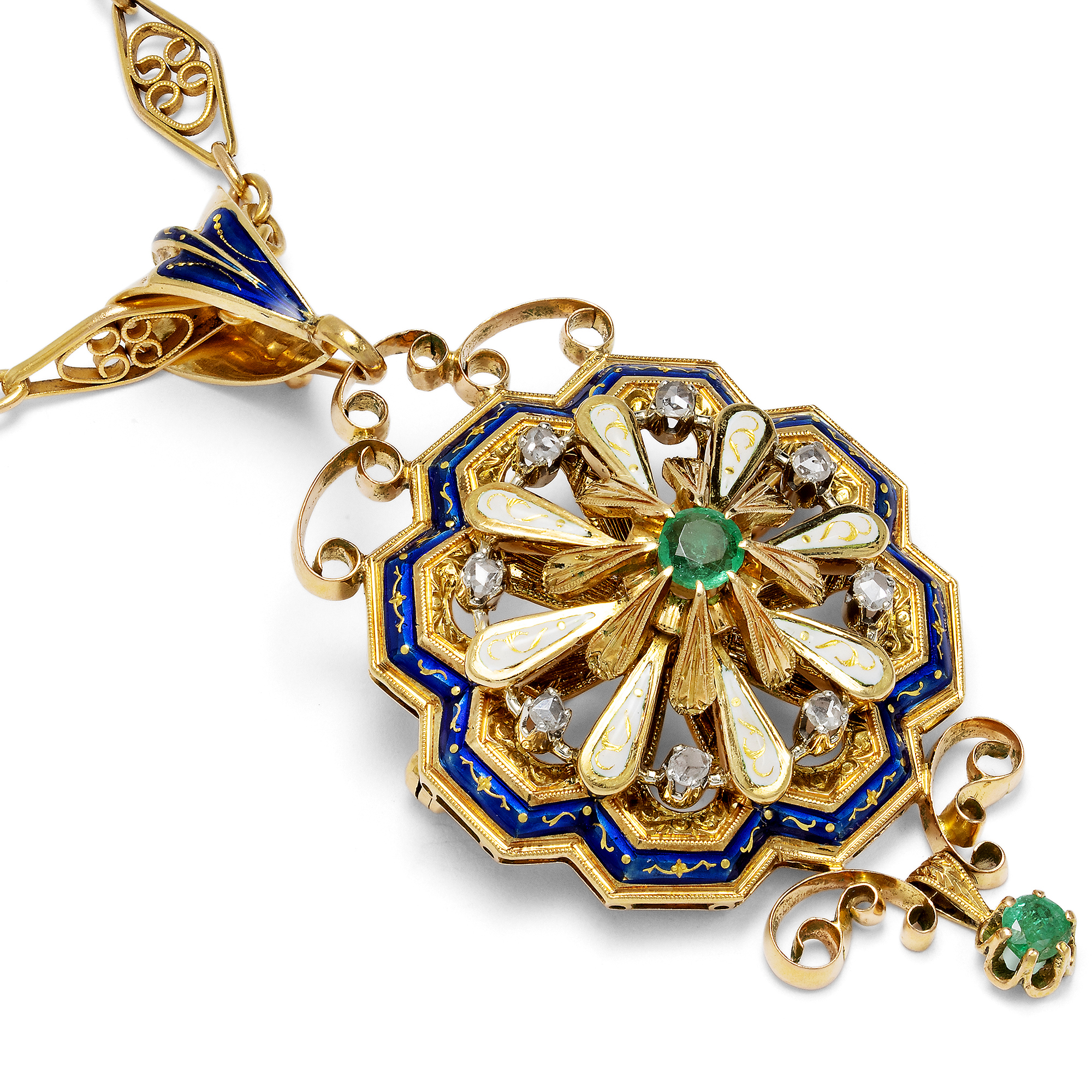 Der Schmuck der 1930er Jahre besinnt sich wieder mehr auf die Geschichte der Goldschmiedekunst, als dies die kühle und modernistische Formensprache der 1920er Jahre getan hatte. Mit dem neuen Jahrzehnt wurden die Schmuckstücke voluminöser, und hier und da mischte sich mit modernen Formen die eine oder andere Reminiszenz an das Biedermeier oder die Renaissance, als Sinnbild der „guten alten Zeit“. Das hier vorliegende Schmuckstück ist ein schönes Beispiel für diese wiedergekehrte Lust am reichen Dekor. Sein Entwurf nimmt Bezug auf die Neo-Renaissance des 19. Jahrhunderts im sog. Holbeinstil. Er ist gestaffelt und symmetrisch, sehr elegant liegt auf einem ein- und ausschwingenden Grund mit blauem Dekor eine Blüte mit acht Blättern aus weißem Email und Diamanten. Die Mitte nimmt ein leuchtender Smaragd ein, noch einmal emporgehoben durch acht weitere wie Blütenblätter wirkende Elemente aus Gold. Schön ist, dass der Anhänger auch als Brosche getragen werden kann. Die Schlaufe oben lässt sich dazu aushängen. Die Kette ist sehr wahrscheinlich in den USA entstanden und später zudem wohl mit dem in Deutschland entstandenen Anhänger kombiniert worden: Beide passen in ihrer Farbe und mit ihren reichen Formen ganz perfekt zueinander. Die Verarbeitung aus hochkarätigem, schwerem Gelbgold und Weißgold sowie die Schliffe der Steine lassen keinen Zweifel daran, dass das Collier ein Kind der 1930er Jahre ist. Und so ist es doch ganz modern, bei allen Anleihen an die Vergangenheit: Es ist ein nostalgischer Blick zurück in eine nostalgisch verklärte Vergangenheit, die ganz typisch war für seine Entstehungszeit. Wir haben das Set hier in Berlin entdeckt.