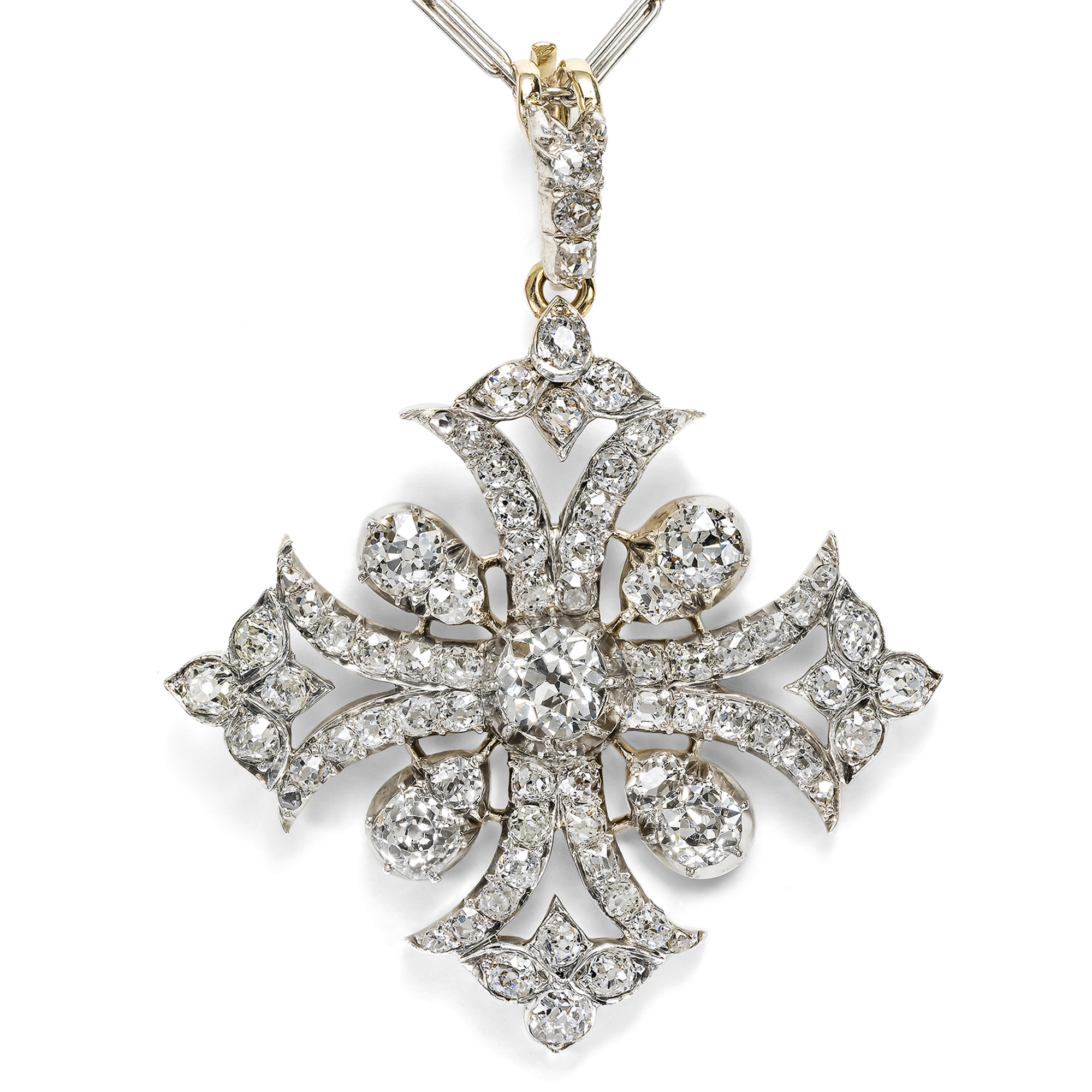 Dieser Anhänger bereitet große Freude – denn er scheint aus nichts als aus funkelndem Licht zu bestehen. Dicht an dicht sind hier rund 5,25 ct Diamanten in Silber gefasst. Ihre antiken Schliffe brechen das Licht auf eine weiche, sinnliche Weise, voller warmem Feuer. Es scheint, als schwebe eine große Schneeflocke vor uns, ein Eiskristall oder ein funkelnder Stern. Die Anordnung der Steine folgt einer ruhigen Symmetrie, welche der Komposition eine feierliche Wirkung verleiht. Wir sehen ein Kreuz, dessen Form vom Malteserkreuz abgeleitet ist. Schmuck mit Malteserkreuzen war eine große Mode in der ersten Hälfte des 19. Jahrhunderts, vor allem in Großbritannien. Seine symmetrische, kompakte Form kam dem Geschmack der Zeit für geschlossene dichte Entwürfe offenbar entgegen. Die Schliffe der Diamanten sowie die Art der Fassungen sind typisch für dieselbe Zeit. Die Steine sind alle sehr individuell geschliffen, im sog. „Old Mine Cut“, aber auch in anderen, eher eckigeren, noch dem Peruzzi-Schliff verwandten Schliffen. Wir datieren das Kreuz daher in die Jahre um 1850, noch vor der Entdeckung der Diamantvorkommen in Südafrika im Jahr 1866. Schmuck mit Diamanten war damals noch viel kostbarer als heute. Allein in Brasilien und Indien wurden damals Diamanten gefördert, doch freilich in viel geringerer Zahl, und wenn Diamantschmuck entstand, war er ein besonderes Privileg. Die im späten 19. Jahrhundert erneuerte Anhängerschlaufe ist so gestaltet, dass der Anhänger auch an einer Perlenkette getragen werden kann. Wir haben den Anhänger zusammen mit der beiliegenden Kette aus Platin erworben. Sie ist etwas später entstanden, in den ersten Dekaden des 20. Jahrhunderts. Zu dem Anhänger liegt ein unabhängiges Gutachten vor. Wir haben das Schmuckstück in Wien erwerben können.