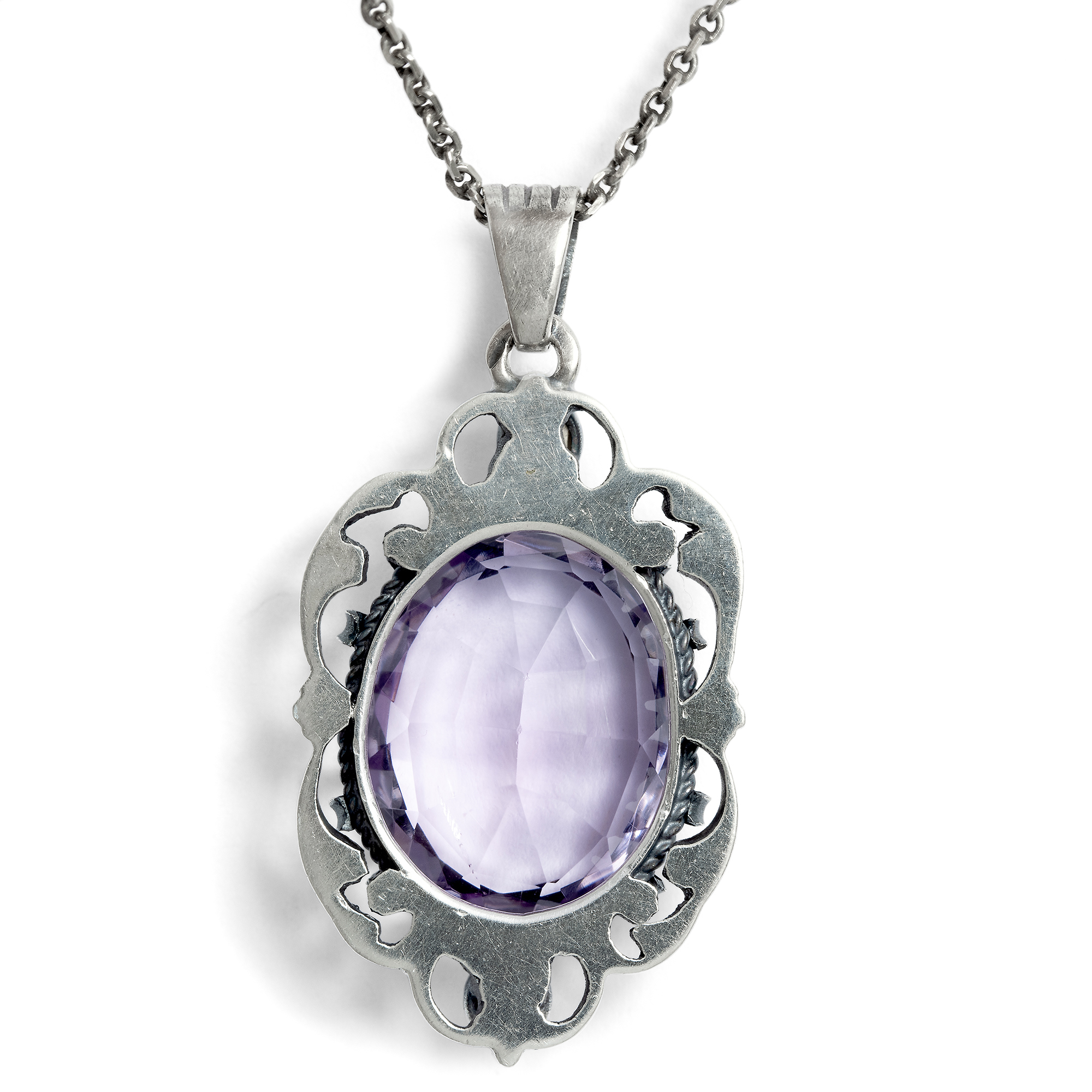 „Zum Wesen des Barock, das im 17. Jahrhundert seine Blütezeit hatte, gehört die schwellende Bewegung aller Formen, die kraftvoll und lebendig danach drängen, ineinander überzugehen. Dem Schmuck verleihen die Barockschnörkel eine besondere Plastik und lebendige Kraft.“ (Aus einem Katalog der Firma Blachian Antik-Schmuck der 1950er Jahre.) Der hier vorliegende, prachtvolle Anhänger, Mitte des 20. Jahrhunderts entstanden, zeigt große plastische Elemente, die das Prinzip der oben beschriebenen „schwellenden Formen“ wunderbar illustrieren. C-Schwünge aus Akanthusblättern rahmen einen großen Amethyst. Oben und unten begleiten den Edelstein zwei schimmernde Perlschalen. Der Amethyst stammt sehr wahrscheinlich aus Brasilien und zeigt eine blassviolette Farbe. Der Anhänger ist laut Stempelung in Wien entstanden und typischerweise alpiner Trachtenschmuck. Er ist sehr schön erhalten und kann an seiner originalen Kette sofort getragen werden.