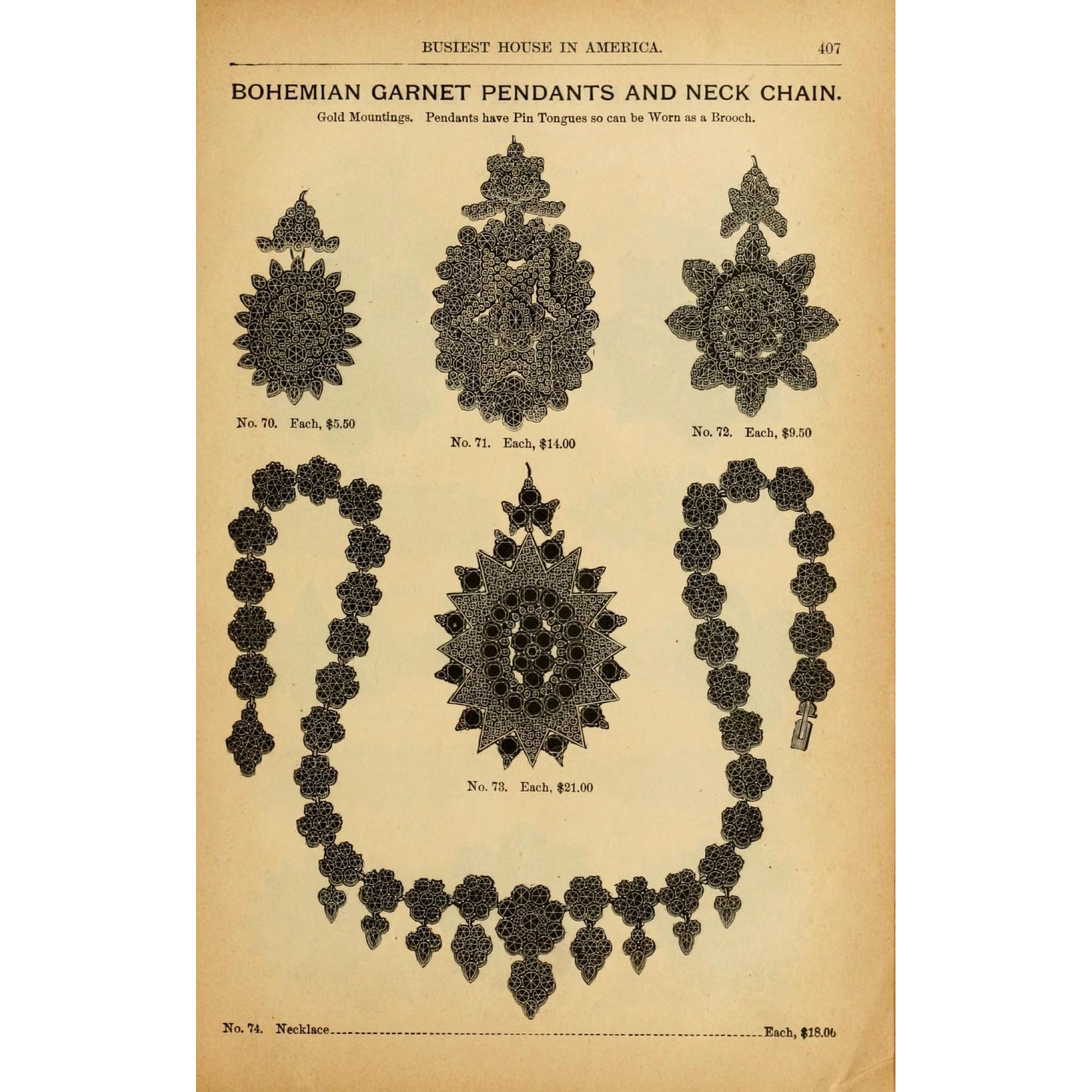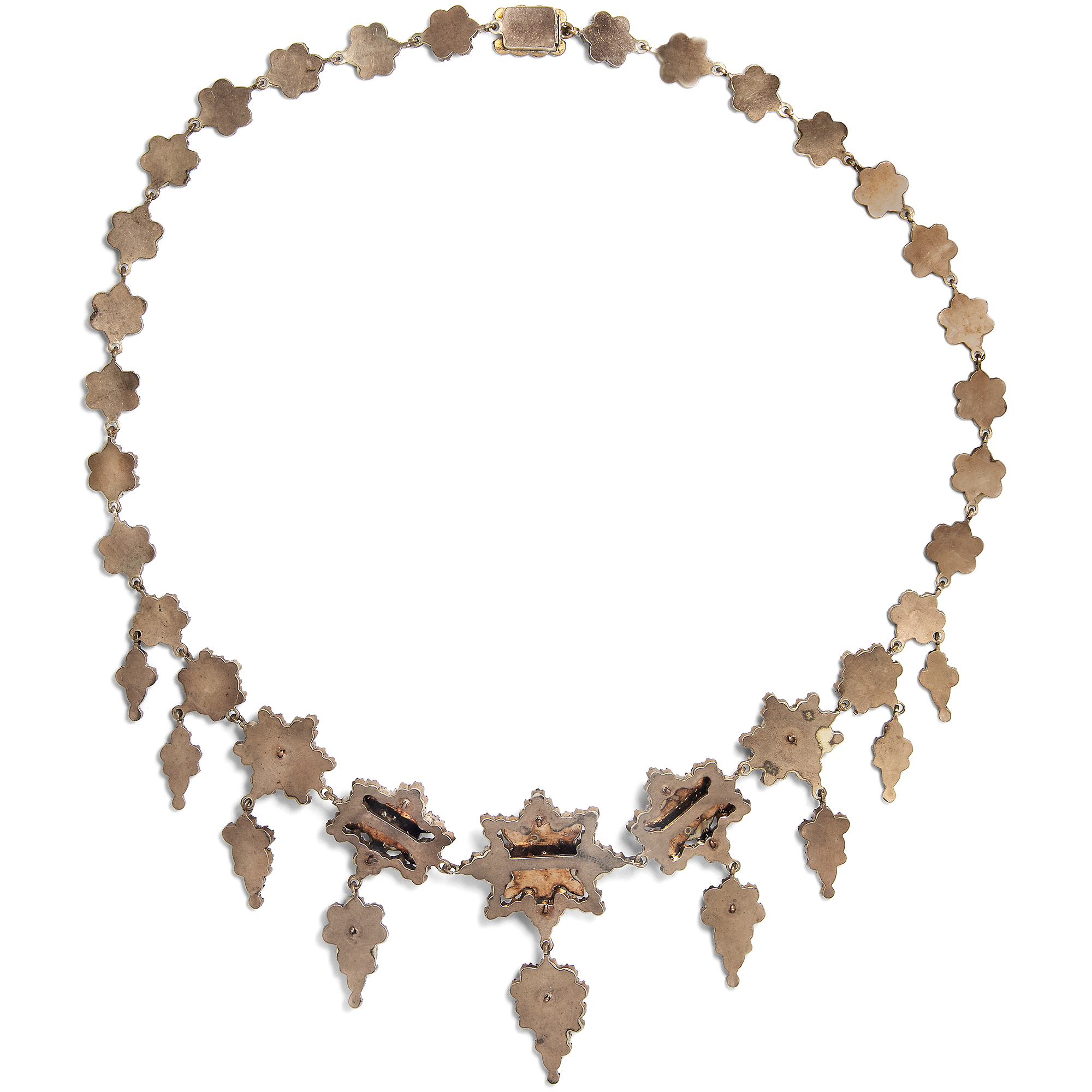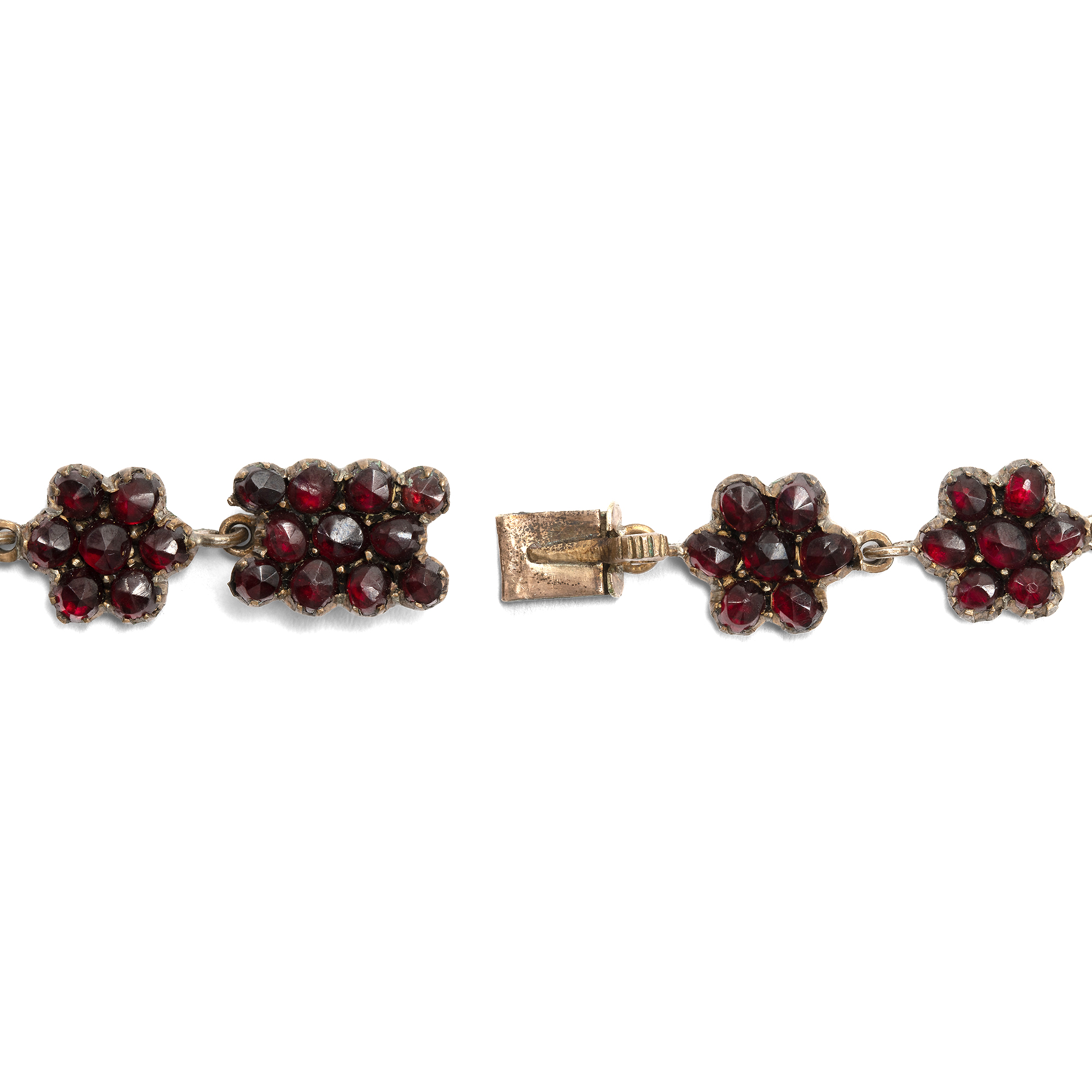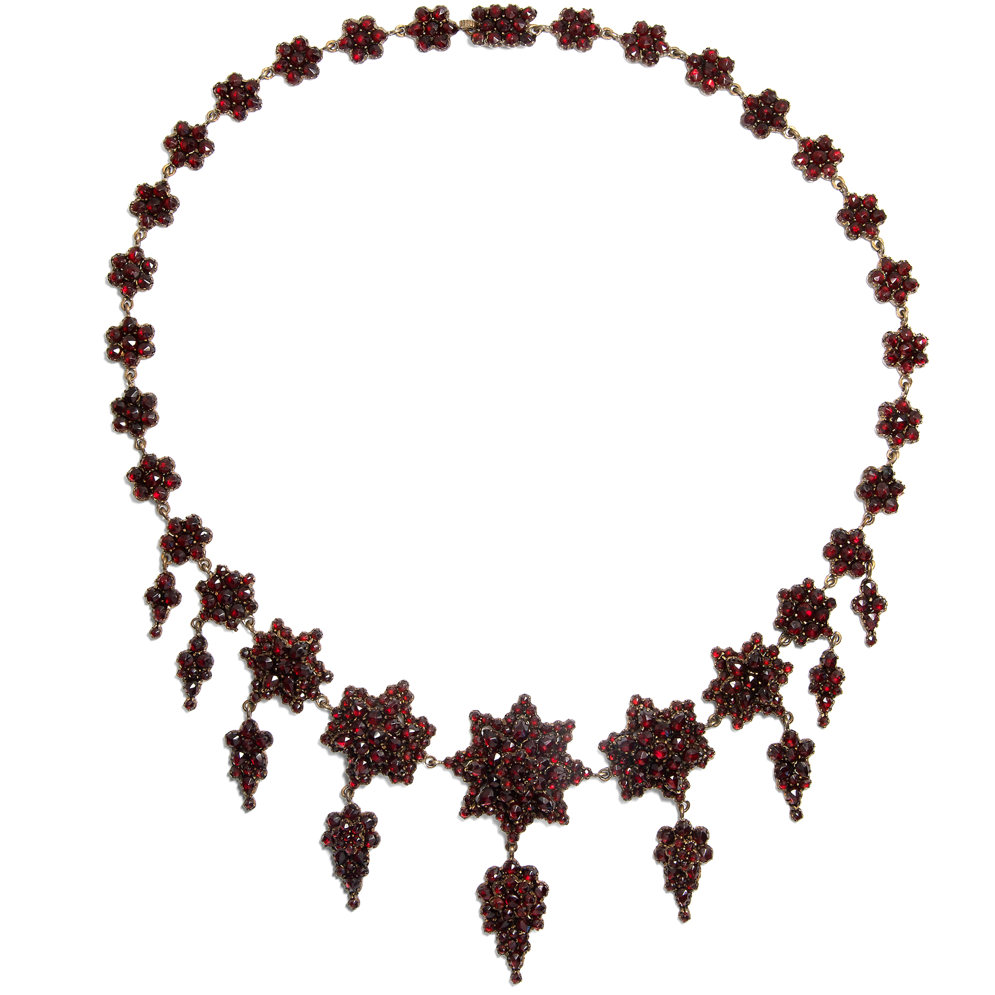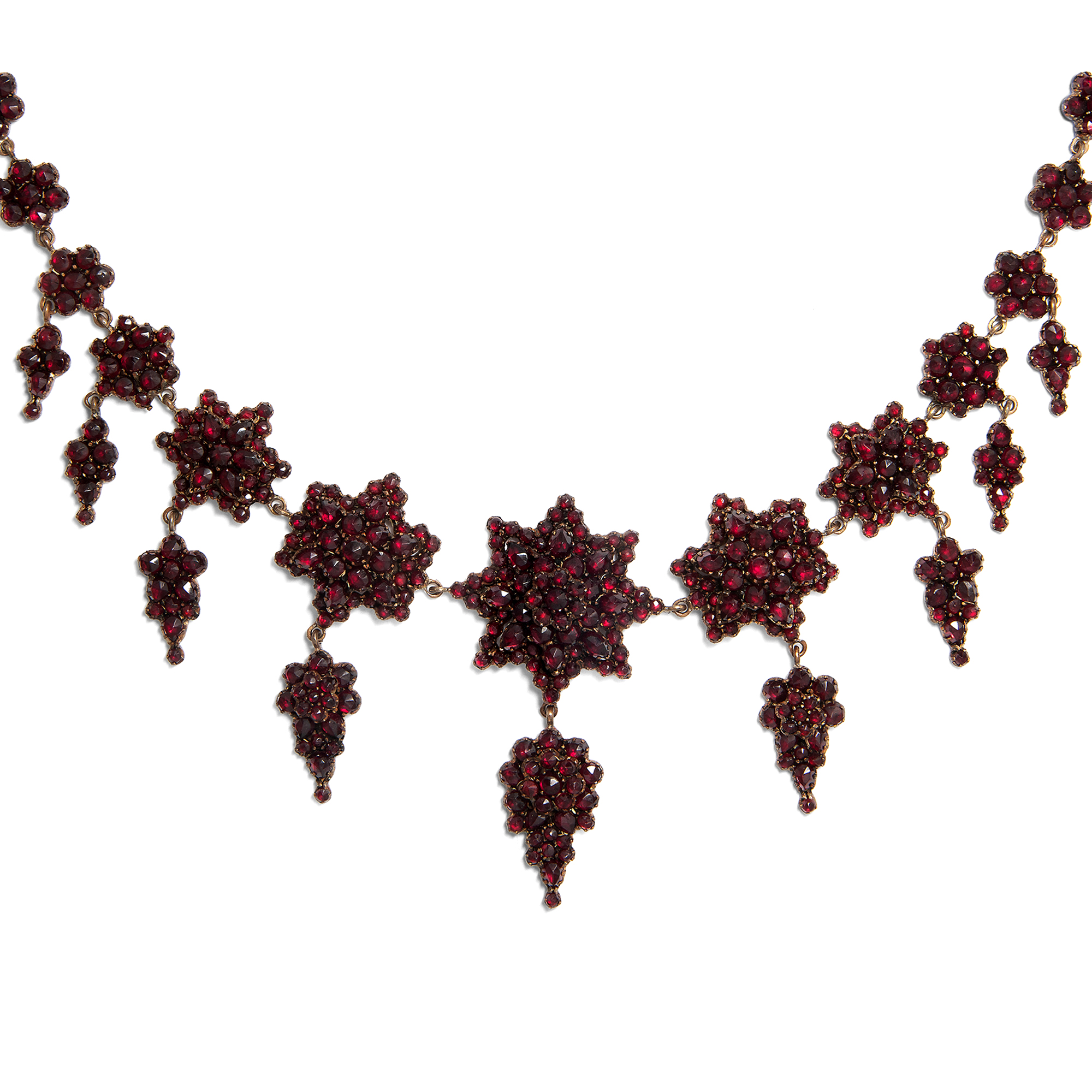 Das tiefrote Leuchten des Granats hat die Fantasie der Menschen seit Jahrtausenden beflügelt. Im Mittelalter waren Granate unter dem Begriff „Karfunkelsteine“ bekannt, da man glaubte, sie würden aus sich selbst heraus leuchten. Der Ursprung des Begriffs „Karfunkelstein“ ist lateinisch und bezieht sich auf diesen alten Glauben: carbunculus bedeutet so viel wie „rot glühende Kohle“. In dem vorliegenden Collier aus böhmischen Granaten wird dieses Leuchten zu einem zauberhaften Anblick. Die roten Granate, im Rosenschliff facettiert, sind dicht an dicht gereiht und bilden eine Girlande aus Sternen und Blüten. Die Fassungen aus vergoldetem Tombak treten dabei in den Hintergrund und lassen beinahe nur das tiefrote Glänzen in den Vordergrund treten. Selbst die Schließe ist mit diesen leuchtenden Steinen besetzt, sodass das Collier auch bei festlich hochgestecktem Haar seine Wirkung entfaltet. Der Typus des Fransencolliers sowie die in Pavée-Fassungen gesetzten Granate sind typisch für die Mode des letzten Drittels des 19. Jahrhunderts. Zur Datierung vgl. eine Seite aus dem Katalog für das Jahr 1889 von L. J. Flowers aus Salem, Massachusetts, dem Busiest House of America, vgl. hier.