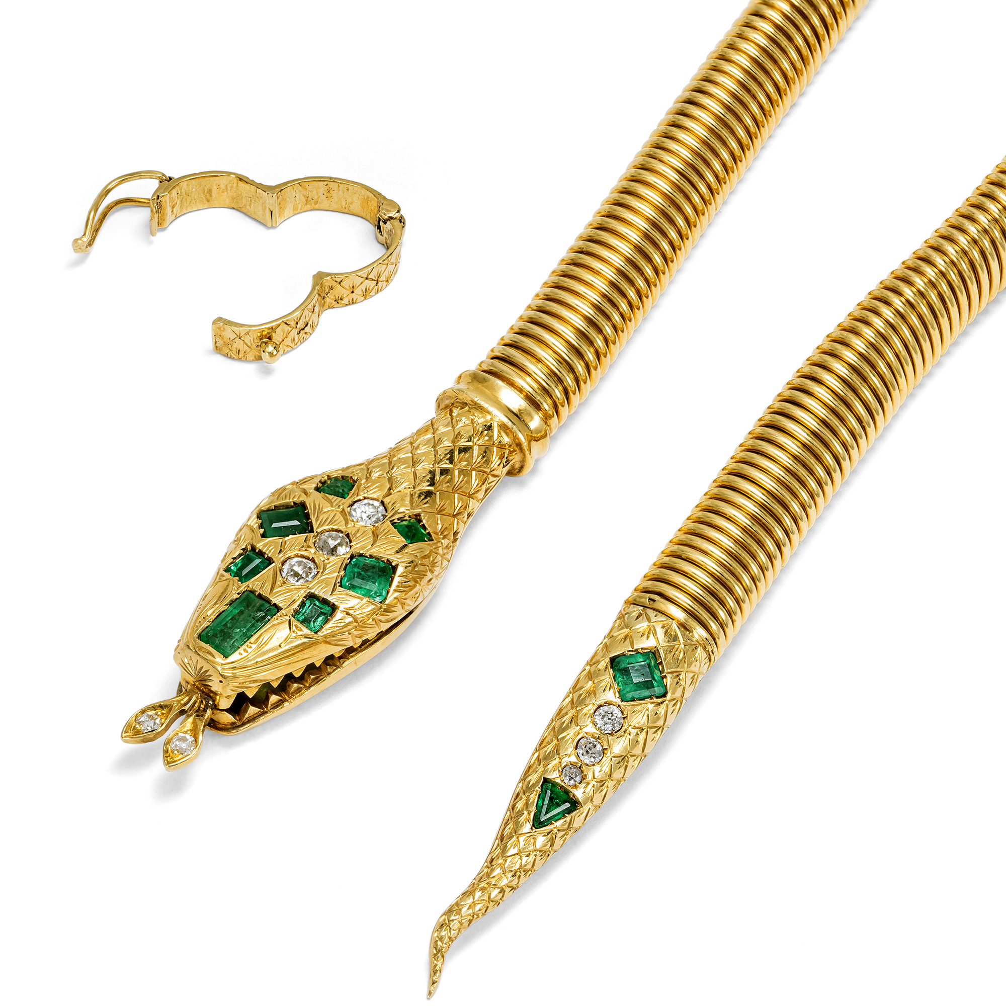 Schmuckstücke mit Schlangenmotiven erlebten im ganzen 19. Jahrhundert große Popularität, doch erst in der Epoche des Art Déco erreichte die Schlangenmode ihren Zenit, wie das vorliegende extravagante Exemplar eindrucksvoll unter Beweis stellt. In dieser bewegten und dekadenten Epoche war das exotische Motiv genau das Richtige, um auf den ausgelassenen Abendveranstaltungen für Furore zu sorgen. Das vorliegende Collier ist ein besonders prachtvoller Vertreter dieser Mode. Bei der Gestaltung des schmucken Reptils gehen Goldschmiede- und Ingenieurskunst eine gelungene Symbiose ein, was es zu einem besonders spannenden Stück Juwelengeschichte macht: Der Körper der Schlange besteht aus einer goldenen „Gasrohrkette“, die ihren Namen einer Erfindung verdankt. Erstmals war es um das Jahr 1900 gelungen, besonders haltbare und stabile Gasleitungen aus Metall zu bauen, die gleichzeitig flexibel und biegsam sein sollten. Diese Erfindung wurde in der Juwelierskunst begierig aufgegriffen, da sich das flexible und dekorative Rohr besonders gut eignete, um Colliers oder Armbänder daraus herzustellen. So war bald darauf die aus Gold oder Silber gearbeitete „Gasrohrkette“ entstanden und verbreitete sich über ganz Europa. Im englischen Sprachraum wird sie auch als „Gastube“ oder „Tubogas“ bezeichnet und war ein stilbildendes Element in der Epoche des Art Déco. Es handelt sich dabei stets um runde, leicht abgeflachte und flexible Röhren, die aus einem einzigen, ineinander gelegten Metallprofil konstruiert sind, das sich beweglich und doch fest um Hals oder Handgelenk legen konnte. Die Gasrohrkette, aus der unsere Schlange gebildet ist, besteht aus hochkarätigem Gelbgold. Kopf und Schwanzspitze der Schlange bilden ihre Endpunkte. Neun grüne Smaragde und acht Altschliffdiamanten bringen diese Bereiche zum Funkeln. Besonders schön ist, dass die Gasrohrkette flexibel ist und mithilfe eines gravierten Schiebers in unterschiedliche Positionen gebracht werden kann. Die Stempelung des Colliers belegt seine Entstehung in Wien. Doch die Stempelung verrät noch weitere interessante Details: Die Schlange wurde in der Goldschmiede von Anna Escher gefertigt, die nach dem Tod ihres Mannes Leopold im Jahr 1919 das Geschäft eigenständig weiterführte. Schon 1922 übergab sie die Leitung an ihren Sohn Franz. Ihre Herstellermarke, zusammen mit der Wiener Elefantenkopfpunze, die im selben Jahr eingeführt wurde, datiert die Schlange somit zweifelsfrei auf das Jahr 1922. Die Schlange hat die letzten einhundert Jahre in der österreichischen Hauptstadt verbracht. Sie ist perfekt erhalten und verleiht ihrer Trägerin eine geheimnisvolle Aura – ein rundum verführerisches Schmuckstück!