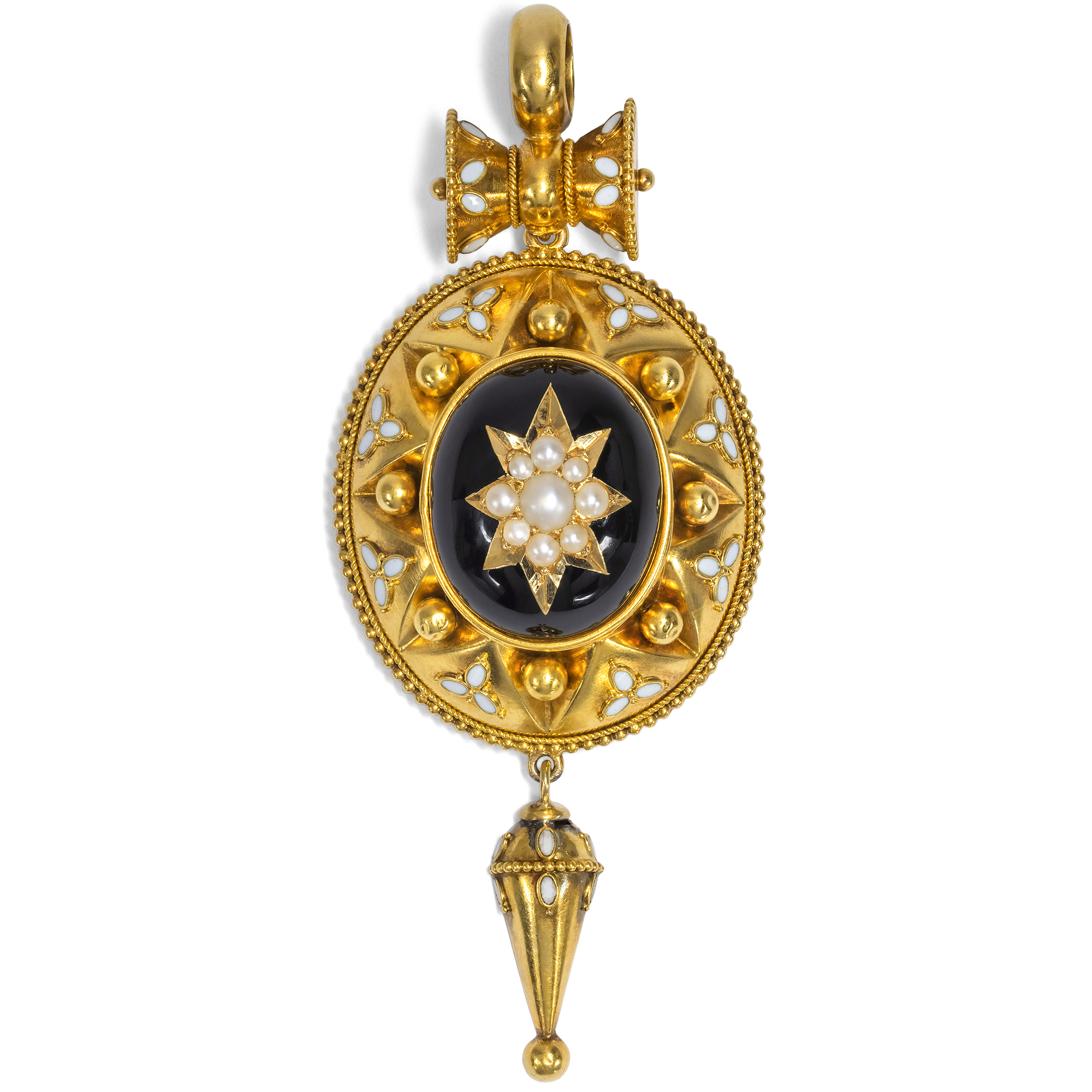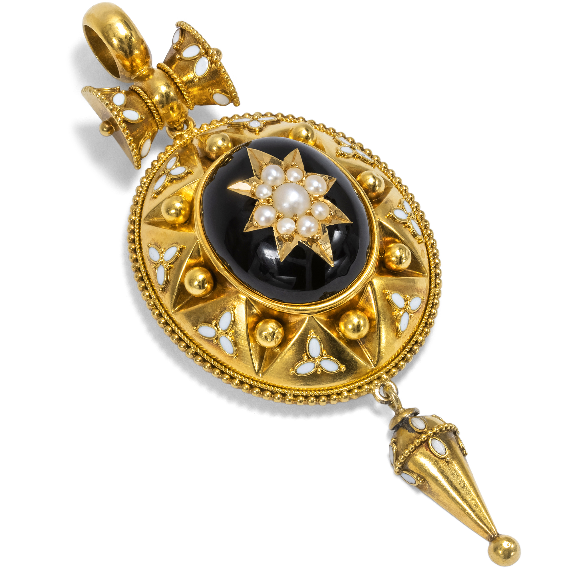 „E. W. Streeter, of 37, Conduit Street, are introducing a novelty in jewellery, namely, pure gold ornaments of the best style of manufacture, and of the most recherché and artistic taste“ – „E. W. Streeter, Conduit Street 37, bringen eine Neuheit in das Feld des Schmucks: Goldschmuck von höchster Qualität und im ausgesuchtesten und künstlerischsten Geschmack.“ The Court Journal, 22.12.1866 Die Firma E. W. Streeter, vormals Hancock & Co, war im späten 19. Jahrhundert eine der führenden Adressen für hochwertigen Goldschmuck in London und Hoflieferant zahlreicher regierender Häuser. Ihr Geheimnis war „machine-made jewellery“ zu produzieren, und damit kostengünstiger herstellen zu können als die Konkurrenz. Wobei dies nicht bedeutet, dass die Schmuckstücke Streeters in einem heutigen Sinne automatisiert hergestellt worden wären. Sie verwendeten lediglich Stanzen und Pressen auch für hochwertigen Goldschmuck, so, wie es in Pforzheim in Deutschland ebenso Usus war. Zusammengesetzt und vollendet wurden auch die Schmuckstücke von Streeter weiter von Hand. Wie detailreich und perfekt noch im Detail die Erzeugnisse Streeters waren, zeigt der hier vorliegende Anhänger mit Medaillonfach im Archäologischen Stil. Der Entwurf, ein großes Oval, ist ungemein plastisch ausgeführt, gewölbt und mit zahlreichen Faltungen, die von Hand herzustellen ungeheuer aufwendig gewesen wären. Perfekt ausgeführte Auflagen aus Email strukturieren die Oberflächen. Ein Stern aus natürlichen Perlen schmückt das Zentrum. Nicht zuletzt der Blick in die erhaltenen Kataloge Streeters erlaubt es, den Anhänger in die Jahre um 1870 herum zu datieren. Schmuck in den, freilich großzügig modernisierten, Formen der klassischen Antike war eine große Mode, parallel zu anderen historischen Stilen. Diesen sog. Archäologischen Stil zeichneten besonders gedrehte Kordeln, angehängte Pendel und glänzende Goldkugeln aus, die auf die ovalen, gewölbten Formen appliziert worden. Wir bilden eine Seite aus dem Katalog für das Jahr 1870 ab, die ähnliche Entwürfe zeigt. Wir haben den Anhänger in London entdeckt. Er ist perfekt erhalten und ein wunderbares Stück Schmuckgeschichte. Zu den Anhängern und Broschen der Jahre um 1870 vgl. u.A. David Bennet und Daniela Mascetti: Understanding Jewellery, Woodbridge 2010, S. 168f.