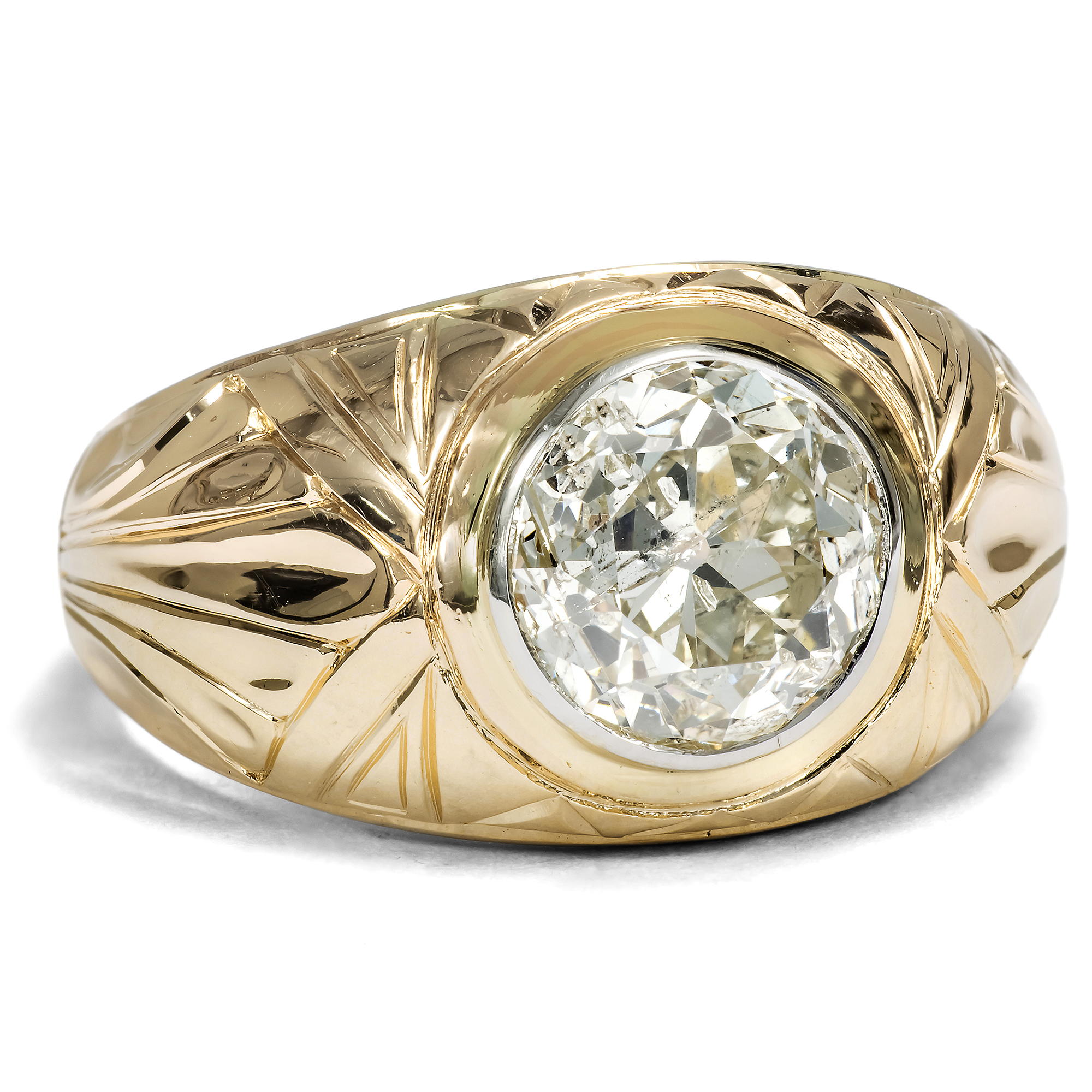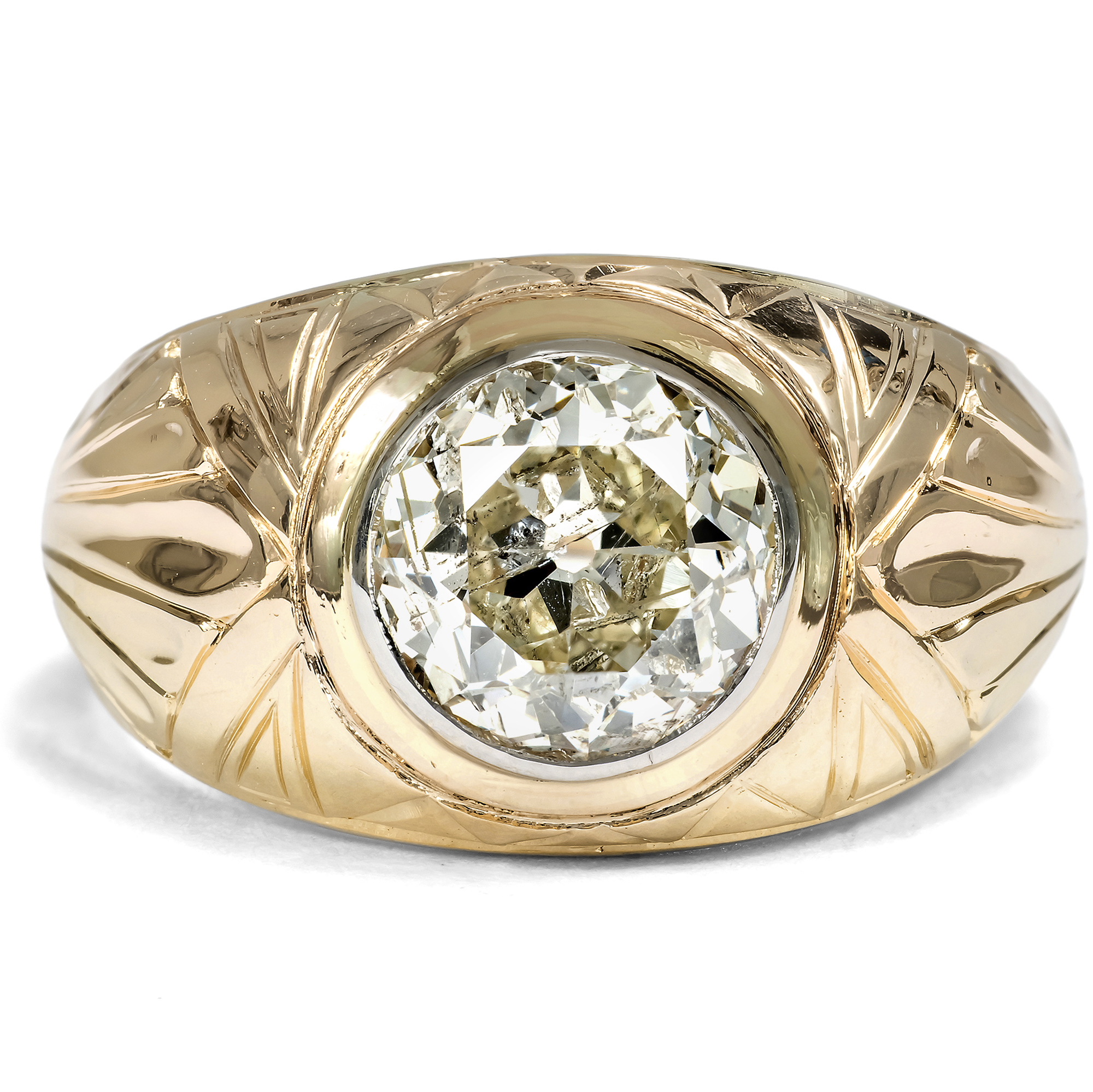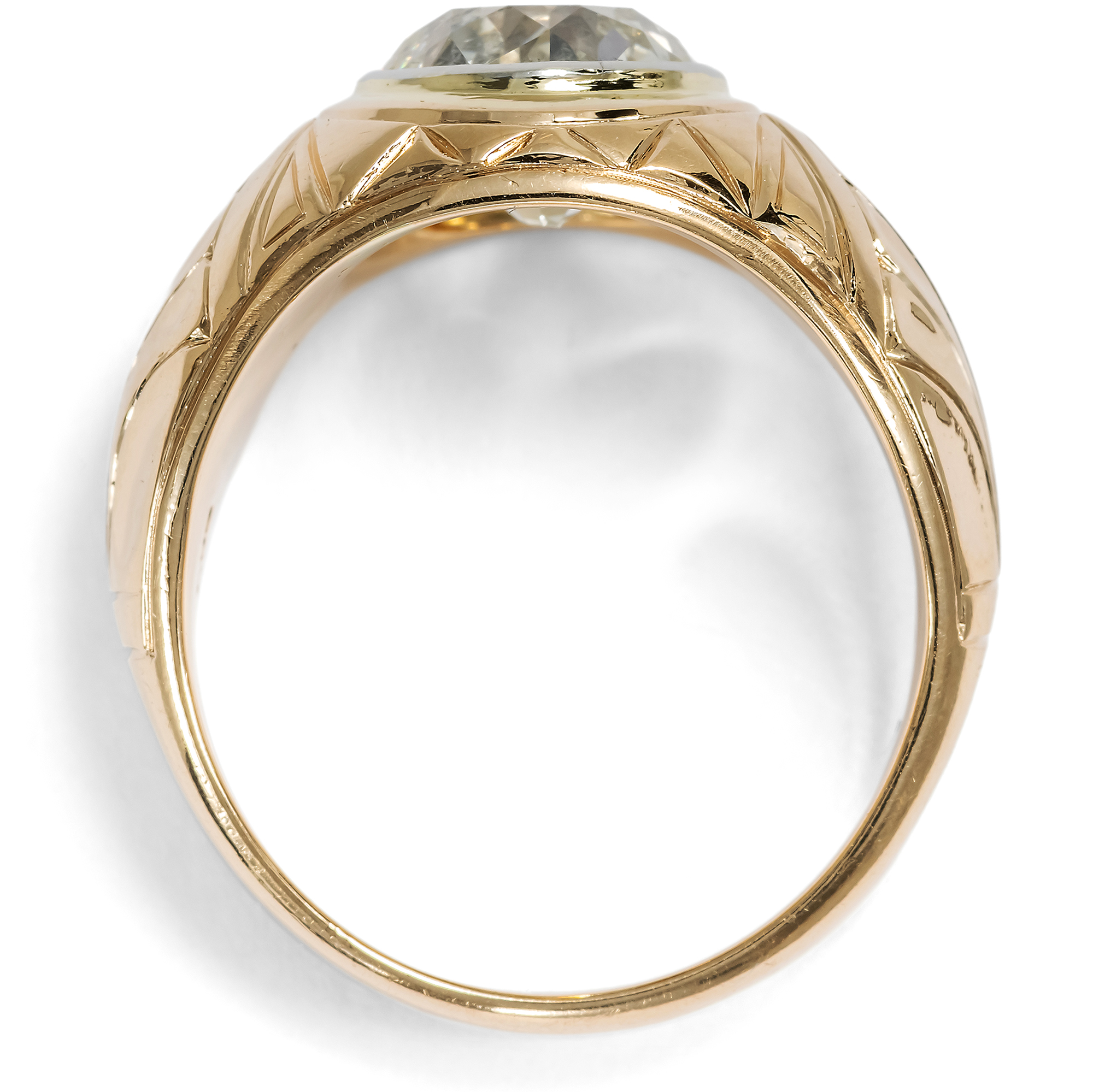 Eindrucksvoll, massiv und zugleich effektvoll, so zeigt sich der vorliegende Ring aus den Jahren der vorletzten Jahrhundertwende. Der plastisch gravierte Ring ist aus warmem Roségold gefertigt und präsentiert einen großen Diamanten im Altschliff als Solitär. Der Stein hat ein Gewicht von 2,11 Karat und funkelt hellgelb getönt. Ein schmales, umlaufendes Band aus hellem Platin fasst den Diamanten ein und setzt ihn wirkungsvoll vom warmen Ton des Goldes ab. Der Diamant ist im sogenannten „Old European Cut“ geschliffen, der gängigen Schliffform für Brillanten der Zeit um 1900. Dieser Schliff, der sich aus dem älteren „Old Mine Cut“ entwickelte und dem modernen Brillantschliff vorausgeht, zeichnet sich durch eine kleine Tafel, eine hohe Krone und eine deutlich ausgeprägte Kalette aus; dabei sind Diamanten dieser Schliffform annähernd rund geschliffen. Die größeren Facetten erzeugen ein tiefes, ruhiges Reflektieren mit weicheren Lichtreflexen, als wir sie von modernen Brillanten kennen. Gerade diese charakteristische Lichtwirkung macht antike Diamanten so begehrenswert. Der Stein zeigt ein reiches Einschlussbild aus stabförmigen Einlagerungen, die seine Entstehung im Inneren der Erde vor Hunderten von Millionen Jahren bezeugen. Der Ring ist in Deutschland als Herrenring entstanden, kann aber sowohl von Männern als auch von Frauen getragen werden. Die massive Ausführung gibt ihm dabei nicht nur Präsenz, sondern auch große Alltagstauglichkeit. Der große Diamant ist sicher in das Metall eingerieben, sodass keine Krappen hervorstehen oder stören. So entsteht ein ebenso kraftvolles wie elegantes Schmuckstück.