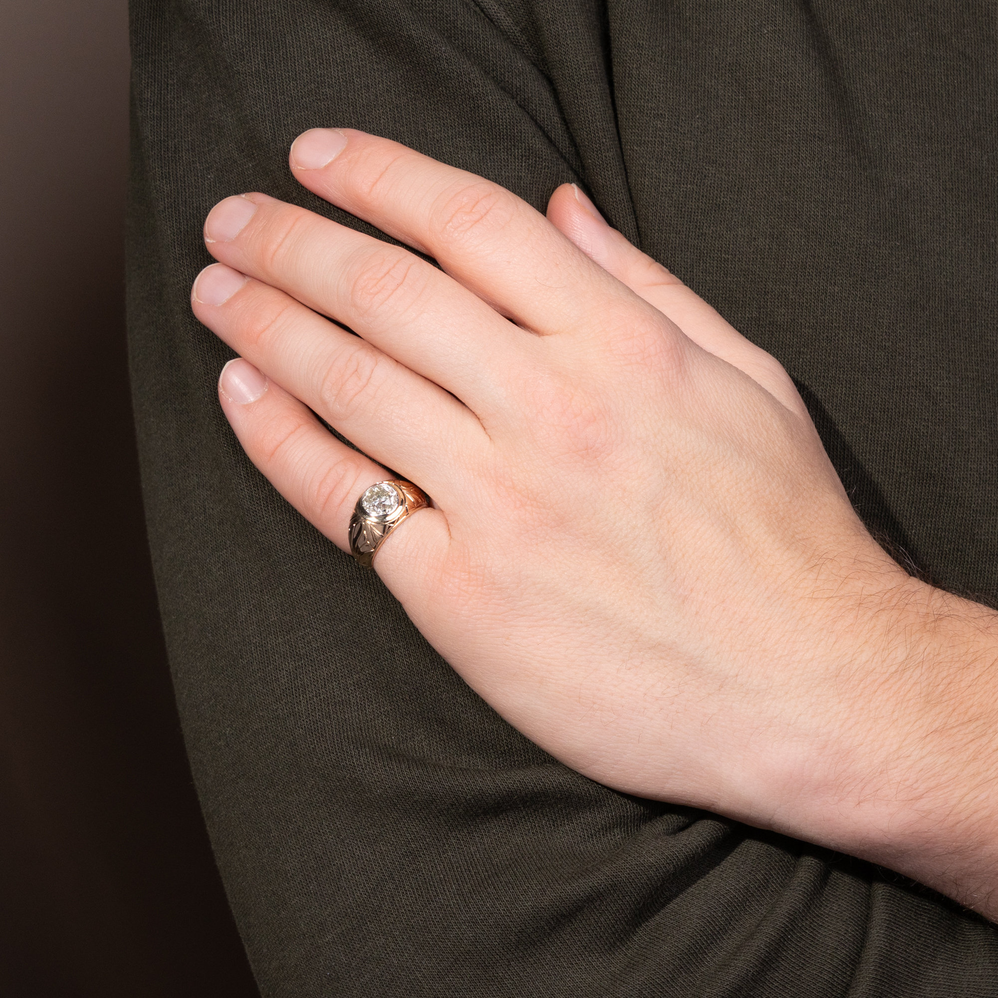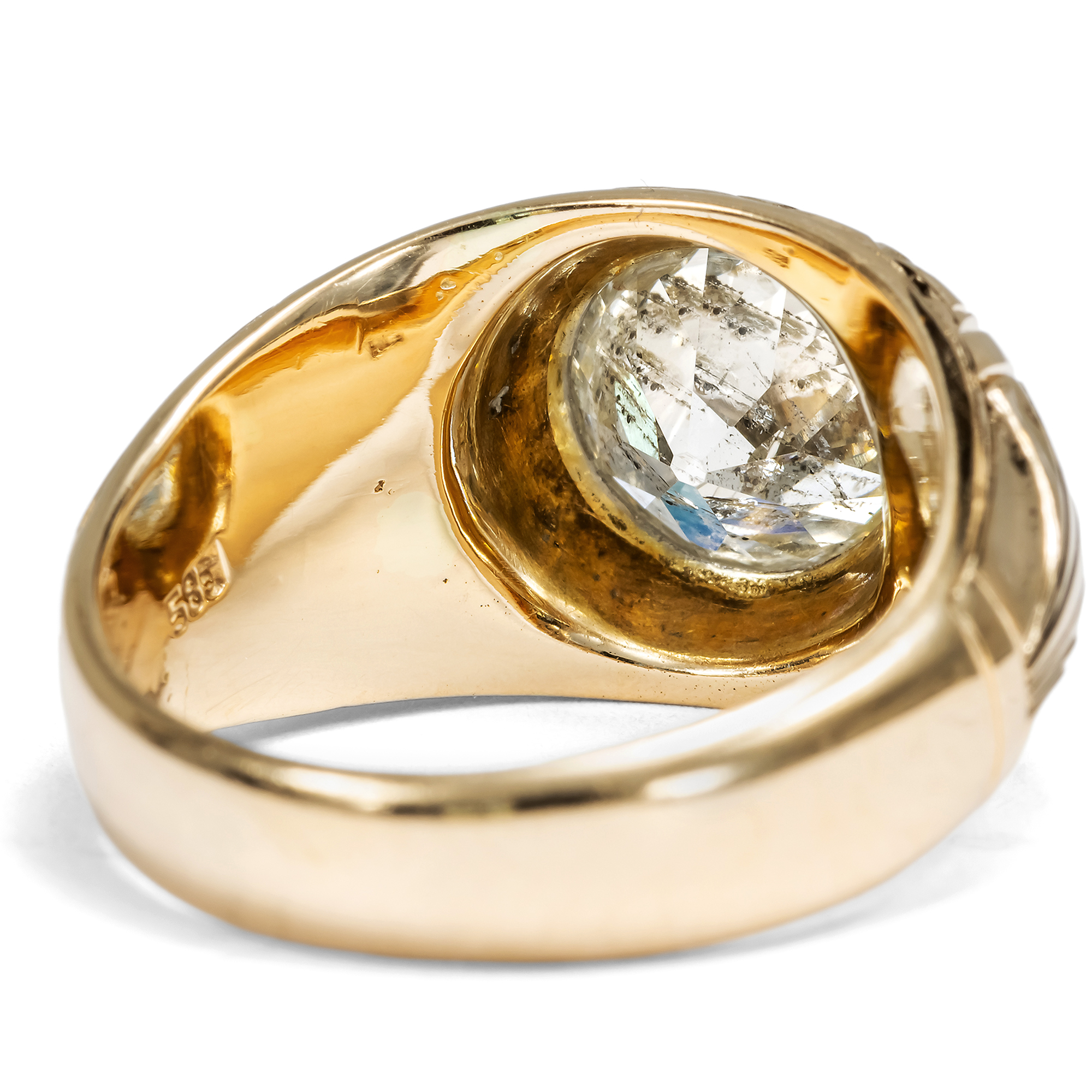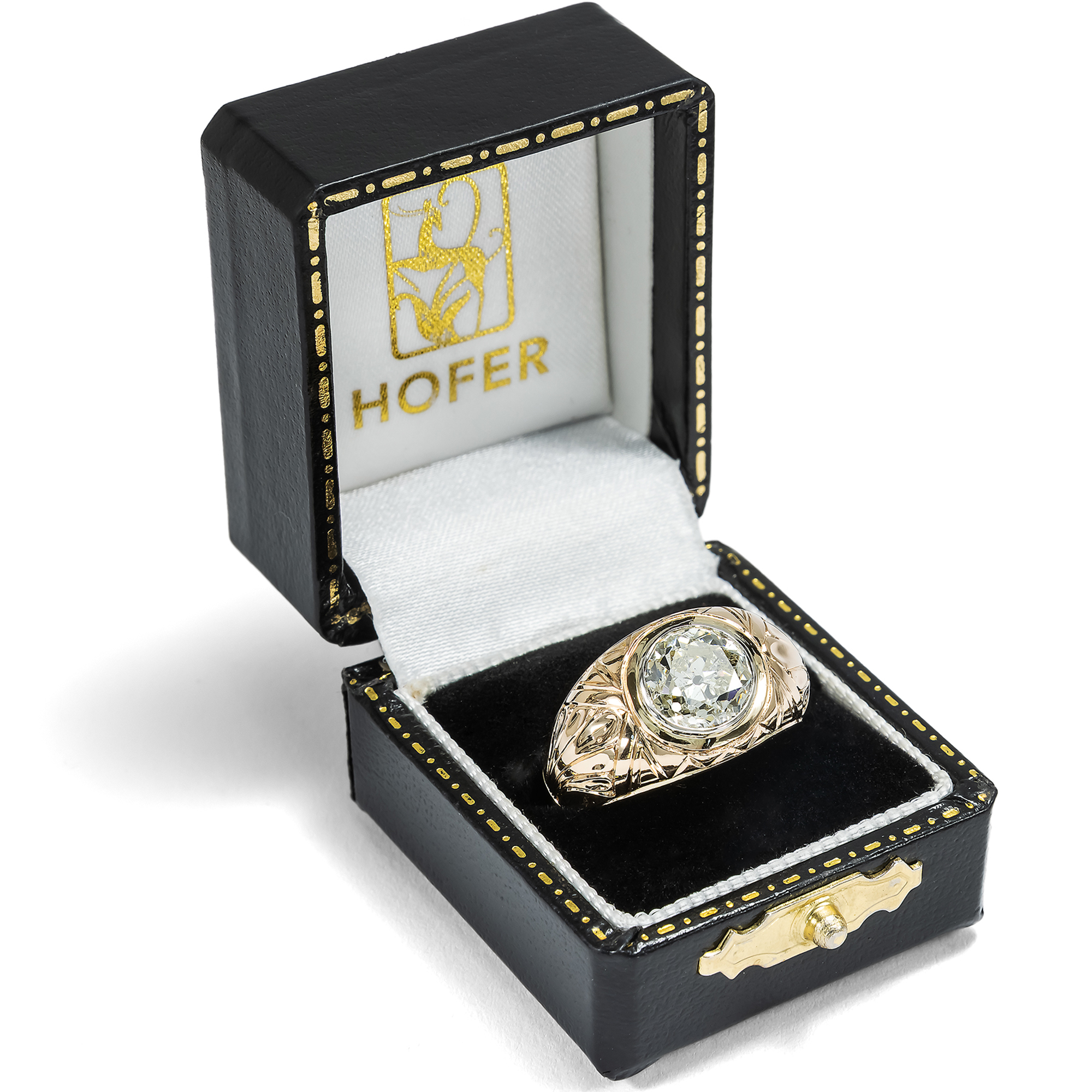 Eindrucksvoll, massiv und zugleich effektvoll, so zeigt sich der vorliegende Ring aus den Jahren der vorletzten Jahrhundertwende. Der plastisch gravierte Ring ist aus warmem Roségold gefertigt und präsentiert einen großen Diamanten im Altschliff als Solitär. Der Stein hat ein Gewicht von 2,11 Karat und funkelt hellgelb getönt. Ein schmales, umlaufendes Band aus hellem Platin fasst den Diamanten ein und setzt ihn wirkungsvoll vom warmen Ton des Goldes ab. Der Diamant ist im sogenannten „Old European Cut“ geschliffen, der gängigen Schliffform für Brillanten der Zeit um 1900. Dieser Schliff, der sich aus dem älteren „Old Mine Cut“ entwickelte und dem modernen Brillantschliff vorausgeht, zeichnet sich durch eine kleine Tafel, eine hohe Krone und eine deutlich ausgeprägte Kalette aus; dabei sind Diamanten dieser Schliffform annähernd rund geschliffen. Die größeren Facetten erzeugen ein tiefes, ruhiges Reflektieren mit weicheren Lichtreflexen, als wir sie von modernen Brillanten kennen. Gerade diese charakteristische Lichtwirkung macht antike Diamanten so begehrenswert. Der Stein zeigt ein reiches Einschlussbild aus stabförmigen Einlagerungen, die seine Entstehung im Inneren der Erde vor Hunderten von Millionen Jahren bezeugen. Der Ring ist in Deutschland als Herrenring entstanden, kann aber sowohl von Männern als auch von Frauen getragen werden. Die massive Ausführung gibt ihm dabei nicht nur Präsenz, sondern auch große Alltagstauglichkeit. Der große Diamant ist sicher in das Metall eingerieben, sodass keine Krappen hervorstehen oder stören. So entsteht ein ebenso kraftvolles wie elegantes Schmuckstück.