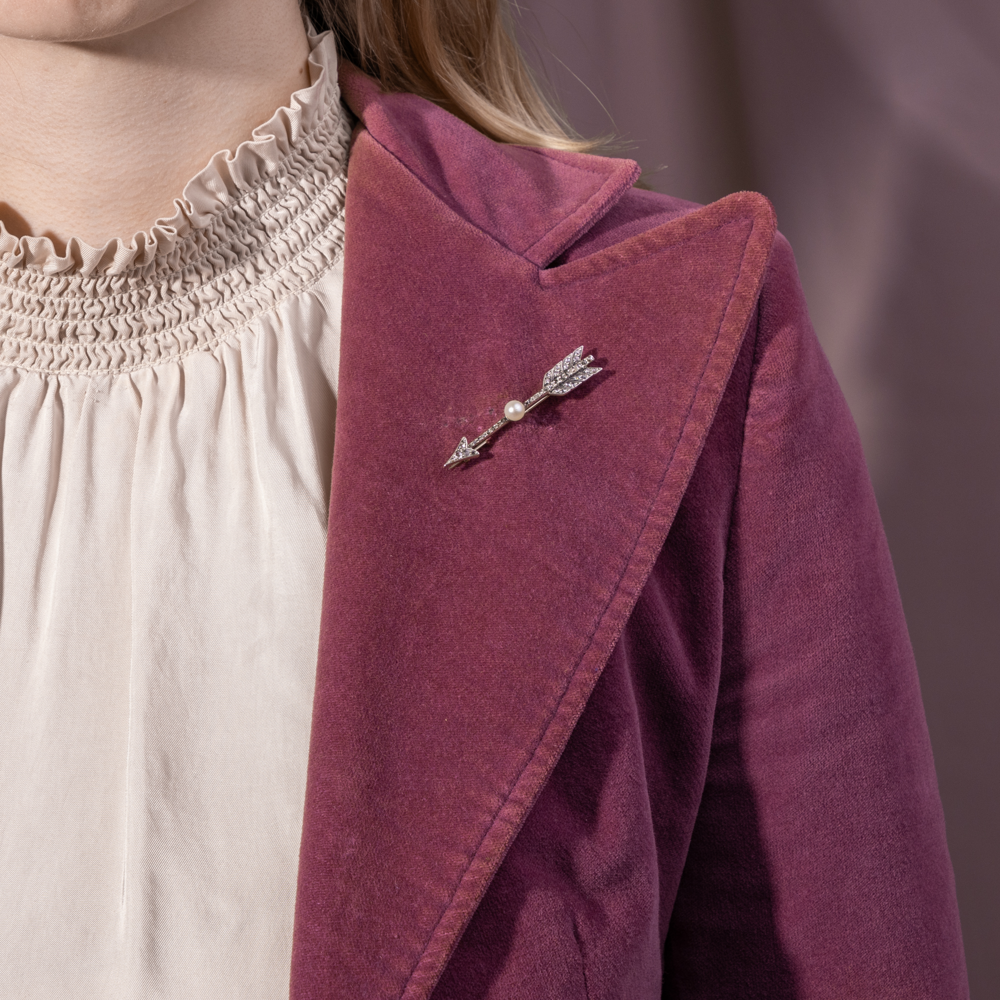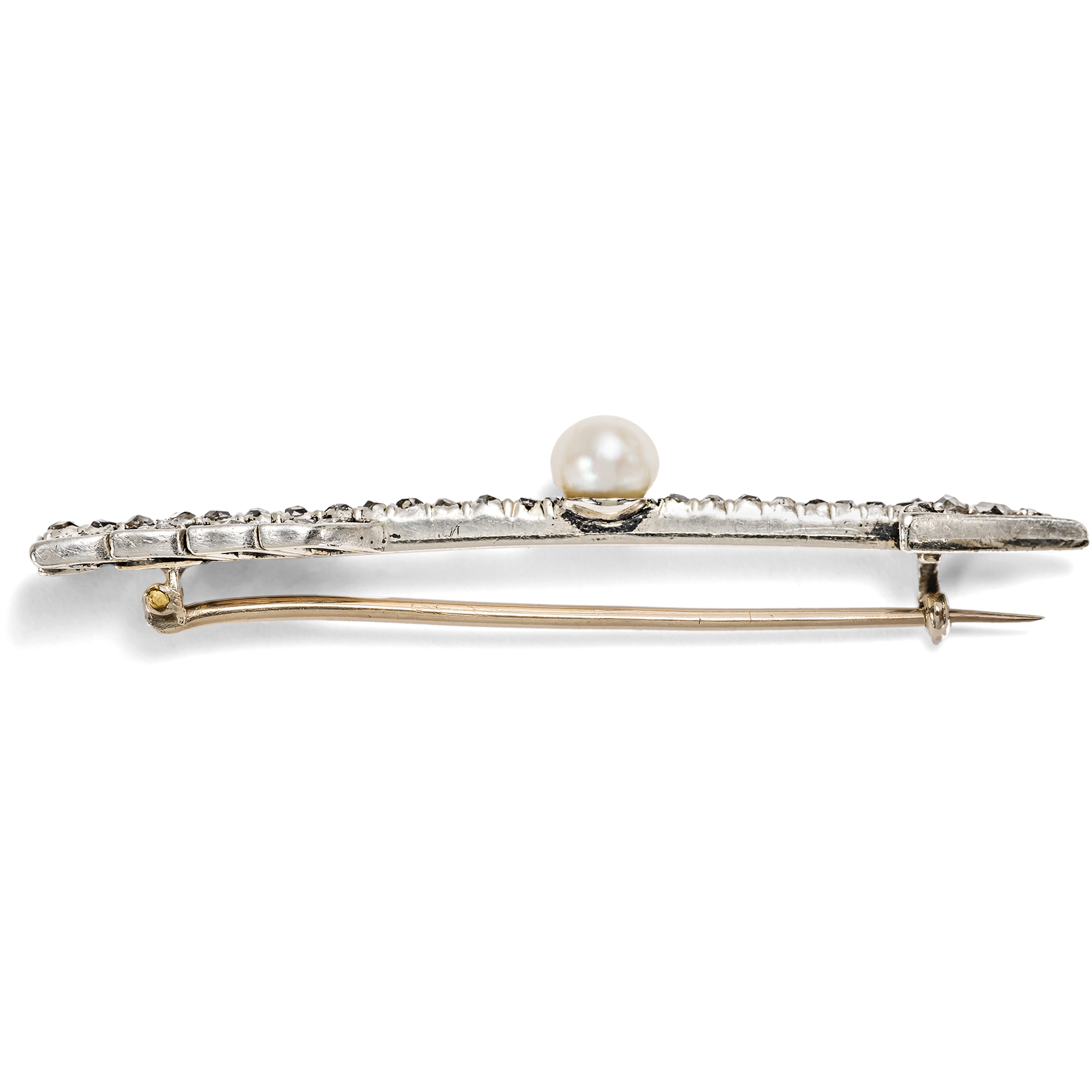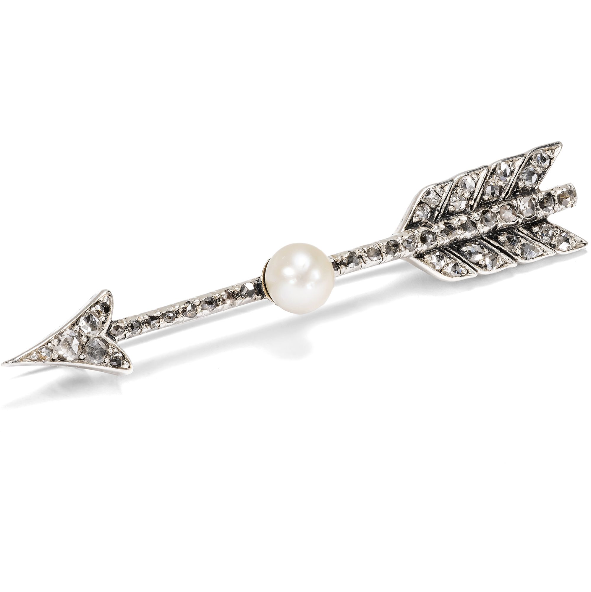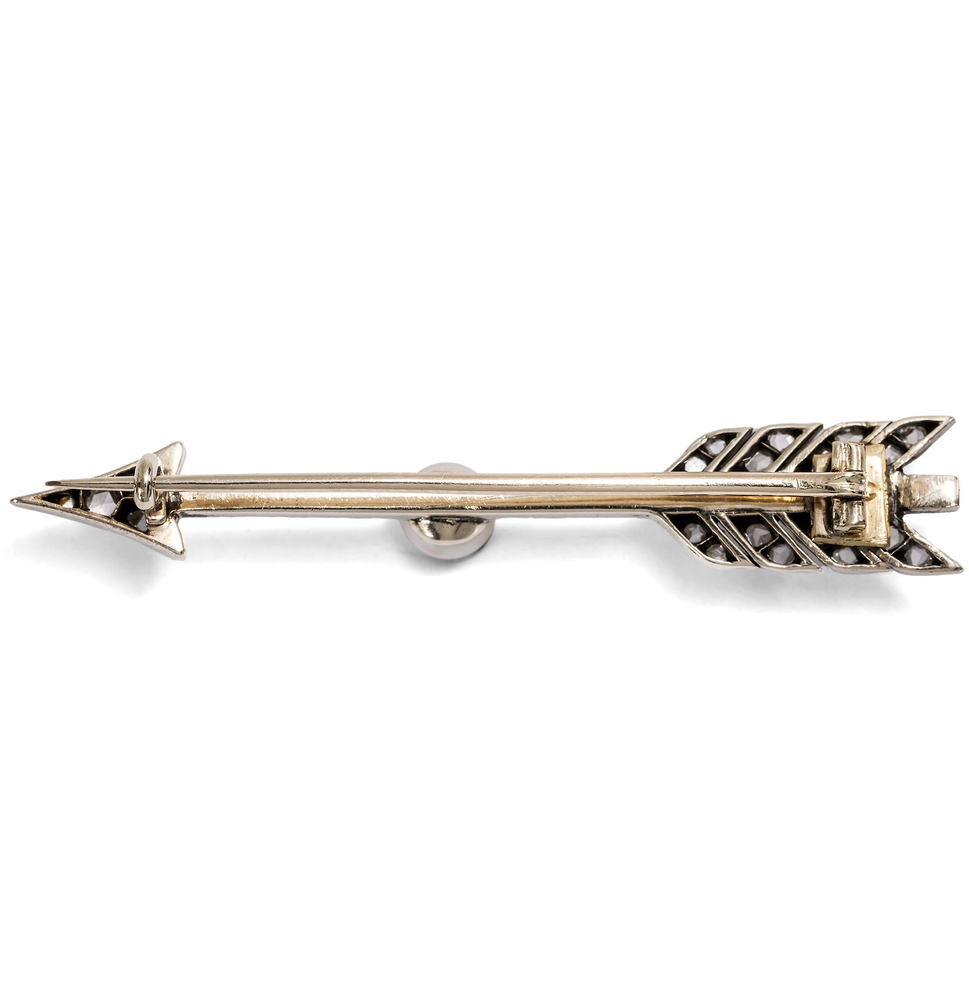 Blättert man durch das Angebot von Schmuckhändlern der spätviktorianischen Zeit, so fällt vor allem eines auf: Das Sortiment war geprägt von romantischen Motiven. Der Pfeil etwa ist eines jener Symbole, das immer wieder aufgegriffen und variiert wurde. Allein im Katalog der Londoner Goldsmiths and Silversmiths Company für das Jahr 1899 taucht das Pfeilmotiv zahlreichen Stellen auf, vgl. hier. Die Bedeutung des Motivs liegt auf der Hand, handelt es sich doch um den berühmten Pfeil des Amor, der ins Herz trifft und die Liebe entfacht. Doch wie lange mag diese Liebe währen? Ist sie ein kurzer, süßer Schmerz oder ein Glück, das ein Leben lang hält? Diese Brosche gibt eine Antwort. Denn der Pfeil trägt in seiner Mitte eine schöne natürliche Perle, Symbol der Liebesgöttin Venus und wie jene einer Muschel entsprungen. 43 Diamanten im Rosenschliff mit einem Gesamtgewicht von etwa 0,18 ct besetzen jede Stelle der Pfeils. Diamanten – die härtesten Minerale der Erde – stehen in der Sprache der Edelsteine für die Ewigkeit. Im Zusammenhang mit Amors Pfeil senden sie eine unmissverständliche Botschaft: diese Liebe wird für immer sein! Gefertigt wurde die elegante Brosche aus Gold, das durch eine Auflage aus Silber dem Besatz eine helle, weiße Umgebung schafft. Bemerkenswert ist auch die exzellente Erhaltung im originalen Etui des Juweliers W. Wright aus der englischen Küstenstadt Bournemouth. Ein Schmuckstück voller Symbolik – und ein perfektes Geschenk für jene, die seine wahre Bedeutung zu schätzen wissen.