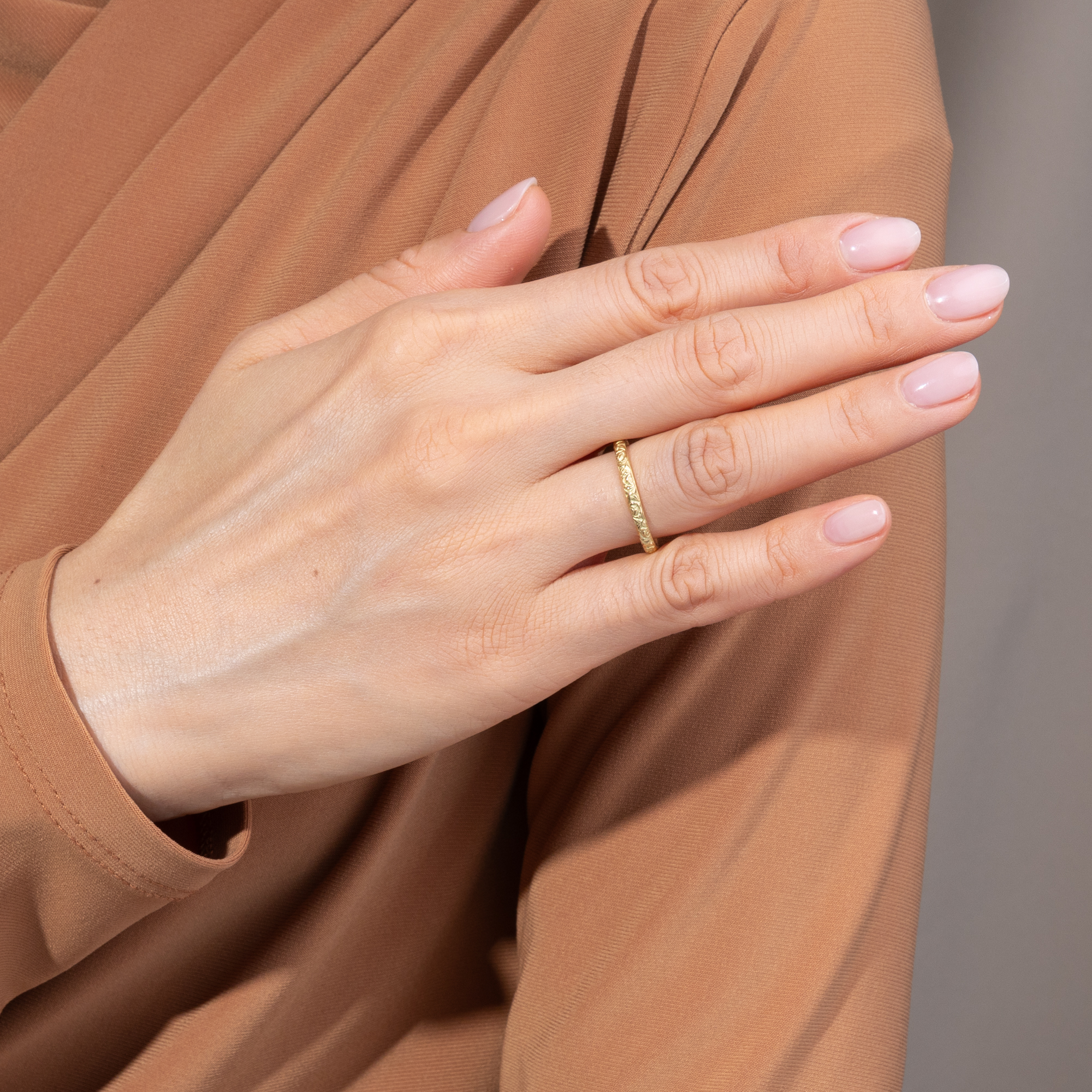 Eine Rose ist eine Rose ist eine Rose... Als Gertrude Stein 1913 in ihrem berühmten Gedicht „Sacred Emily“ das Bild der Rose lyrisch beschwor, schaute sie auf eine lange Tradition der Naturwiedergabe in den Künsten zurück, in der besonders die Rose so reich mit Bedeutung beladen ist. Im 19. Jahrhundert waren pflanzliche Motive aus Blättern und Blüten bereits die bevorzugten Themen der Kunst. In ihnen sah man die Kräfte der Natur versinnbildlicht, das ewige Wachsen und Vergehen. Und die Rose nahm darin einen Sonderplatz ein, ist sie doch seit jeher Sinnbild der Liebe. Der hier vorliegende Ring aus unserer Werkstatt zeigt ein umlaufendes Relief aus Rosenblüten und Rosenblättern. Sein Entwurf ist von Trauringen der Jahrhundertwende inspiriert. Er ist aus festlich schimmerndem Gelbgold gefertigt und 2,4 Millimeter breit. Sein Goldgehalt von 900/000 entspricht der Legierung historischen Münzgoldes. Dies ist unserer Meinung nach der perfekte Goldgehalt auch für einen Ring, da er einerseits ausreichende Robustheit für das tägliche Tragen mit der schönsten Goldfarbe andererseits verbindet. Der Ring hat abgerundete Kanten und ist innen bombiert, was seinen Tragekomfort erhöht. Der Ring ist in unterschiedlichen Ausführungen erhältlich. Sie finden alle Varianten unter diesem Link.