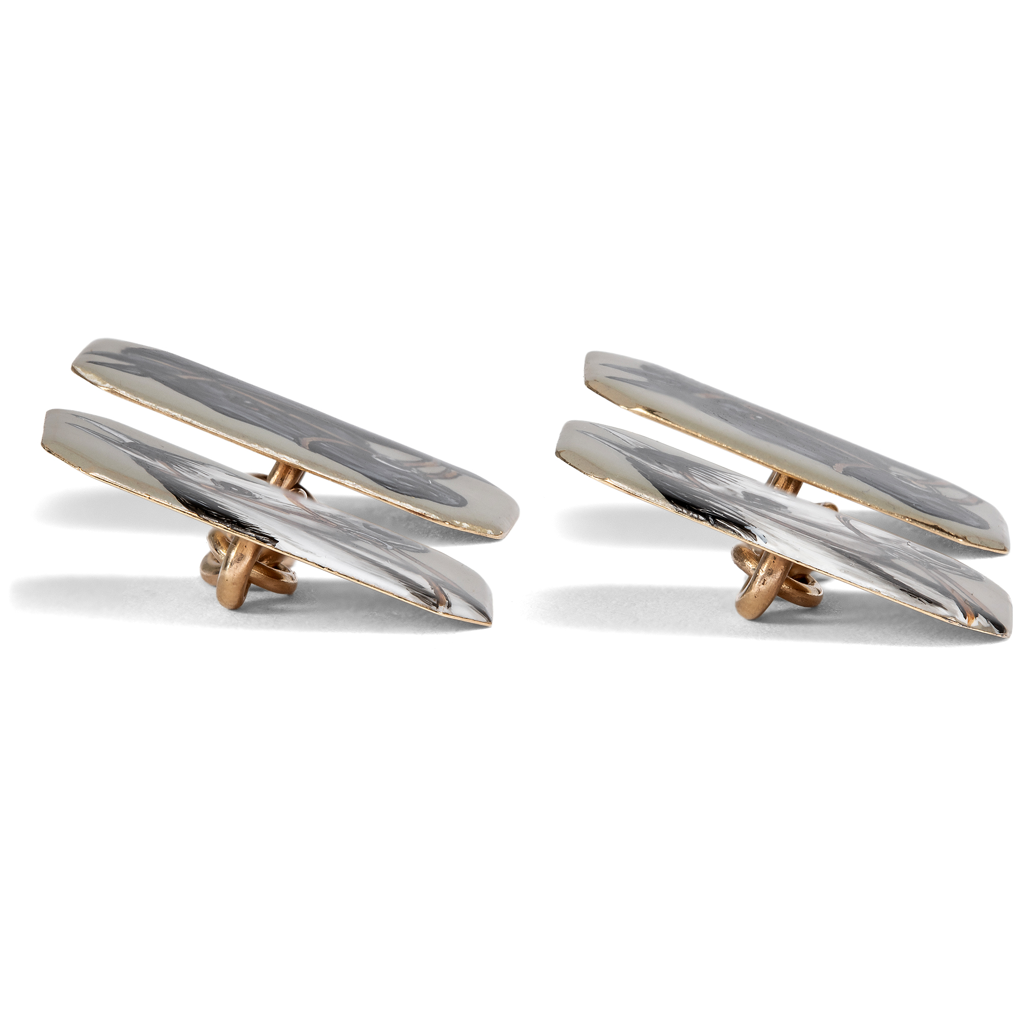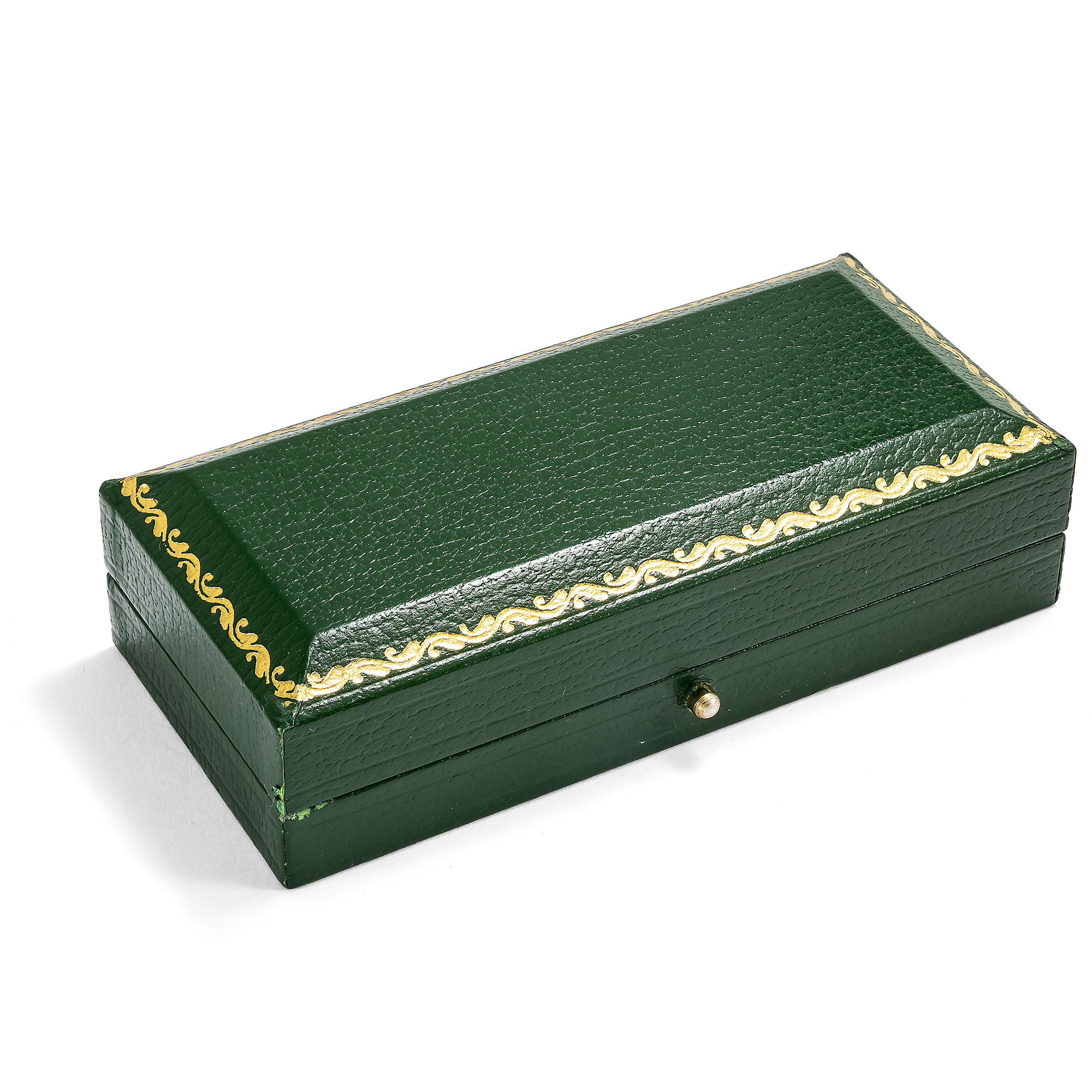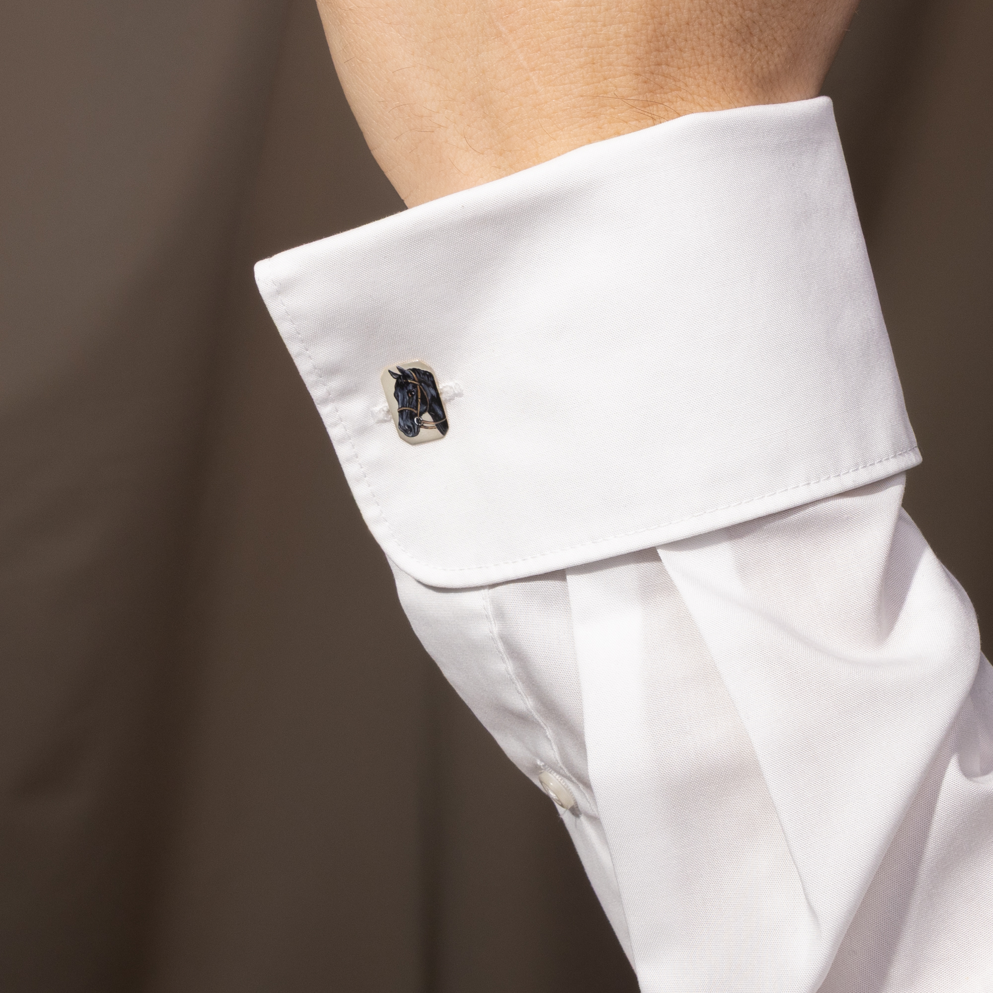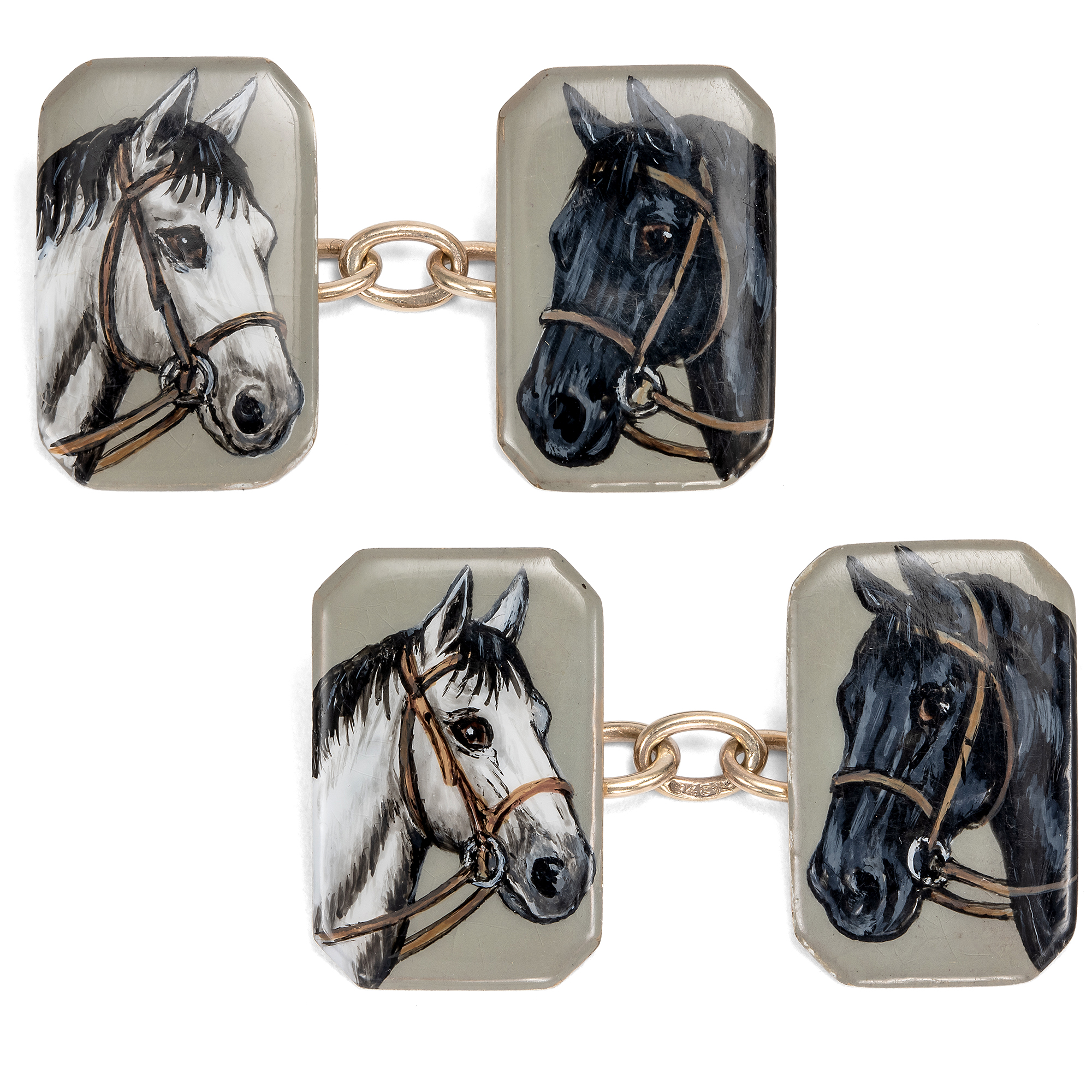 Der Pferdesport ist seit alters her als Sport der Könige bekannt, doch ist er seit Jahrhunderten auch die Leidenschaft von Aristokratie und Bürgertum. Besonders in England erfreut er sich seit alters her größter Beliebtheit. Bis heute sind die großen Rennen wie etwa in Ascot oder das Epsom Derby Höhepunkte des gesellschaftlichen Lebens, bei denen das Sehen und Gesehenwerden mindestens genauso wichtig ist wie der Sport selbst. Das vorliegende Paar antiker Manschettenknöpfe aus den 1930er Jahren ist dem Thema Pferdesport gewidmet. Sie sind ein später Vertreter der sogenannten „Novelty Jewellery“ und zeigen als Schaustücke gelängte Oktogone mit feiner Emaillierung. Vor grauem Grund sehen wir den Kopf zweier Pferde: eines Schimmels und eines Rappen, beide mit Zaumzeug. Das Paar ist aus Gold gearbeitet. Laut Stempelung sind die Knöpfe eine Arbeit der Goldschmiede H. Huntley & Sons, die in der Vyse Street in Birmingham ansässig waren. 1937 wurden sie in Chester der Beschau vorgelegt. Sie sind sehr schön erhalten und werden in einem Vintage-Etui des Juweliers N. Bloom & Sons geliefert.