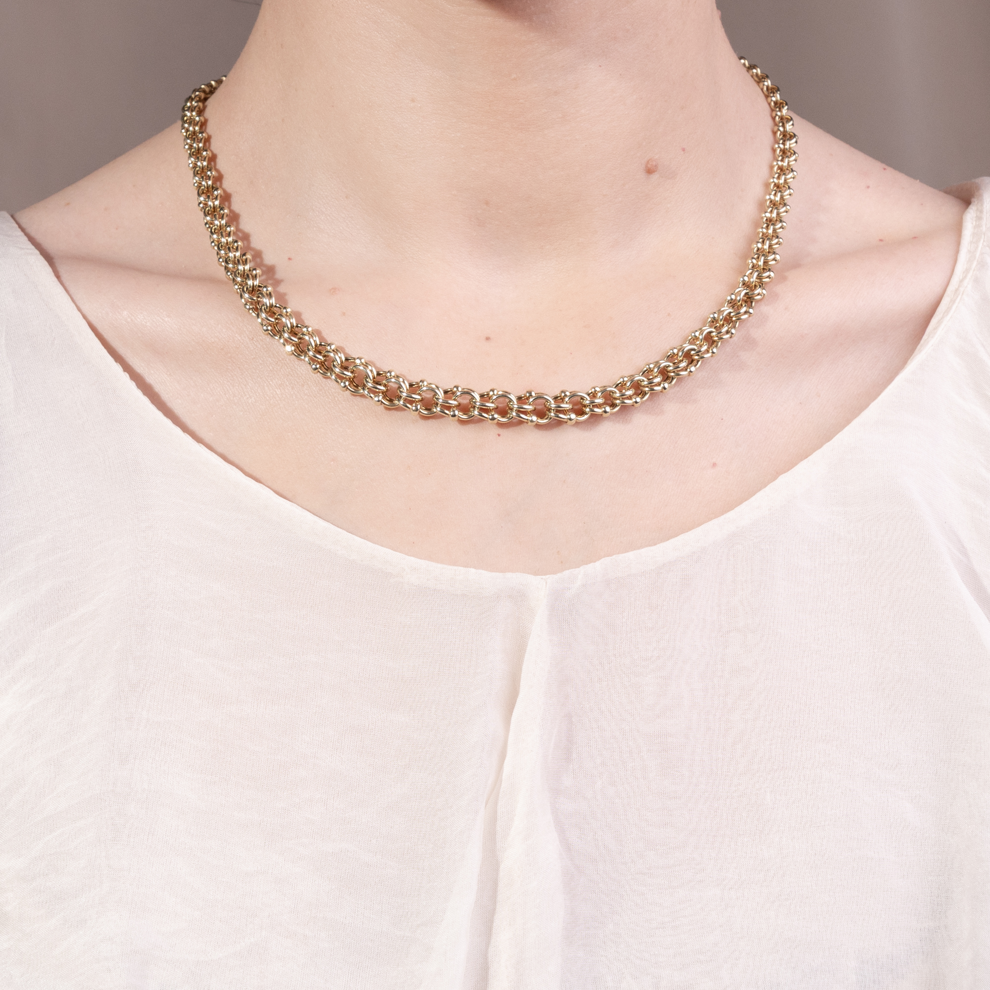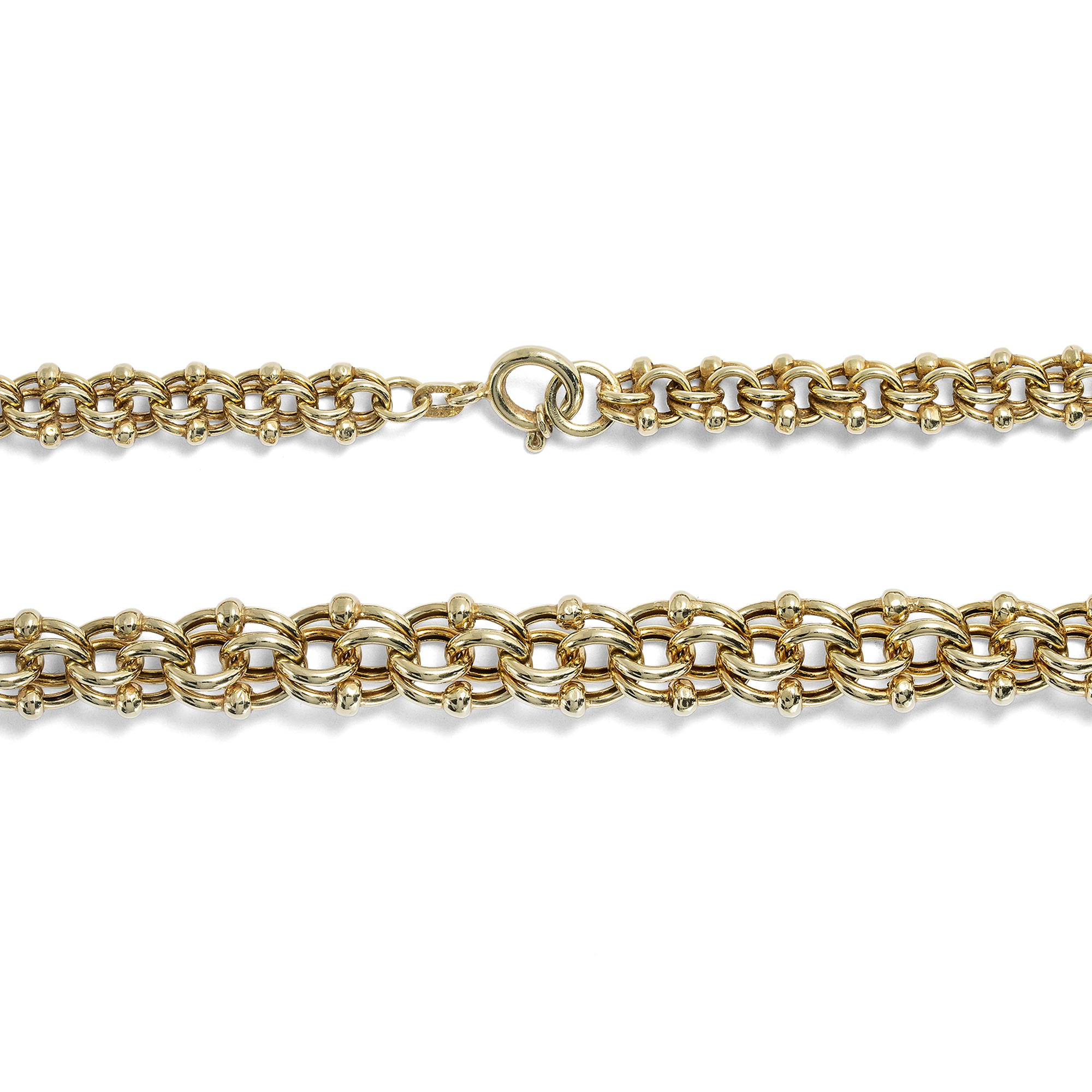 In den ersten Jahren der Bundesrepublik gehörte kostbarer Goldschmuck zu den unverzichtbaren Statussymbolen des Bürgertums und goldene Juwelen erfüllten die Träume der Damen der Zeit. Nach den entbehrungsreichen Kriegsjahren brachte das Wirtschaftswunder neuen Reichtum und erlaubte die Erfüllung dieser luxuriösen Bedürfnisse. Die vorliegende Kette, die wir im Havelland entdeckt haben, entstammt dieser Zeit der wiedergewonnenen Lebensfreude. Der Halsschmuck ist aus massivem 14-karätigen Gelbgold gefertigt und legt sich angenehm um den Hals. Die Kette zeigt das dekorative Garibaldimuster in runden Gliedern, die zur Mitte hin im leichten Verlauf größer werden. Kleine Goldkügelchen beleben den Entwurf. Ein schönes Goldcollier der 1950er Jahre mit feinen Details aus der 1910 gegründeten Manufaktur von Friedrich Binder in Mönsheim.