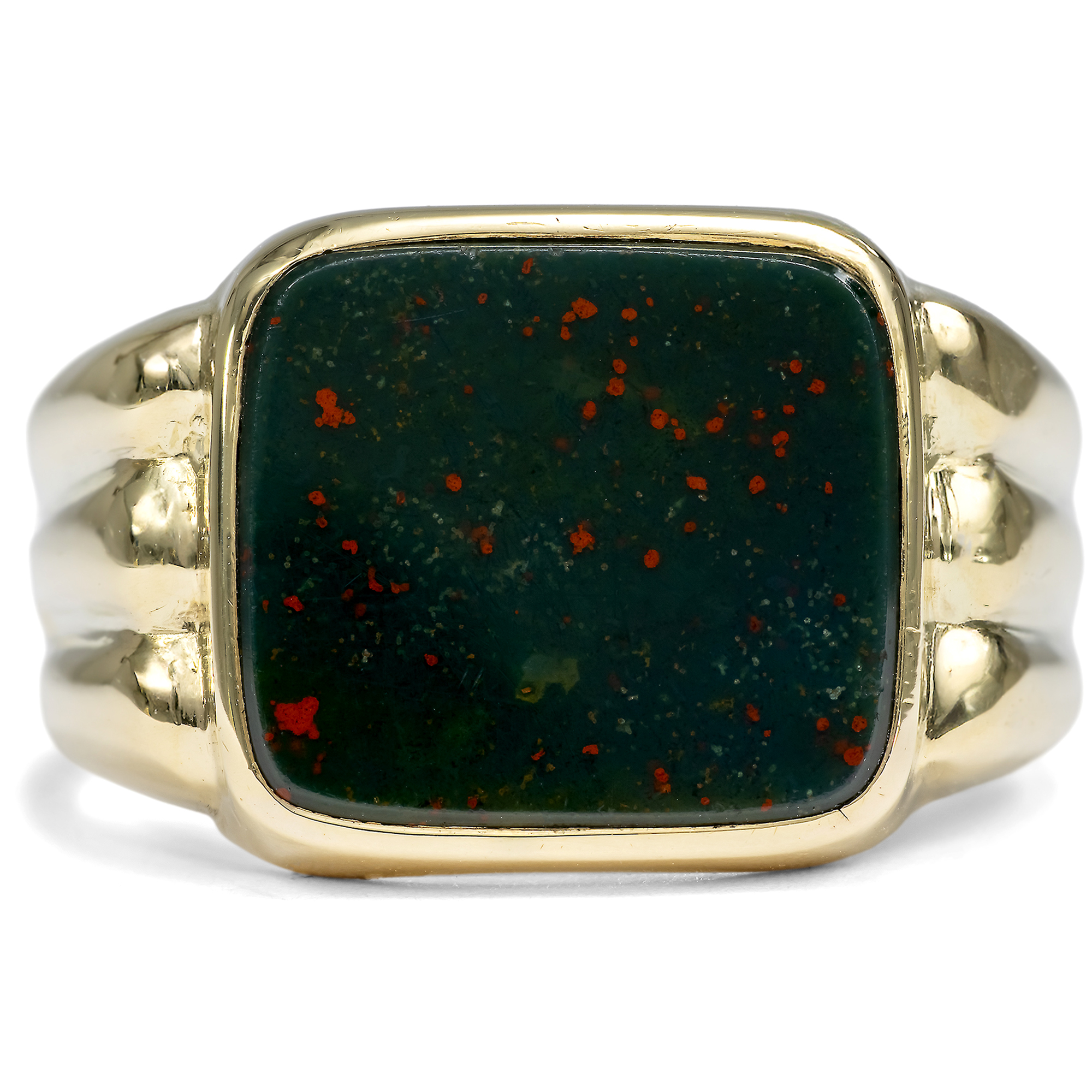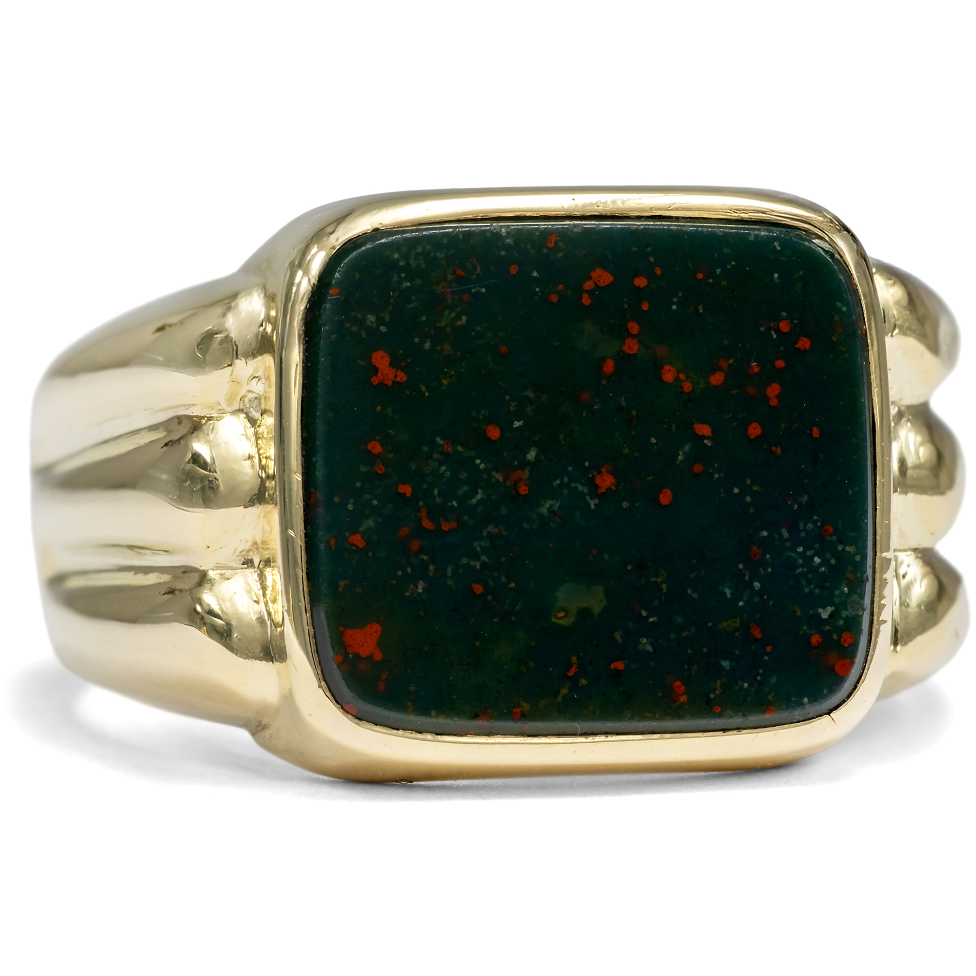 Der Siegelring war schon in der Antike ein wichtiges Symbol und diente neben der Funktion des Besiegelns von Dokumenten auch als repräsentatives Statusobjekt. Der hier vorliegende Ring ist ein solcher Siegelring, doch durch eine Laune der Geschichte sozusagen noch ein unbeschriebenes Blatt. Die Fassung aus Gold trägt eine polierte Scheibe aus Heliotrop in Form eines Kissens mit abgerundeten Ecken. Der Stein zeigt vor dunkelgrünem Grund dunkelrote Einsprengsel, die als Blutstropfen Christi gedeutet wurden und dem Stein auch den Namen „Blutjaspis“ einbrachten. Der Heliotrop ist ein besonders geeigneter Stein für Intaglios. So kann ein geschickter Steinschneider hier ein Wappen oder Monogramm eingravieren. Jedoch ist der Stein auch in dieser unverzierten Form schön. Seine solide Form verleiht dem um 1950 in Deutschland entstandenen Ring ein würdevolles Aussehen. Aufgrund seiner Bauweise kann der Ring nicht geändert werden. Ein zeitloser Klassiker für den Herrn mit Stil.