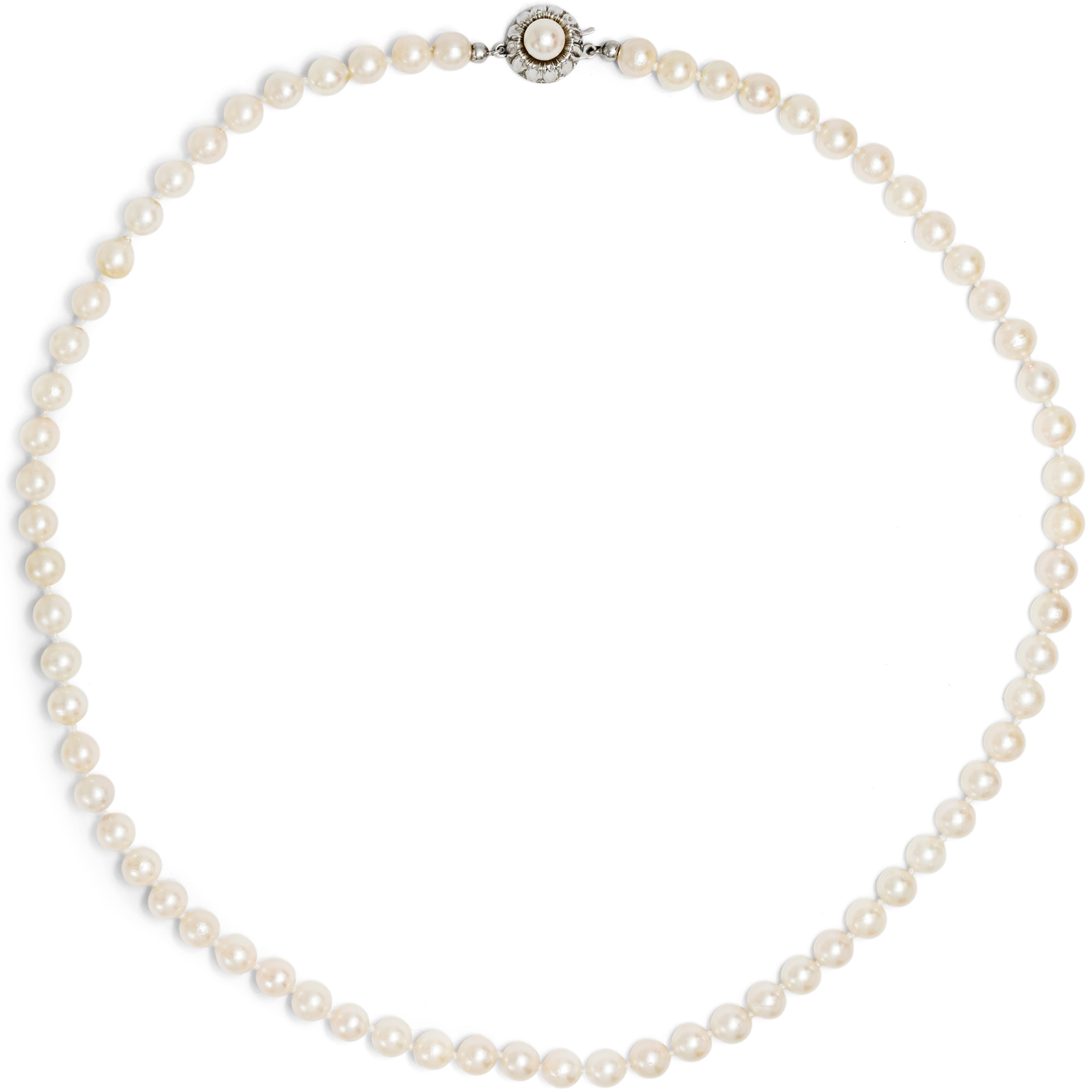 Perlen gehören seit jeher zu den begehrtesten Materialien in der Welt des Schmucks. Vor der Erfindung der Perlenzucht war ihr Wert nur mit den vier großen Edelsteinen Rubin, Smaragd, Diamant und Saphir (in der Reihenfolge ihrer früheren Bedeutung) zu vergleichen. Viele Geschichten und Legenden ranken sich um die Entstehung von Perlen und die magischen Kräfte, die man ihnen zuschrieb. Das vorliegende Collier besteht aus einer Reihe dieser sagenumwobenen Schätze. Es handelt sich um Akoya-Zuchtperlen, die seit den 1920er Jahren in Japan in speziellen Muscheln gezüchtet werden. Dabei wächst jede Perle mehrere Jahre, bis sie die benötigte Größe erreicht. Die Perlen haben eine cremige Farbe mit einem rosigen, teilweise leicht grünen Überfang. Die Form der Perlen ist rund bis leicht barock, der Lüster ist gut bis sehr gut. Die Perlen zeigen leichte Wachstumsmerkmale, die sie als Naturprodukt kennzeichnen. Die zurückhaltende Silberschließe stammt aus der Manufaktur von J. Köhle in Pforzheim. Die Schließe ist in Form einer stilisierten Blüte gestaltet und mit einer weiteren Perle besetzt. Wir datieren die Kette, die mit einer Länge von 52 cm ein sogenanntes Matinée-Collier ist, in die Jahre um 1970. Wir haben die Perlen neu aufgezogen und geknotet, sodass sie direkt angelegt werden können.