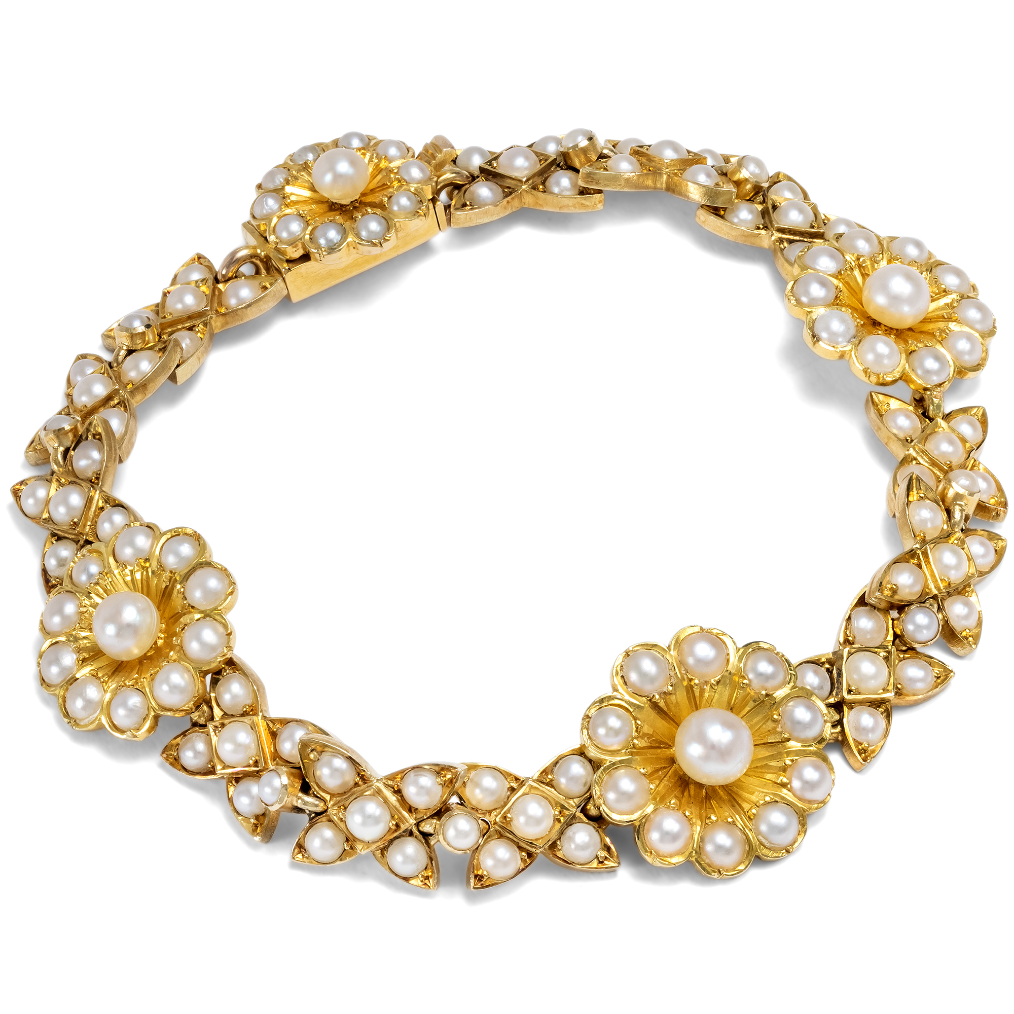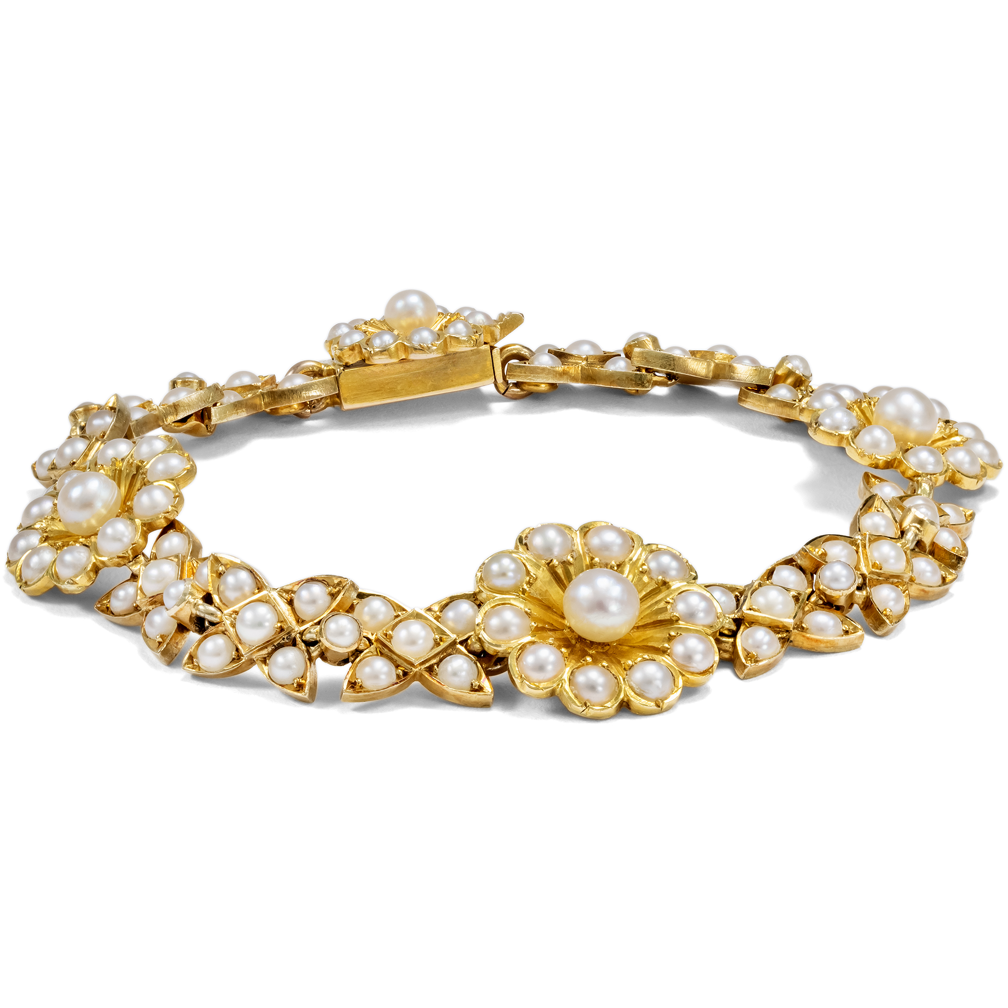Das vorliegende Armband ist luxuriös und schwer gearbeitet: Mit einem Gewicht von 21,7 g legt es sich um den Arm. Seine satte, warm leuchtende Farbe lässt verstehen, weshalb in der Alchemie einst die Sonne als das Symbol des Goldes und des Steins der Weisen galt, der unedle Metalle zu Gold umwandeln sollte. Doch die Goldschmiede des 19. Jahrhunderts kannten noch einen weiteren Trick, um Gold noch satter wirken zu lassen: das sog. Bloom Finish, eine zusätzliche Feinvergoldung. Auch dieses Stück leuchtet in jenem samtig goldenen Ton, der die schönsten viktorianischen Goldschmuckstücke auszeichnet. Das Armband ist als eine Girlande von Blüten gearbeitet, die sanft um den Arm fließen. Drei große, voll geöffnete Blüten sind die Schaustücke, eine etwas kleinere versteckt die Schließe – so ist das Armband selbst dann noch dekorativ, wenn es sich am Arm dreht. Dazwischen bestehen die Glieder aus beweglichen, stilisierten Blüten, deren Zwischenräume von Perlen gefüllt werden. Ohnehin ist die gesamte Oberfläche mit Perlen besetzt, die sich dicht an dicht reihen und dem sanften Leuchten des Goldes ihren unvergleichlichen Lüster zur Seite stellen. Das Armband ist ein hochwertiges und zeittypisches Schmuckstück der späten viktorianischen Zeit, als weich fließende Armbänder allmählich den starren Armreifen vorgezogen wurden. Wir konnten es in London entdecken. Sehr wahrscheinlich ist es auch in England entstanden, wo man eine besondere Vorliebe für Schmuck aus Gold und Saatperlen hegte.
