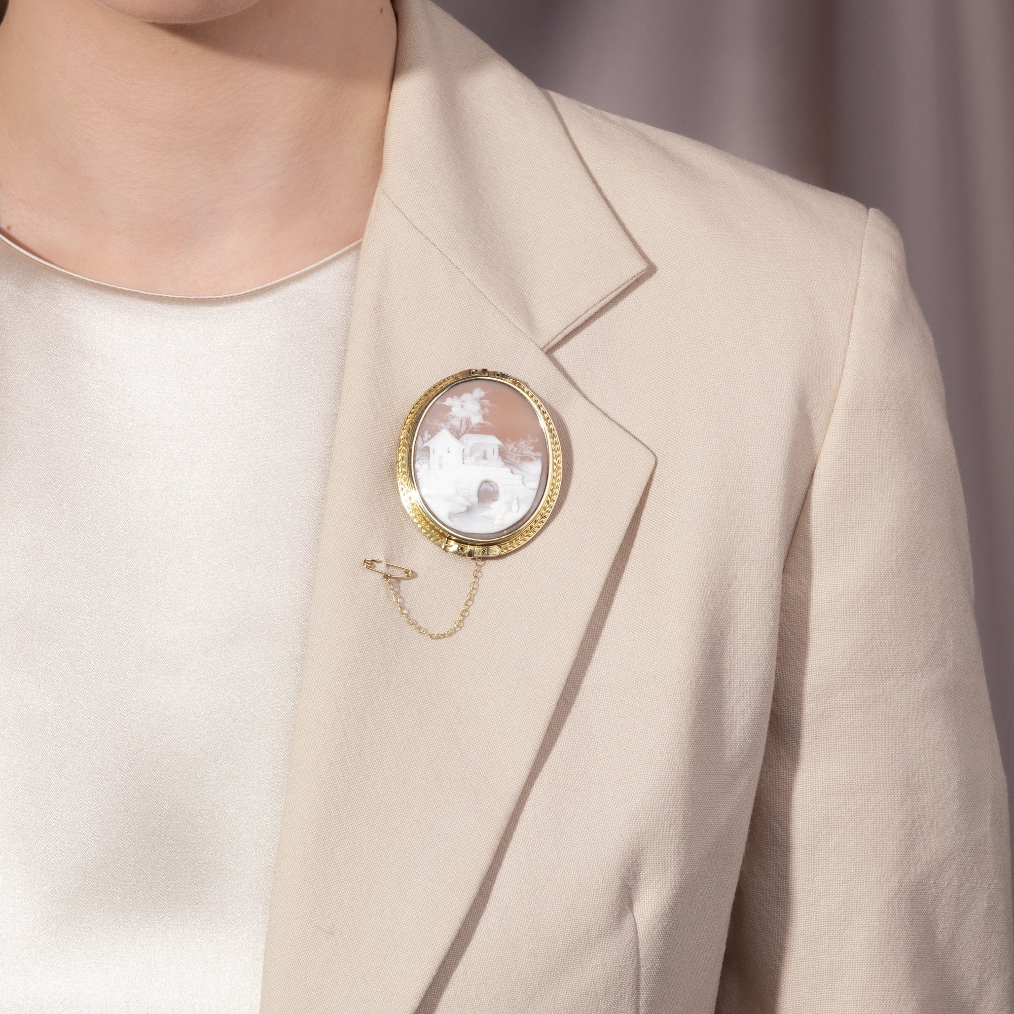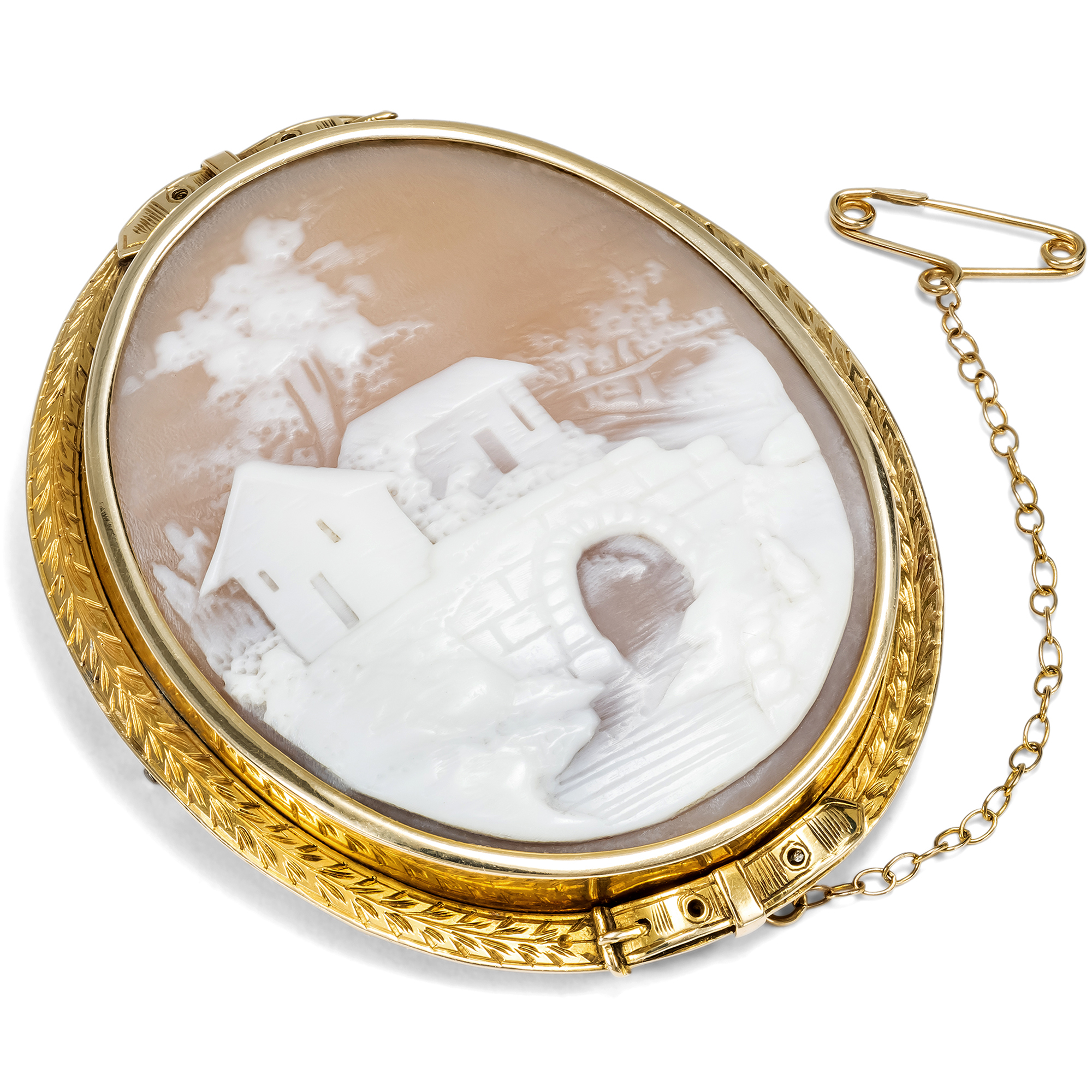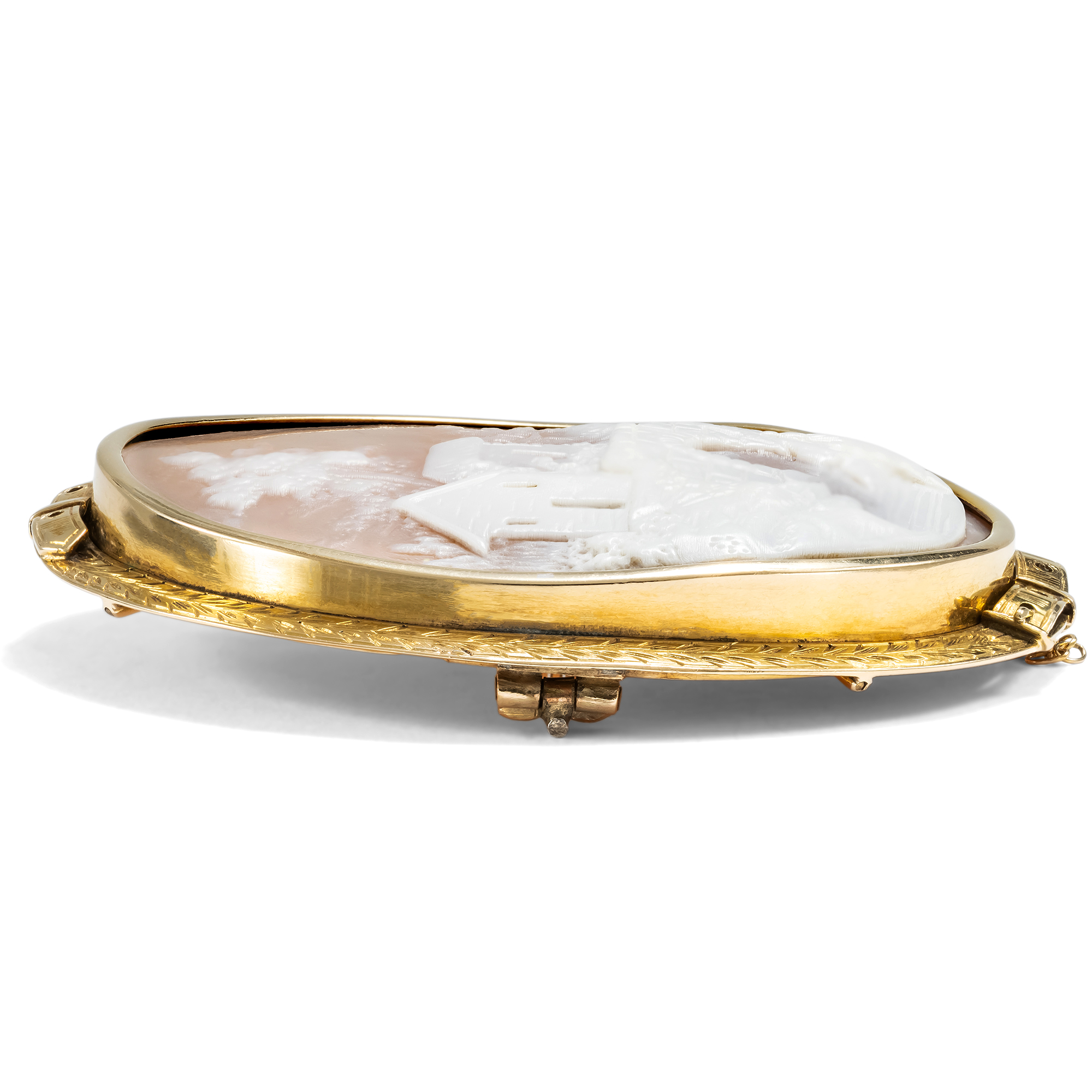 Eine Muschelgemme in malerischem Schnitt sehen wir hier in Gold gefasst. Die vermutlich französische Arbeit aus der Mitte des 19. Jahrhunderts zeigt eine arkadische Szene: Eine steinerne Brücke spannt sich über einen Bach, eine weibliche Figur steht sinnend am Wasser, im Mittelgrund sehen wir ein kleines Gehöft mit einem einfachen Lattenzaun unter einem großen, wie hingetupft wirkenden Baum. Auf den ersten Blick handelt es sich bei der Darstellung um eine Genreszene ohne weitere Bedeutung. Vor dem Hintergrund ihrer Entstehungszeit indes gewinnt das Stück geradezu den Charakter eines Zeitdokumentes. Mit der beginnenden Industrialisierung des 19. Jahrhunderts veränderte sich das Leben in Frankreich zunehmend. Die großen Romane Émile Zolas berichten von dem wachsenden Zuzug vieler Menschen nach Paris. Die Stadt wurde umgestaltet, die alten, romantischen Teile des mittelalterlichen Paris verschwanden und die großen Alleen und Boulevards nahmen stattdessen ihren Platz ein. Trotz aller Fortschrittsfreude und neuem Luxus gewann in breiten Teilen der Bevölkerung doch auch das Gefühl des Verlustes des alten Frankreichs die Oberhand. Die hier vorgestellte Gemme ist vor diesem Hintergrund zu verstehen: Sie feiert noch einmal in romantischer Manier das Landleben, das unbeschwerte Glück unter freiem Himmel, unbedarft und ohne Verpflichtungen von Büro, Kontor und Fabrik. Ähnlich wie bereits im Ancien Régime brach sich eine Landsehnsucht ihre Bahn, die in der rückwärtsgewandten Verklärung des Ländlichen zugleich eine Utopie für die Zukunft entwickeln konnte, freier und in engerem Miteinander zu leben. Der Schnitt der Arbeit ist wunderbar: Beinahe impressionistisch ist die Landschaft entworfen, ohne sich in zu kleinen Details zu verlieren. Die Rahmung ist detailreich und hochwertig ausgeführt: Zwei Gürtel scheinen die Szene auch symbolisch festhalten zu wollen. Die schöne und seltene Kamee fand aus einer Berliner Sammlung zu uns.
