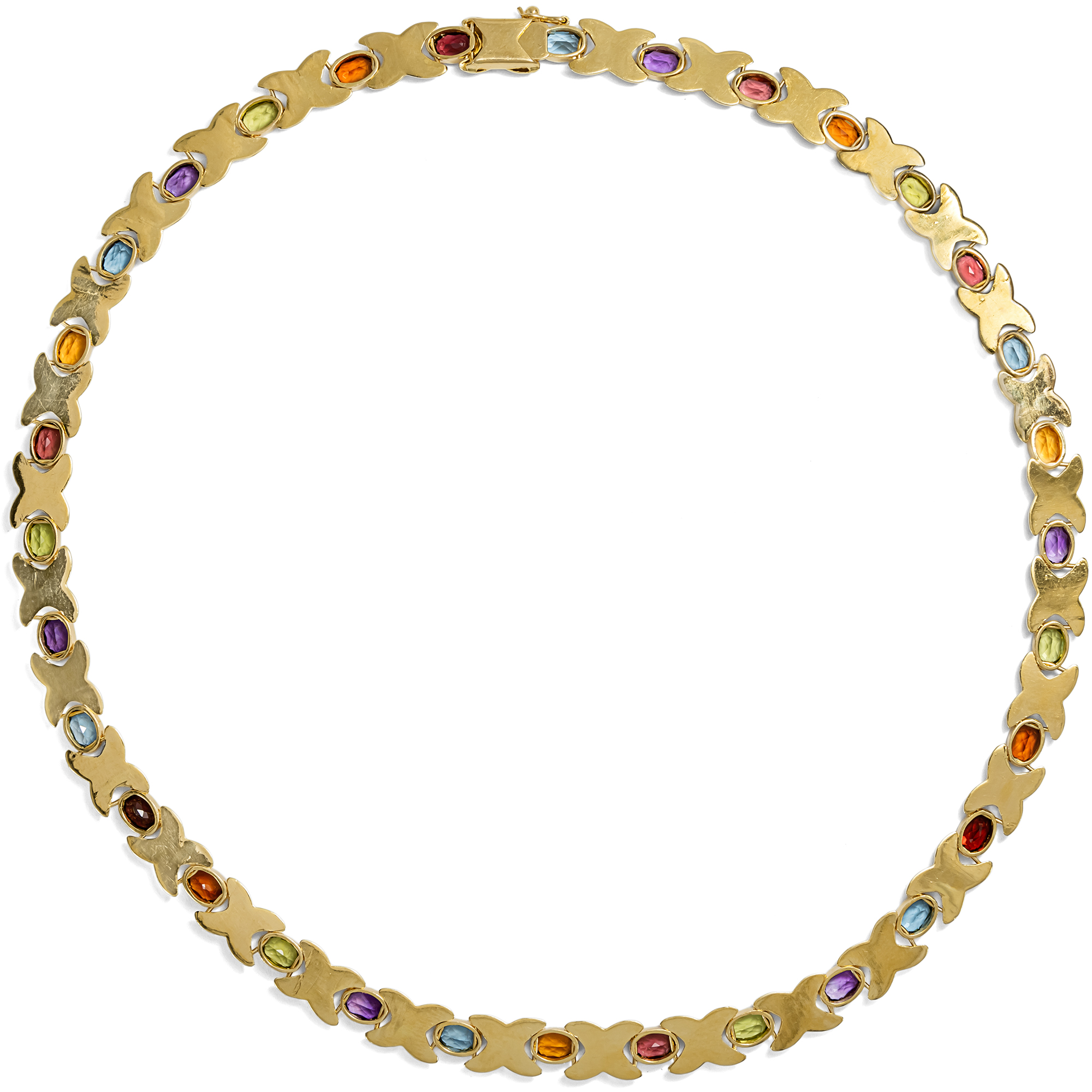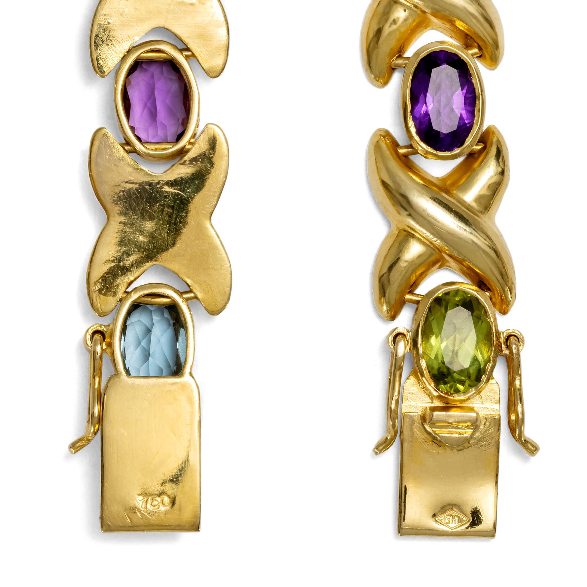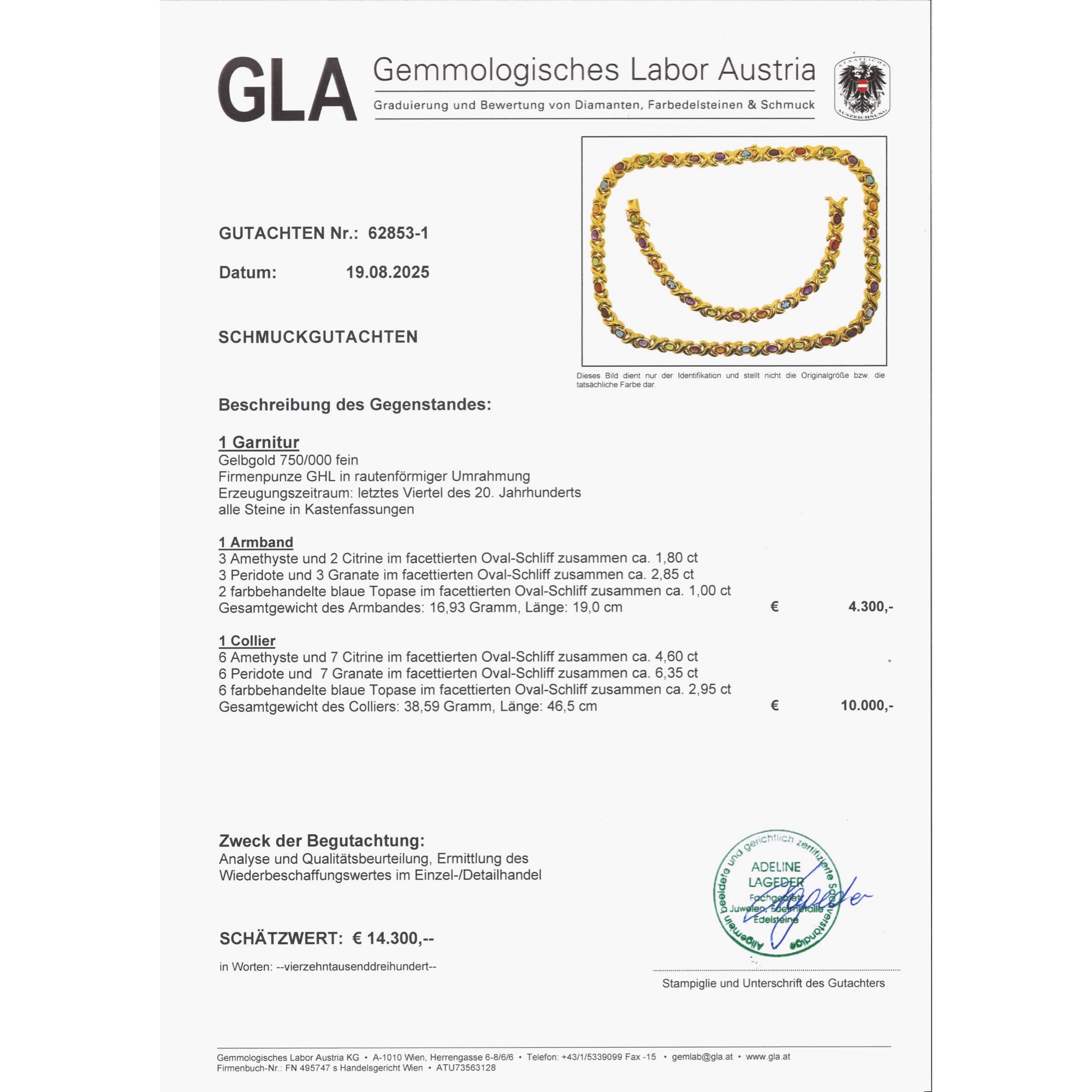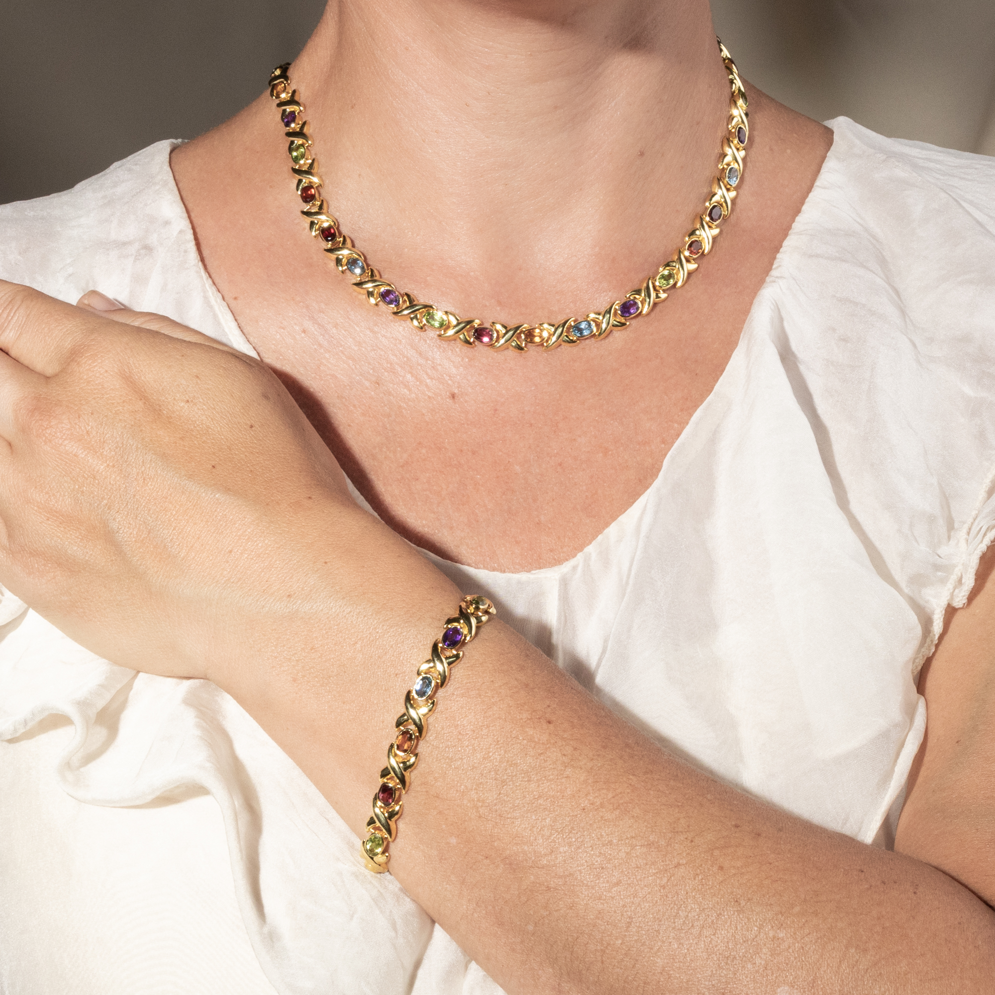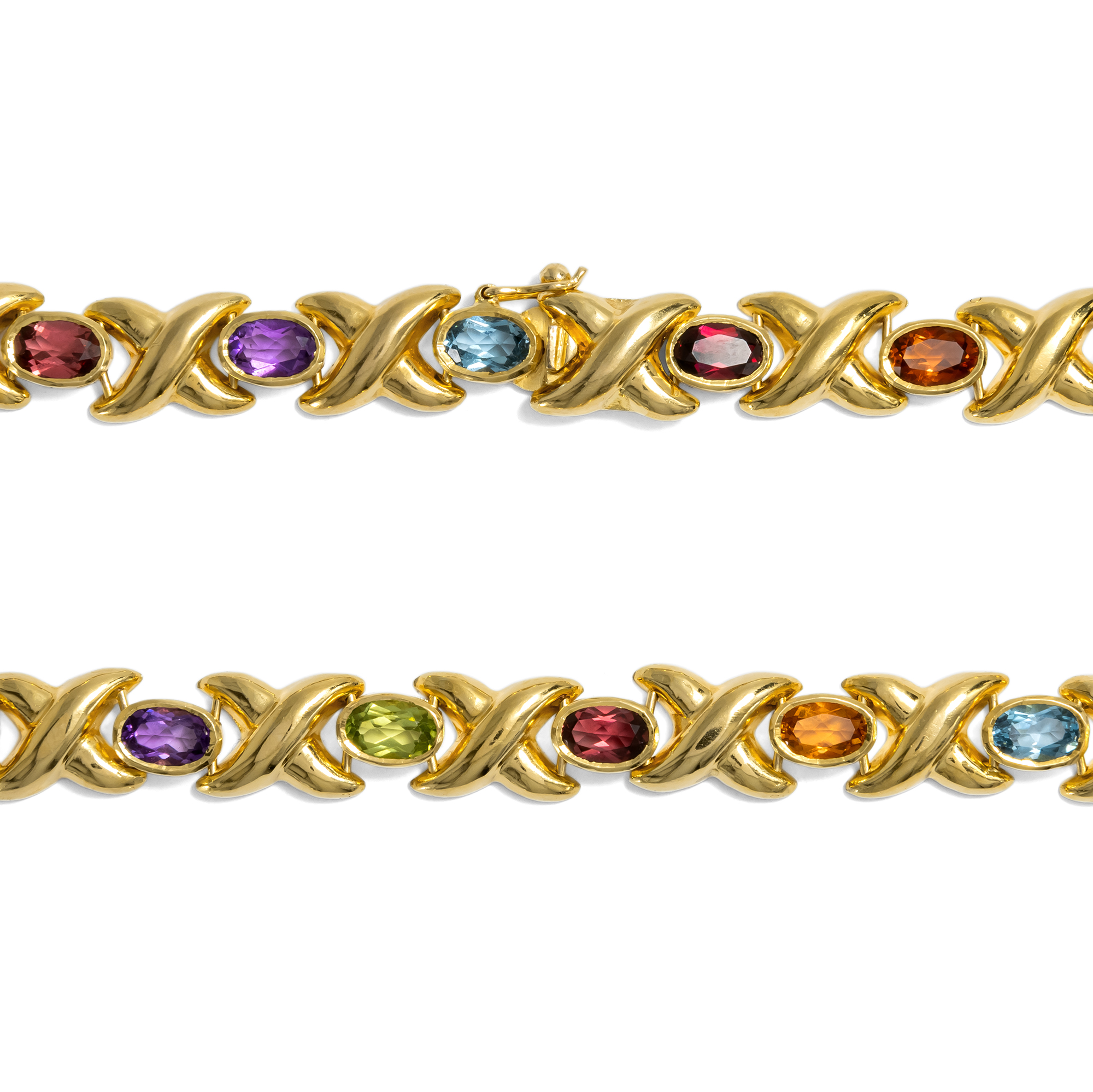 Aus der traditionsreichen Werkstatt des Juweliers Georg H. Leicht in Pforzheim stammt dieses farbenprächtige Set aus Collier und Armband. In beiden Stücken verbinden sich feine Edelsteine mit sanft geschwungenen, X-förmigen Spangen aus hochkarätigem Gold zu einer rhythmischen Komposition. Zwischen den Goldelementen sind verschiedenfarbige natürliche Edelsteine, die wie köstliche Bonbons wirken, in einer bunten Reihung eingefasst: neun Amethyste, neun Peridote, acht blaue Topase, zehn Granate und neun Citrine sind gleichartig geschliffen und zeigen sich als strahlende Lichtpunkte. Jeder einzelne Stein ist facettiert und in einer präzise gearbeiteten Zargenfassung eingefasst, wodurch das Licht auf seiner Oberfläche tanzt und ein lebendiges Farbspiel von Violett, Grün, Blau, Rot und Gold entsteht. Die klaren, kraftvollen Linien und der bunte Look spiegeln die Ästhetik der 1990er Jahre wieder, als kräftiges Gelbgold genau so gern verarbeitet wurde wie verschiedene farbintensive Edelsteine. Zugleich belegt das Set den traditionell hohen Anspruch der Pforzheimer Entwerfer. Das Ensemble bezieht seine Ausstrahlung nicht aus seiner Größe, sondern aus der feinen Balance von Design, Material und Licht. Zu uns kam das Set vom Niederrhein.