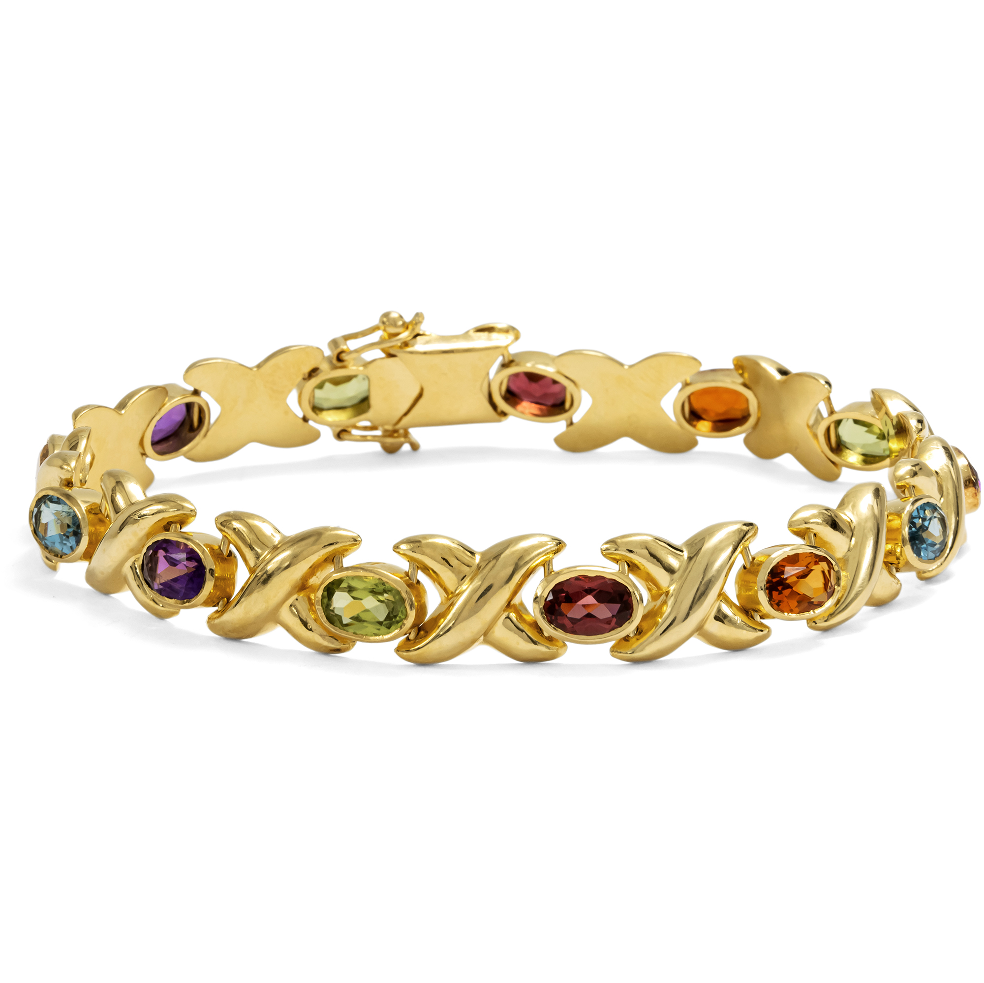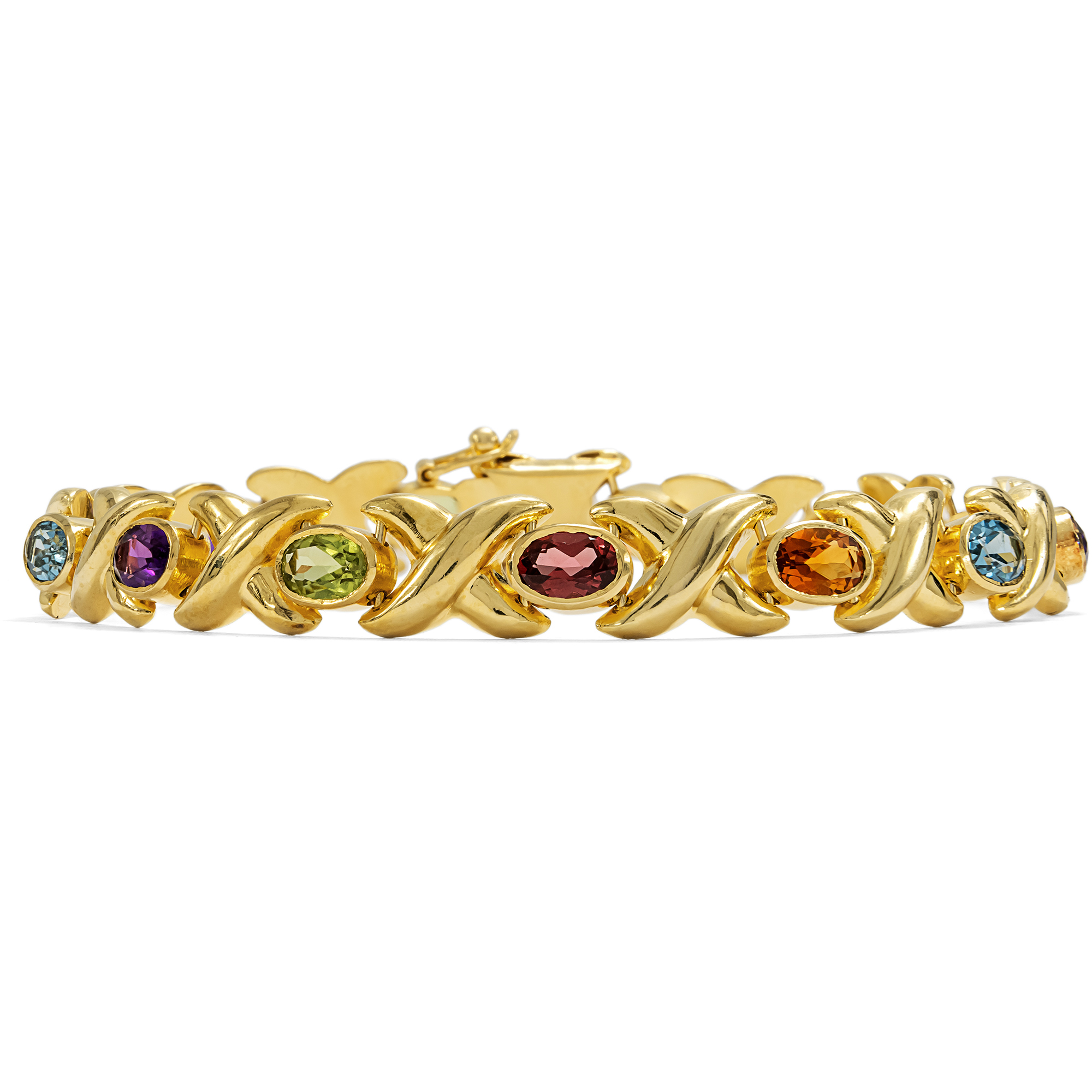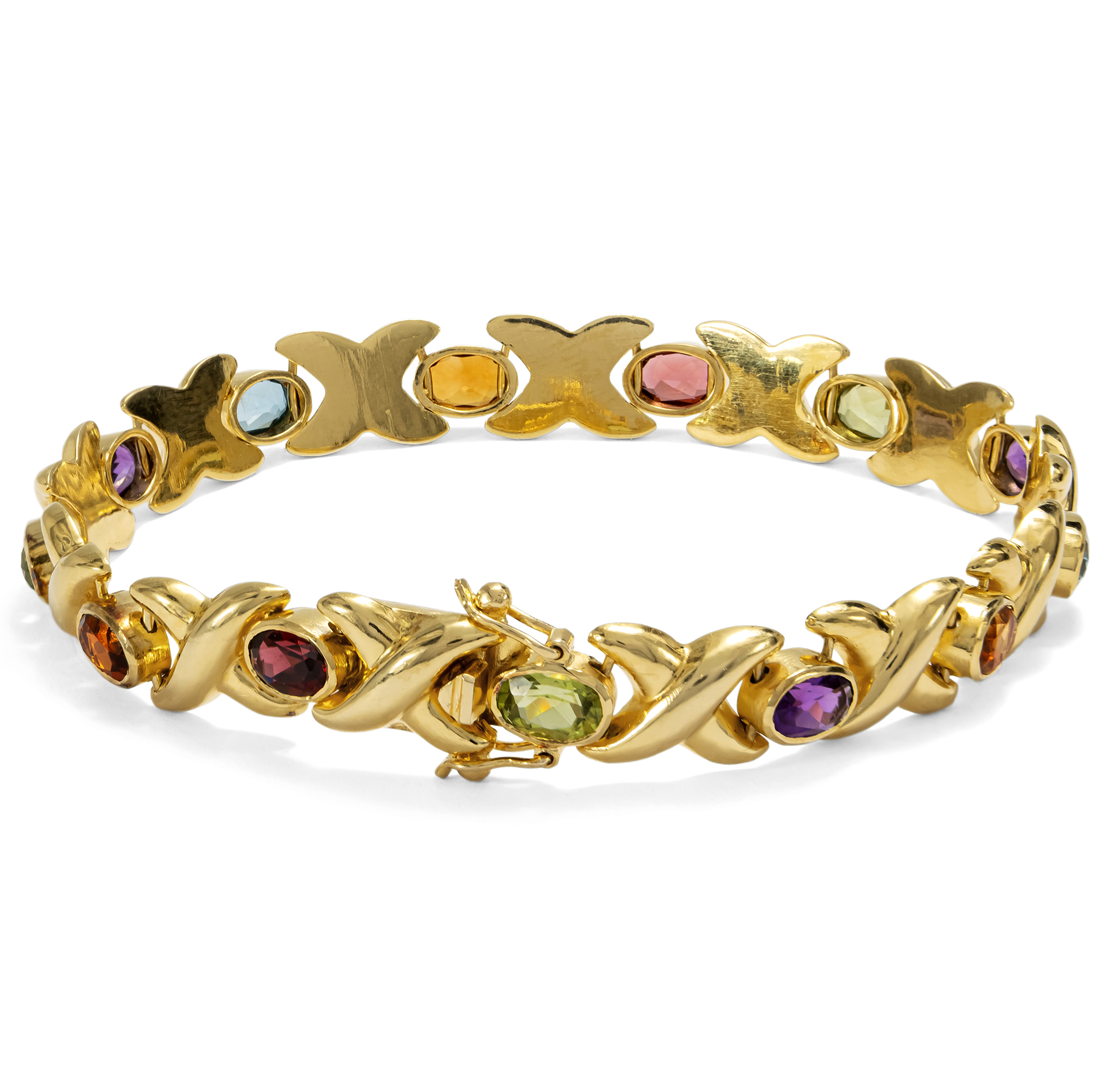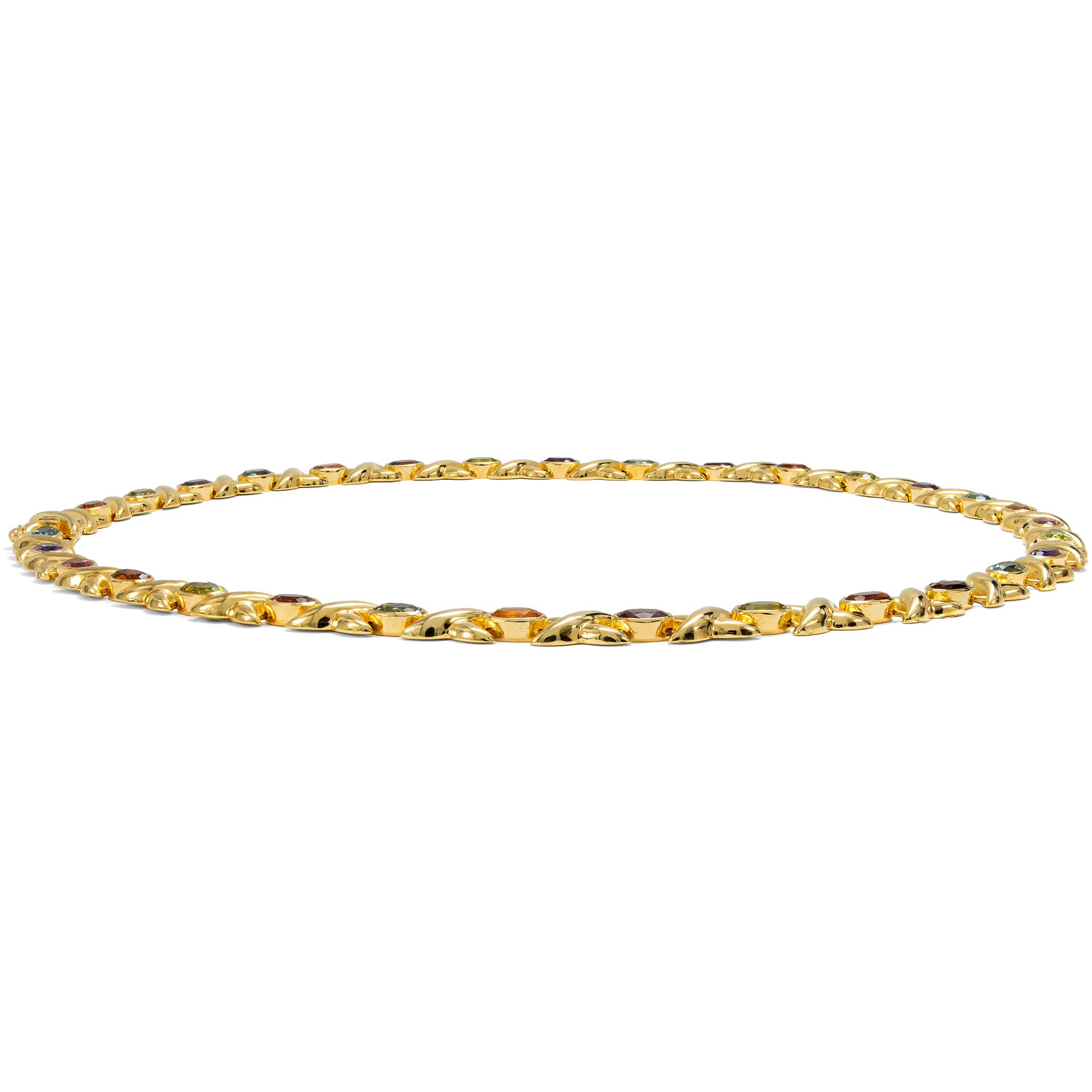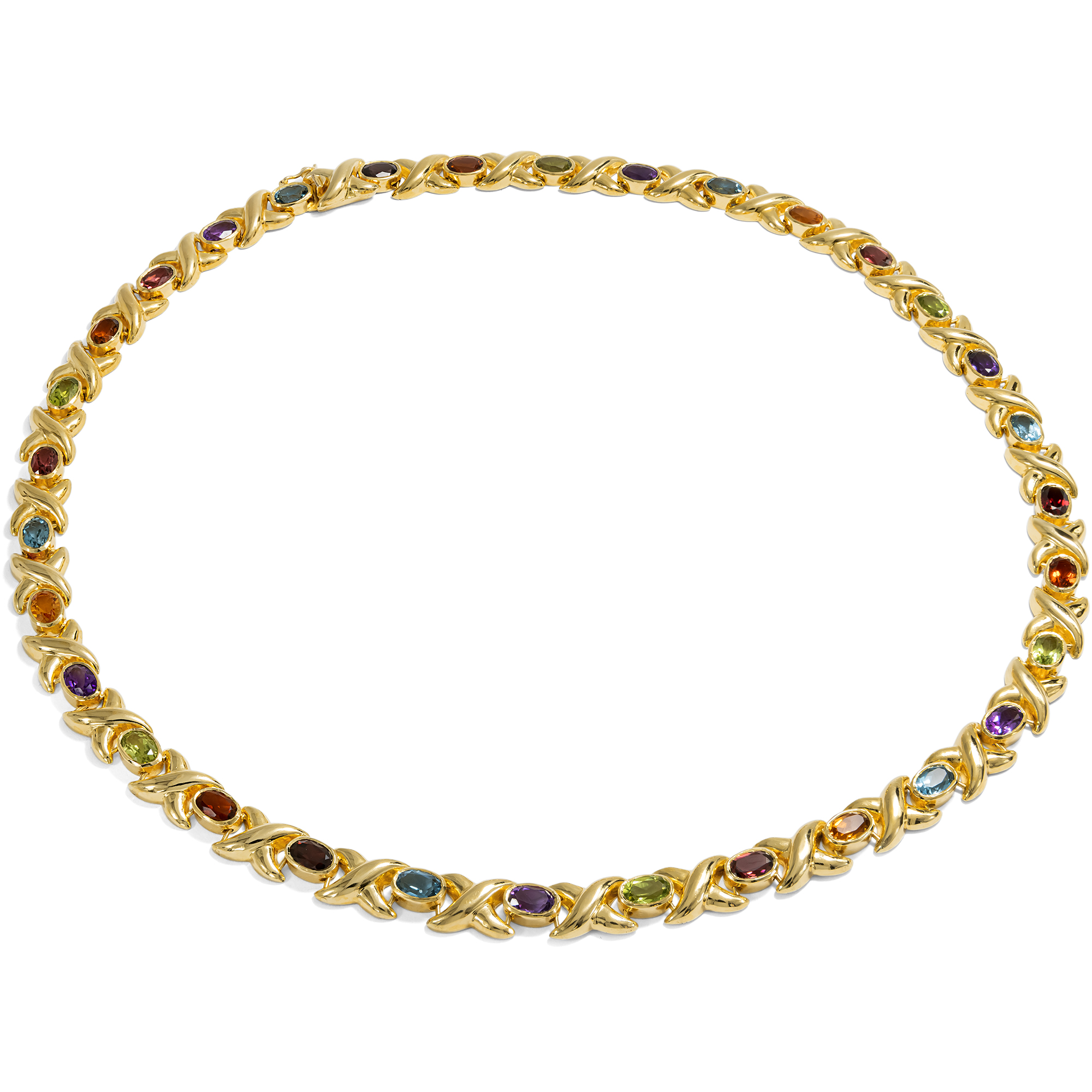 Aus der traditionsreichen Werkstatt des Juweliers Georg H. Leicht in Pforzheim stammt dieses farbenprächtige Set aus Collier und Armband. In beiden Stücken verbinden sich feine Edelsteine mit sanft geschwungenen, X-förmigen Spangen aus hochkarätigem Gold zu einer rhythmischen Komposition. Zwischen den Goldelementen sind verschiedenfarbige natürliche Edelsteine, die wie köstliche Bonbons wirken, in einer bunten Reihung eingefasst: neun Amethyste, neun Peridote, acht blaue Topase, zehn Granate und neun Citrine sind gleichartig geschliffen und zeigen sich als strahlende Lichtpunkte. Jeder einzelne Stein ist facettiert und in einer präzise gearbeiteten Zargenfassung eingefasst, wodurch das Licht auf seiner Oberfläche tanzt und ein lebendiges Farbspiel von Violett, Grün, Blau, Rot und Gold entsteht. Die klaren, kraftvollen Linien und der bunte Look spiegeln die Ästhetik der 1990er Jahre wieder, als kräftiges Gelbgold genau so gern verarbeitet wurde wie verschiedene farbintensive Edelsteine. Zugleich belegt das Set den traditionell hohen Anspruch der Pforzheimer Entwerfer. Das Ensemble bezieht seine Ausstrahlung nicht aus seiner Größe, sondern aus der feinen Balance von Design, Material und Licht. Zu uns kam das Set vom Niederrhein.
