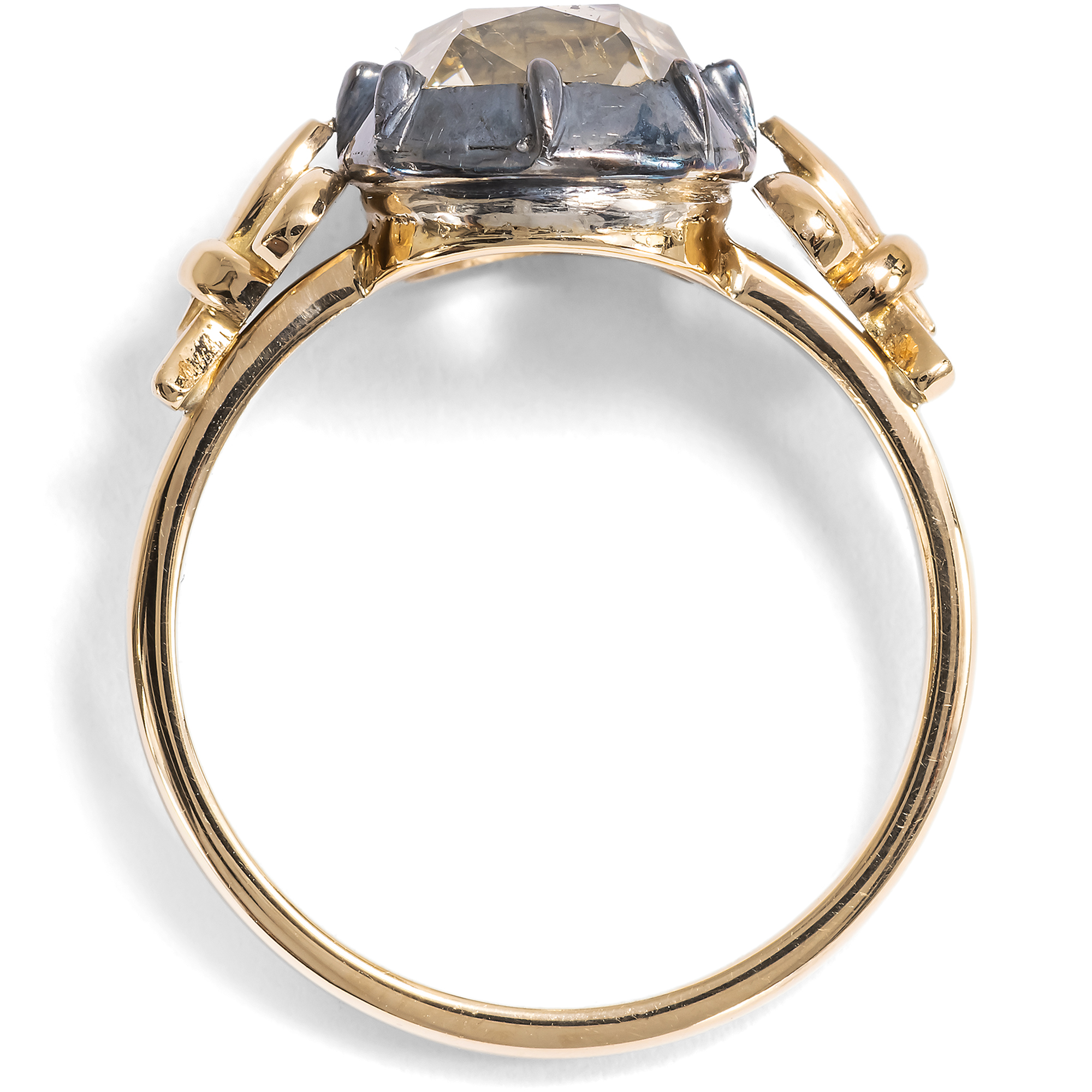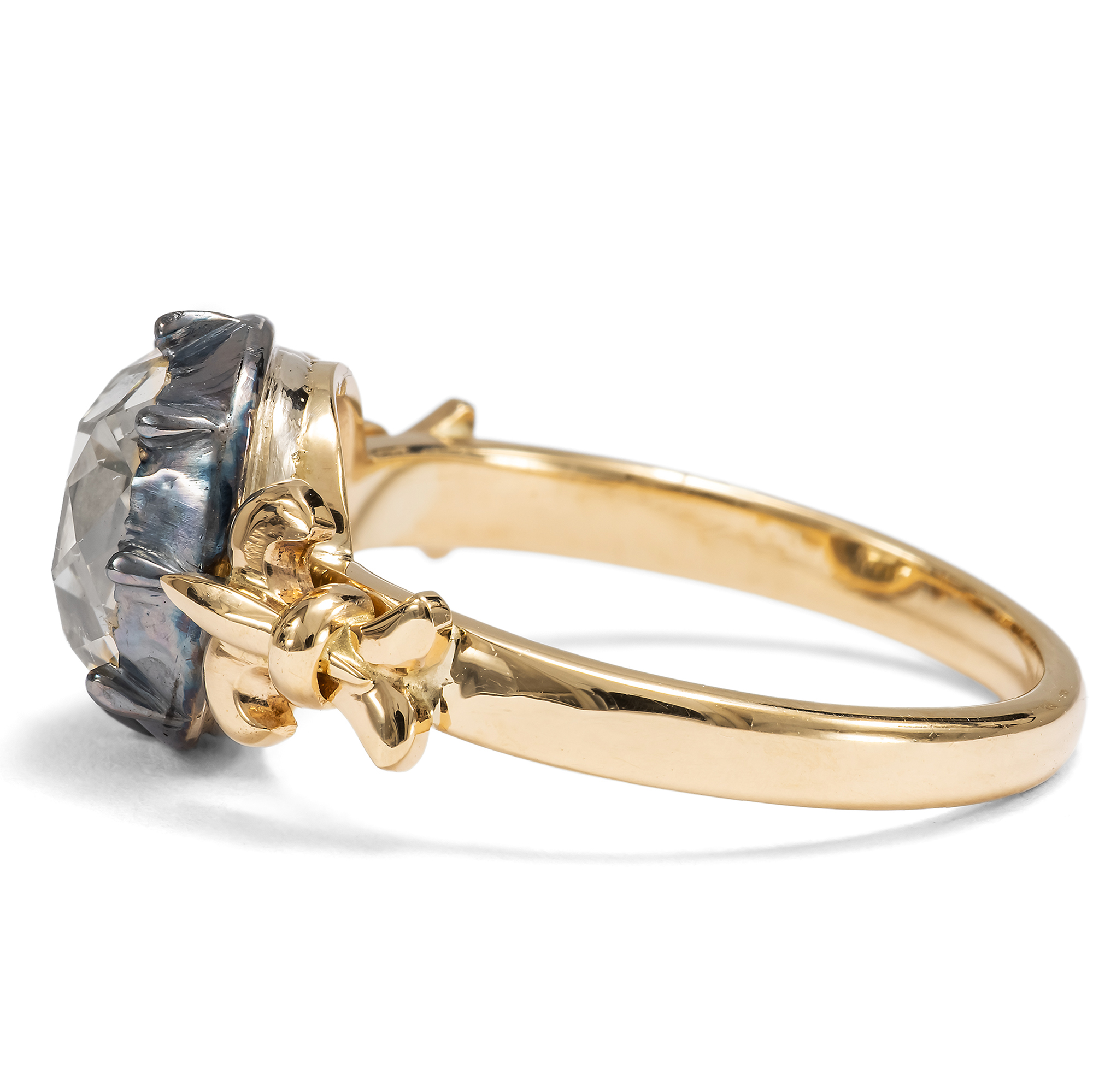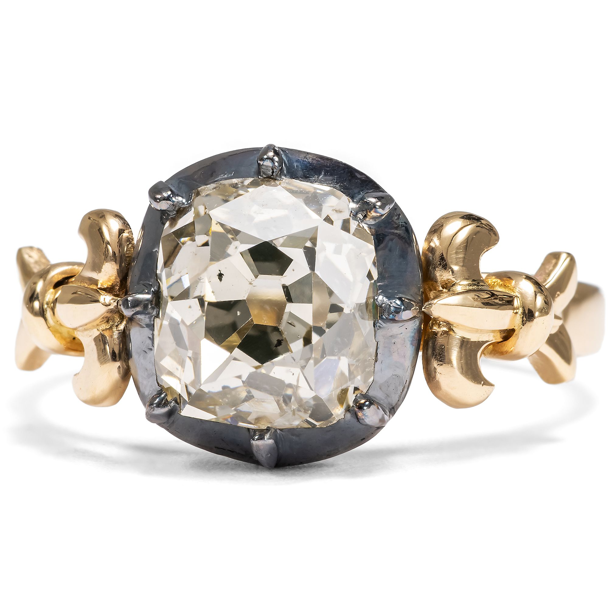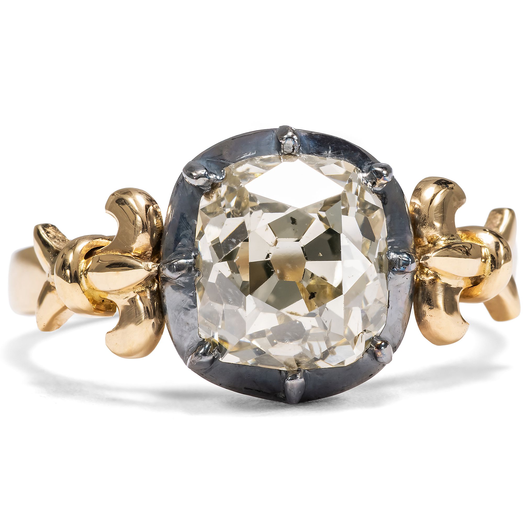 Die Diamantschleifer vergangener Jahrhunderte waren auf der Suche nach jener Form, die dem Edelstein seine größtmögliche Leuchtkraft entlocken konnte. Für das heutige Auge wirken frühe Diamanten oft überraschend zurückhaltend. Die Schlifftechniken des Mittelalters ließen nur begrenzte Lichtreflexe zu, und die damals verbreiteten Tafelschliffe betonten vor allem den Glanz des Steins und seine Farbe, nicht aber das innere Feuer der Steine. Erst im Verlauf des 17. Jahrhunderts vollzog sich ein entscheidender Wandel. Der Adel entwickelte im Barock eine ausgesprochene Vorliebe für funkelnde Edelsteine, die im Schein von Kerzenlicht ihre Wirkung entfalten sollten, und nach und nach, von Generation zu Generation, gelang es den Diamantschleifern, dem Stein immer weitere Facetten abzuringen. Im frühen 19. Jahrhundert wurde so der sog. „Old Mine Cut“ üblich, ein Schliff mit einem meist noch recht kissenförmigen Umriss des Steins. Zum Ende des Jahrhunderts, nach der Entdeckung der Diamantvorkommen in Südafrika, schliff man die Steine dann regelmäßig runder, und der „Old European Cut“ entstand. Der moderne Brillant schließlich ist eine Entwicklung der Jahre nach dem 1. Weltkrieg. Der hier vorgestellte Ring zeigt einen großen Diamanten im kissenförmigen Altschliff, dem sogenannten „Old Mine Cut“, mit einem Gewicht von etwa 3,40 Karat. Jede seiner Facetten wurde von Hand angelegt, stets abwägend zwischen Feuer, Lebendigkeit und dem Gewicht des Steins. Gerade diese individuelle Bearbeitung verleiht dem Stein seinen unverwechselbaren Charakter. Wir gehen davon aus, dass der Diamant zur Mitte des 19. Jahrhunderts geschliffen wurde. Der Diamant ist in geschwärztes Silber gefasst und sitzt ruhig in einer breiten Zarge, die von zarten aufgesetzten Stegen begleitet wird. Diese historische Form der Fassung gibt dem Stein eine elegante Präsenz und führt den kissenförmigen Schliff optisch in eine weichere, rundere Anmutung über. Die polierten Flächen der Rahmung nehmen das Licht sanft auf und verstärken so die Wirkung des Diamanten. Die Unterkaderung sowie der Ring selbst bestehen aus hochkarätigem Gold. Auf den Schultern erscheinen kleine Lilien als einziges dekoratives Element. Wir haben den Diamanten mit seiner originalen Fassung hier in Berlin entdeckt. Er bildete einst den Mittelpunkt einer großen Brosche, doch war diese nur noch in Teilen vorhanden und eine Wiederherstellung unmöglich. Unsere Goldschmiede haben die historische Fassung bewahrt und die Ringschiene mit den Lilien aus Gold hinzugefügt, um den Diamanten wieder tragbar zu machen. Der Ring wird mit einem ausführlichen Gutachten geliefert.