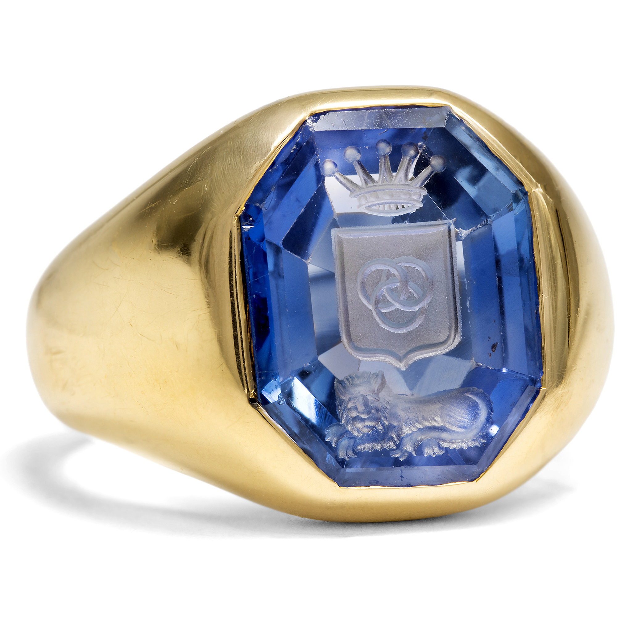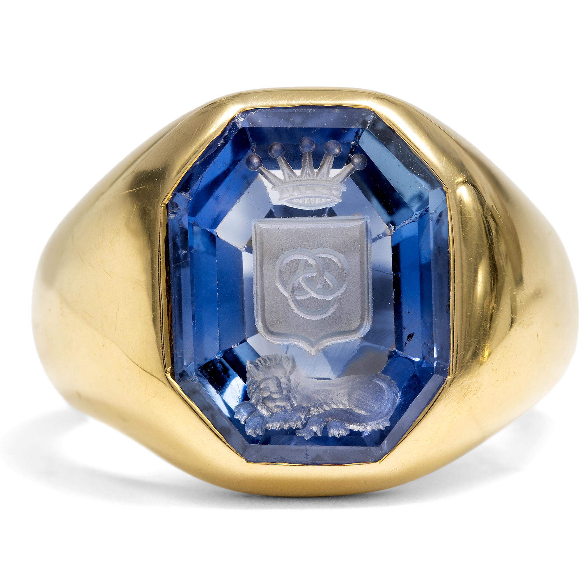 Dieser ungewöhnlich hochwertige Wappenring kam aus Wien zu uns. Er besteht aus massiv gegossenem Gold und hält einen gravierten Stein mit einem adligen Wappen. Wo in aller Regel opake Schmucksteine, wie Achate oder Lapislazuli, verwendet werden, überrascht dieser Ring mit einer deutlich hochwertigeren Variante. Das Wappen ist in einen natürlichen, unbehandelten Saphir aus Ceylon geschnitten. Der Edelstein ist transparent und intensiv einheitlich blau, er bringt etwa 8,50 Karat auf die Waage. Unter einer Adelskrone mit fünf Zacken sehen wir ein Wappenschild, in das drei verschlungene Ringe, zwei über eins, eingraviert sind. Ein liegender Löwe als Begleitfigur ist unter dem Wappenschild zu sehen. Bei der heraldischen Figur handelt es sich um die sog. „Borromäischen Ringe“. Ihren Namen haben sie von der italienischen Familie Borromeo, welche die Ringe in ihrem Familienwappen führte. Die verschlungenen Ringe stehen symbolisch für Stärke durch Einigkeit. Nicht zuletzt werden die drei Ringe Ende des 19. Jahrhunderts auch als Logo der Firma Krupp geführt, wo sie zugleich Eisenbahnreifen darstellen. Bei dem Ring handelt es sich um eine Anfertigung im Auftrag eines solventen Kunden, anders ist die hochwertige Ausstattung nicht zu erklären. Die Stempel im Innern der Ringschiene verraten, dass er in Wien entstanden ist. Zu welcher Familie der Ring ursprünglich gehörte, liegt allerdings noch im Dunkeln seiner Geschichte.