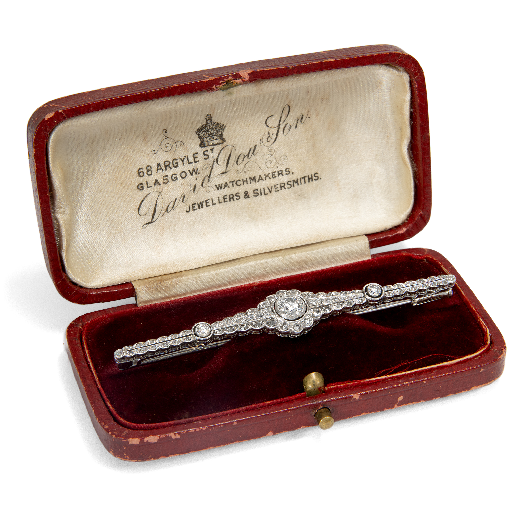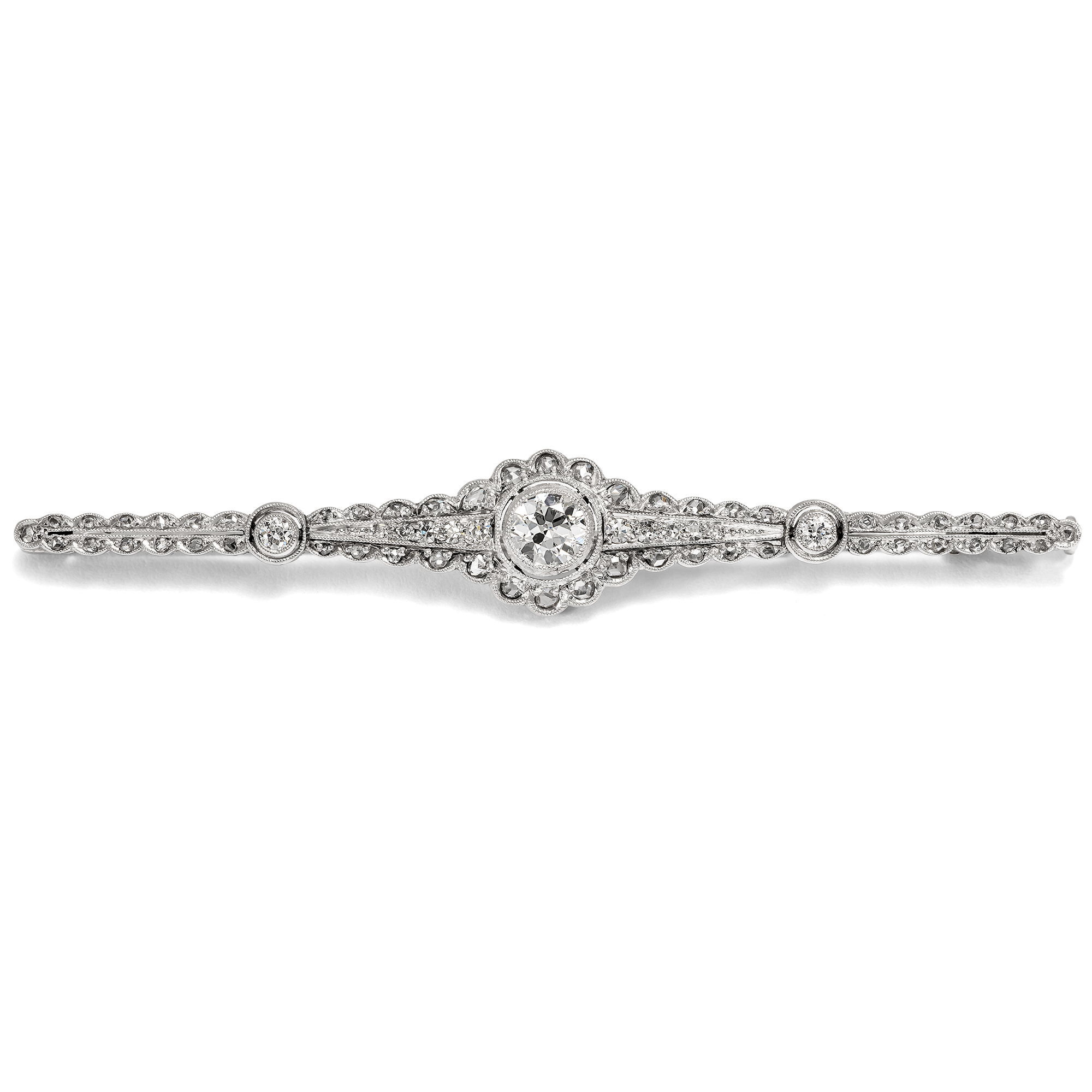 Es ist laut, schnell und wild: Der Verkehr rauscht über den Potsdamer Platz im langsam verglimmenden Abendlicht. Die Verkehrsampel in der Mitte des Platzes, die erste Ampel Deutschlands! - springt auf rot - die wartenden Menschen strömen über die Straßen, vorbei an den wartenden Automobilen, lachen, rennen, drängeln und füllen die vielen großen Lokale ringsumher. Die Leuchtreklamen an den Häusern beginen zu glühen, von fern erklingt eine Jazzkapelle: Das Berlin der Weimarer Republik war eine Weltstadt, für einen kurzen Moment ein Schmelztiegel der Kulturen, ein New York Europas. Aus diesem Umfeld stammt die hier vorliegende Brosche. Die gestreckte Stabnadel besteht aus Weißgold. Mittig weitet sich die Brosche zu einem mandelförmigen, länglichen Zierelement. Hier leuchten drei weiße Altschliff-Diamanten, die von umlaufenden Schattenfugen optisch noch vergrößert werden. Kleine Achtkant-Diamanten, Diamantrosen und funkelnde Millegriffes setzen zusätzliche Glanzpunkte. Die Herstellermarke „XX“ weist das Schmuckstück dem Sortiment der Berliner Juwelenmanufaktur Wilhelm Müller zu, die ihren Hauptsitz in der Gertraudenstraße in Berlin-Mitte hatte. In der lebendigen Stadt Berlin reagierten Gestalter wie Müller mit ihren qualitätvollen und zeittypischen Entwürfen auf die schnell wechselnden Modetrends der jeunesse dorée und ermöglichten immer neue aufregende Gestaltungen.
