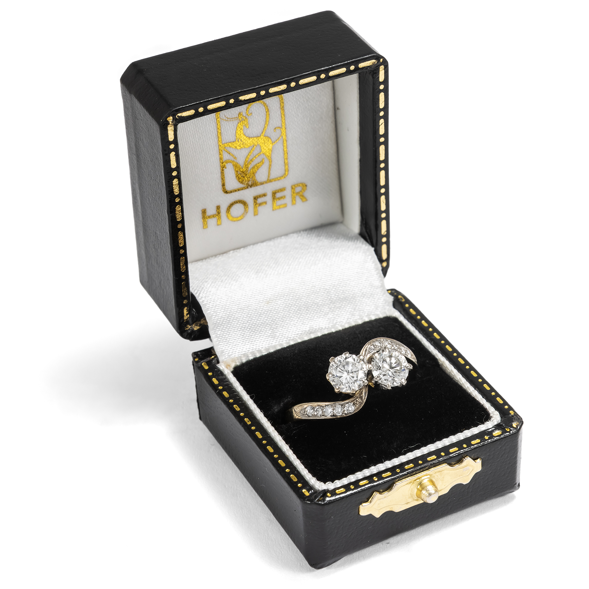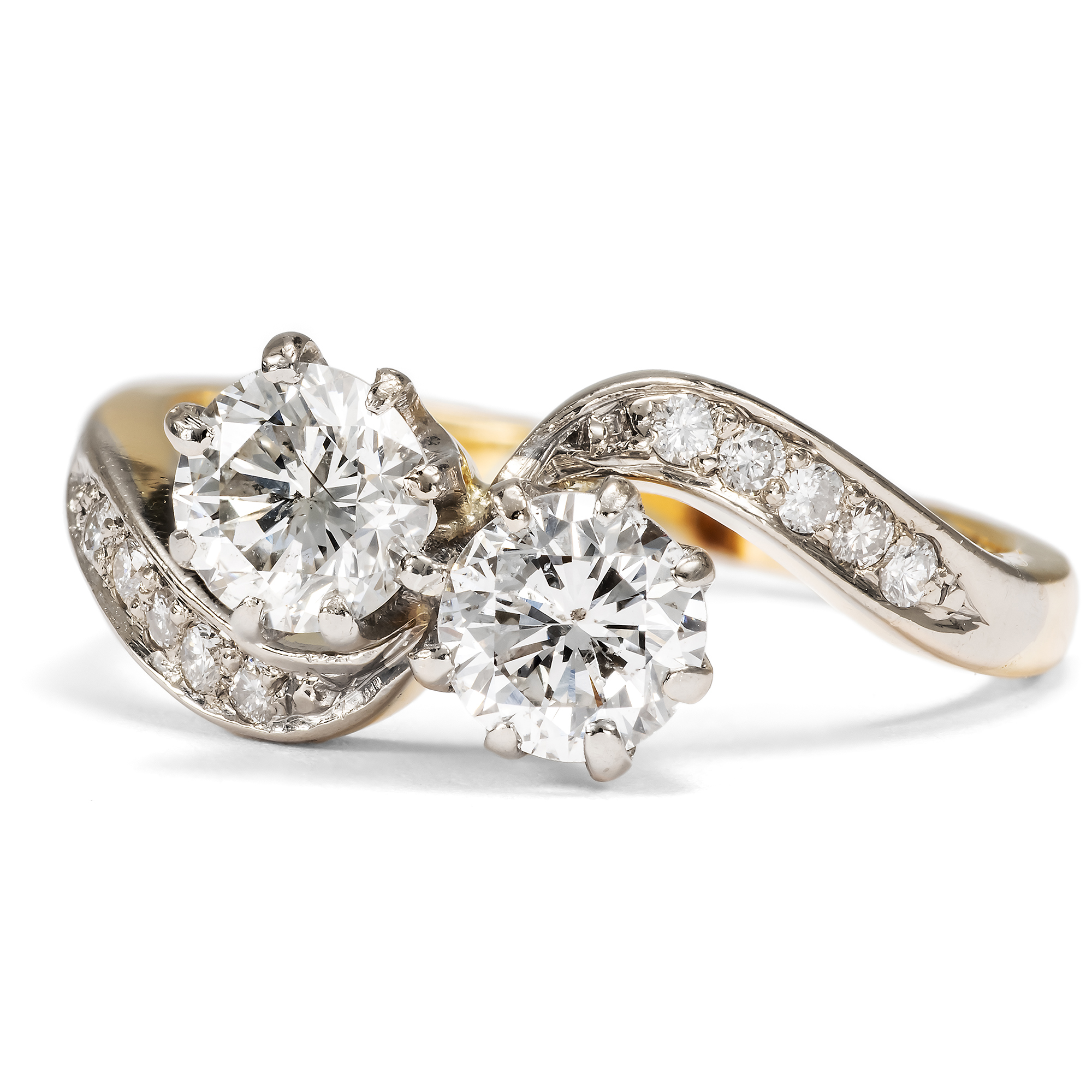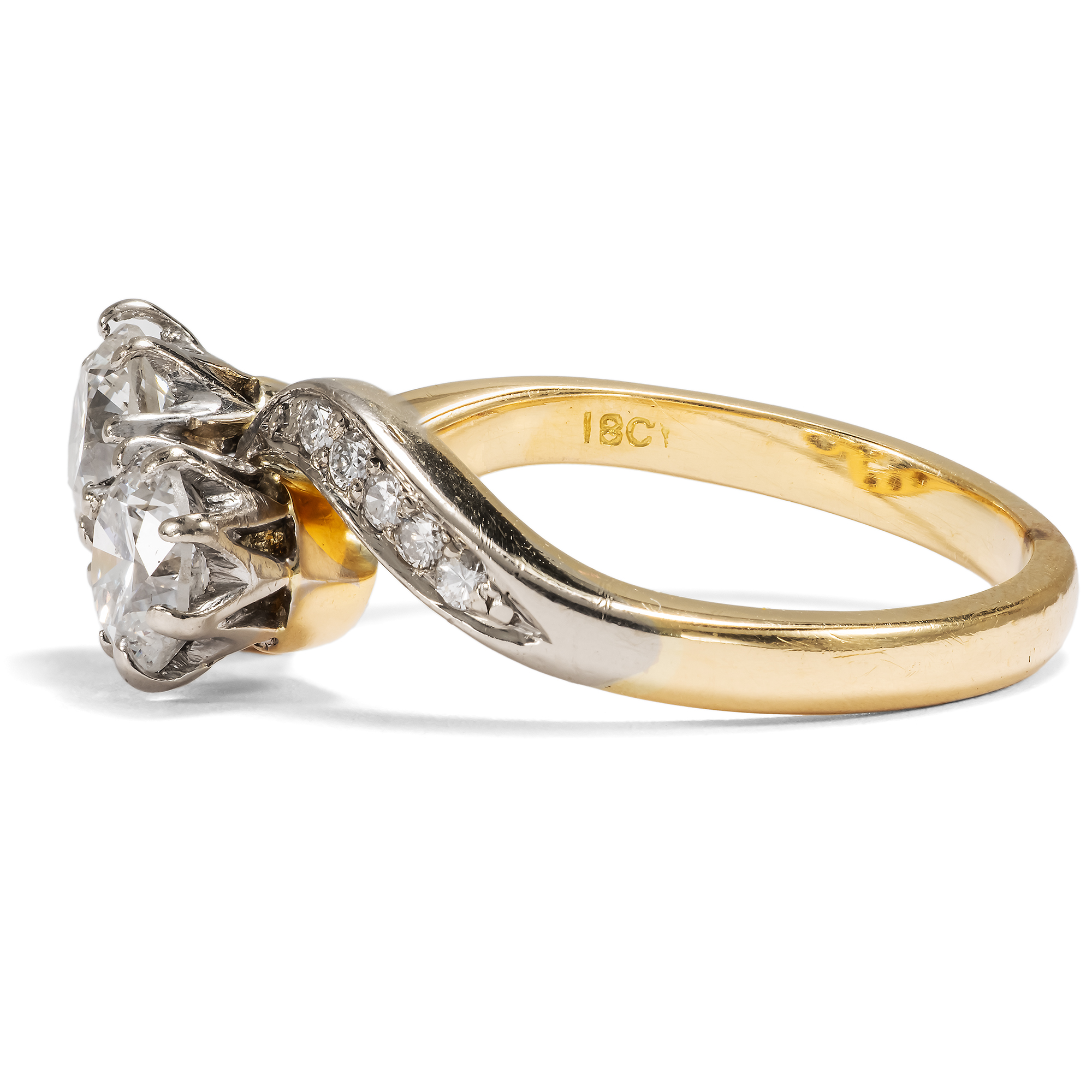 „Eins und eins, das macht zwei, Ein Herz ist immer dabei, Und wenn du Glück hast, dann sind es zwei.“ Fast meint man, der vorliegende Ring aus den Jahren um 1960 sei von diesen Zeilen aus Hildegard Knefs berühmten Chanson inspiriert. In eleganter Gegenüberstellung präsentiert der Ring zwei große, funkelnde Brillanten mit einem Gesamtgewicht von etwa 1,08 Karat. Zwei Schwünge, ebenfalls mit je drei kleineren Diamanten besetzt, halten die wunderbar glitzernden Edelsteine, die wie in einem bewegten Pas de Deux für die Ewigkeit vereint sind. Der Ring ist aus hochkarätigem Gelbgold gefertigt. Ringkopf und Steinfassungen sind mit Weißgold belegt. Dessen kühle Farbe in Kombination mit den weißen Diamanten verleiht dem Stück ein festliches Aussehen. Der Ring ist ein typisches Schmuckstück der Nachkriegszeit. Auch wenn seine Gestaltung auf Vorbilder der Jahre um 1900 zurückgeht, so ist doch der Schliff der Steine charakteristisch für Schmuck der 1950er und 1960er Jahre. Die Verarbeitung des Rings, die hochwertigen Materialien und seine romantische Symbolik schaffen ein wunderbares Schmuckstück, das vermutlich als Verlobungsring entworfen wurde und als solches auch heute noch wunderbar geeignet ist. Zu uns fand der wohlerhaltene Ring aus England, wo er laut Stempelung auch gefertigt wurde.