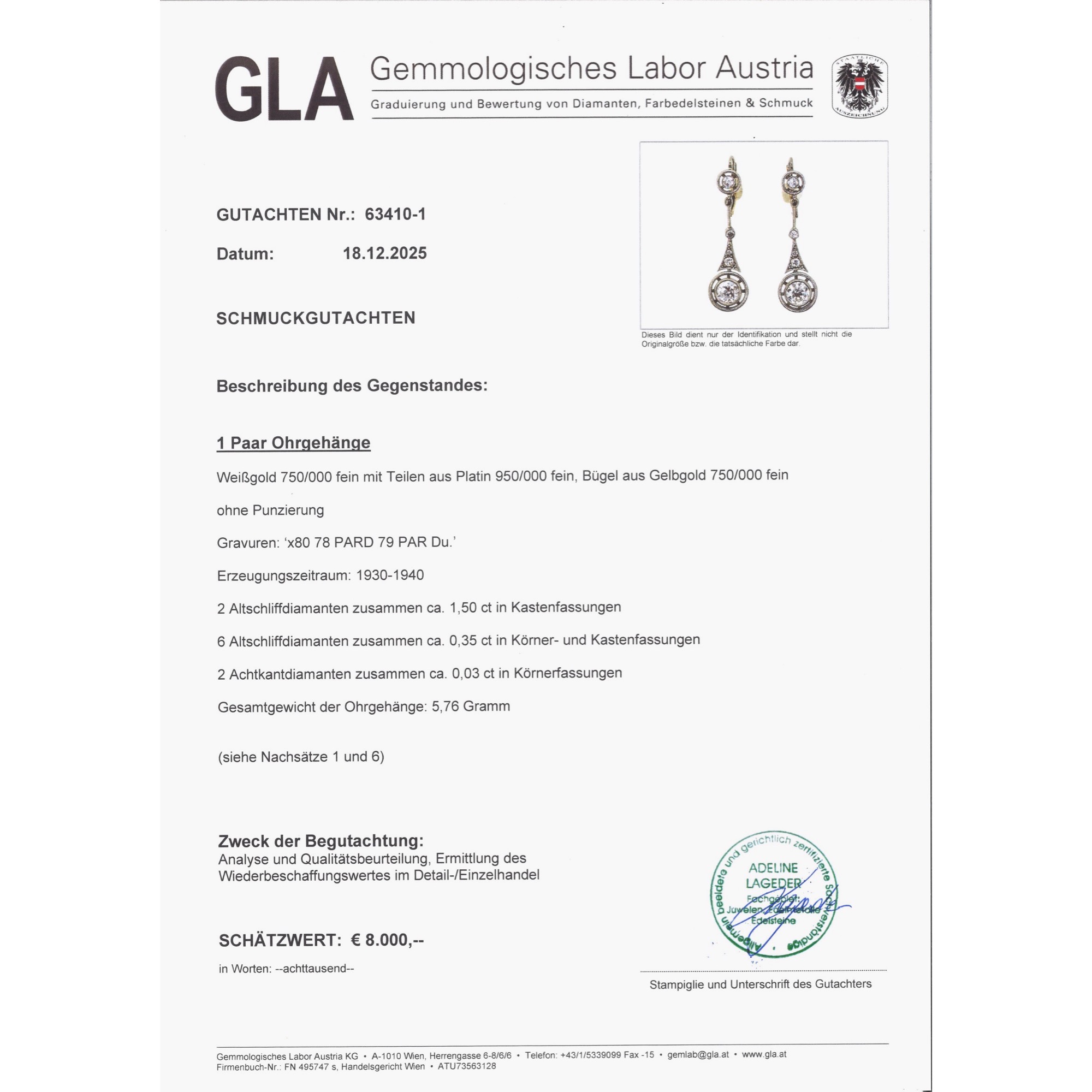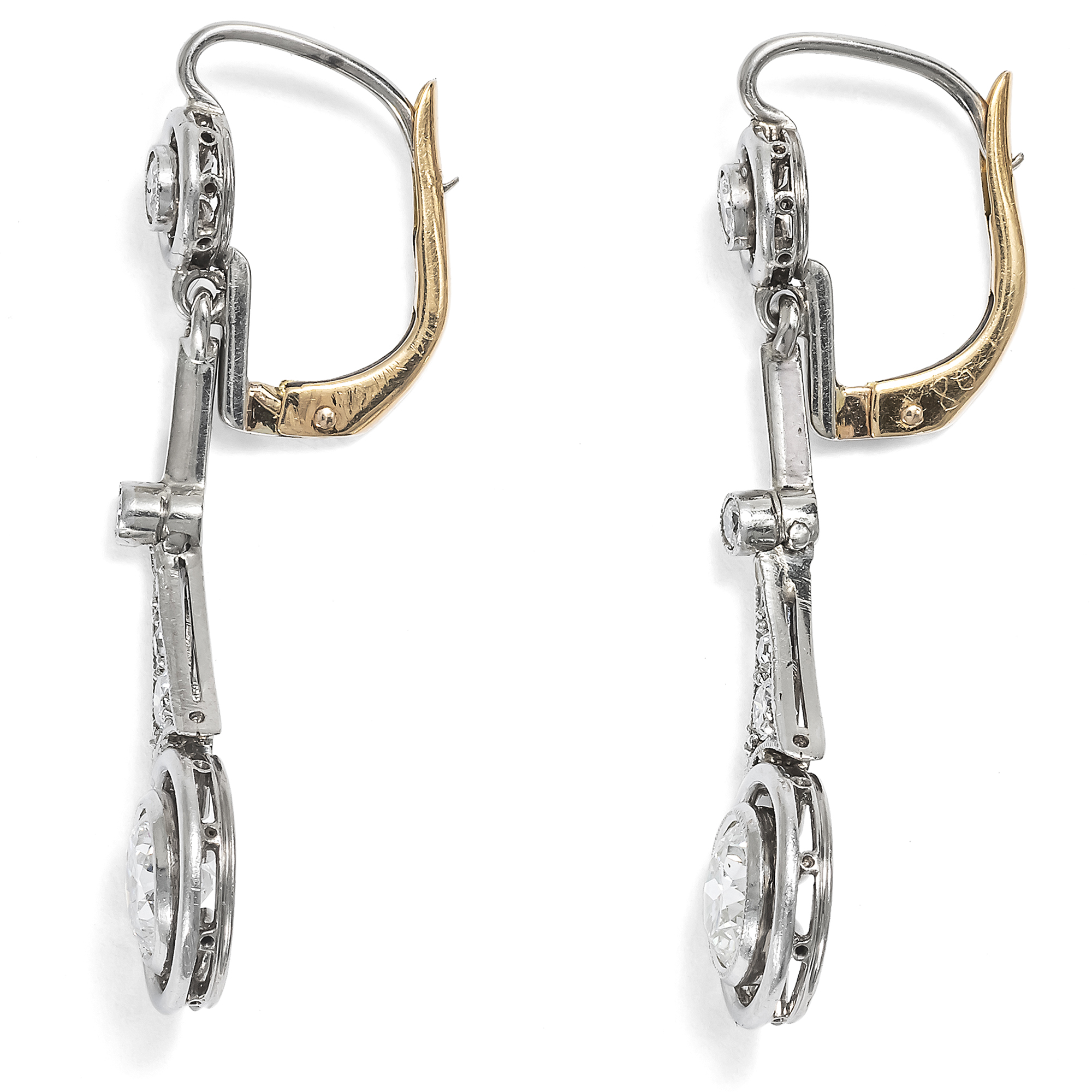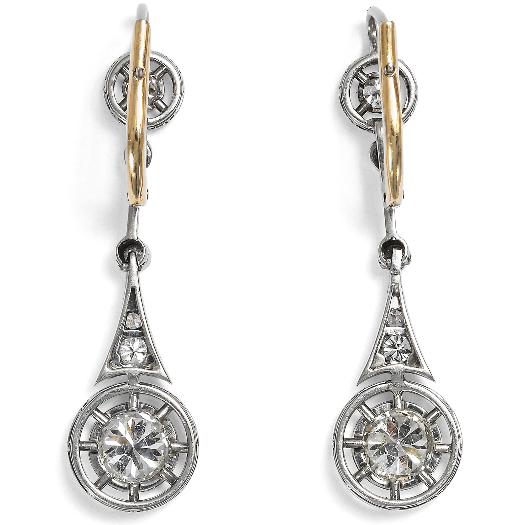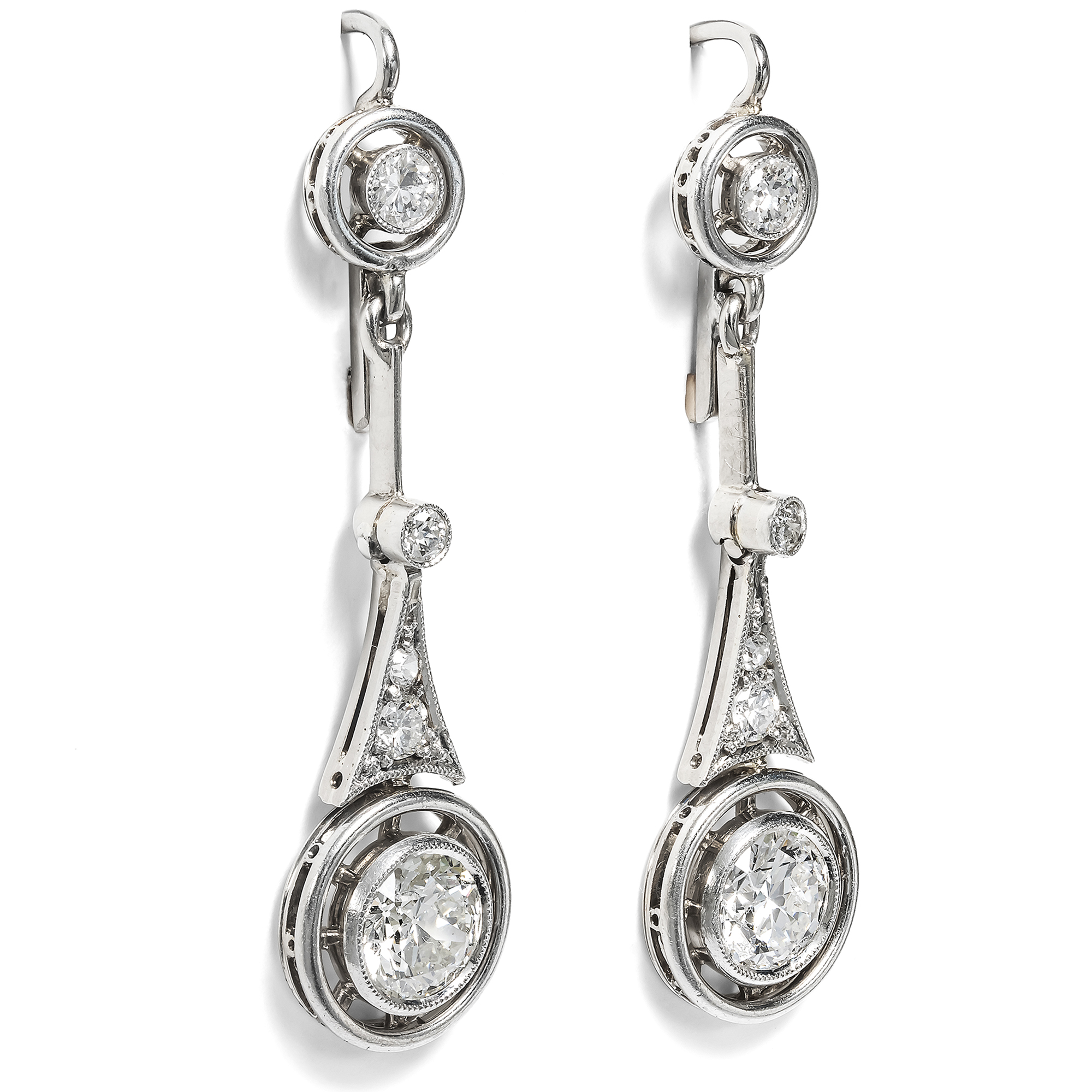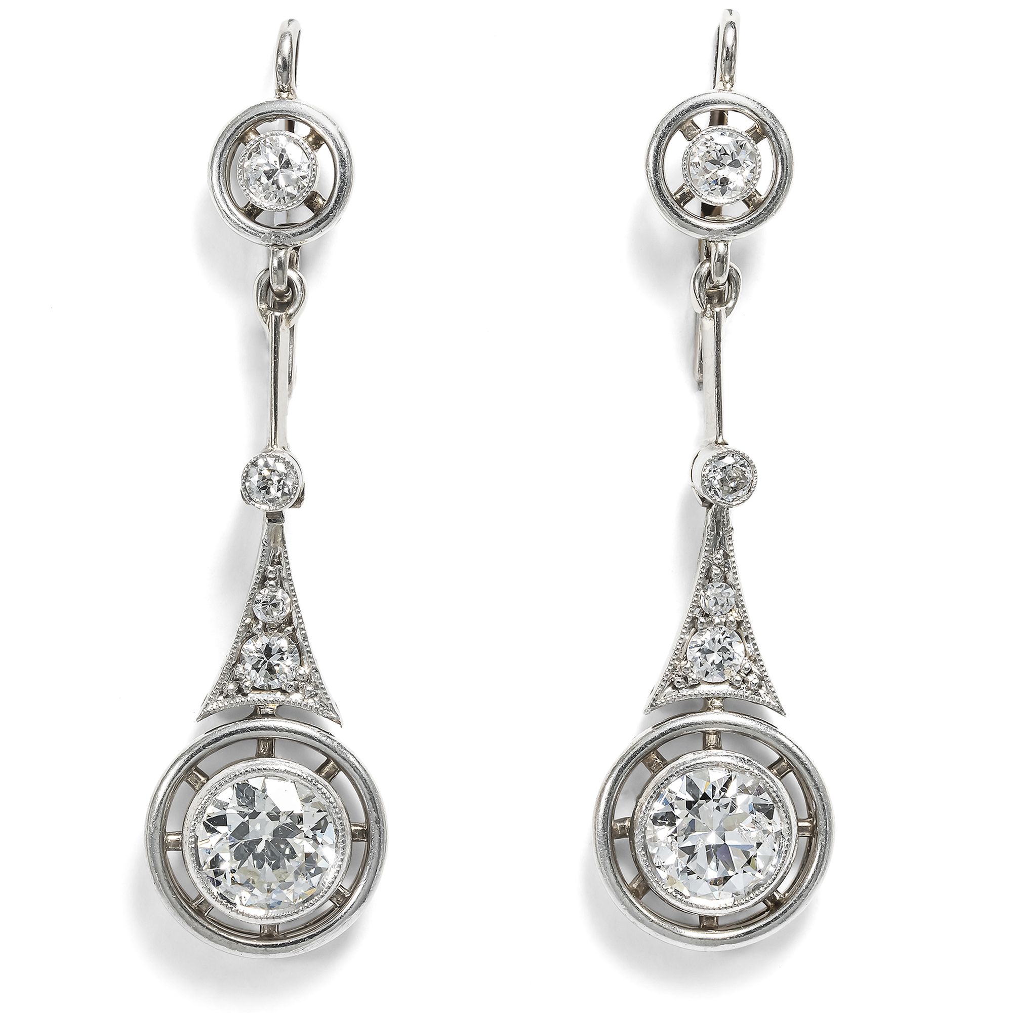 Kühle Eleganz – dies scheint das Schlagwort der Schmuckentwerfer des Art Déco gewesen zu sein, wirft man einen Blick in die Kataloge und Modemagazine jener Zeit. Kühl und kristallin, im weißen Licht von Platin und Diamanten glänzend, dabei oft in geometrisch gelängter Form, die an Eiszapfen erinnert: So kennt man die Anhänger, Ringe und auch Ohrringe der Epoche. Insbesondere Ohrringe in dieser gelängten Tropfenform sind charakteristisch für jene Zeit, akzentuierten sie doch die rebellisch kurz geschnittenen Haare der modernen Frau, den Bubikopf. 1926 berichtete das Modemagazin „Die Dame“, es gebe zwei Arten des Bubikopfes, einen sehr kantigen und einen weicheren, ondulierten: „Der neue Schmuck unterstützt in wirksamer Weise beide Bestrebungen. Elegante Frauen lieben es augenblicklich sehr, lange Ohrringe zu tragen, aber nur für den Abend, denn am Tage sind sie ja unpraktisch.“ (Die Dame – Ein deutsches Journal für den verwöhnten Geschmack, September 1926.) Aus Platin, Weiß-und Gelbgold gefertigt und mit insgesamt 1,88 Karat Diamanten besetzt, sind die hier vorliegenden Ohrringe ein luxuriöses Beispiel für diese Mode. Jedes Element der dreiteiligen Ohrringe ist beweglich angebracht, sodass sie bei Bewegung pendeln und die Facetten der Diamanten das Licht wirksam einfangen können. Dezente graphische Schattenfugen und die symmetrische Auffassung der Form lassen das Paar den Zeitgeist des Art Déco atmen. Den Höhepunkt der Komposition bilden zwei wundervolle Altschliffdiamanten von jeweils einem Dreiviertelkarat. Die Ohrringe sind sehr gut erhalten und hervorragend tragbar. Wir haben sie hier in Berlin entdecken können. Ein unabhängiges Gutachten liegt dem luxuriösen Paar bei.