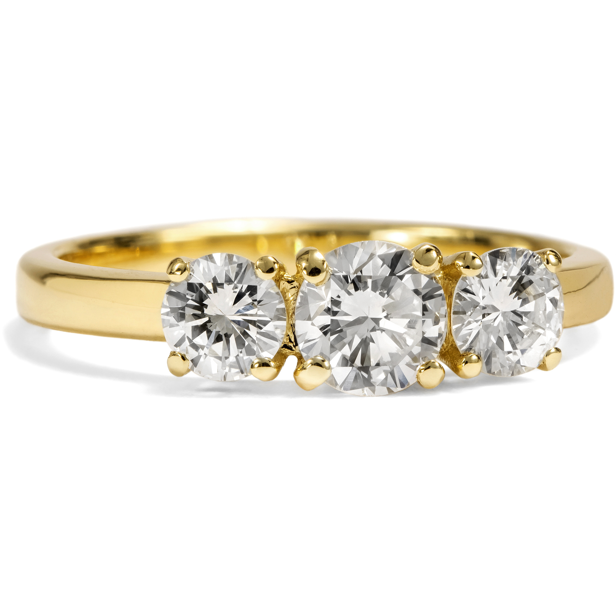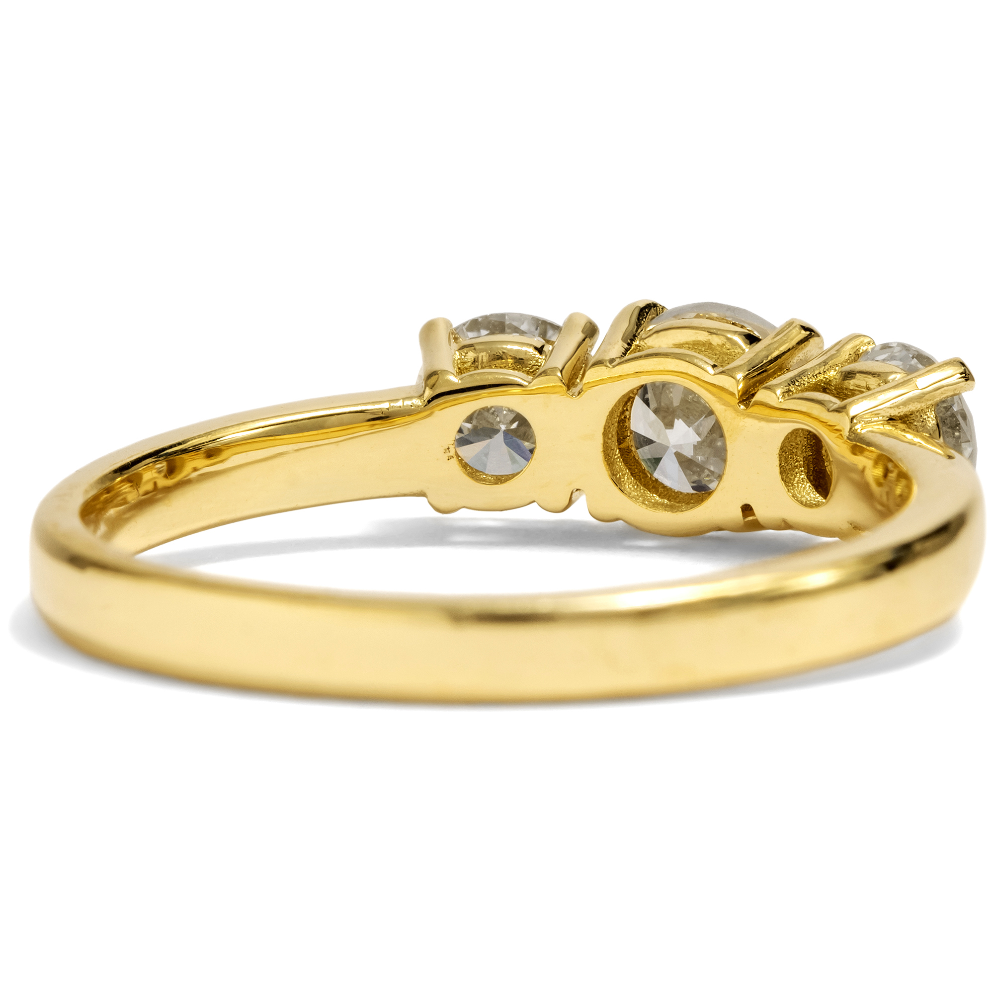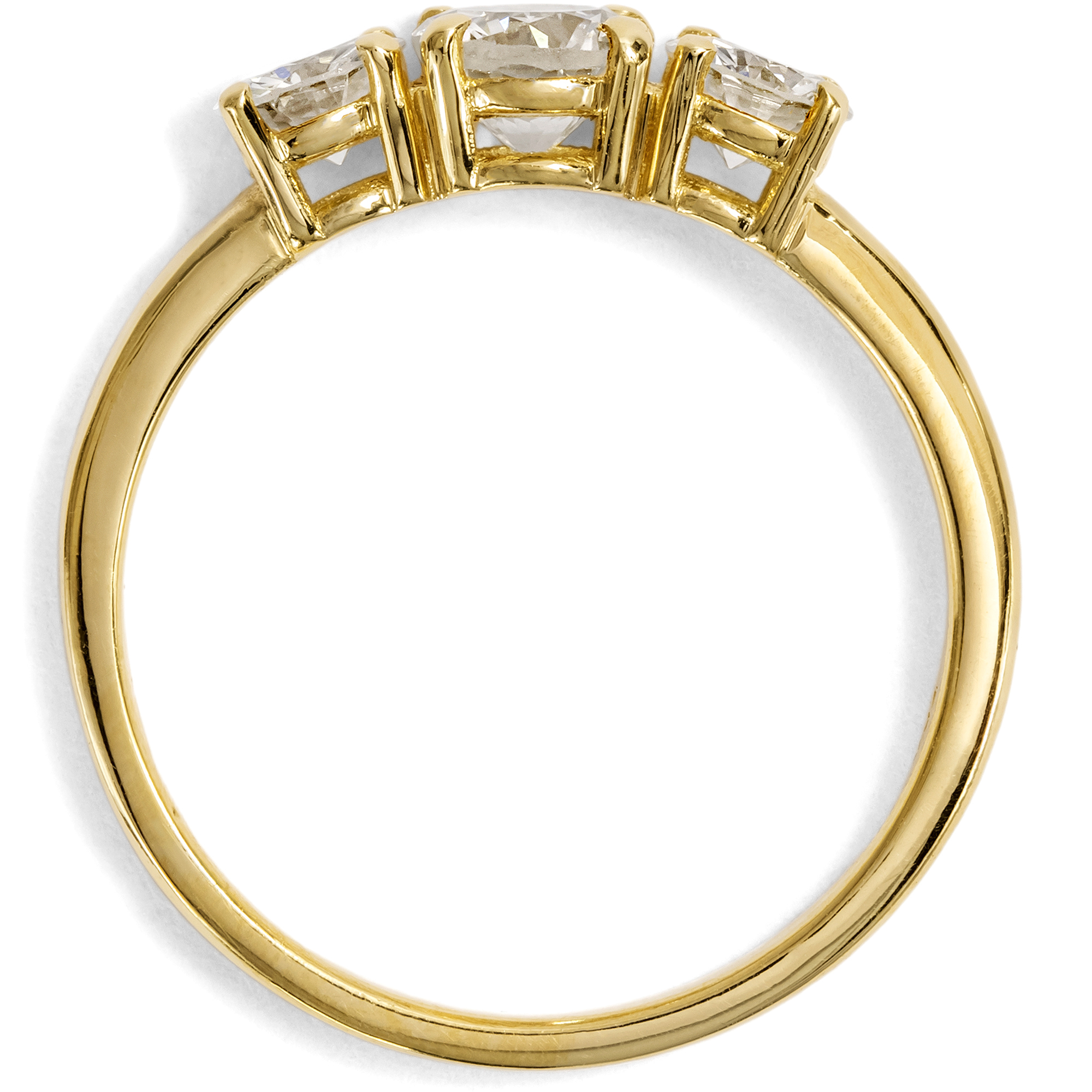 Ungetragener „Trilogie“-Ring mit 0,93 ct vintage Brillanten in Gelbgold, aus unserer Werkstatt
