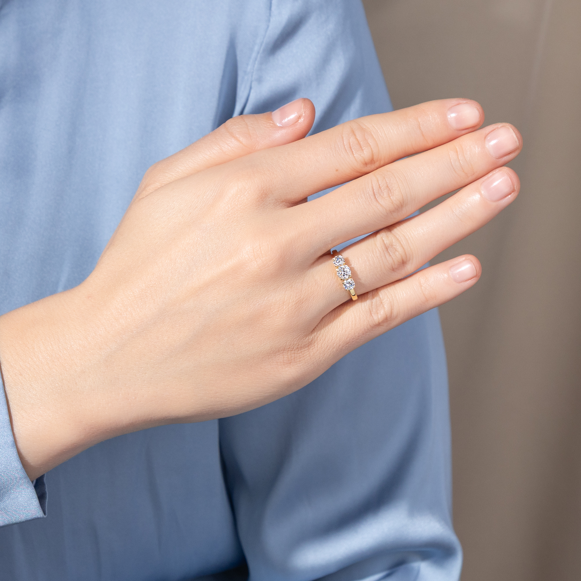 „Tradition ist nicht die Anbetung der Asche, sondern die Weitergabe des Feuers.“ Dieses Zitat wird dem Sinfoniker Gustav Mahler (1860–1911) zugeschrieben. Auf den vorliegenden modernen Ring trifft dieser Satz besonders zu, folgt seine romantische Symbolik doch einer jahrhundertealten Tradition. Der Ring ist auf unseren Auftrag hin entstanden und ein schönes Beispiel für das Fortbestehen eines klassischen Typus, der zugleich seine Entstehungszeit nicht verleugnet. Die zurückhaltende, moderne Ringschiene aus hochkarätigem Gelbgold trägt drei funkelnde Brillanten mit einem Gesamtgewicht von 0,93 Karat, wobei ein größerer Mittelstein von zwei kleineren Brillanten flankiert wird. Alle Steine leuchten strahlend weiß. Alle drei Diamanten sind Vintage-Diamanten der 1970er Jahre, die zuvor in eine Brosche eingefasst waren. Die Entwurfsidee des Rings ist aus der Tradition der Trilogie-Ringe entwickelt, die inhaltlich aufgeladen sind: So soll die Zahl der Edelsteine in diesen Stücken für die gemeinsam gelebte Vergangenheit, Gegenwart und gemeinsame Zukunft stehen. Die Diamanten, als der Sage nach unzerstörbare und somit ewig beständige Edelsteine, stehen dabei als Versprechen der Ewigkeit. Durch seine Form, aber auch seine inhaltliche Bedeutung, kann unser Ring daher ein perfekter Verlobungsring oder ein Liebesgeschenk werden.