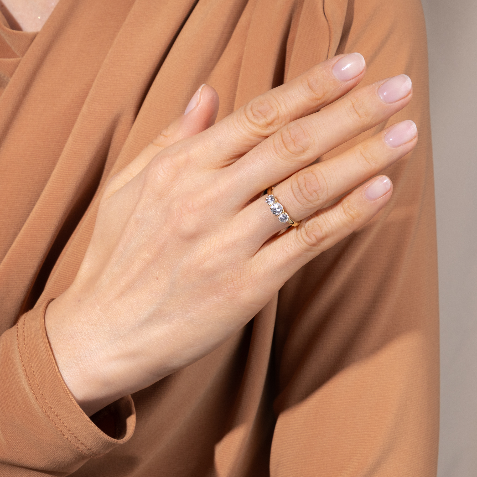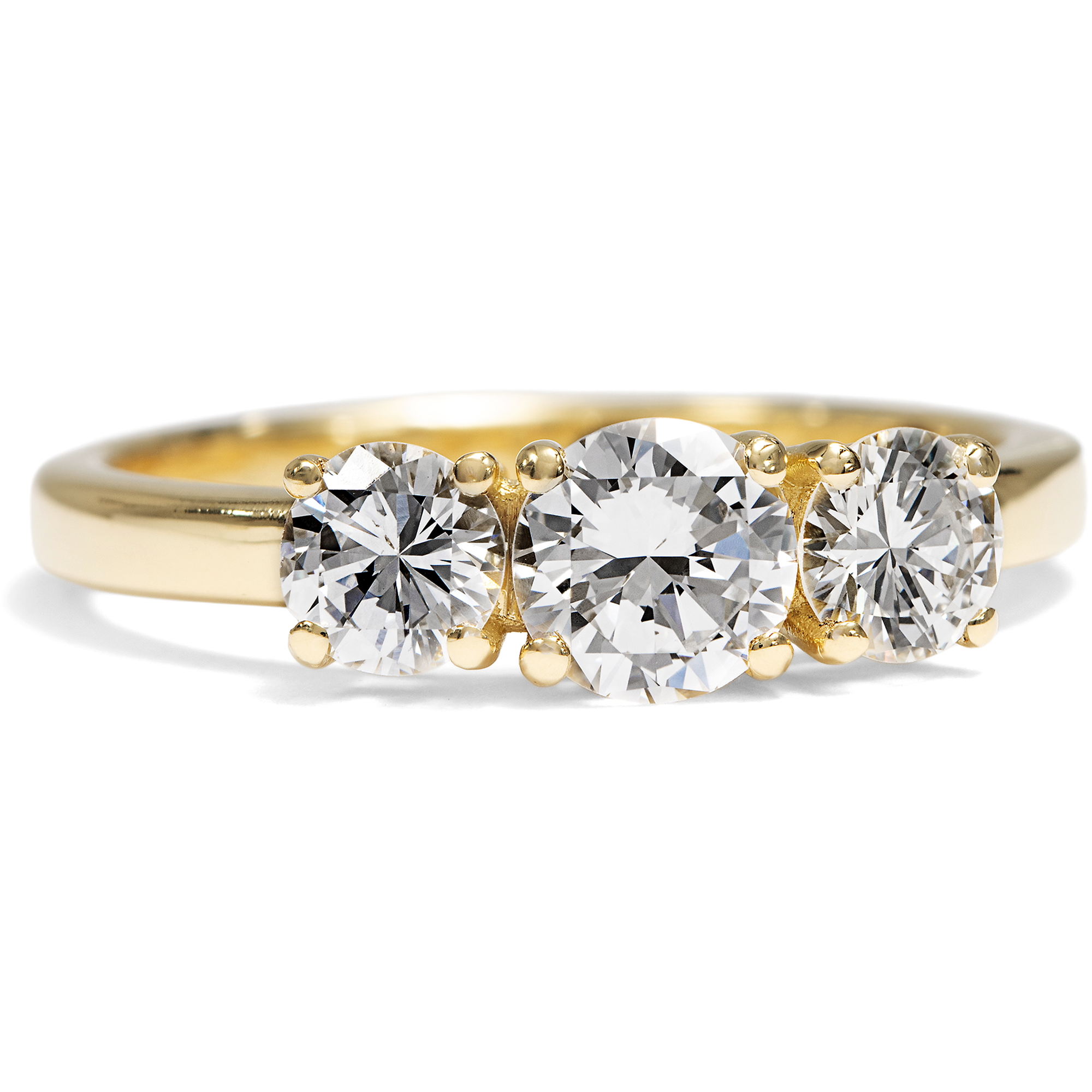 „Tradition ist nicht die Anbetung der Asche, sondern die Weitergabe des Feuers.“ Dieses Zitat wird dem Sinfoniker Gustav Mahler (1860–1911) zugeschrieben. Auf den vorliegenden modernen Ring trifft dieser Satz besonders zu, folgt seine romantische Symbolik doch einer jahrhundertealten Tradition. Der Ring ist auf unseren Auftrag hin entstanden und ein schönes Beispiel für das Fortbestehen eines klassischen Typus, der zugleich seine Entstehungszeit nicht verleugnet. Die zurückhaltende, moderne Ringschiene aus hochkarätigem Gelbgold trägt drei funkelnde Brillanten mit einem Gesamtgewicht von 0,99 Karat, wobei ein größerer Mittelstein (0,45 ct) von zwei kleineren Brillanten flankiert wird. Die Steine haben eine sehr gute Brillanz. Sie sind sehr rein (vsi) und Weiß bis leicht warm getönt, was gut zum warmen Goldton der Fassung passt. Das Besondere an diesem Ring ist, dass alle drei Diamanten Vintage-Diamanten sind. Sie kamen als Teil von Schmuckstücken der 1960er und 1970er Jahre zu uns, die sich leider nicht mehr reparieren ließen. Die Diamanten aber waren perfekt erhalten und so haben wir uns entschlossen, sie in diesem, von unseren Goldschmieden neu angefertigten Ring zu fassen. Die Entwurfsidee des Rings ist aus der Tradition der Trilogie-Ringe entwickelt, die inhaltlich aufgeladen sind: So soll die Zahl der Edelsteine in diesen Stücken für die gemeinsam gelebte Vergangenheit, Gegenwart und gemeinsame Zukunft stehen. Die Diamanten, als der Sage nach unzerstörbare und somit ewig beständige Edelsteine, stehen dabei als Versprechen der Ewigkeit. Durch seine Form, aber auch seine inhaltliche Bedeutung, kann unser Ring daher ein perfekter Verlobungsring oder ein Liebesgeschenk werden.