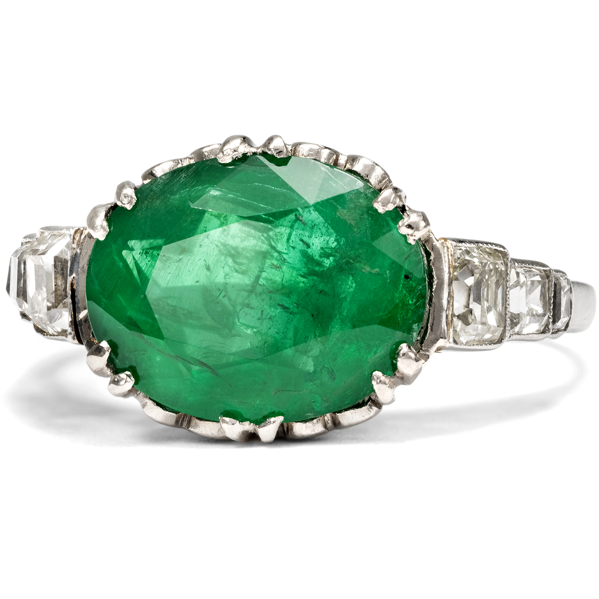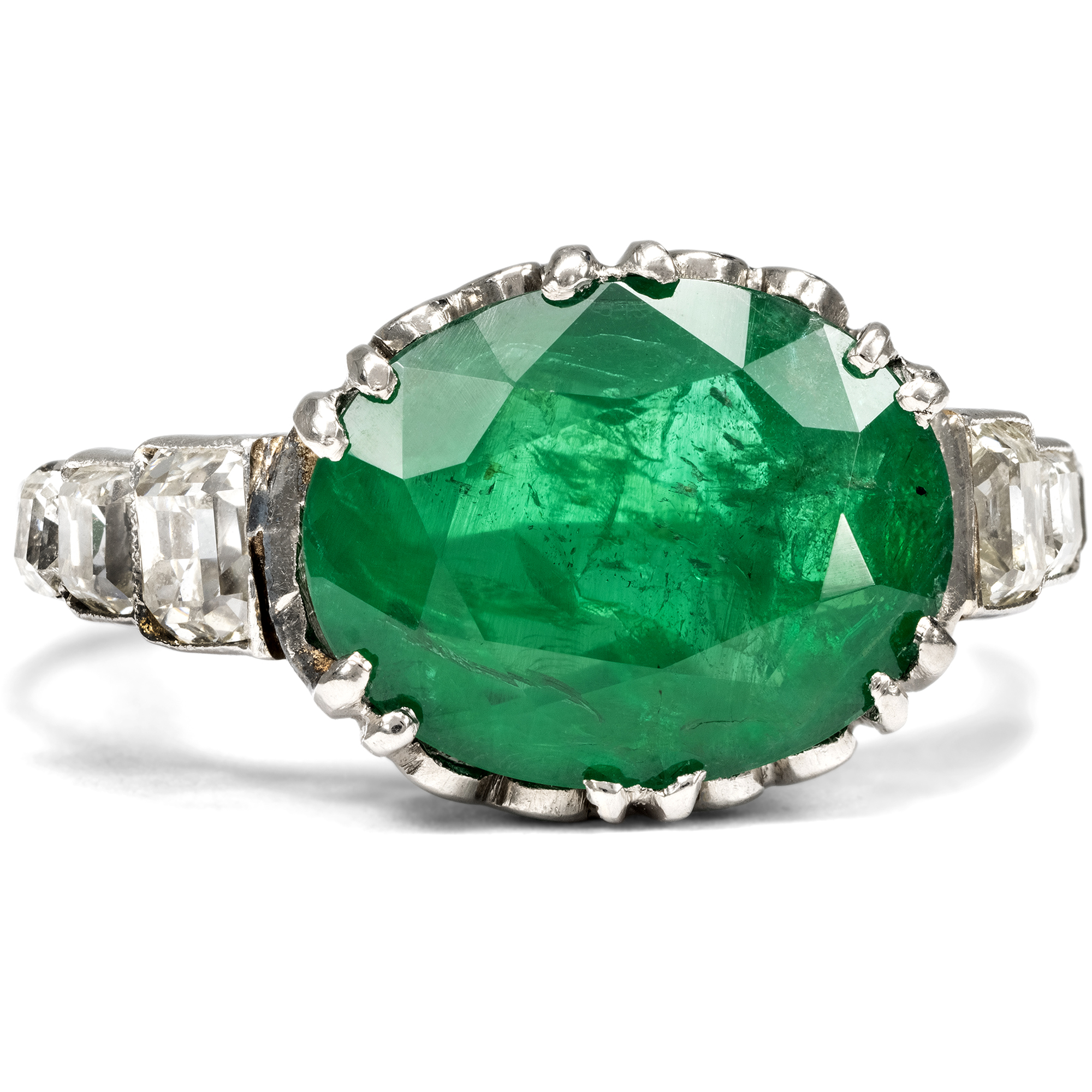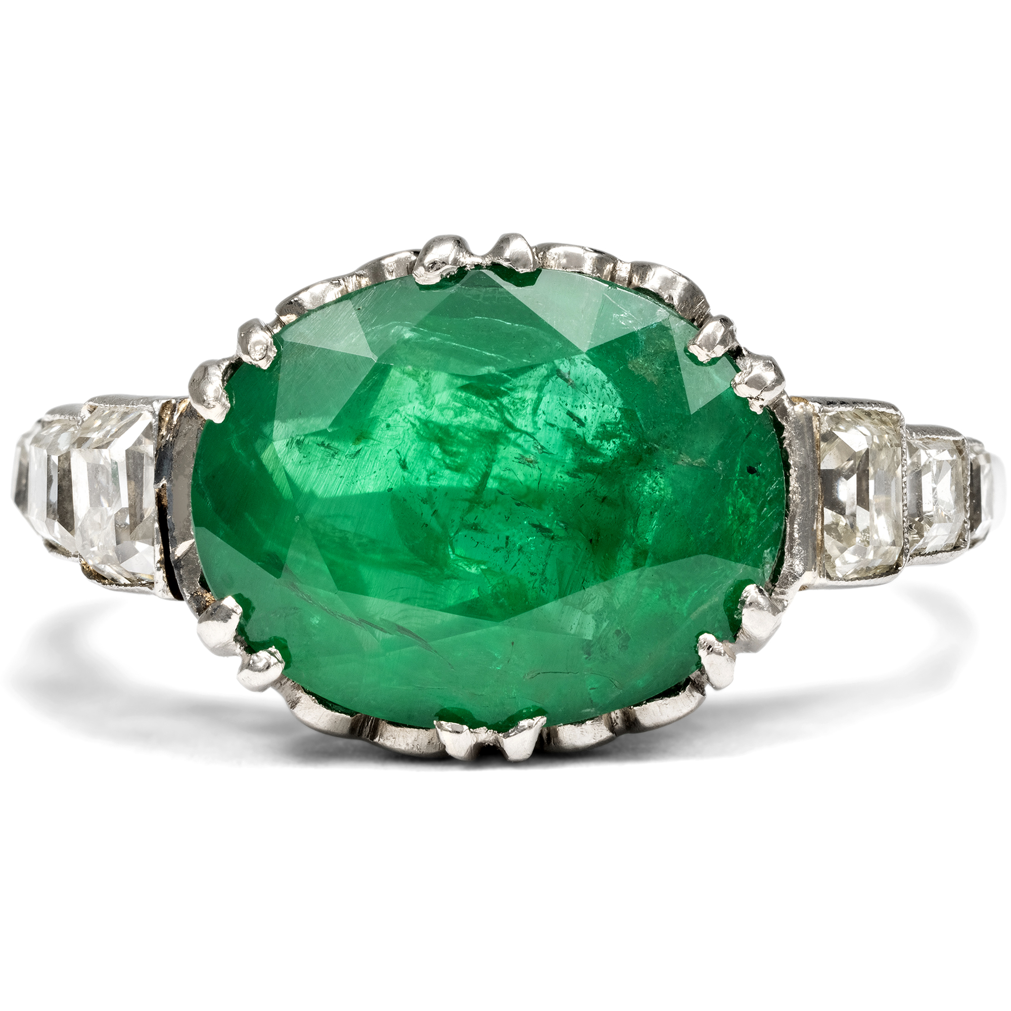 Immer wieder lässt sich beobachten, dass Schmuckstücke im Laufe ihres Lebens Veränderungen erfahren. Persönlicher Geschmack, wechselnde Moden oder auch praktische Gründe wie beschädigte oder verlorene Edelsteine führen dazu, dass Stücke umgearbeitet werden. Auch veränderte Bedürfnisse ihrer Träger und Trägerinnen spielen dabei eine Rolle. Umso genauer gilt es hinzusehen, wenn man ein Schmuckstück datieren möchte, denn was auf den ersten Blick eindeutig erscheint, kann bei näherer Betrachtung neue Fragen aufwerfen. Ein solcher Fall liegt hier vor. Ein natürlicher, afrikanischer Smaragd bildet den Ausgangspunkt dieses Ringes, der aus Wien zu uns kam. In eine Fassung aus Platin und Weißgold eingesetzt, wird der große, oval facettierte grüne Edelstein von sechs antiken Diamanten begleitet. Sein charakteristisches Einschlussbild legt eine Herkunft aus Simbabwe nahe. Da Smaragde aus den berühmten Sandawana-Minen erst seit den späten 1950er Jahren im kommerziellen Handel sind, spricht vieles dafür, dass der Stein später in eine bereits bestehende Fassung eingesetzt wurde. Die Gestaltung des Ringes verweist stilistisch auf eine etwa eine Generation ältere Entstehungszeit. Noch weiter zurück reichen die Diamanten: Die leicht abgestuft gefassten Steine auf den Schultern des Ringes dürften bereits im 19. Jahrhundert geschliffen worden sein. Der Smaragd selbst zeigt feine Kristalleinschlüsse, die als natürliche Wachstumsmerkmale seine Echtheit belegen und in der Fachsprache als „jardin“ bezeichnet werden. Besonders hervorzuheben ist seine schöne Farbe. Ein von uns beauftragtes Gutachten bestätigt zudem, dass der Stein nur moderat geölt ist, aber ansonsten keine Behandlungen aufweist. So vereint dieses Schmuckstück Elemente verschiedener Epochen zu einem stimmigen Ganzen und berichtet zugleich von den Veränderungen, die es im Laufe seiner Geschichte erfahren hat.