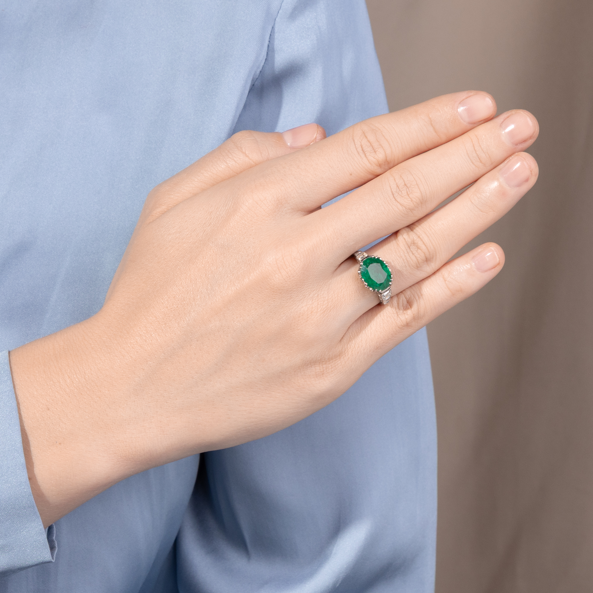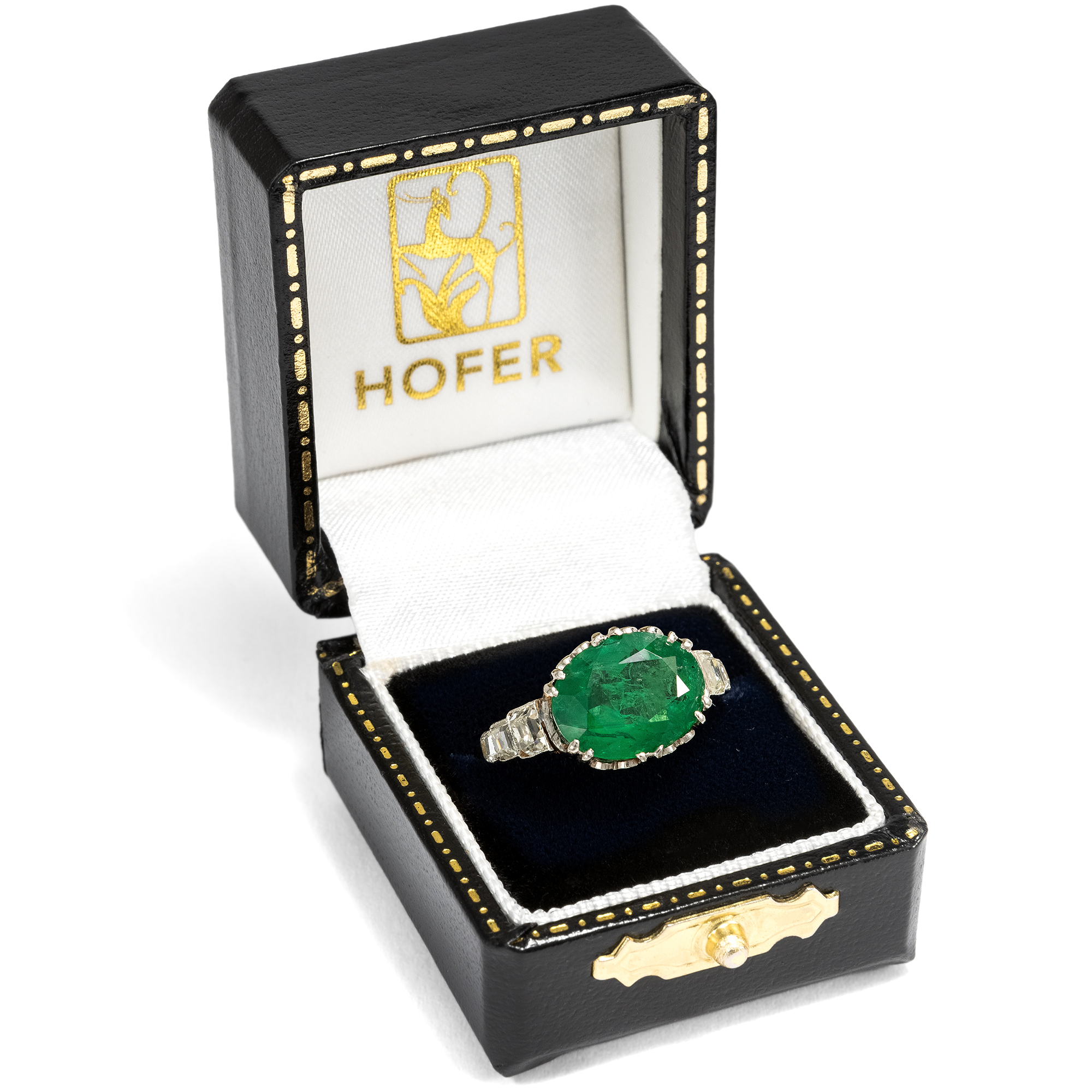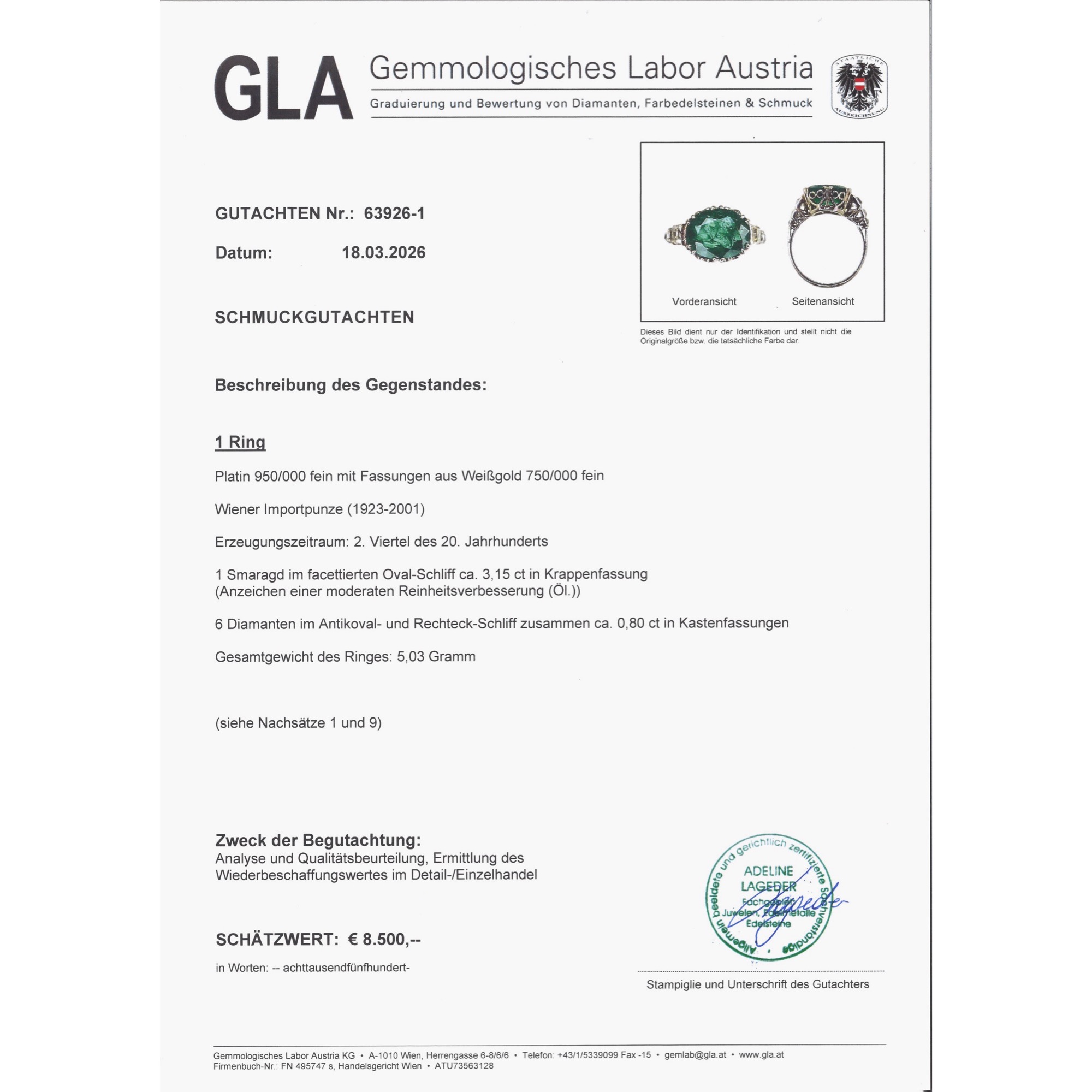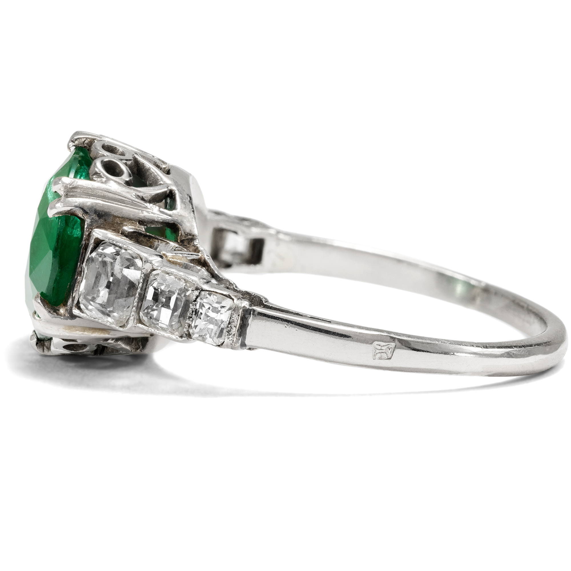 Immer wieder lässt sich beobachten, dass Schmuckstücke im Laufe ihres Lebens Veränderungen erfahren. Persönlicher Geschmack, wechselnde Moden oder auch praktische Gründe wie beschädigte oder verlorene Edelsteine führen dazu, dass Stücke umgearbeitet werden. Auch veränderte Bedürfnisse ihrer Träger und Trägerinnen spielen dabei eine Rolle. Umso genauer gilt es hinzusehen, wenn man ein Schmuckstück datieren möchte, denn was auf den ersten Blick eindeutig erscheint, kann bei näherer Betrachtung neue Fragen aufwerfen. Ein solcher Fall liegt hier vor. Ein natürlicher, afrikanischer Smaragd bildet den Ausgangspunkt dieses Ringes, der aus Wien zu uns kam. In eine Fassung aus Platin und Weißgold eingesetzt, wird der große, oval facettierte grüne Edelstein von sechs antiken Diamanten begleitet. Sein charakteristisches Einschlussbild legt eine Herkunft aus Simbabwe nahe. Da Smaragde aus den berühmten Sandawana-Minen erst seit den späten 1950er Jahren im kommerziellen Handel sind, spricht vieles dafür, dass der Stein später in eine bereits bestehende Fassung eingesetzt wurde. Die Gestaltung des Ringes verweist stilistisch auf eine etwa eine Generation ältere Entstehungszeit. Noch weiter zurück reichen die Diamanten: Die leicht abgestuft gefassten Steine auf den Schultern des Ringes dürften bereits im 19. Jahrhundert geschliffen worden sein. Der Smaragd selbst zeigt feine Kristalleinschlüsse, die als natürliche Wachstumsmerkmale seine Echtheit belegen und in der Fachsprache als „jardin“ bezeichnet werden. Besonders hervorzuheben ist seine schöne Farbe. Ein von uns beauftragtes Gutachten bestätigt zudem, dass der Stein nur moderat geölt ist, aber ansonsten keine Behandlungen aufweist. So vereint dieses Schmuckstück Elemente verschiedener Epochen zu einem stimmigen Ganzen und berichtet zugleich von den Veränderungen, die es im Laufe seiner Geschichte erfahren hat.