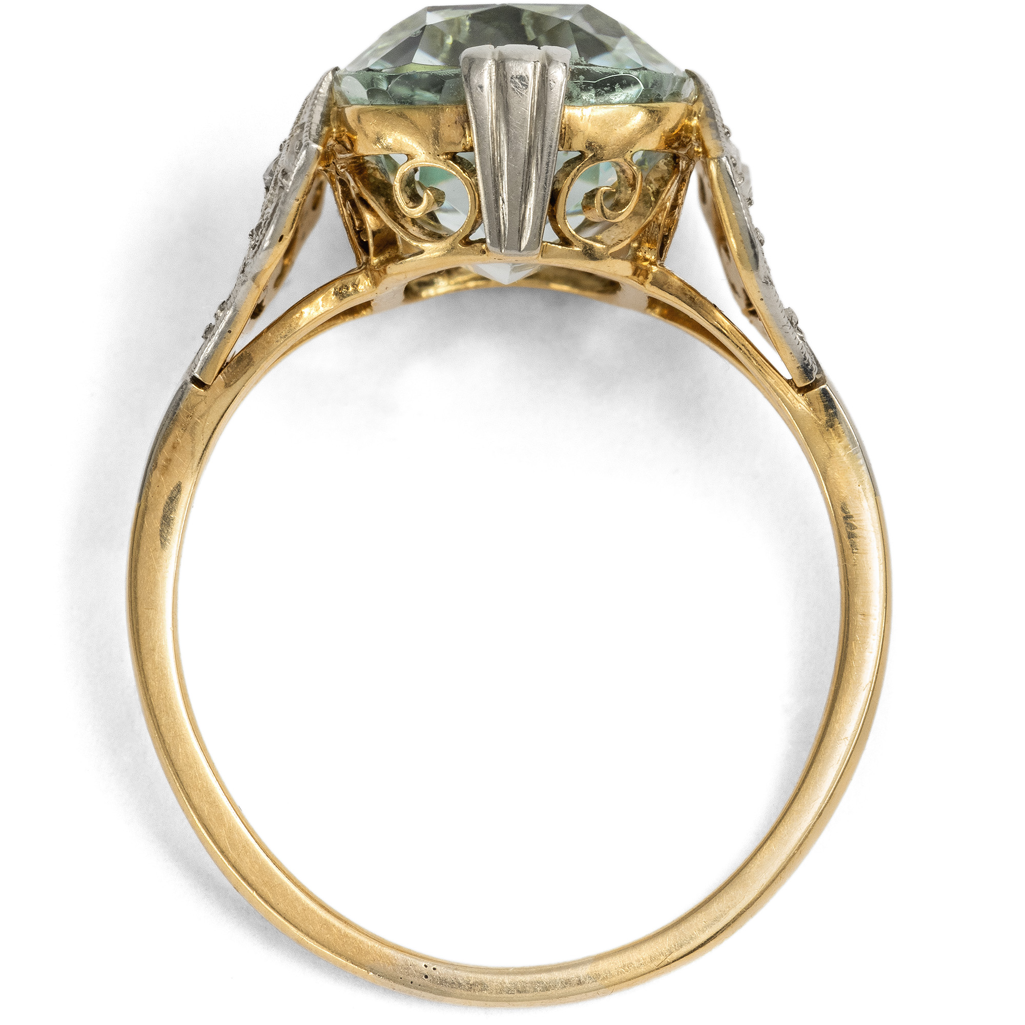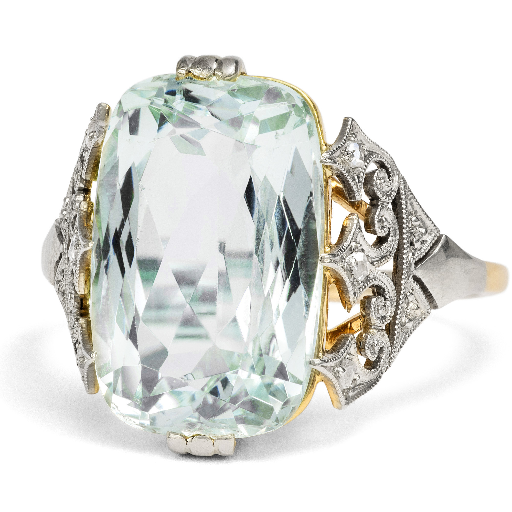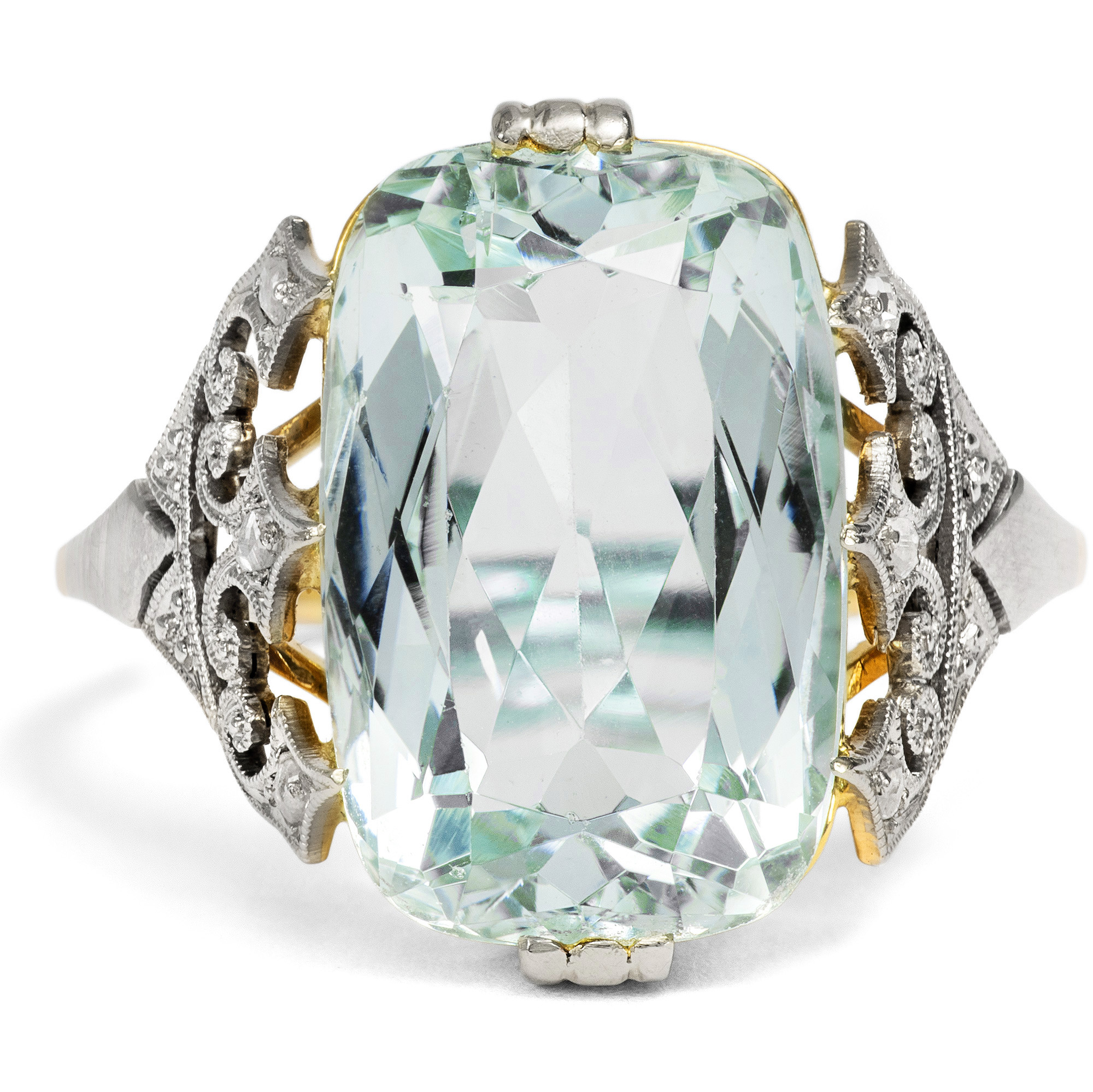 Der vorliegende Ring ist in seiner feinen Verarbeitung und kühl-eleganten Materialität ein typischer Ring des frühen 20. Jahrhunderts. Ungewöhnlich ist jedoch sein Ornament: Seine Fassung wird von diamantbesetzten Spitzen gebildet, die beinahe neogotisch anmuten und dem Ring etwas Märchenhaftes verleihen. Diese Spitzen sind ebenso wie die oberen und unteren Krappen des Aquamarins mit Platin belegt, sodass sich getragen eine einheitlich weiße Optik ergibt. Darunter, wie versteckt, liegt die ornamentale Galerie aus Gold – selbst diese wurde mit Liebe zum Detail gearbeitet. Im Zentrum des Ringes, gehalten von diesen Ornamenten, steht ein großer, etwa 6,72 ct schwerer Aquamarin. Der Edelstein hat eine blassblaue, eisige, leicht grünliche Farbe und eine wunderbare Brillanz. Nicht zuletzt diese Brillanz war es, die dem Aquamarin im Zeitalter der Elektrizität zu seiner großen Beliebtheit verhalf – verliert dieser Edelstein doch auch abends im Kunstlicht nichts von seiner Wirkung. Der Scherenschliff entlockt dem Stein bei jeder Bewegung wasserähnliche Lichtreflexe. Der schöne Ring ist sehr gut erhalten. Ein elegantes Schmuckstück, das den Blick wieder und wieder auf seine feinen Details lenkt.