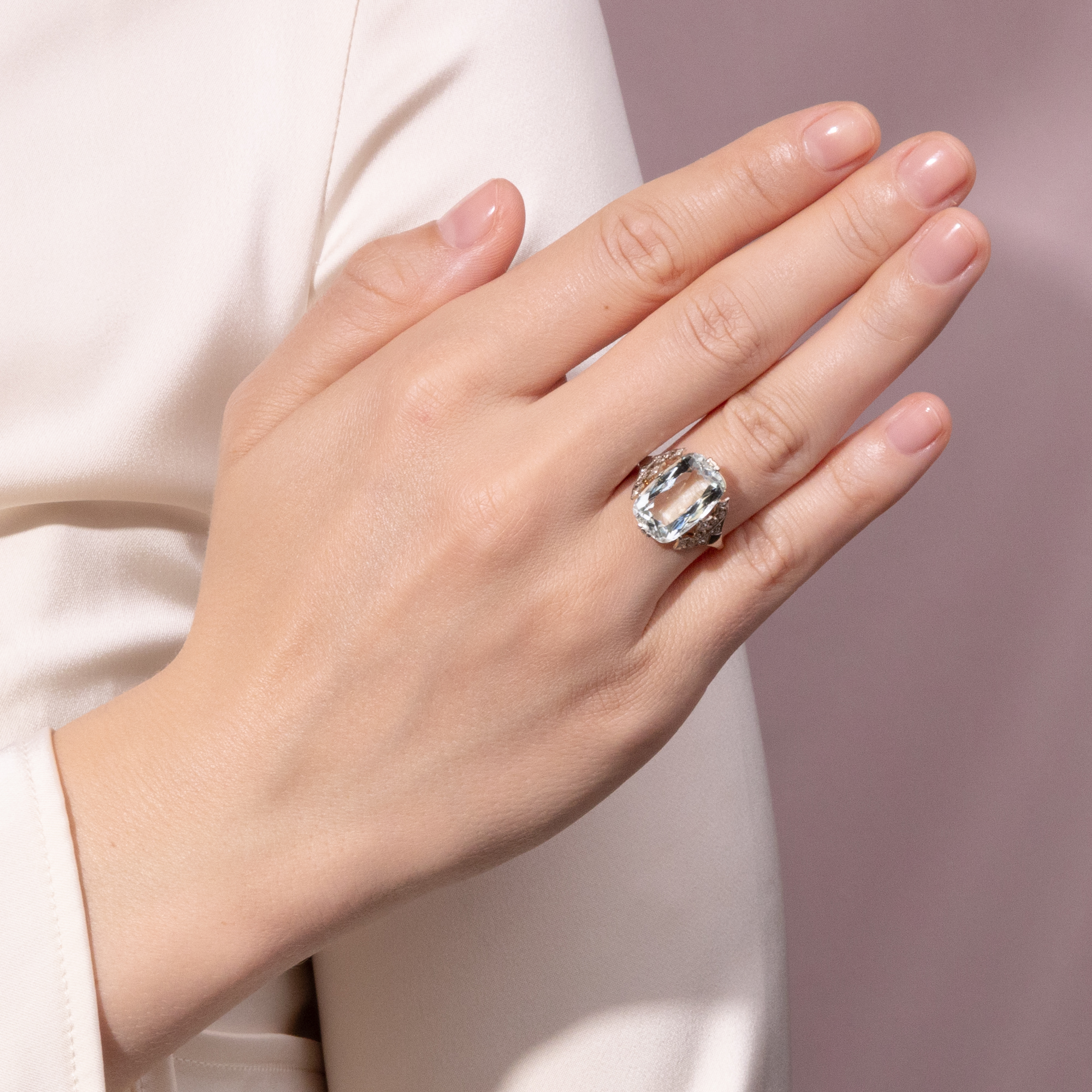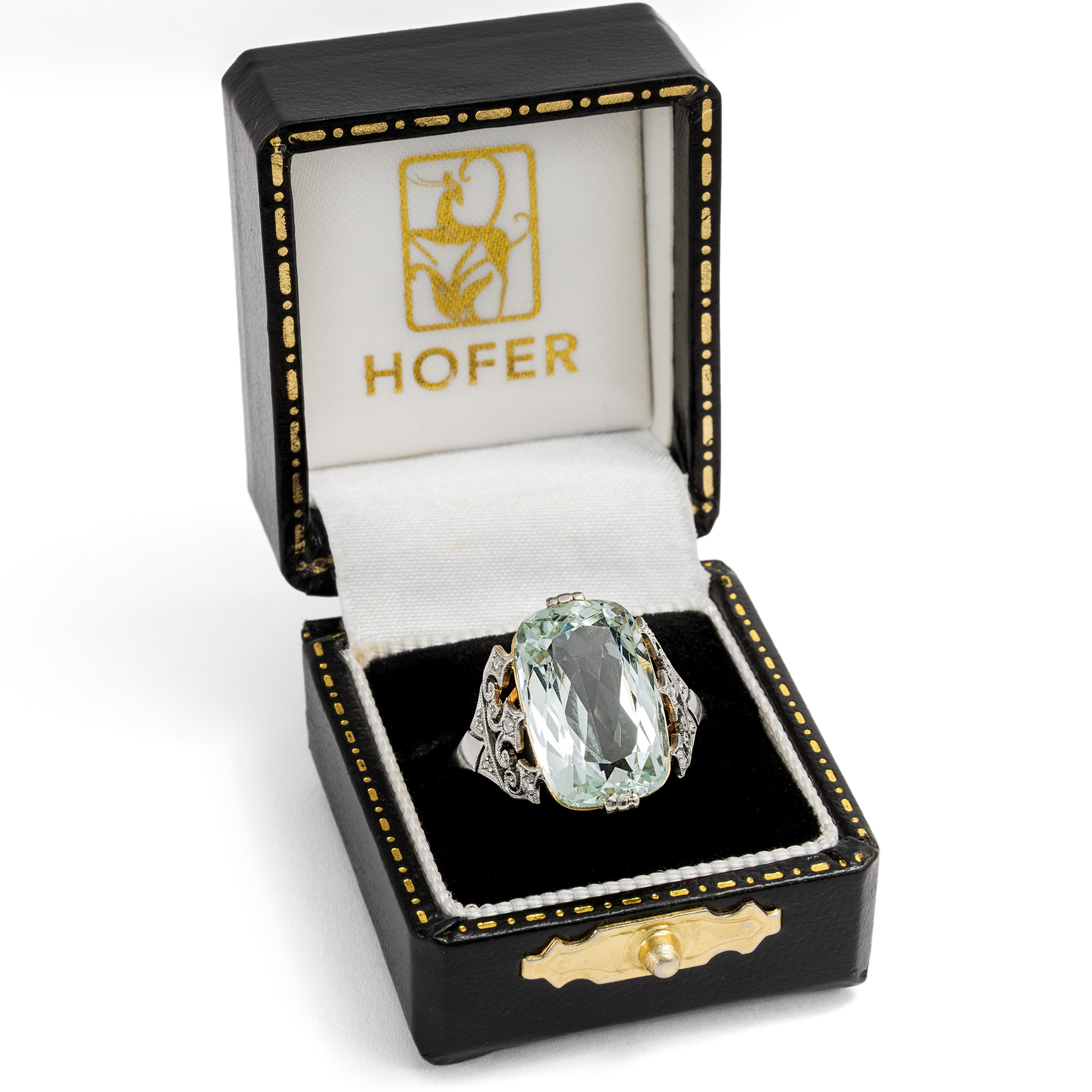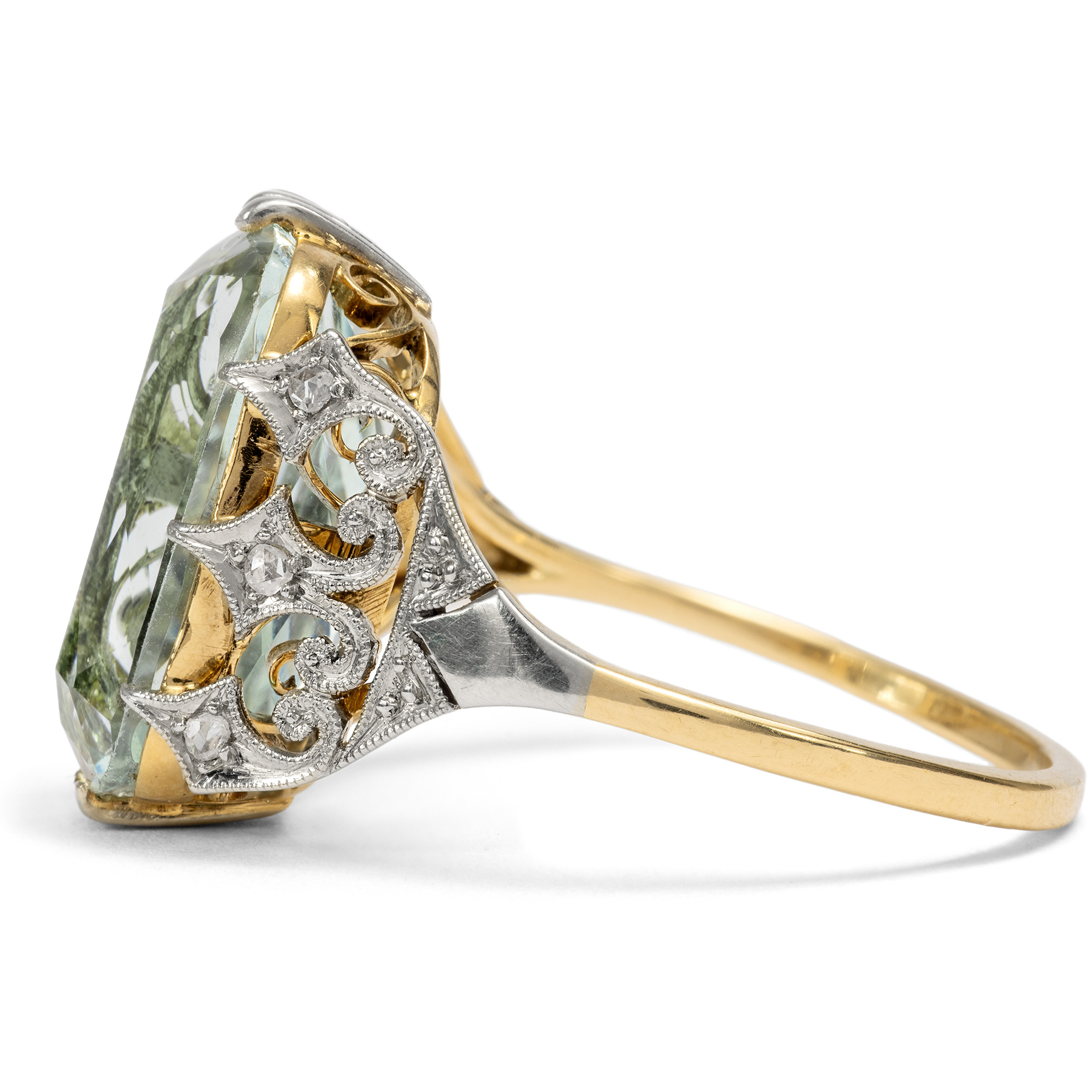 Der vorliegende Ring ist in seiner feinen Verarbeitung und kühl-eleganten Materialität ein typischer Ring des frühen 20. Jahrhunderts. Ungewöhnlich ist jedoch sein Ornament: Seine Fassung wird von diamantbesetzten Spitzen gebildet, die beinahe neogotisch anmuten und dem Ring etwas Märchenhaftes verleihen. Diese Spitzen sind ebenso wie die oberen und unteren Krappen des Aquamarins mit Platin belegt, sodass sich getragen eine einheitlich weiße Optik ergibt. Darunter, wie versteckt, liegt die ornamentale Galerie aus Gold – selbst diese wurde mit Liebe zum Detail gearbeitet. Im Zentrum des Ringes, gehalten von diesen Ornamenten, steht ein großer, etwa 6,72 ct schwerer Aquamarin. Der Edelstein hat eine blassblaue, eisige, leicht grünliche Farbe und eine wunderbare Brillanz. Nicht zuletzt diese Brillanz war es, die dem Aquamarin im Zeitalter der Elektrizität zu seiner großen Beliebtheit verhalf – verliert dieser Edelstein doch auch abends im Kunstlicht nichts von seiner Wirkung. Der Scherenschliff entlockt dem Stein bei jeder Bewegung wasserähnliche Lichtreflexe. Der schöne Ring ist sehr gut erhalten. Ein elegantes Schmuckstück, das den Blick wieder und wieder auf seine feinen Details lenkt.