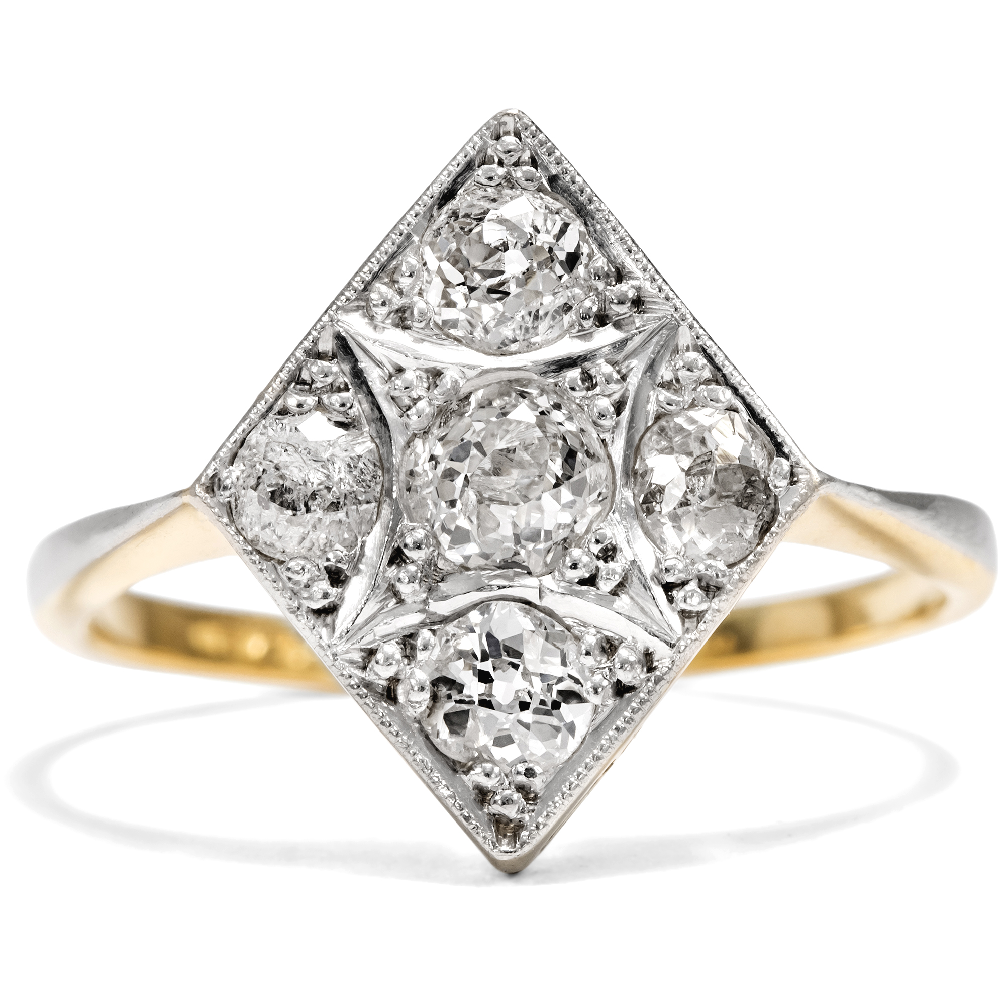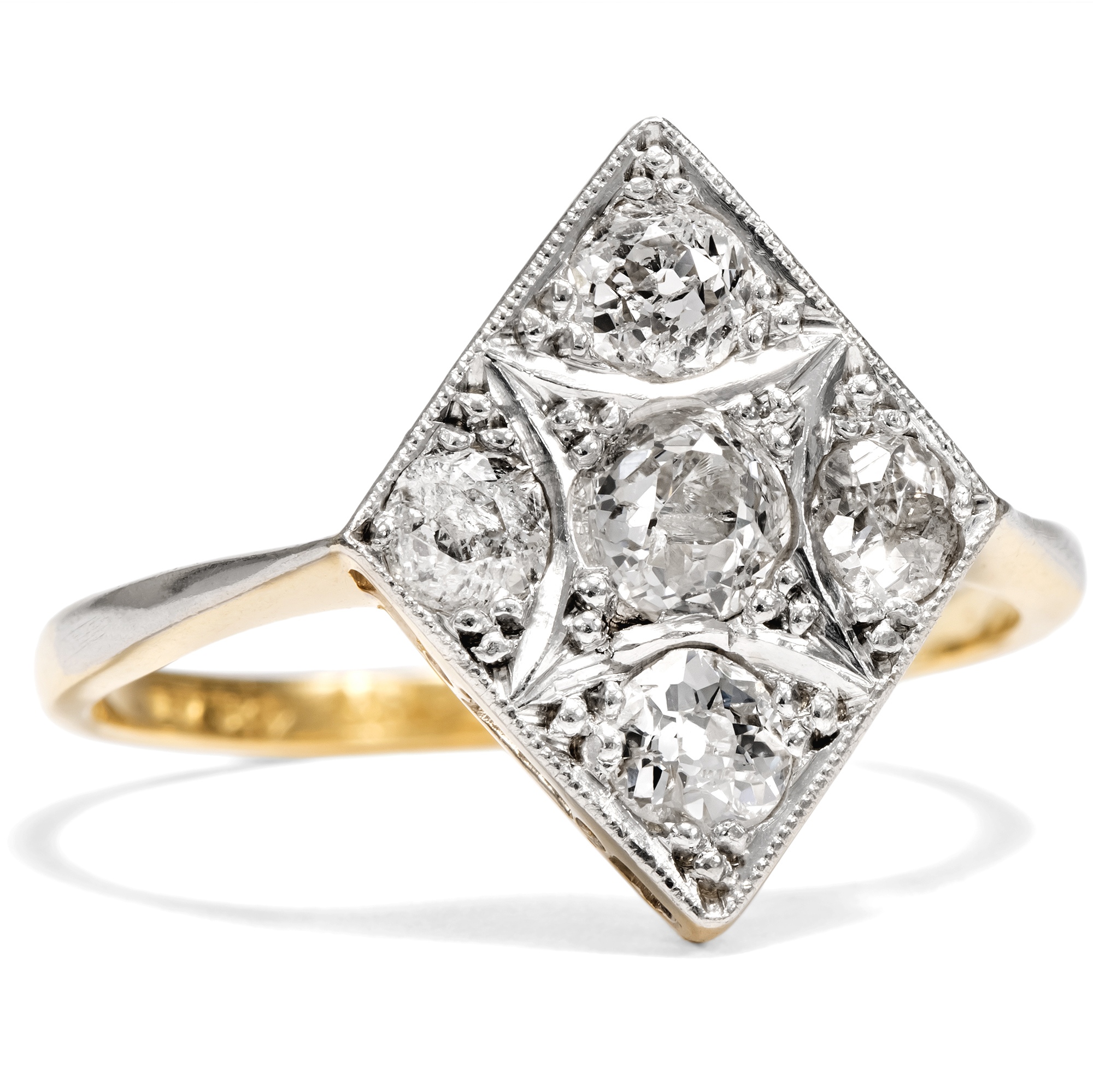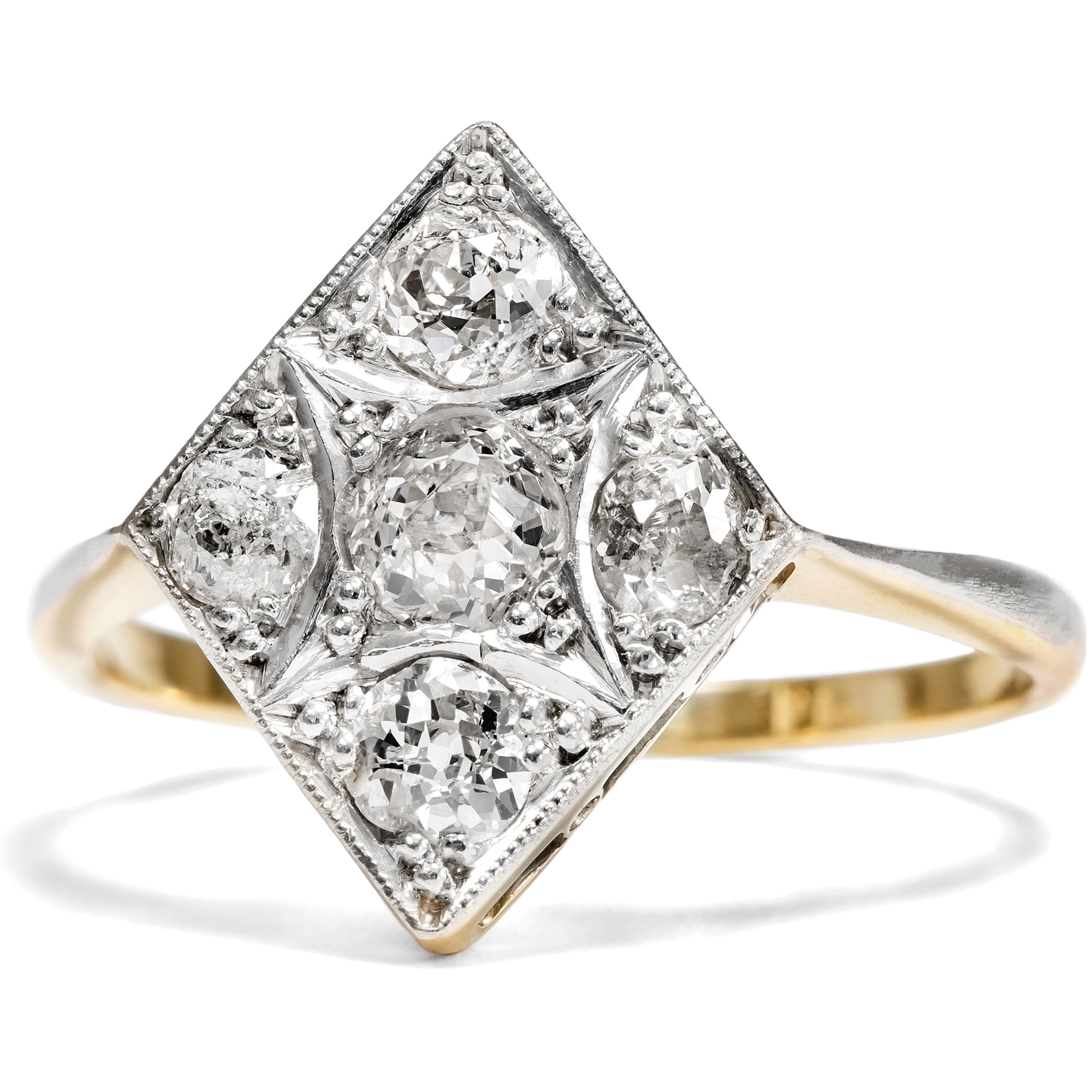 Kaiserliche Juwelen, dutzende Karat schwere Diamanten und ebensolche Naturperlen liegen heute in Museen hinter Stahl und Glas, als stumme Zeugen einer vergangenen Zeit. Dabei waren es nicht diese Stücke, die einst das Bild der uns heute fernen Epochen prägten: Es waren die kleineren, tragbaren, doch nicht weniger schön gearbeiteten Juwelen; solche vielleicht, die man lange im Schaufenster bewunderte, bevor man sie sich zu einem Festtag wünschte, oder auf die man lange sparte, um sie endlich der Angebeteten zu verehren. Diese Colliers, Ringe und Armreife wurden geliebt und getragen. Doch sind dies nicht die Stücke, die man in Museen bewundern kann, um sich vom Schmuckschaffen einer Epoche einen Eindruck zu verschaffen. In weiser Voraussicht fragte schon die Deutsche Goldschmiede-Zeitung 1904, „wo anders als im Privatbesitz sind dann die lebendigen Zeugen der Schönheit unserer Zeit und ihres Strebens aufzuheben und zu bewahren?“ (DGZ 1904, S. 154). Dass dies auch auf Schmuckstücke des Art Déco zutrifft, zeigt der vorliegende Ring. Das ausdrucksstarke Schmuckstück zeigt im Detail den ganzen Reiz des Schmucks jener Zeit. Der Ringkopf, mit Platin belegt, glänzt weiß. Feine Glanzfugen und Millegriffes unterteilen die Raute in fünf Felder. In jedem glitzert je ein Diamant im Altschliff. Alle Steine sind deutlich älter als der Ring und wurden bereits in der zweiten Hälfte des 19. Jahrhunderts geschliffen. Sie stammen vielleicht aus einem Erbstück, um hier zu neuem Glanz zu gelangen. Eine schmale goldene Ringschiene schließt an. Der Ring ist sehr gut erhalten. Ein kleines, tragbares Souvenir einer heute fernen Zeit, das wir in London entdeckt haben.