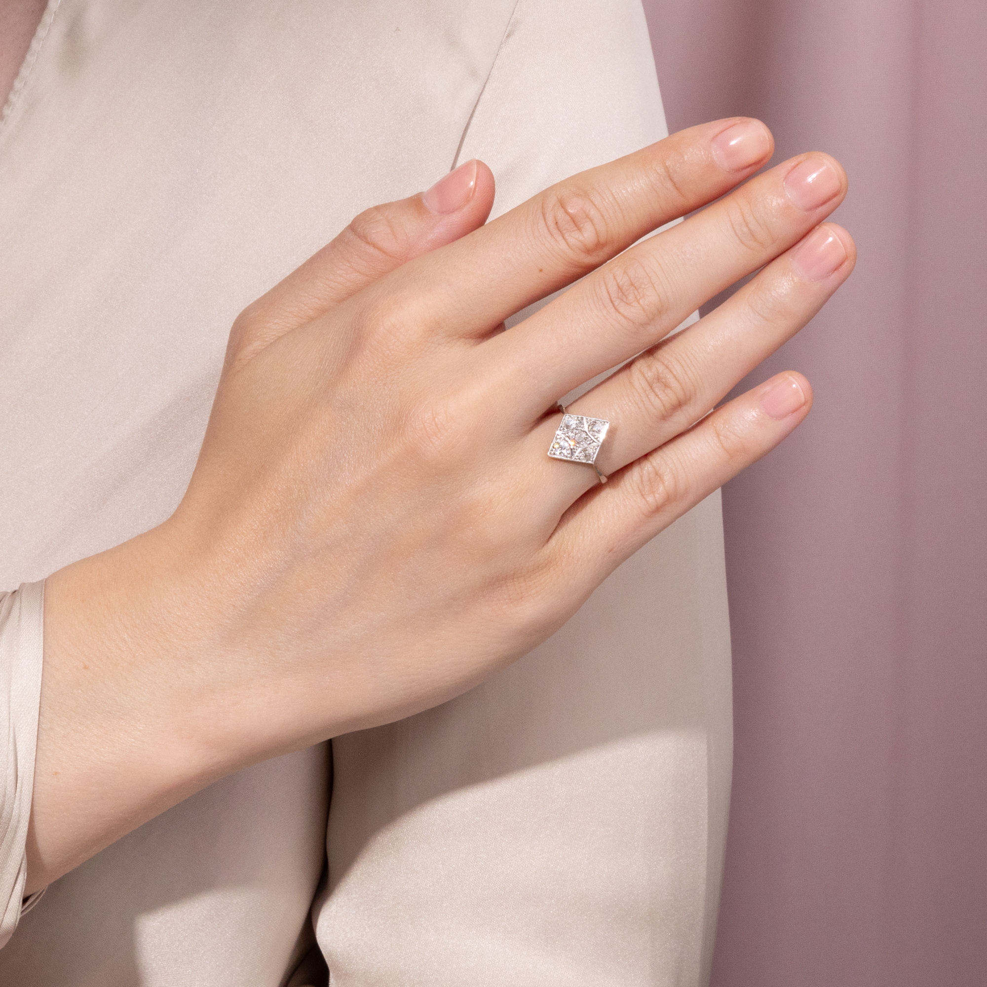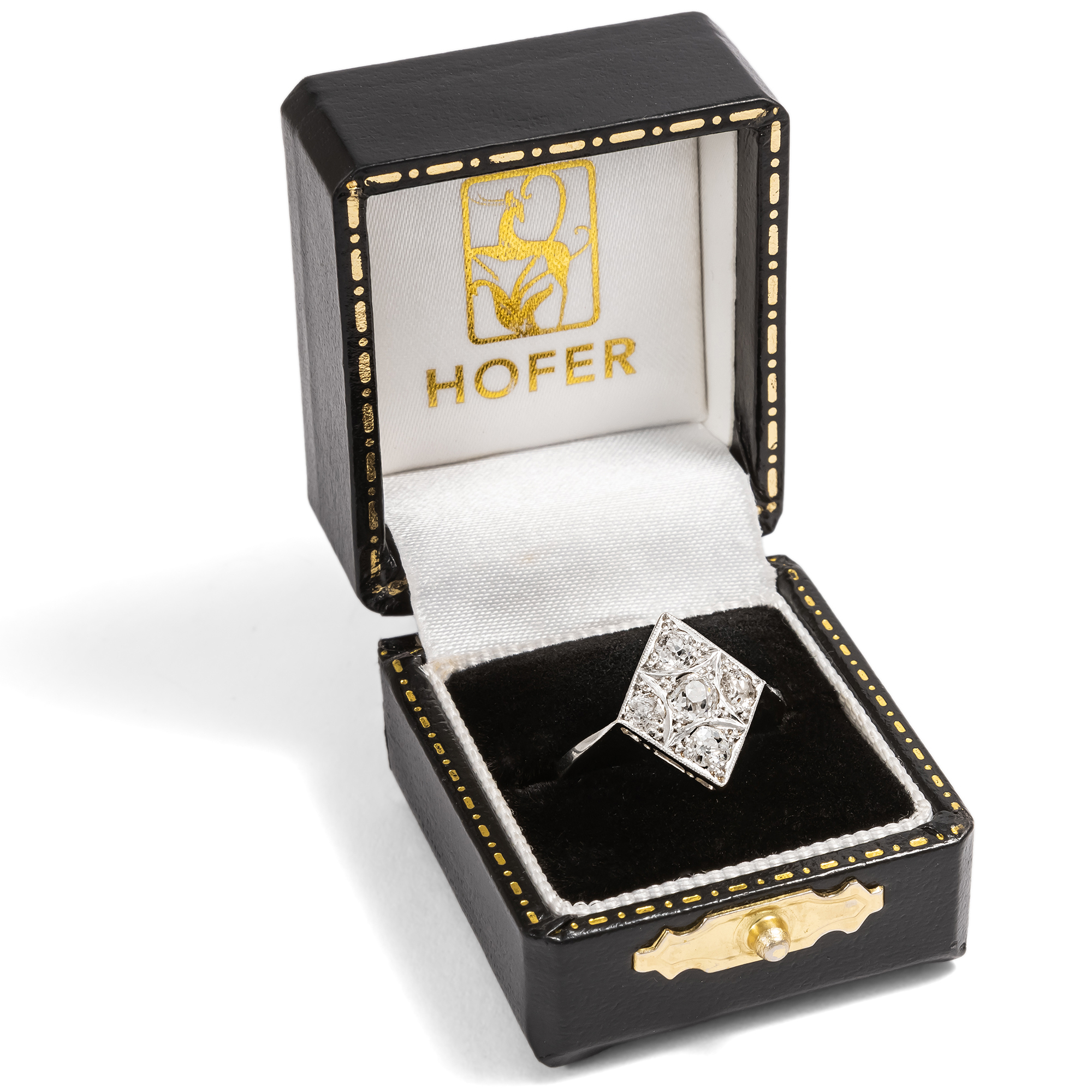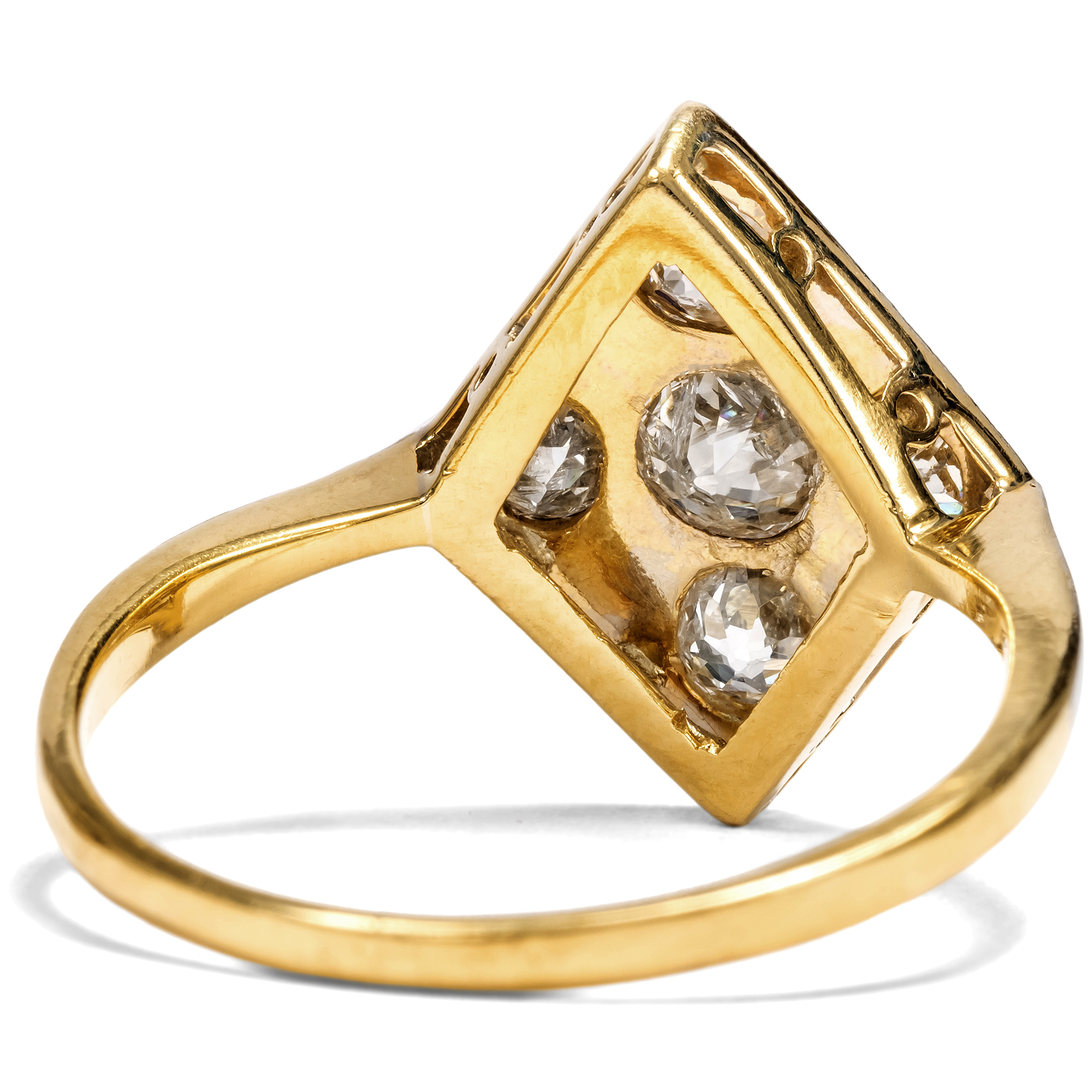 Kaiserliche Juwelen, dutzende Karat schwere Diamanten und ebensolche Naturperlen liegen heute in Museen hinter Stahl und Glas, als stumme Zeugen einer vergangenen Zeit. Dabei waren es nicht diese Stücke, die einst das Bild der uns heute fernen Epochen prägten: Es waren die kleineren, tragbaren, doch nicht weniger schön gearbeiteten Juwelen; solche vielleicht, die man lange im Schaufenster bewunderte, bevor man sie sich zu einem Festtag wünschte, oder auf die man lange sparte, um sie endlich der Angebeteten zu verehren. Diese Colliers, Ringe und Armreife wurden geliebt und getragen. Doch sind dies nicht die Stücke, die man in Museen bewundern kann, um sich vom Schmuckschaffen einer Epoche einen Eindruck zu verschaffen. In weiser Voraussicht fragte schon die Deutsche Goldschmiede-Zeitung 1904, „wo anders als im Privatbesitz sind dann die lebendigen Zeugen der Schönheit unserer Zeit und ihres Strebens aufzuheben und zu bewahren?“ (DGZ 1904, S. 154). Dass dies auch auf Schmuckstücke des Art Déco zutrifft, zeigt der vorliegende Ring. Das ausdrucksstarke Schmuckstück zeigt im Detail den ganzen Reiz des Schmucks jener Zeit. Der Ringkopf, mit Platin belegt, glänzt weiß. Feine Glanzfugen und Millegriffes unterteilen die Raute in fünf Felder. In jedem glitzert je ein Diamant im Altschliff. Alle Steine sind deutlich älter als der Ring und wurden bereits in der zweiten Hälfte des 19. Jahrhunderts geschliffen. Sie stammen vielleicht aus einem Erbstück, um hier zu neuem Glanz zu gelangen. Eine schmale goldene Ringschiene schließt an. Der Ring ist sehr gut erhalten. Ein kleines, tragbares Souvenir einer heute fernen Zeit, das wir in London entdeckt haben.