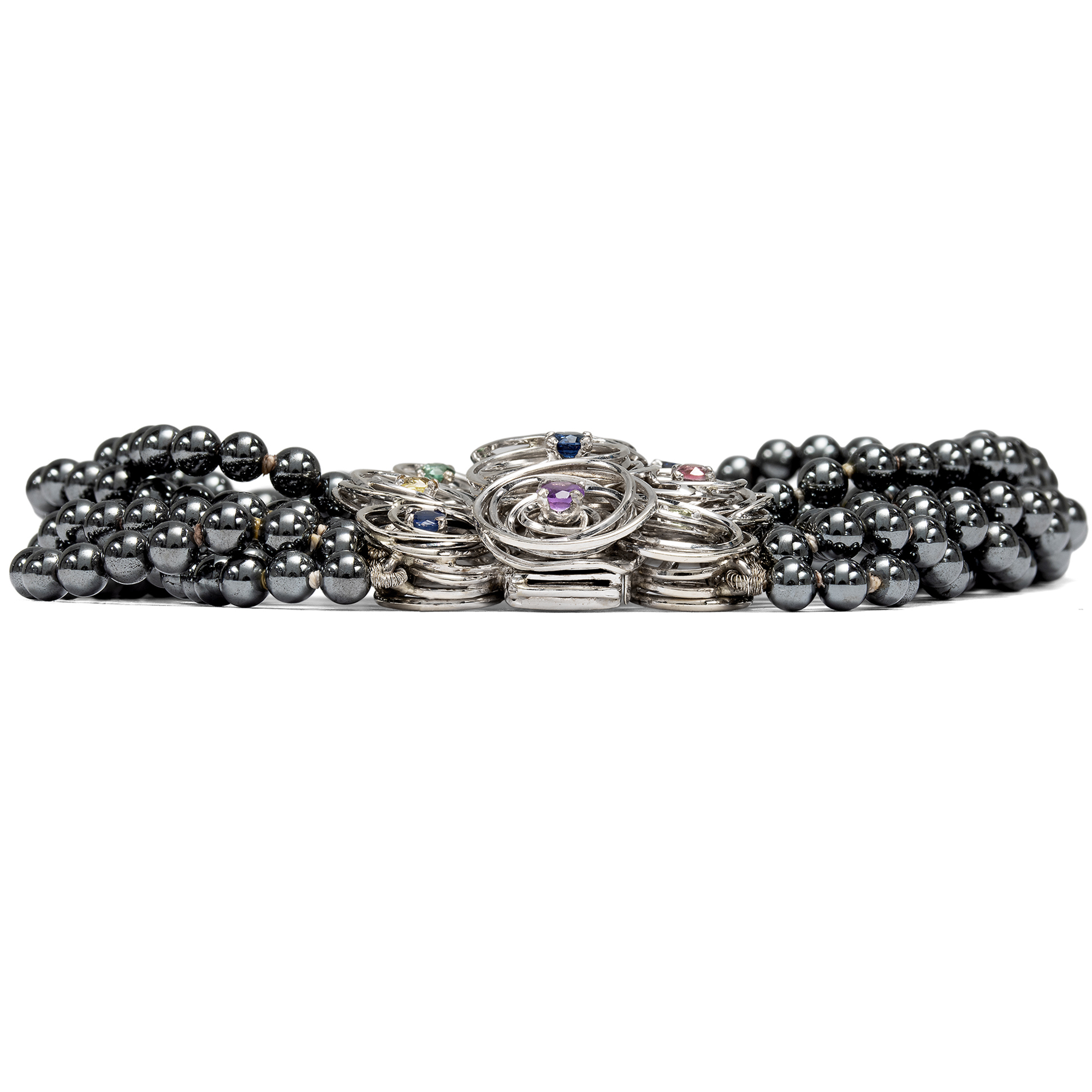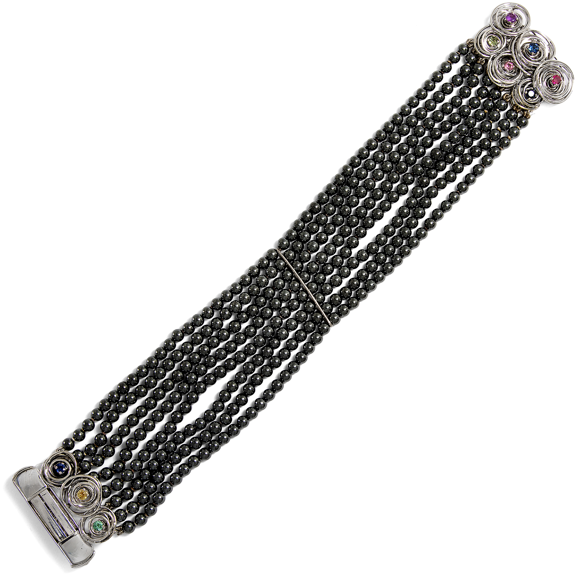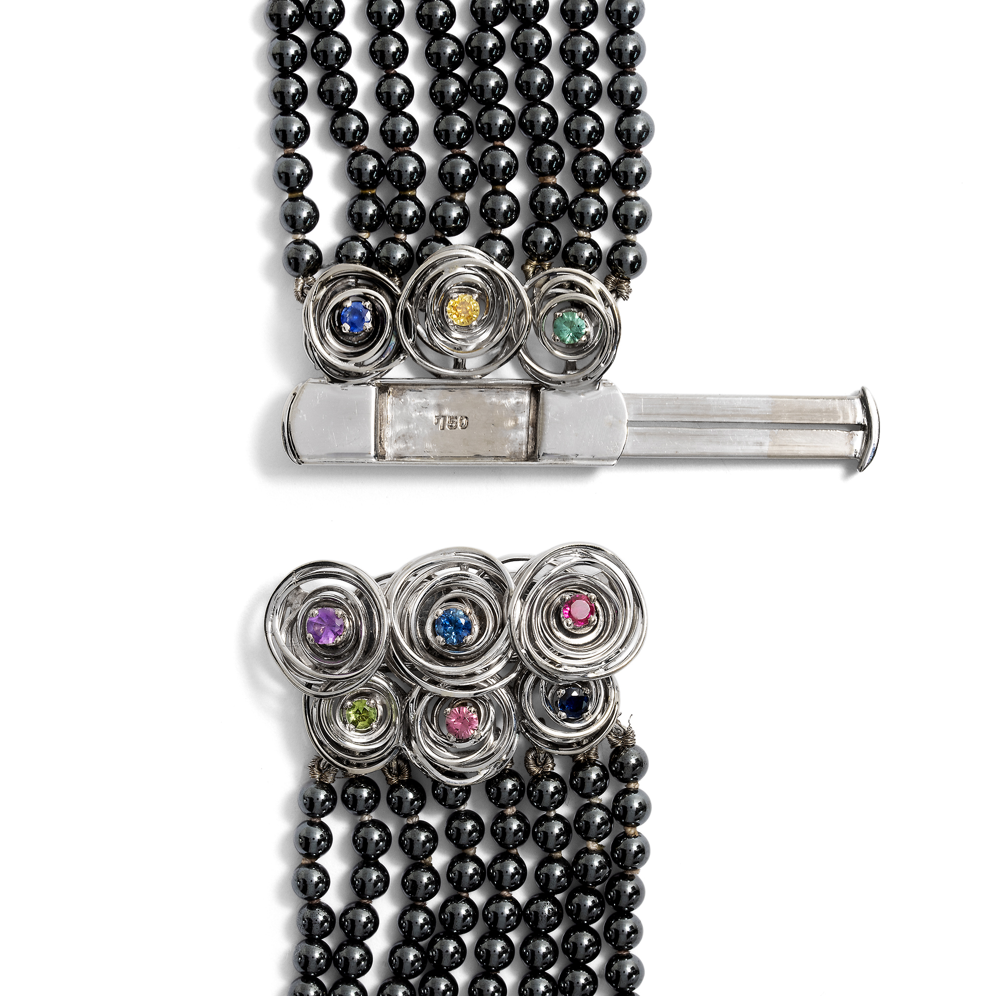In der Nachkriegszeit wurde im Schmuckdesign kontinuierlich und experimentierfreudig nach neuen Ausdrucksmöglichkeiten gesucht. Ziel war die Hervorbringung einer eigenständigen abstrakten Formensprache, die sich von den vorangegangenen historisierenden Stilen abheben und zugleich erkennbar gegenwärtig sein sollte. Häufig steht seitdem die Materialität der Stücke im Vordergrund, der Kontrast etwa zwischen spiegelnden und matten Oberflächen und dem Spiel von Licht und Schatten. Als Vintage-Schmuck werden diese handgearbeiteten Kreationen heute wieder neu geschätzt, da sie durch ihre eigenständige Formensprache überzeugen. Das vorliegende, ausdrucksstarke Armband ist ein typisches und besonders hochwertig ausgestattetes Beispiel dieser Zeit. Das Armband besteht aus acht Reihen metallisch glänzender Hämatitperlen, die von einer expressiven Zierschließe zusammengehalten werden. Die große Schließe ist aus hochkarätigem Weißgold gearbeitet. Sie ist aus neun Kreisformen aus gewickeltem Weißgolddrähten aufgebaut in deren Zentrum jeweils ein farbiger Edelstein leuchtet. Wir sehen einen roten Rubin, drei blaue Saphire und einen gelben Saphir, einen violetten Amethyst, einen lindgrünen Peridot sowie zwei Turmaline in Pink und Petrolgrün. So erhält die Zierschließe ein farbenfrohes, Optimismus versprühendes Aussehen. Das handgearbeitete Armband ist ein sehr schön erhaltenes Stück tragbaren Kunstgewerbes und eine tolle Ergänzung für jede Sammlung von Schmuckdesign der 1970er Jahre.